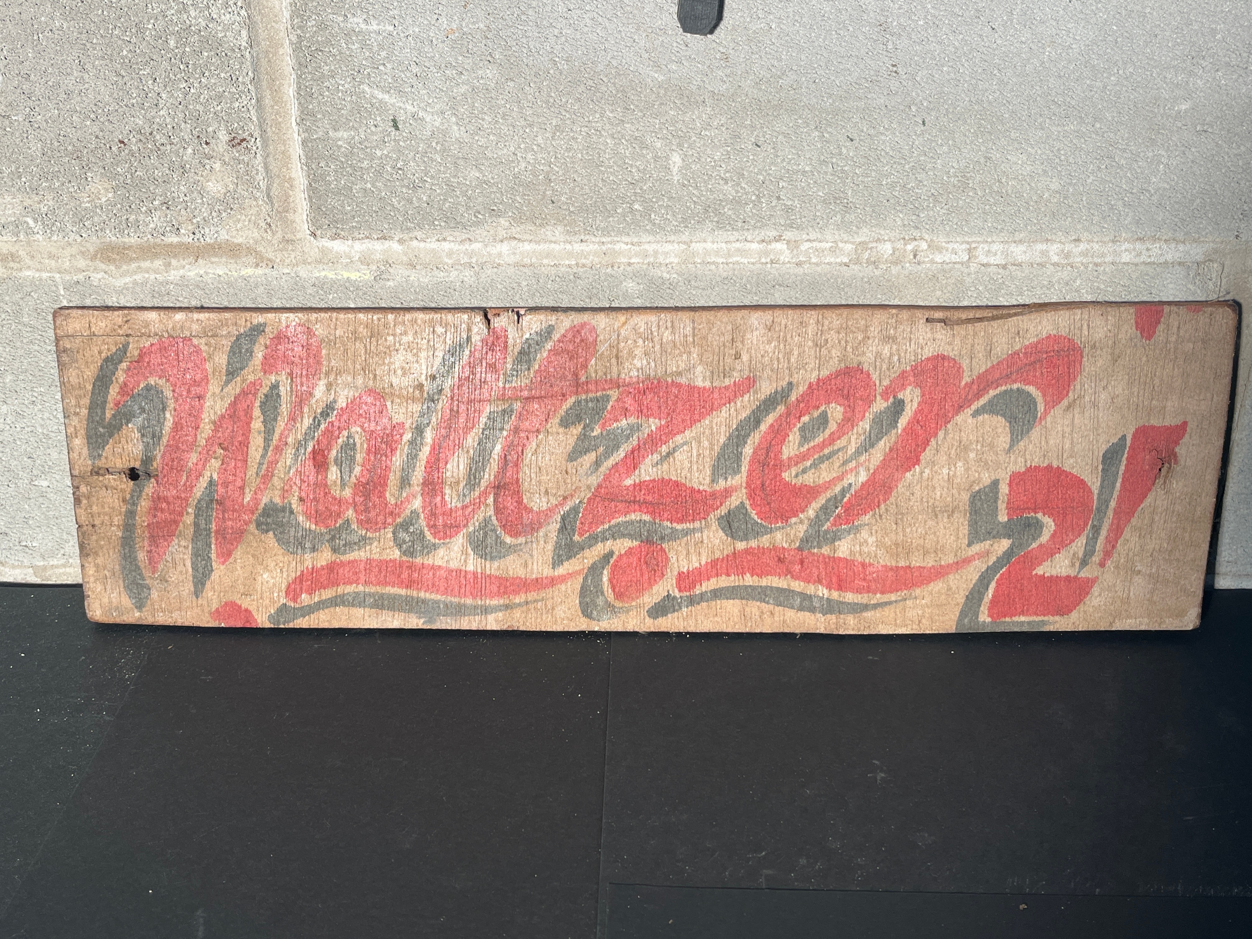A vintage hand-painted wooden sign featuring the text “WALTZER 2” in a stylized, decorative script executed in red with grey/black shadowing. The word “WALTZER” translates from German as ‘waltzer’ or ‘waltz’, likely referring to a type of amusement ride in this context. The reverse shows two pre-drilled holes, indicating it was likely previously mounted, along with areas of white residue or wear.