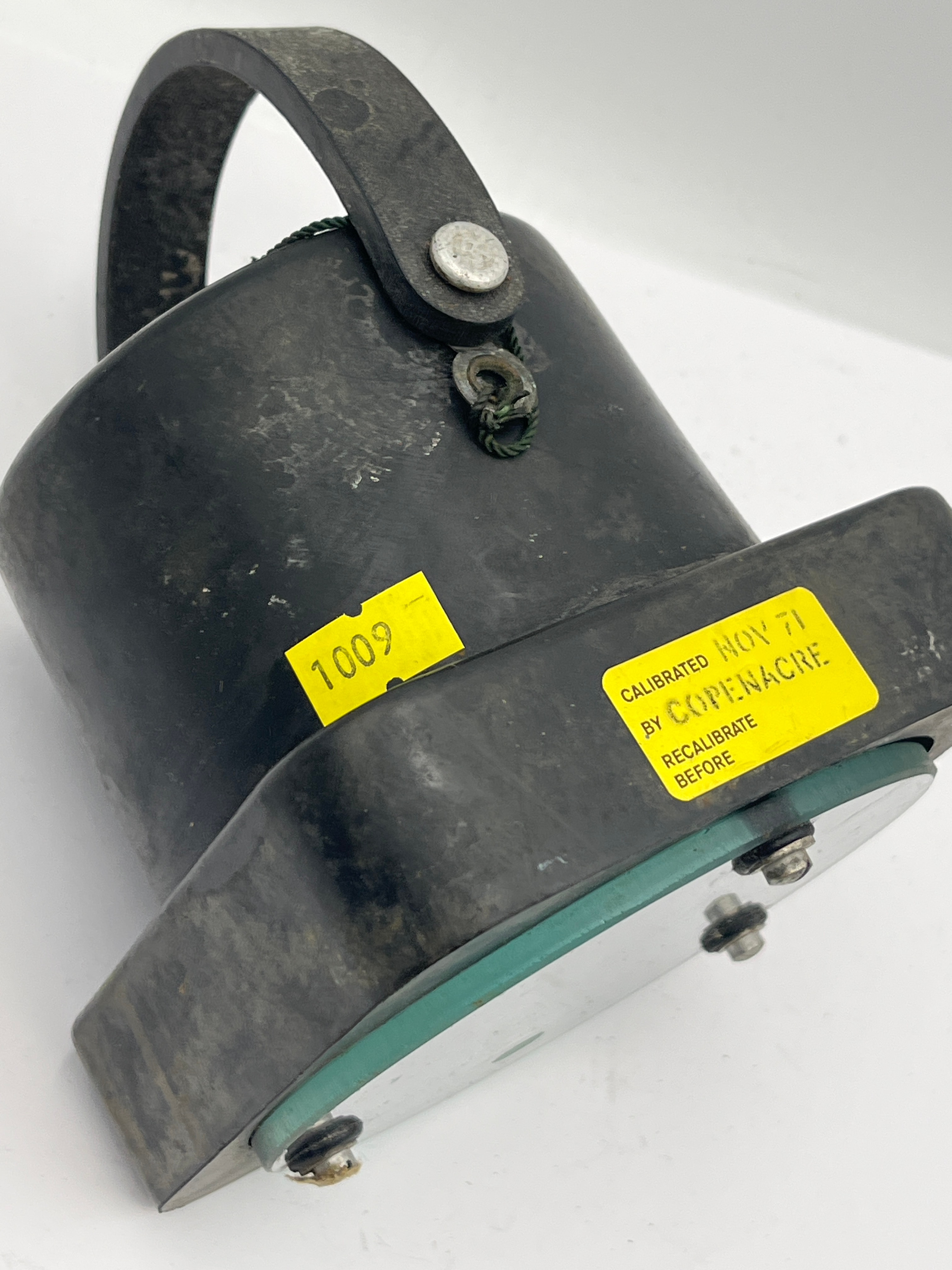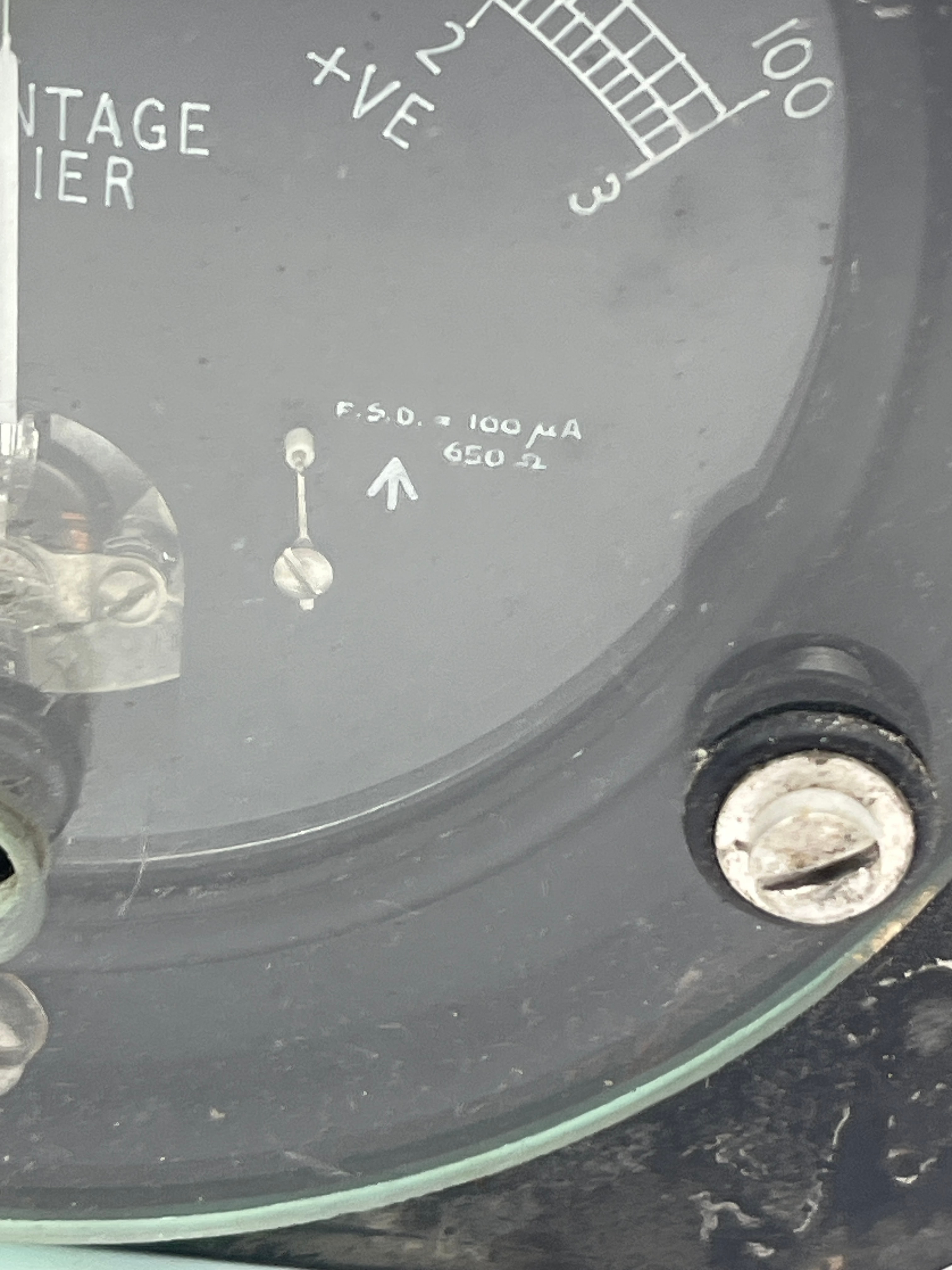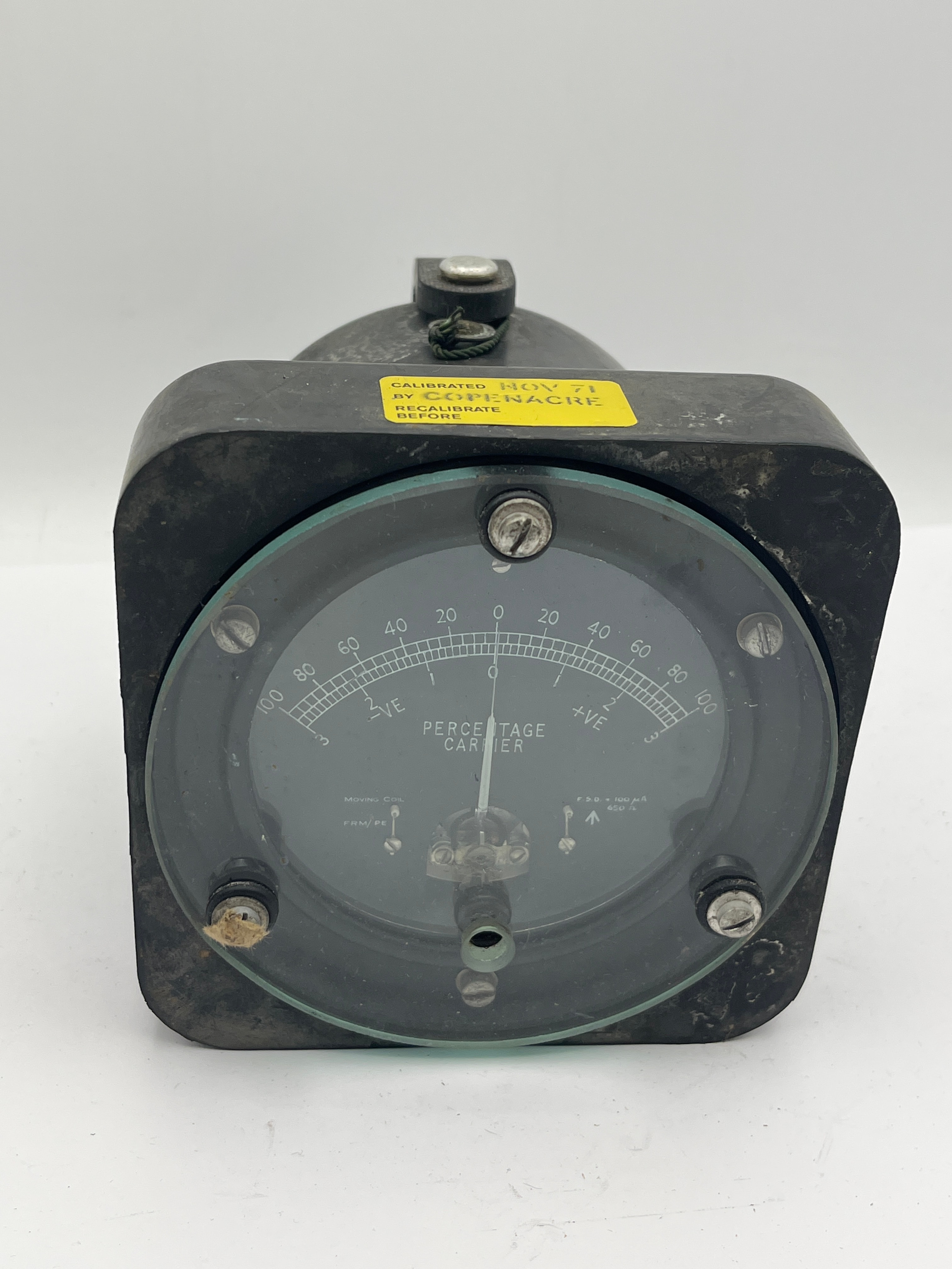 A utilitarian analog meter, identified as a “PERCENTAGE CARRIER” indicator. It is housed in a dark casing with a clear glass front, secured by four screws. The dial features a central “0” point with scales extending to “100” in both positive (“+VE”) and negative (“-VE”) directions. The dial is marked with “F.S.D. = 100 µA”, “650 Ω”, and “MILLIVOLT CONVERTER”. A yellow calibration sticker on the casing indicates “CALIBRATED NOV 71 BY COPENACRE RECALIBRATE BEFORE”, accompanied by an additional “1009” label.