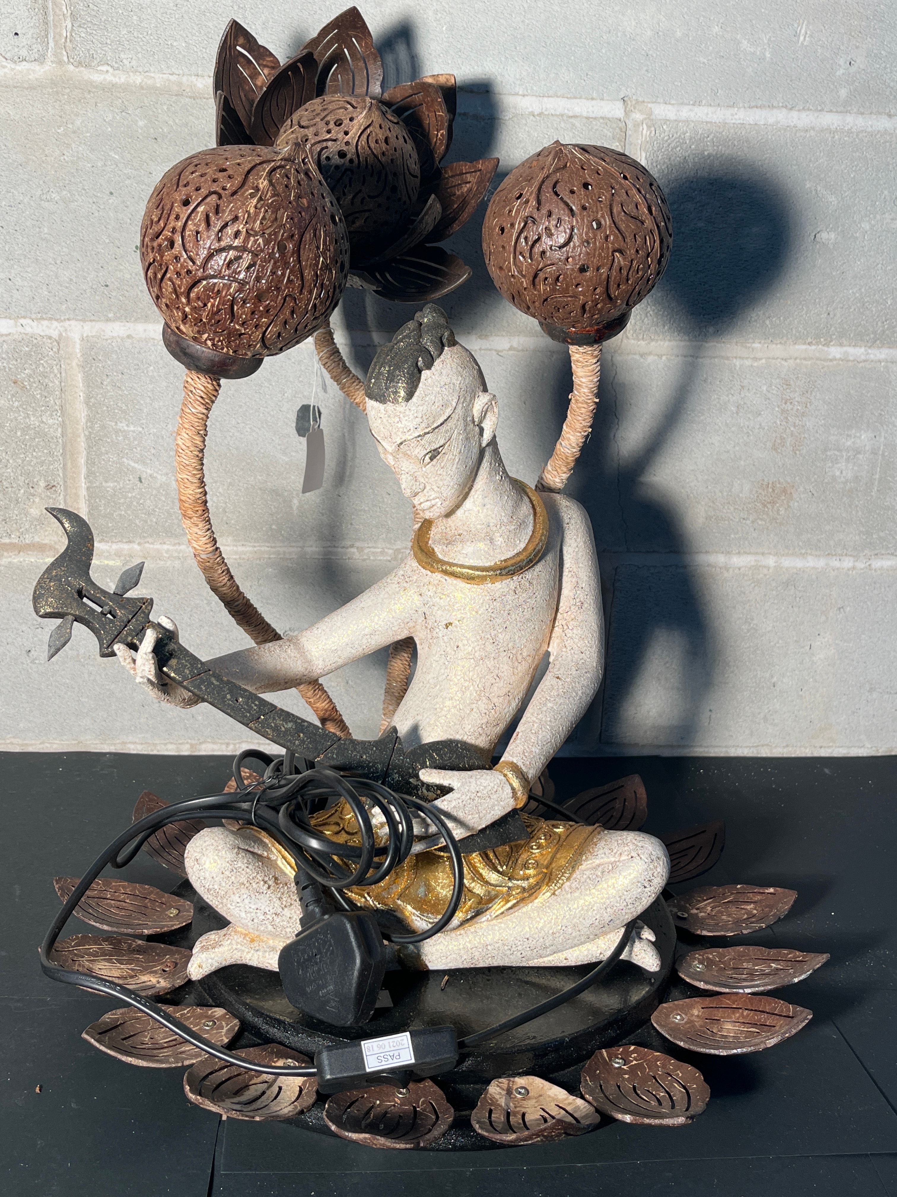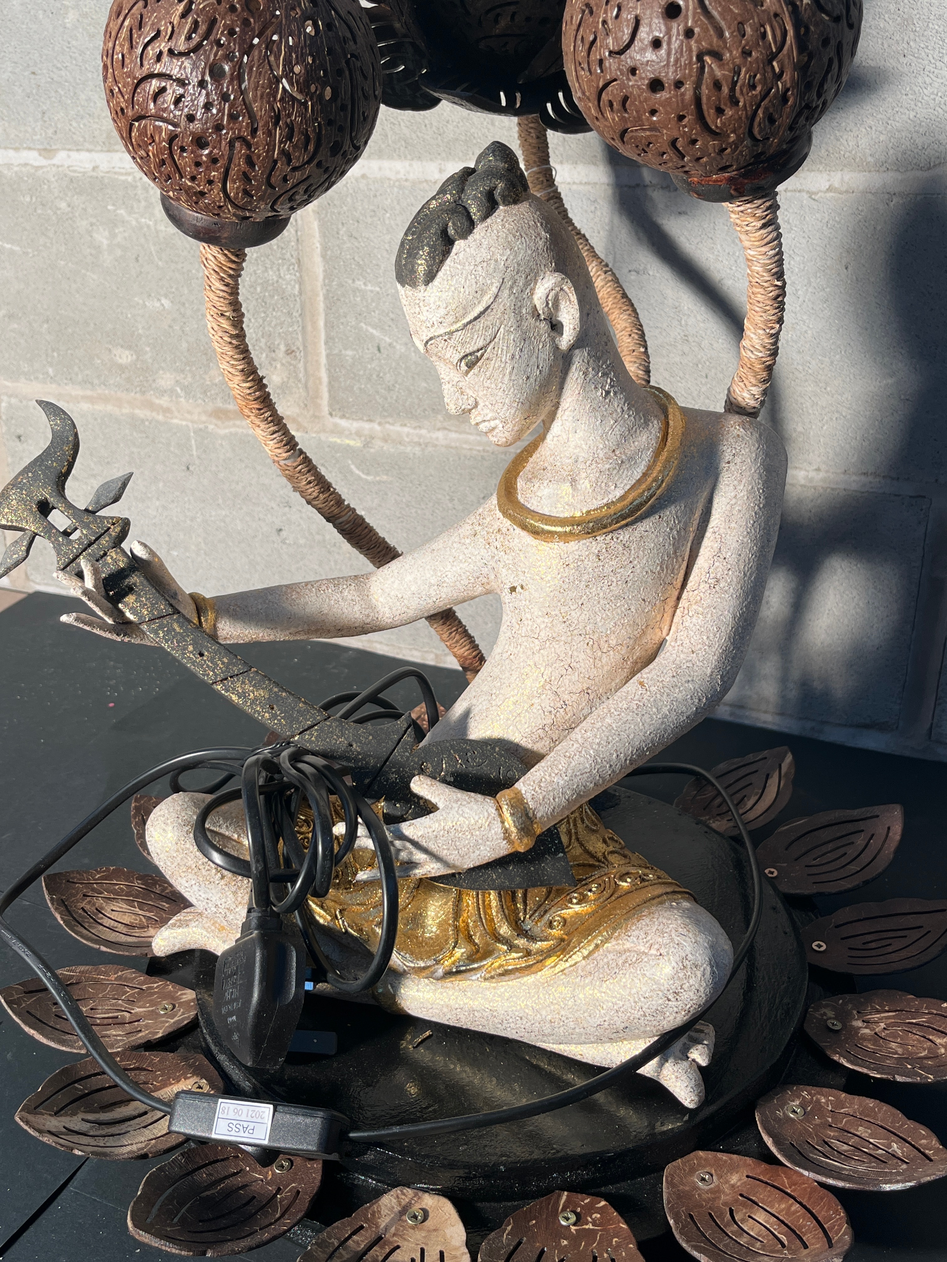 A ‘Lotus Flower Tray | Musical Man Table Lamp’ from Nevina.co.uk. This decorative table lamp features a seated figural sculpture in a Southeast Asian-inspired style, depicting a musician. The figure is crafted from a light-colored material, possibly resin or composite, with an off-white, textured finish and gilded accents on the jewelry, headwear, and lower garment. It holds a dark, stylized stringed instrument. The lamp shades are two carved coconut shells with intricate openwork patterns, supported by twisted, rope-like stems that arch over the figure. The entire assembly rests on a dark circular base adorned with smaller, leaf-shaped elements, also appearing to be carved coconut shell. Visible electrical components include a black cord with an inline switch marked “PASS” and a UK-style plug marked “FUSED”.