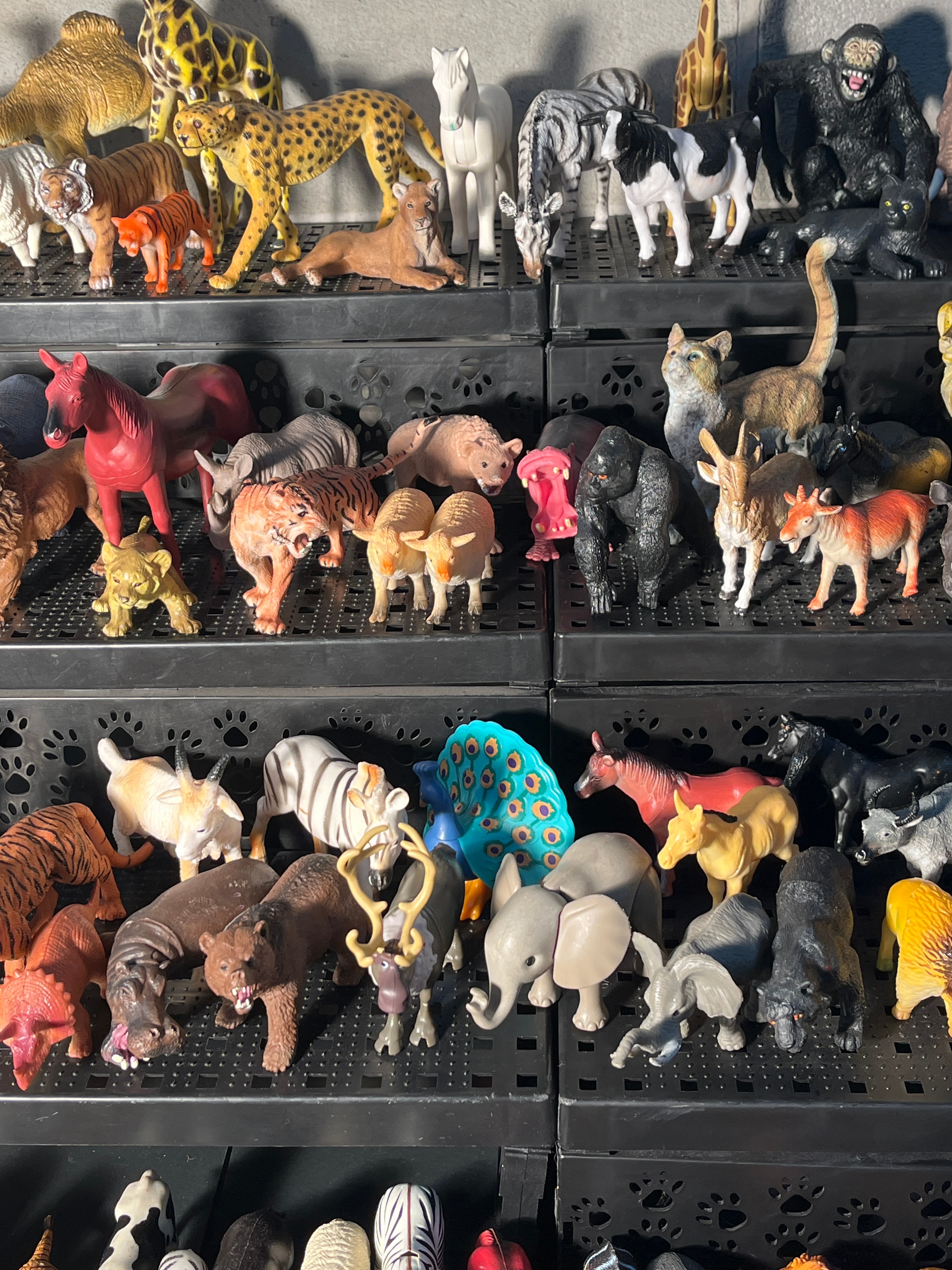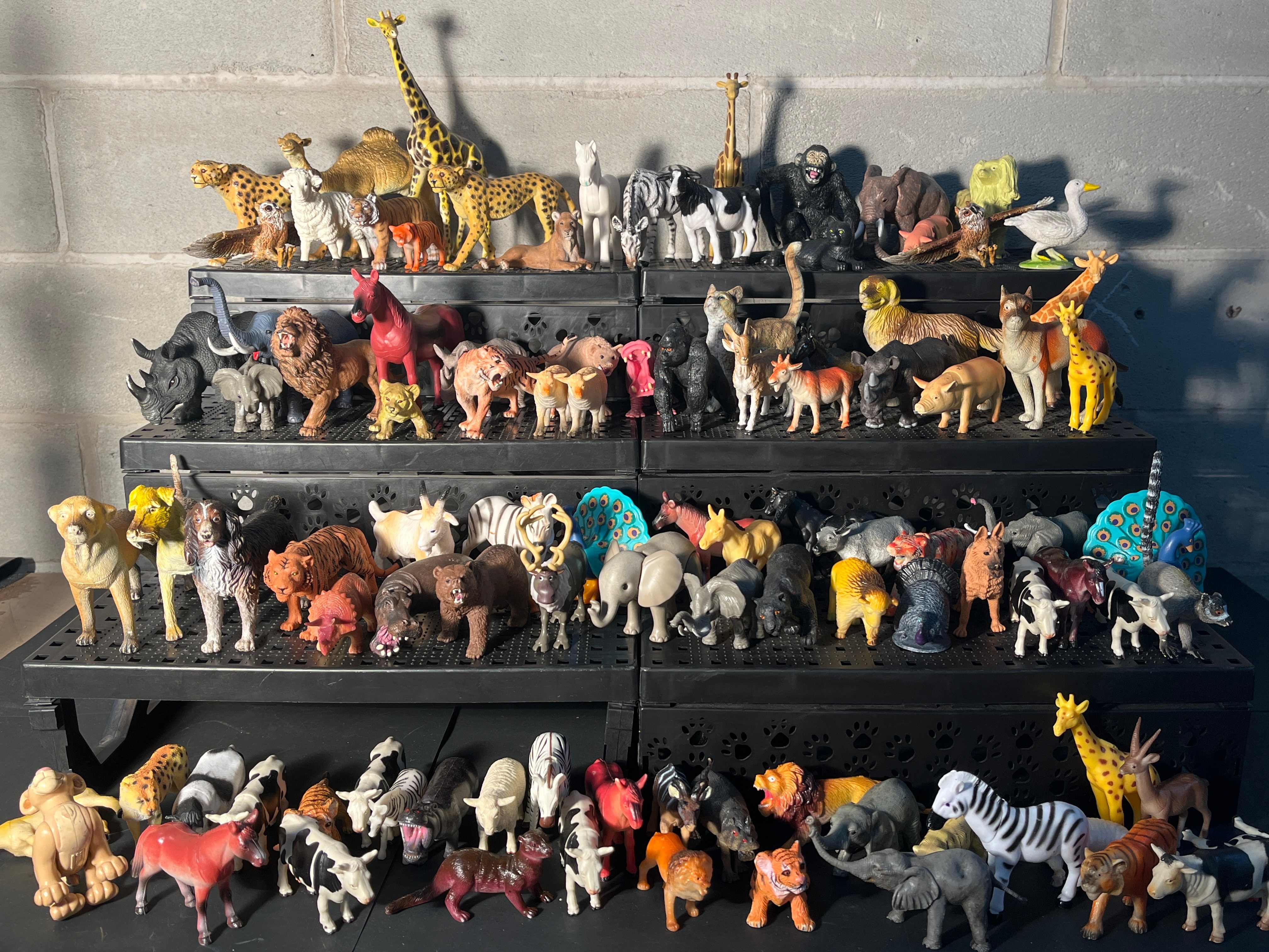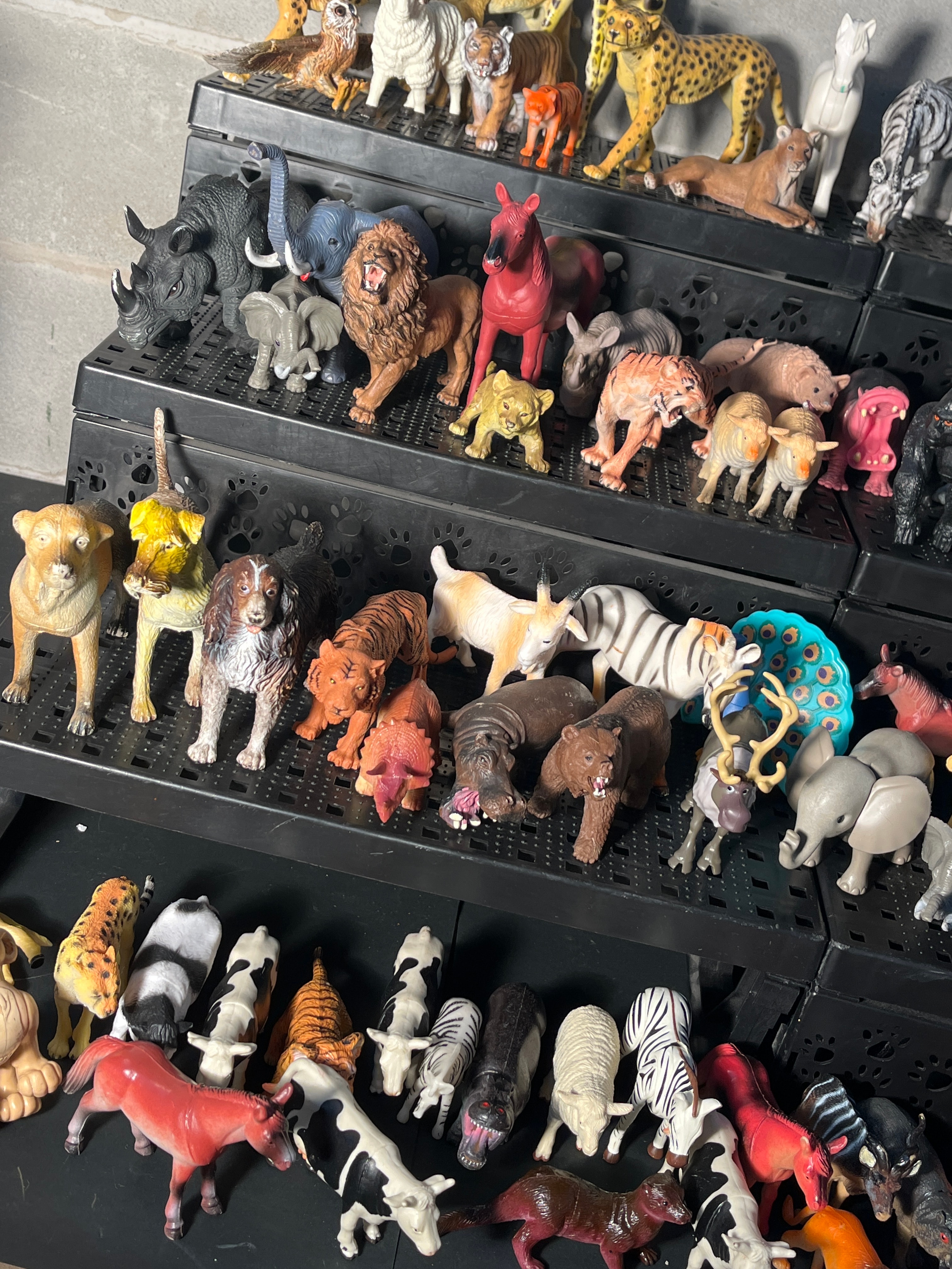 A substantial collection of several hundred plastic animal figurines, predominantly depicting a diverse range of wild, domestic, and farm animals such as giraffes, elephants, lions, tigers, zebras, various canids and felids, cattle, and horses, among others, with some birds also present. The figurines are molded from plastic or PVC, feature varied painted details, and are executed in a semi-realistic to stylized manner, consistent with mass-produced children’s toys or collectibles. Examples of similar figures found in the market include those by manufacturers such as Toy Major, Safari Ltd, and Schleich. The collection is neatly arranged across multiple black, tiered plastic storage trays, some with paw print cutouts. No specific manufacturer markings or text are discernible at this resolution.