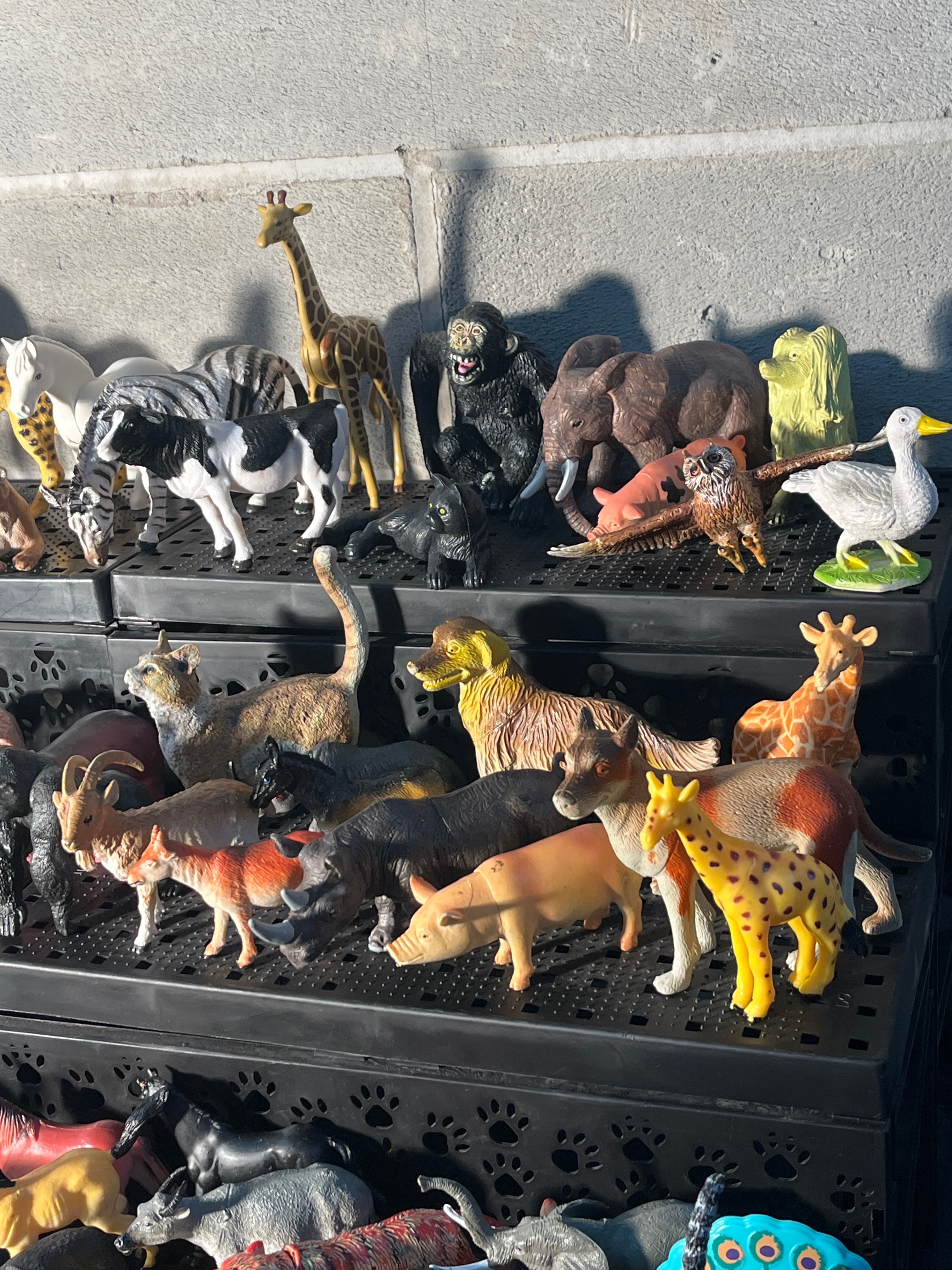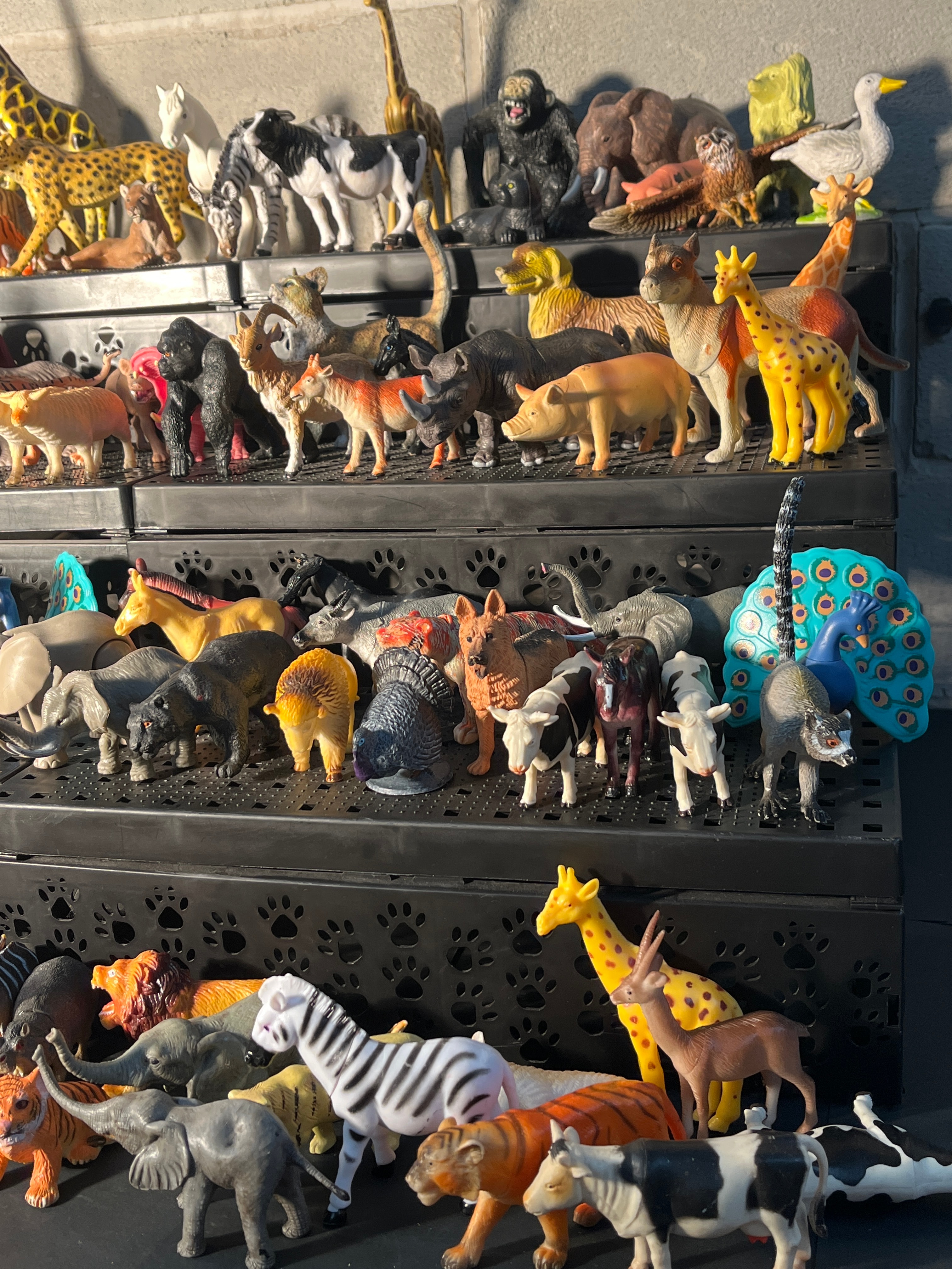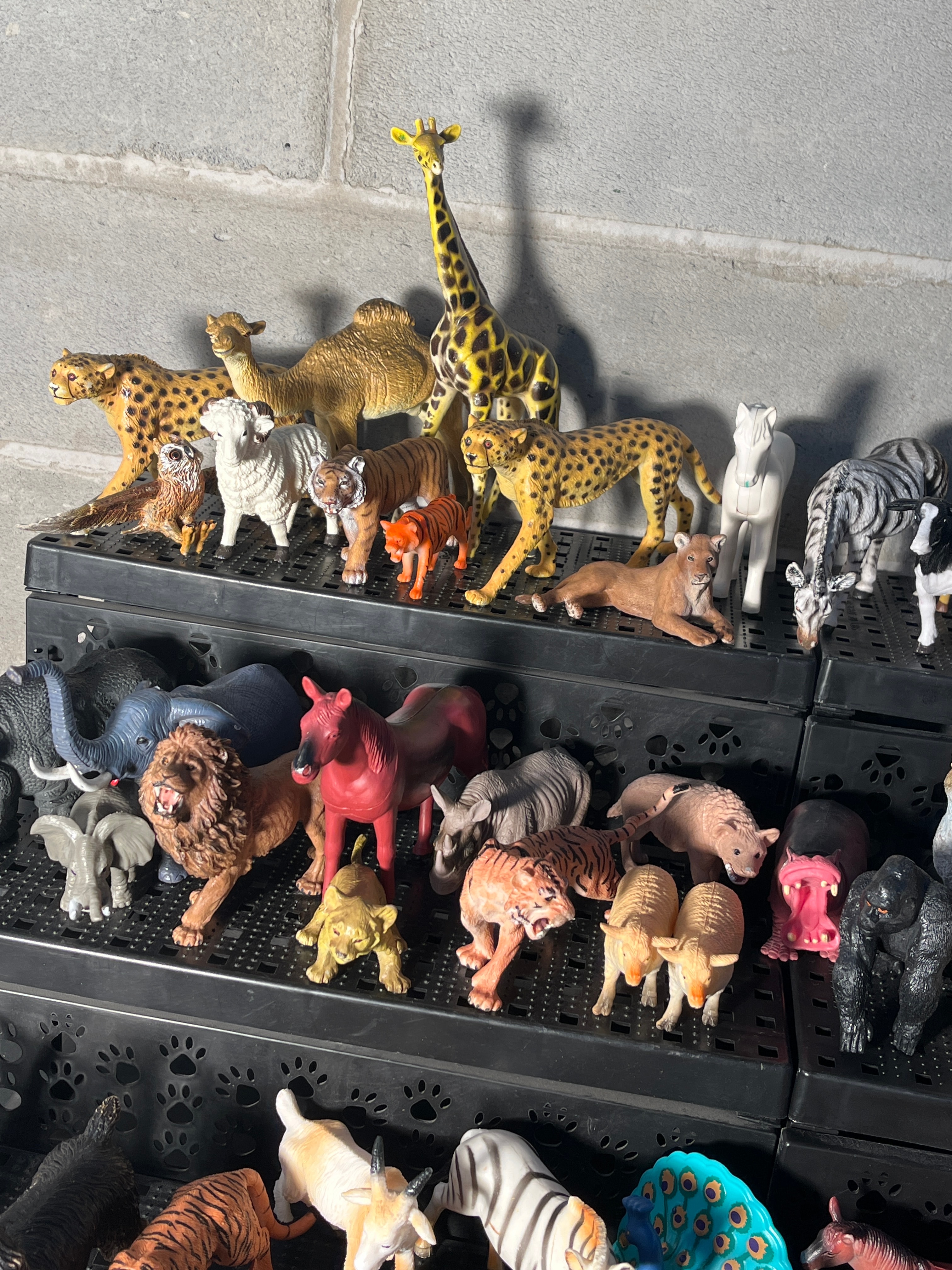 A substantial collection of several hundred plastic animal figurines, predominantly depicting a diverse range of wild, domestic, and farm animals such as giraffes, elephants, lions, tigers, zebras, various canids and felids, cattle, and horses, among others, with some birds also present. The figurines are molded from plastic or PVC, feature varied painted details, and are executed in a semi-realistic to stylized manner, consistent with mass-produced children’s toys or collectibles. Examples of similar figures found in the market include those by manufacturers such as Toy Major, Safari Ltd, and Schleich. The collection is neatly arranged across multiple black, tiered plastic storage trays, some with paw print cutouts. No specific manufacturer markings or text are discernible at this resolution.