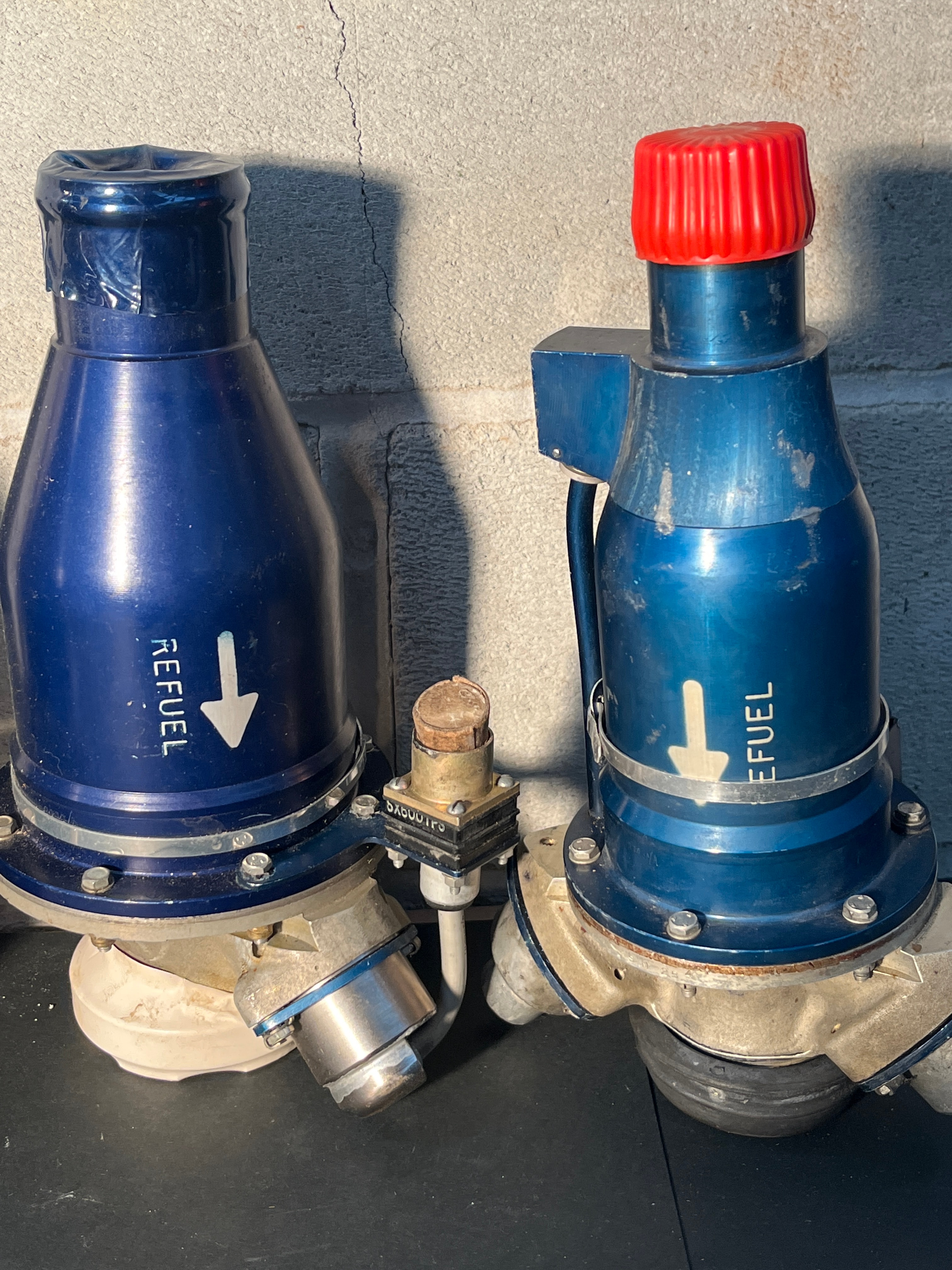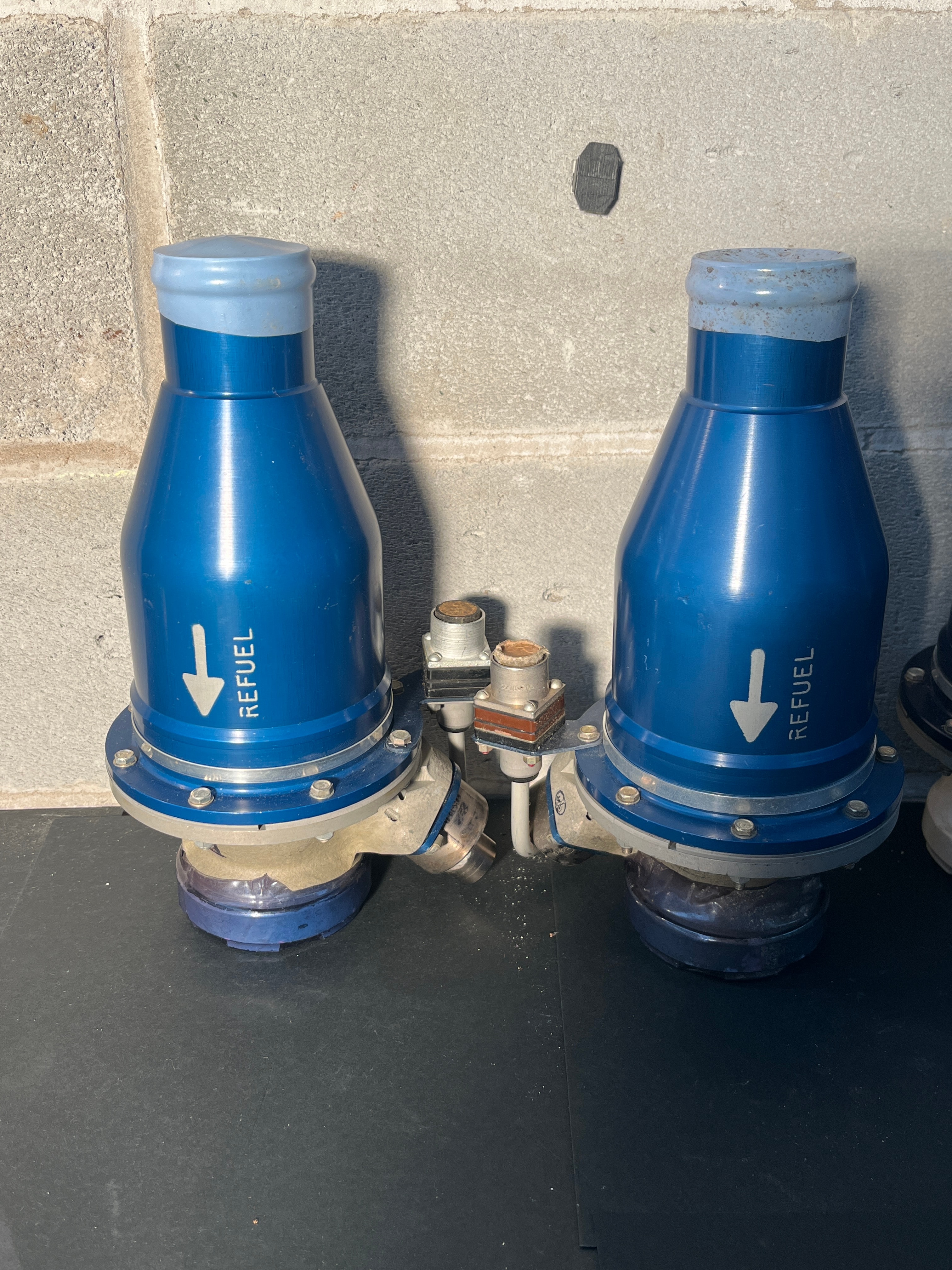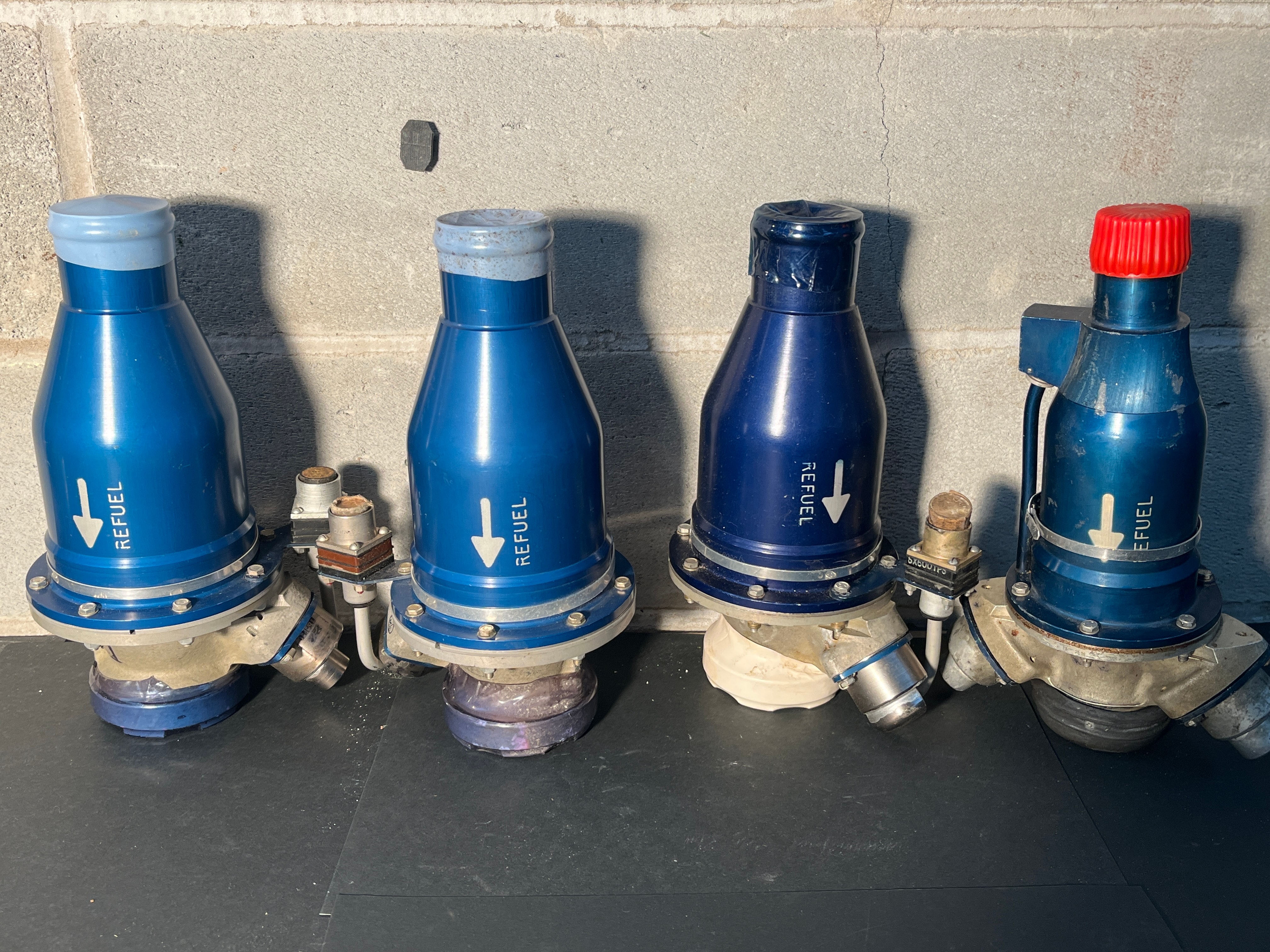 A group of four industrial mechanical components, identified through web intelligence as specialized refuel valves or nozzles for PBS TJ40 turbojet engines. Each unit features a prominent dark blue anodized metal upper body in a bell or conical shape, marked with white text “REFUEL” accompanied by a downward-pointing arrow. The assemblies incorporate various metal fittings and connectors at their bases, with one small metal component visibly marked “DXG001FS”. The tops of the units are variously capped with light blue, dark blue, or red plastic/rubber caps, with one appearing wrapped in clear plastic film.