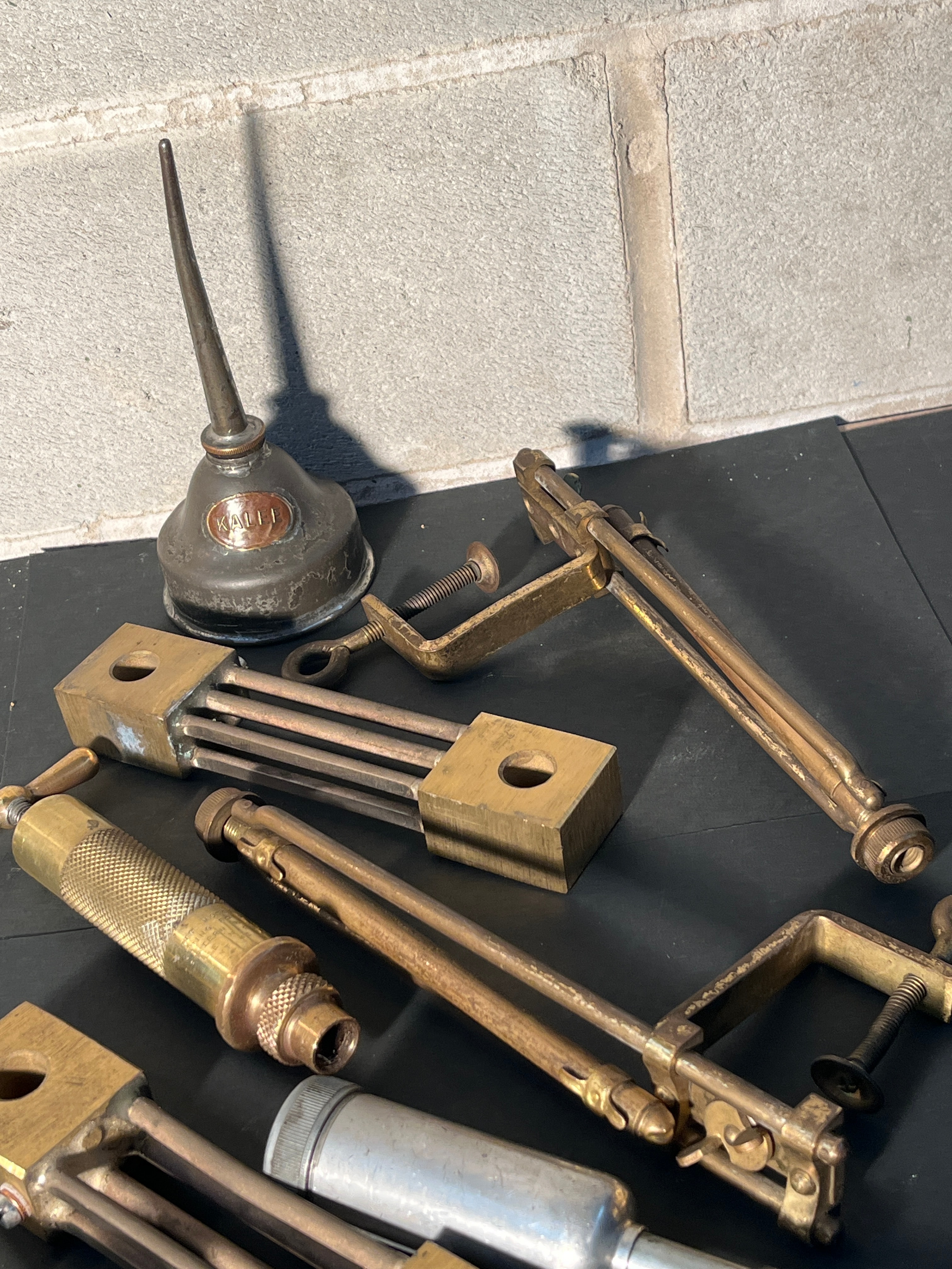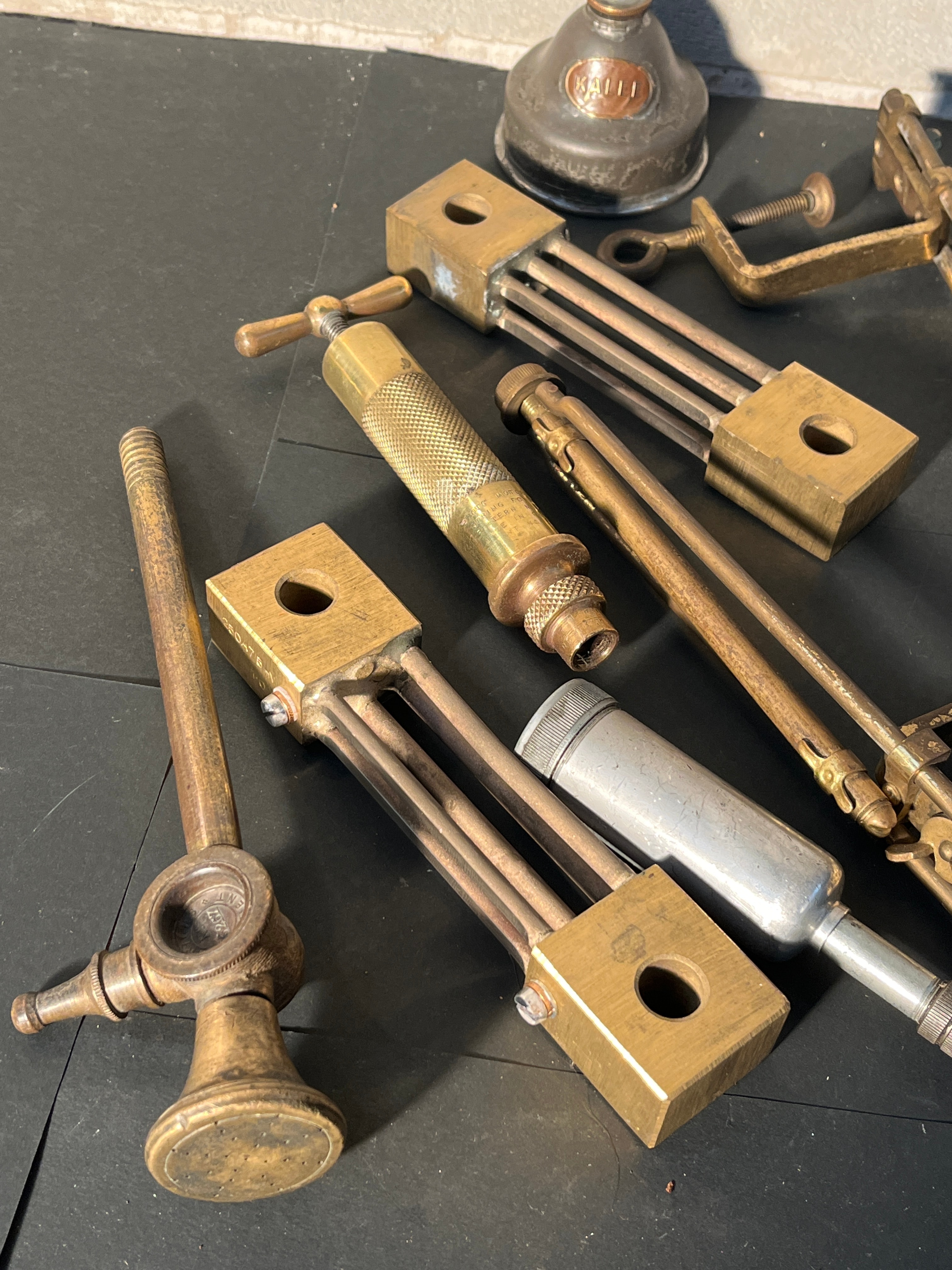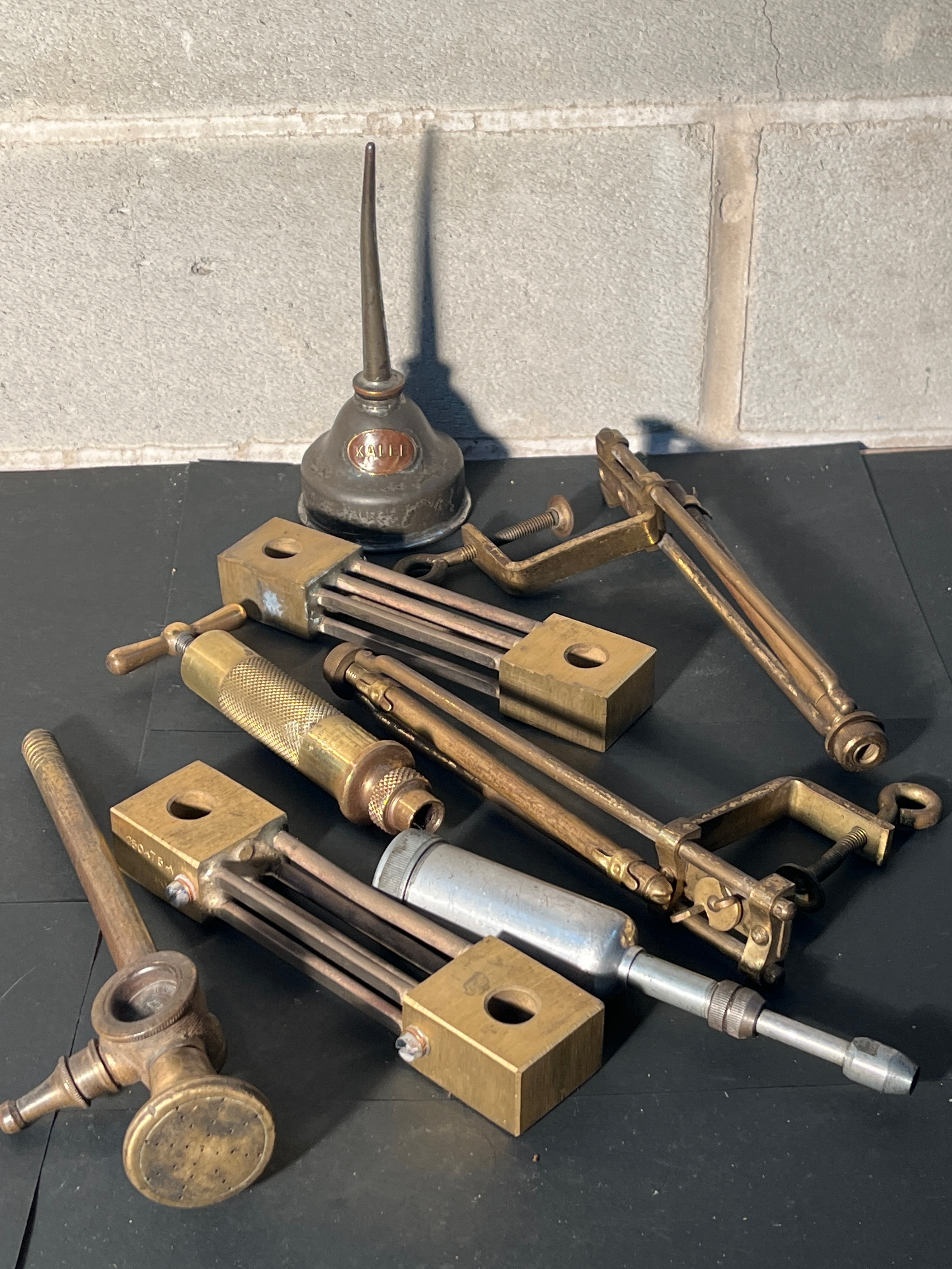 This lot presents a collection of vintage mechanical tools, primarily constructed from brass with steel fittings, an aluminum cylinder on one piece, and a tin or galvanized steel oil can. The assortment includes a small oil can prominently marked ‘WALL OIL’ on its side. Several brass-bodied specialized instruments are also present, featuring adjustable mechanisms often involving rectangular blocks and connecting rods. These instruments are visually consistent with components of a scientific apparatus, such as an ebulliometer. One piece has a knurled brass handle, and another terminates in a perforated brass disc, possibly a spray nozzle.