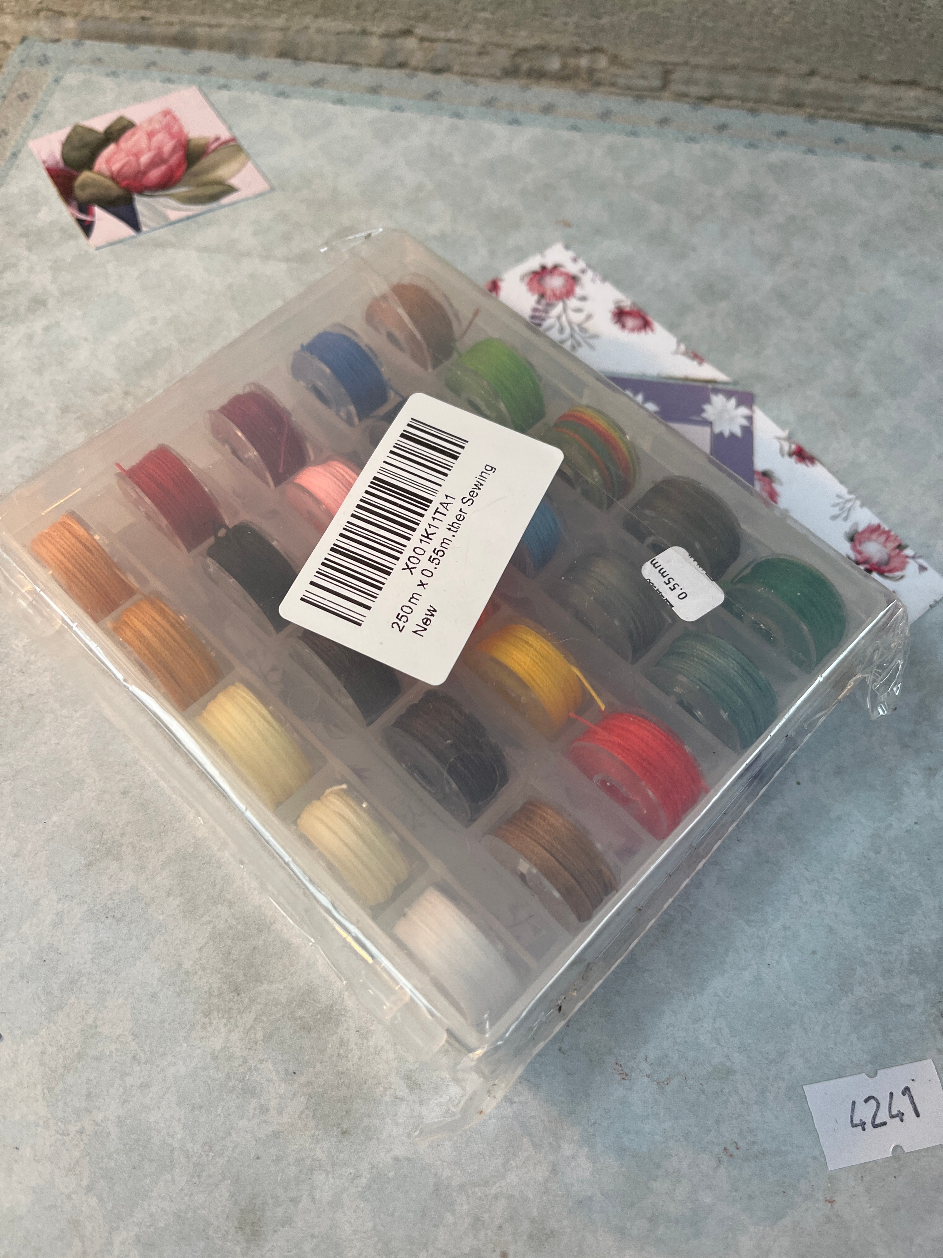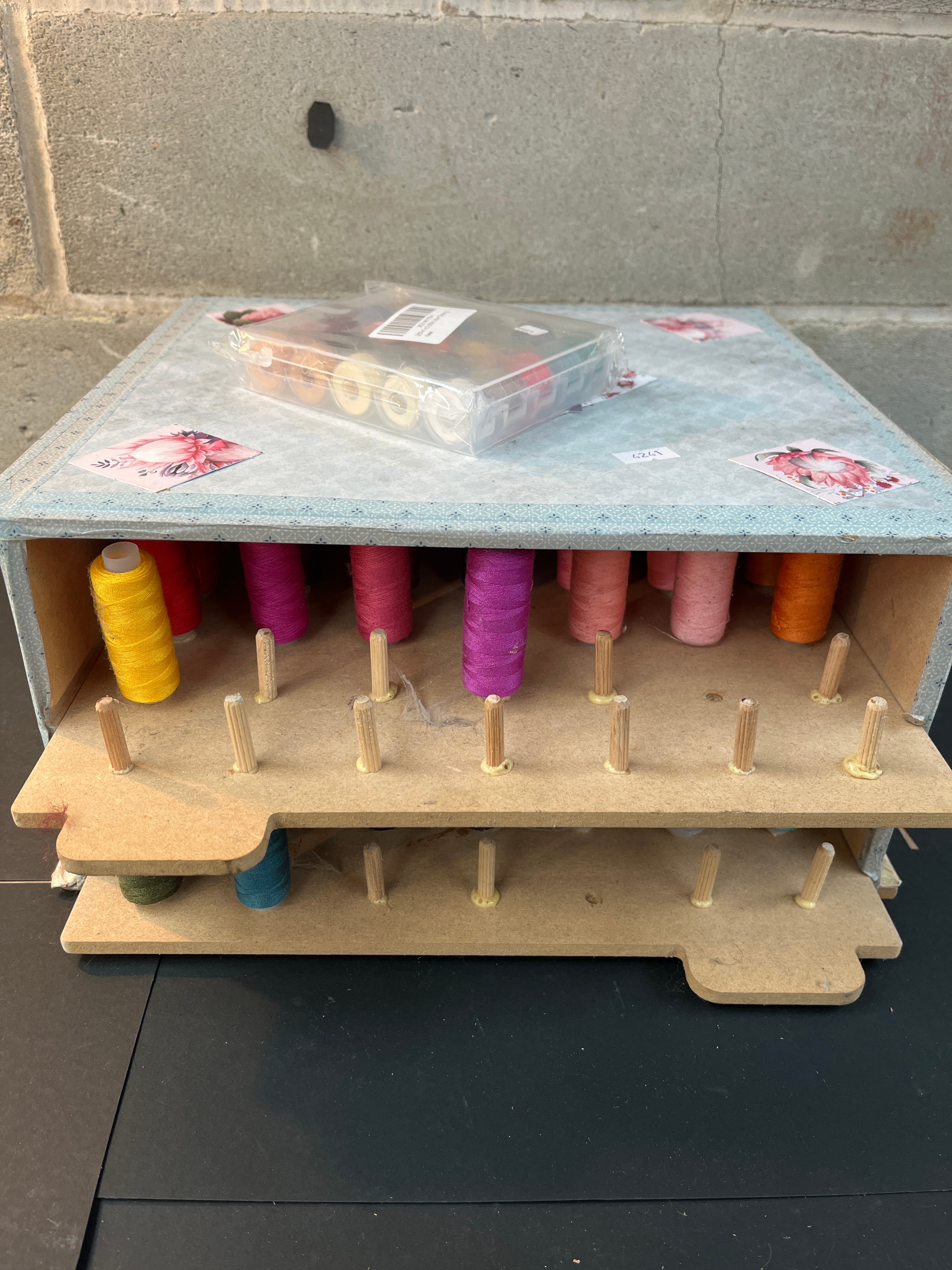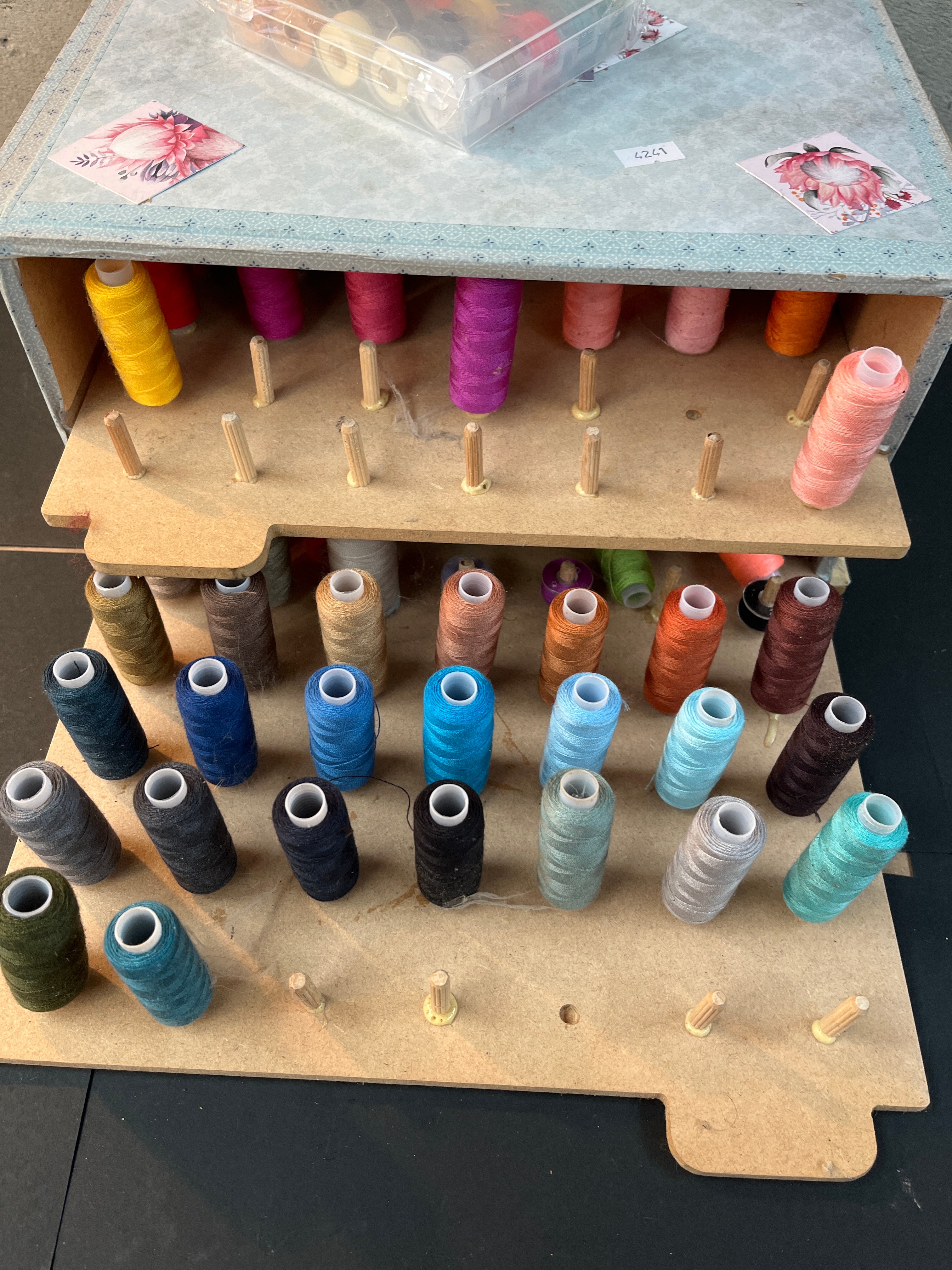 A multi-tiered, pull-out thread storage organizer, constructed from light-colored wood or MDF, decorated with a light blue patterned paper featuring pink floral accents. It comprises two pull-out trays, each fitted with multiple small wooden pegs designed to hold spools of thread. The trays contain a wide range of colored spools. Resting on top of the organizer is a clear plastic compartmentalized box containing numerous smaller bobbins of thread. The box bears a barcode label with “X01OKTTXJ4”, “250m x 0.55m Luter Sewing”, and “New” text; one bobbin inside is marked “0.55mm”. A small white sticker with the handwritten number “4241” is affixed to the top surface.