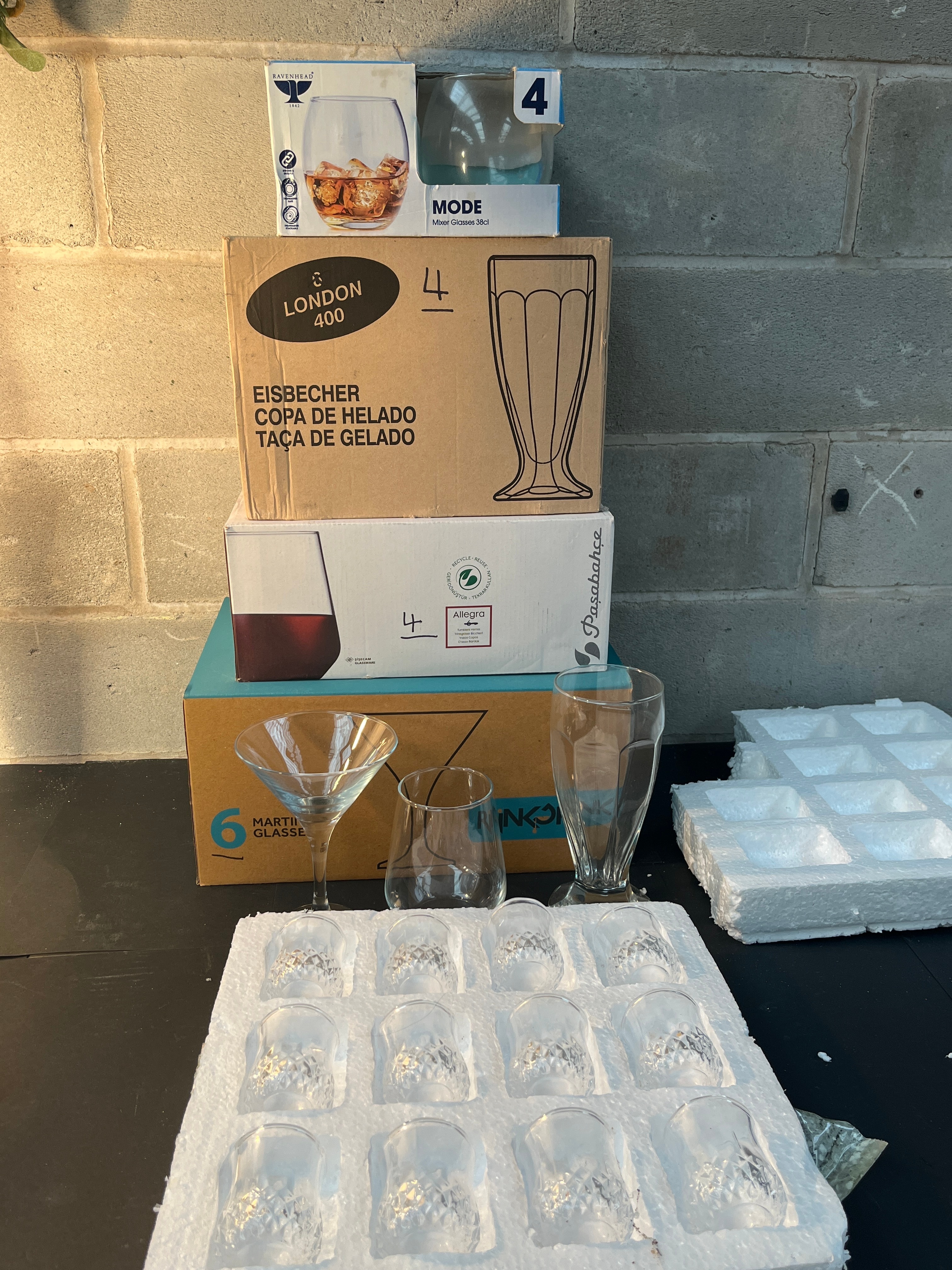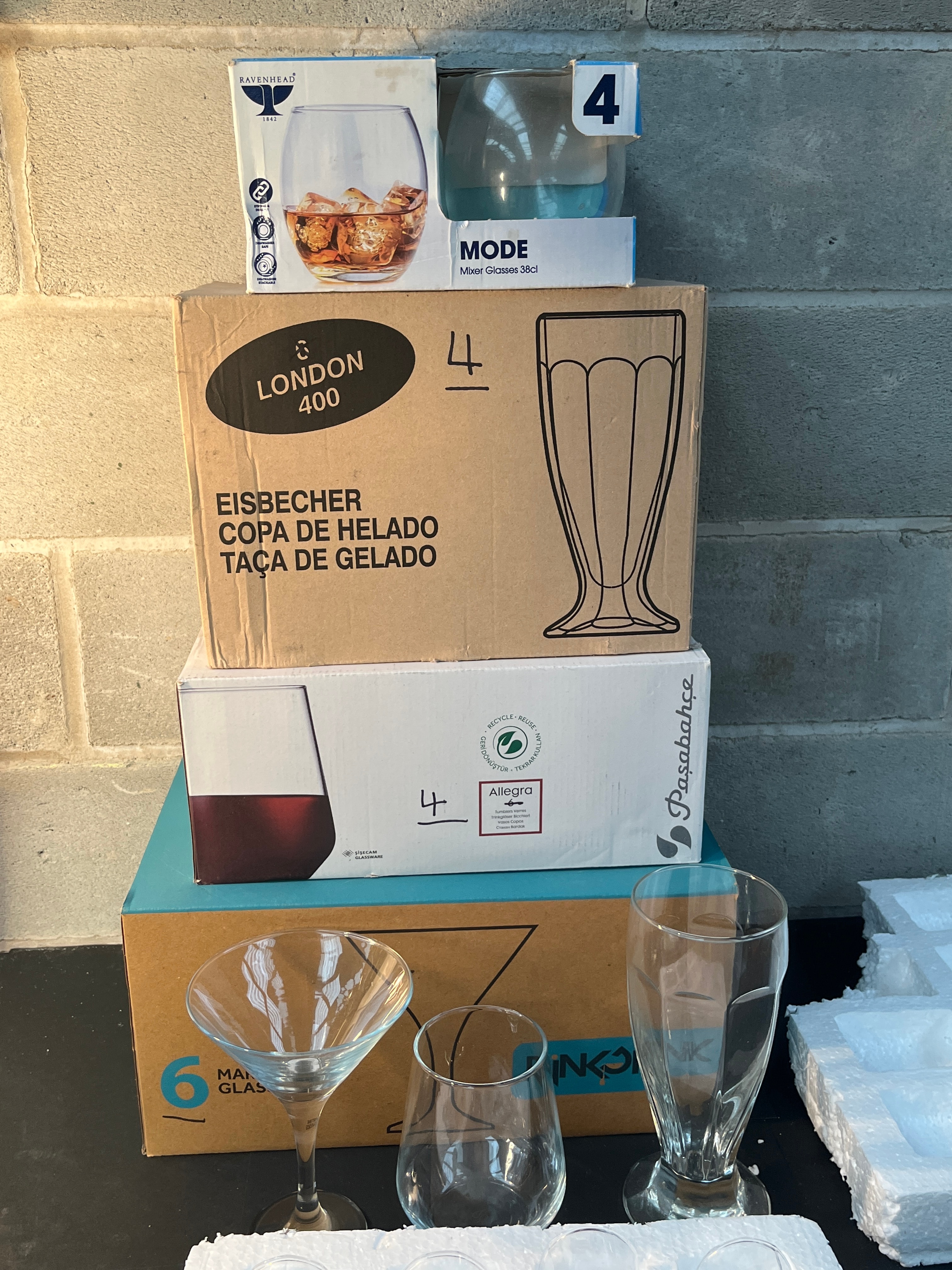 A collection of new, contemporary clear glass drinkware, primarily presented in original cardboard and Styrofoam packaging. The assortment includes various sets of tumblers, cocktail glasses, dessert glasses, and martini glasses. Visible brand names include Ravenhead, Mode, London 400, and Pasabahçe Allegra. Packaging details such as “Mixed Glasses 38cl,” “Martini Gläser,” and “EISBECHER COPA DE HELADO TAÇA DE GELADO” (ice cream cup) are present. Quantities of 4 or 6 are marked on several boxes.