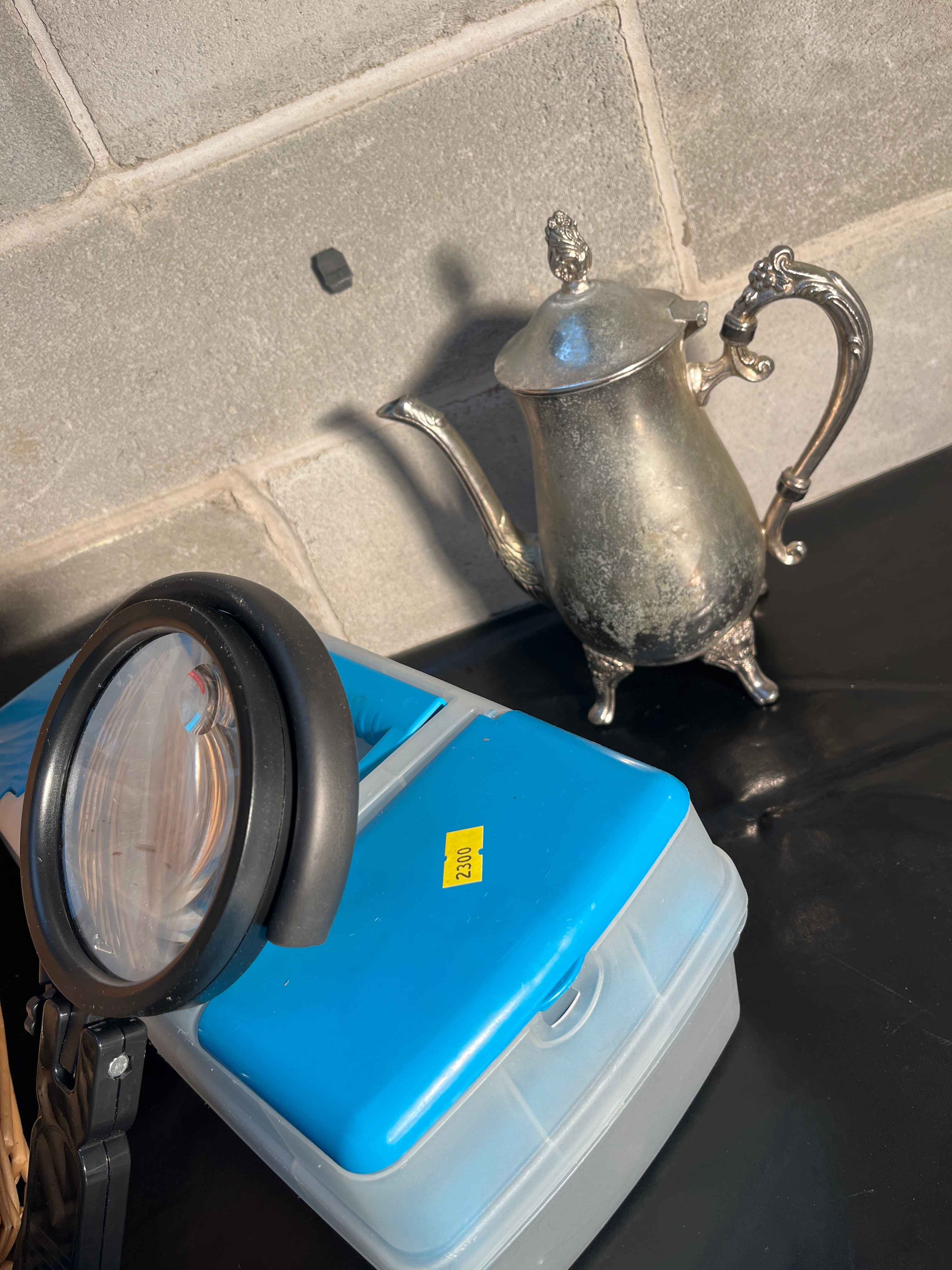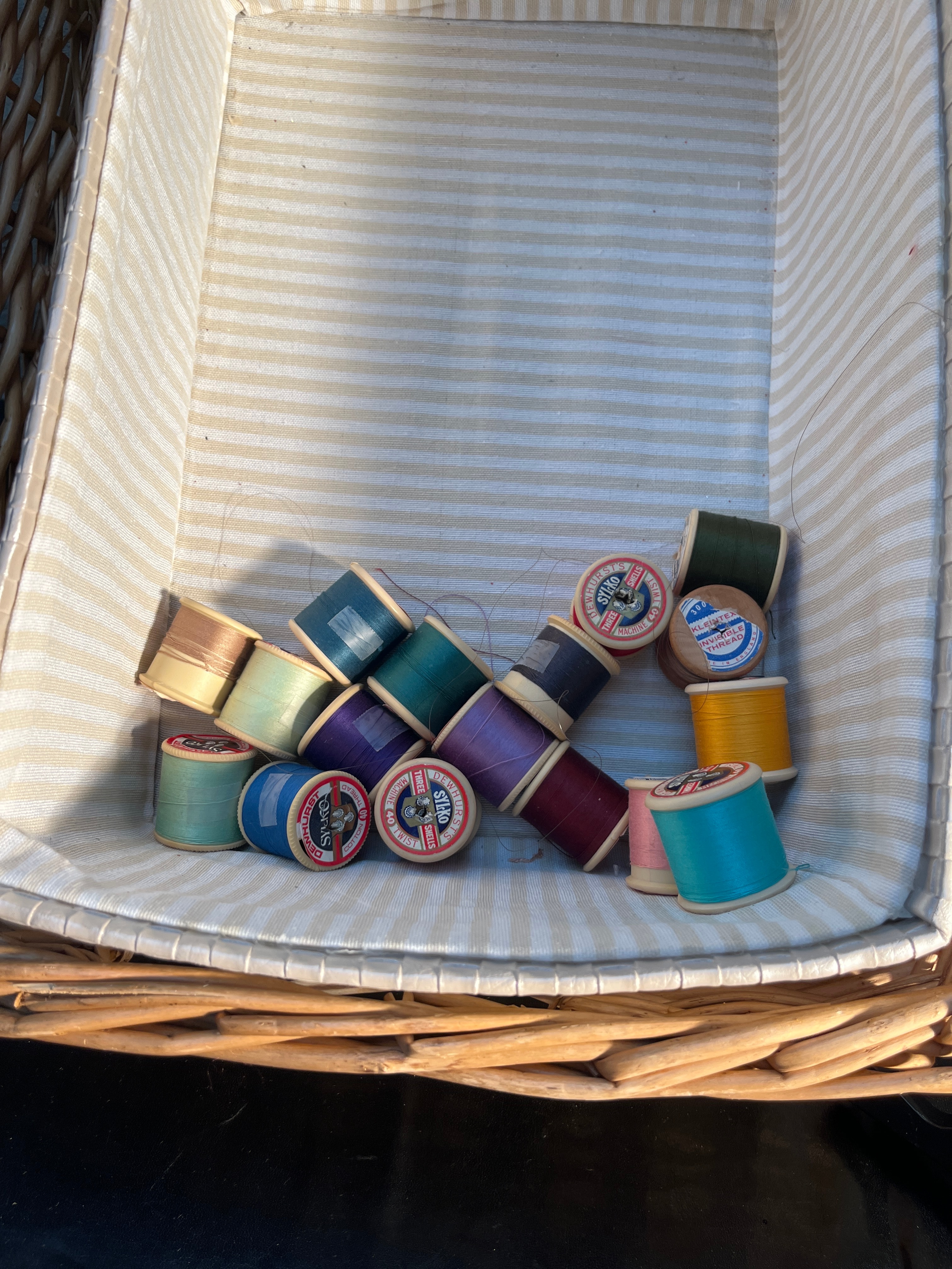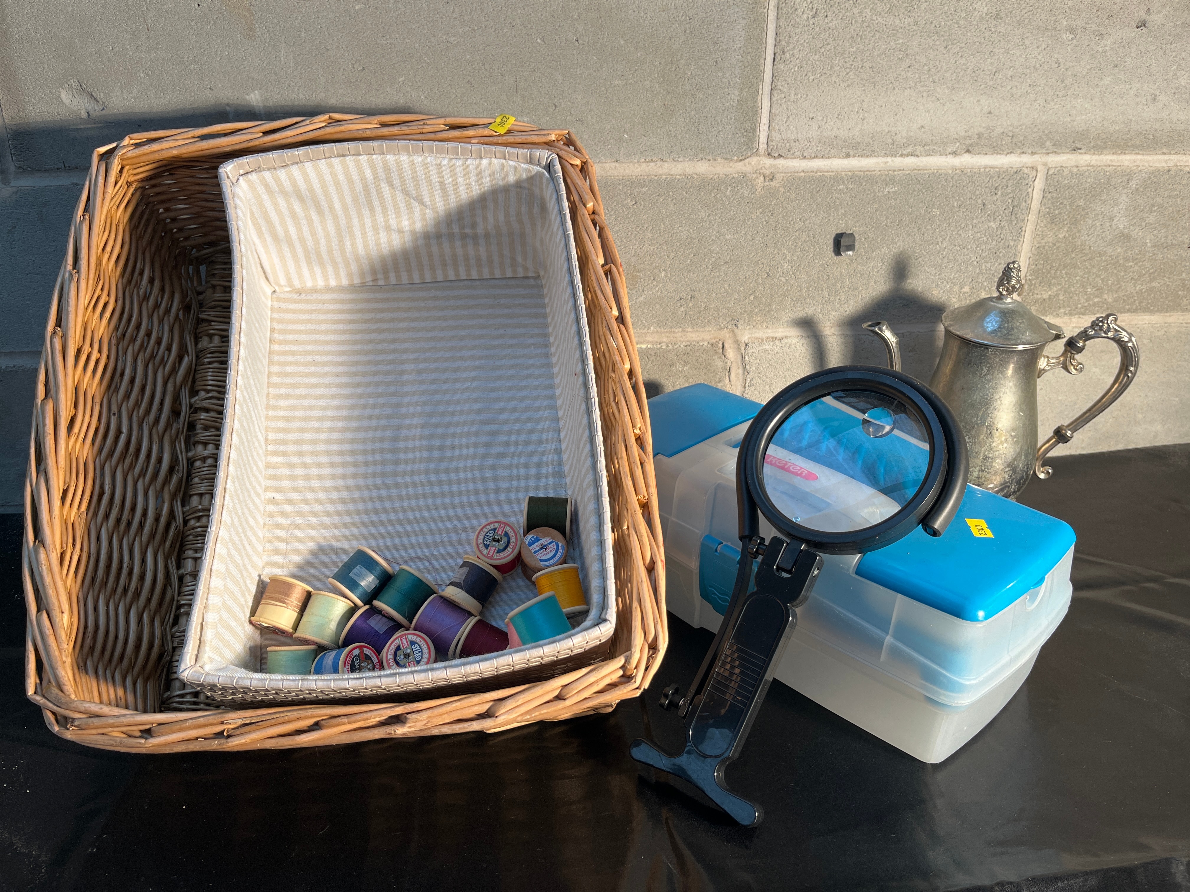 An IKEA DJURTRÄNARE rectangular woven wicker basket with a striped beige and white fabric liner. Contained within the basket are approximately twenty spools of vintage-style sewing thread, some marked ‘STERLING’ and ‘COATS & CLARK’S O.N.T. BEST SIX CORD MADE IN U.S.A. MERCERIZED’. Also included is a black plastic desktop magnifying lamp with a stand. A silver-colored metal teapot, featuring an ornate handle, spout, lid finial, and four feet. And a translucent grey plastic storage container with a blue lid, bearing a yellow sticker marked ‘2.00’.