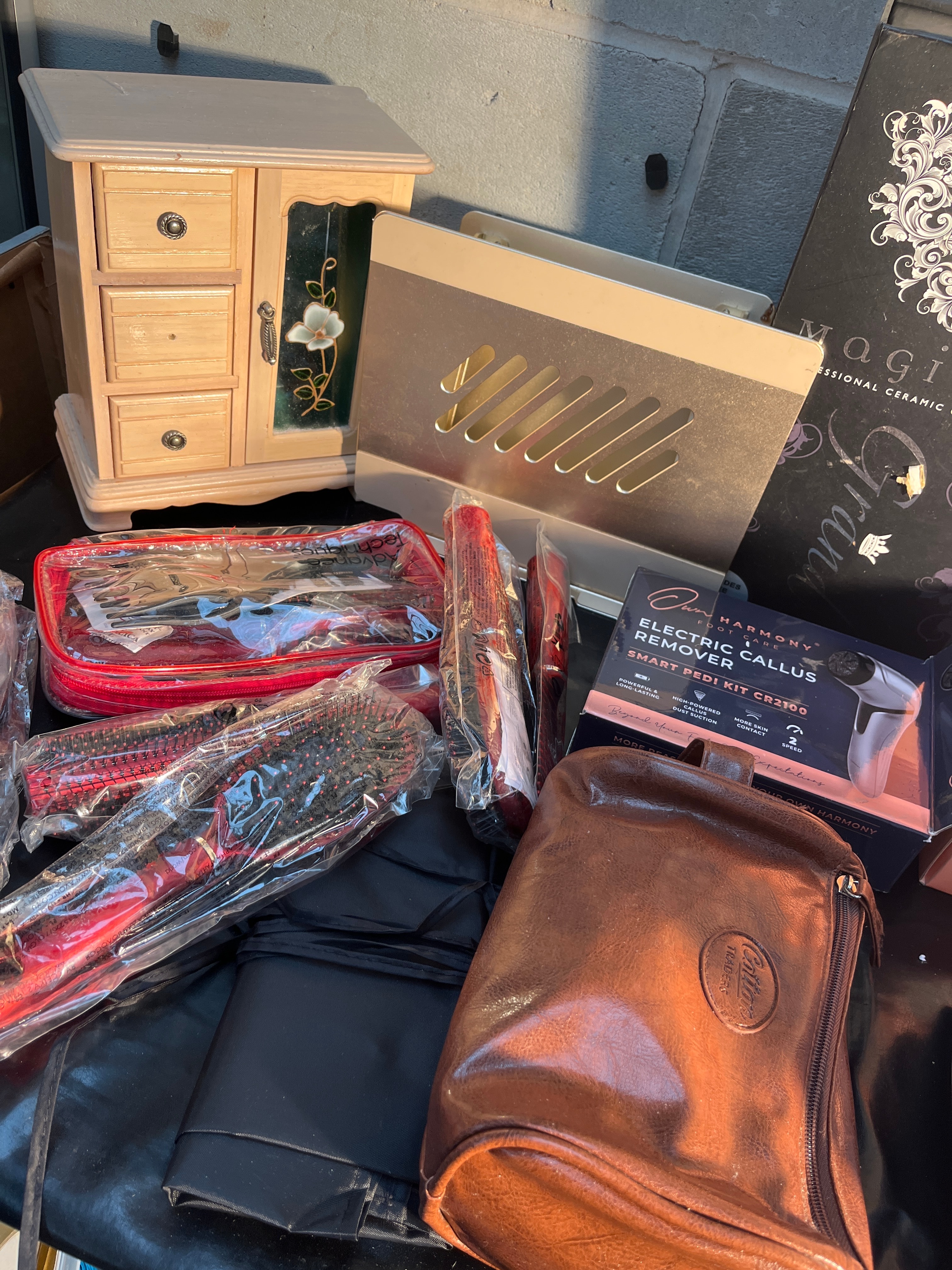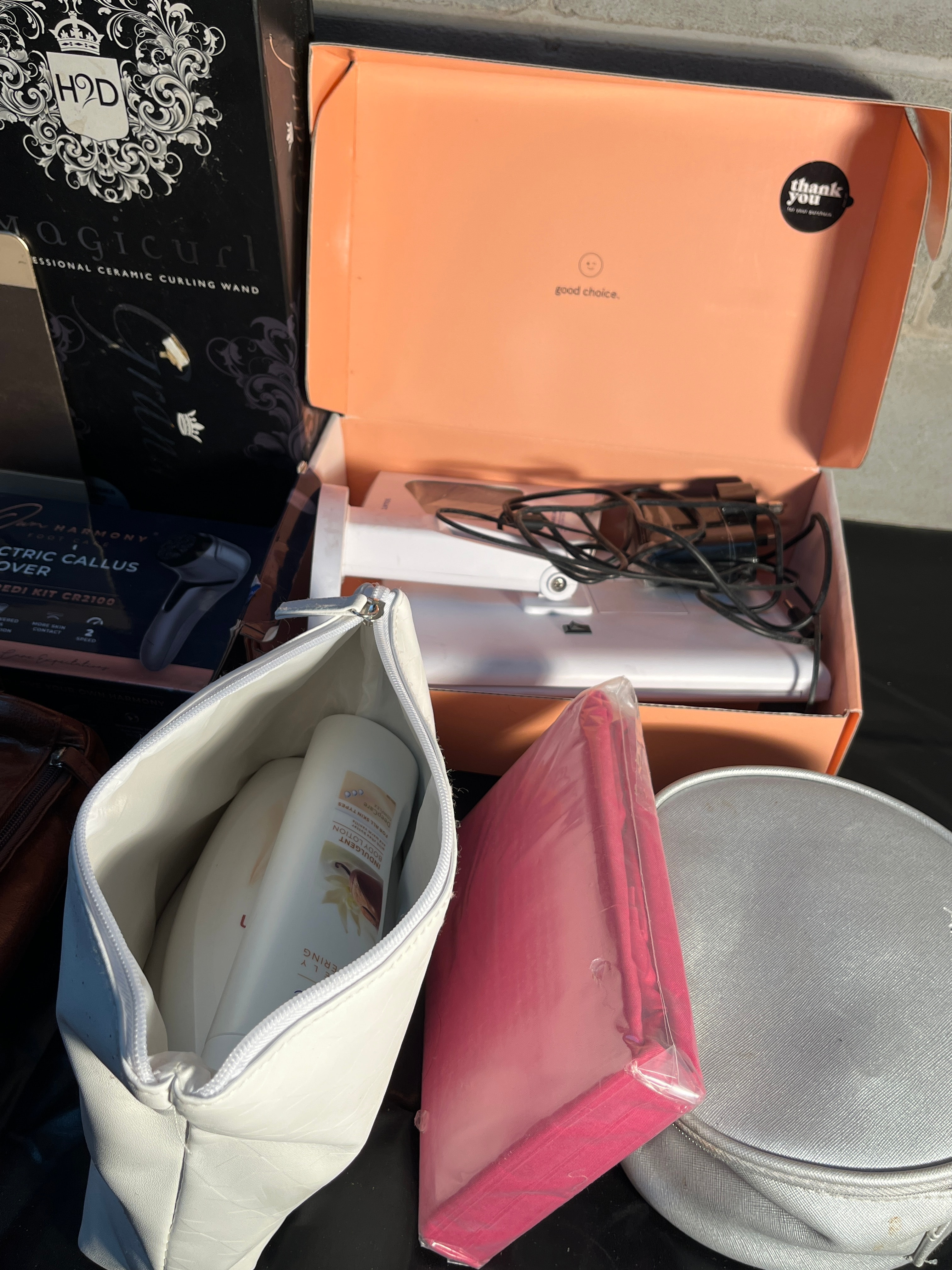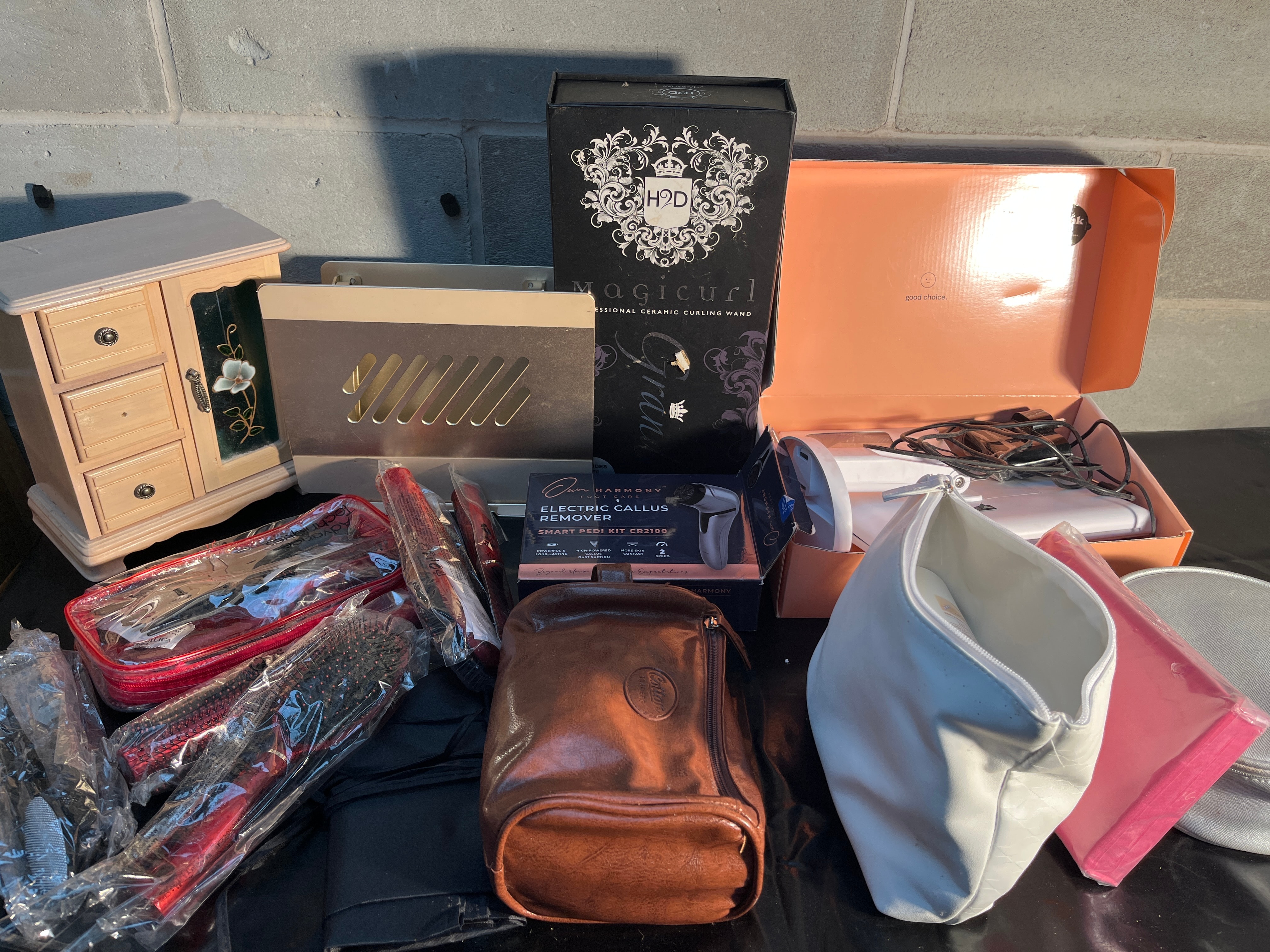 A diverse collection of modern personal care, beauty, and small storage items. The lot includes an H2D Magicurl Professional Ceramic Curling Wand, prominently marked “Made in Italy” and presented in its original packaging. Also present is a HARMONY ELECTRIC CALLUS REMOVER SMART PEDI KIT CR2100 in its original box. The collection features a light wood jewelry box with drawers and a mirrored door adorned with a floral motif, and a brown leather zippered toiletry bag bearing the “Cantieri” brand. Numerous hairbrushes and styling tools are included, many sealed in clear plastic packaging or red zippered cases. An open orange box contains a white electronic appliance with associated cables, labeled “good choice.” and “thank you.” Additionally, a white soft pouch holds a toiletry bottle, a pink fabric item, and a silver round zippered case. The items are primarily composed of plastic, metal, wood, leather, and various fabrics.