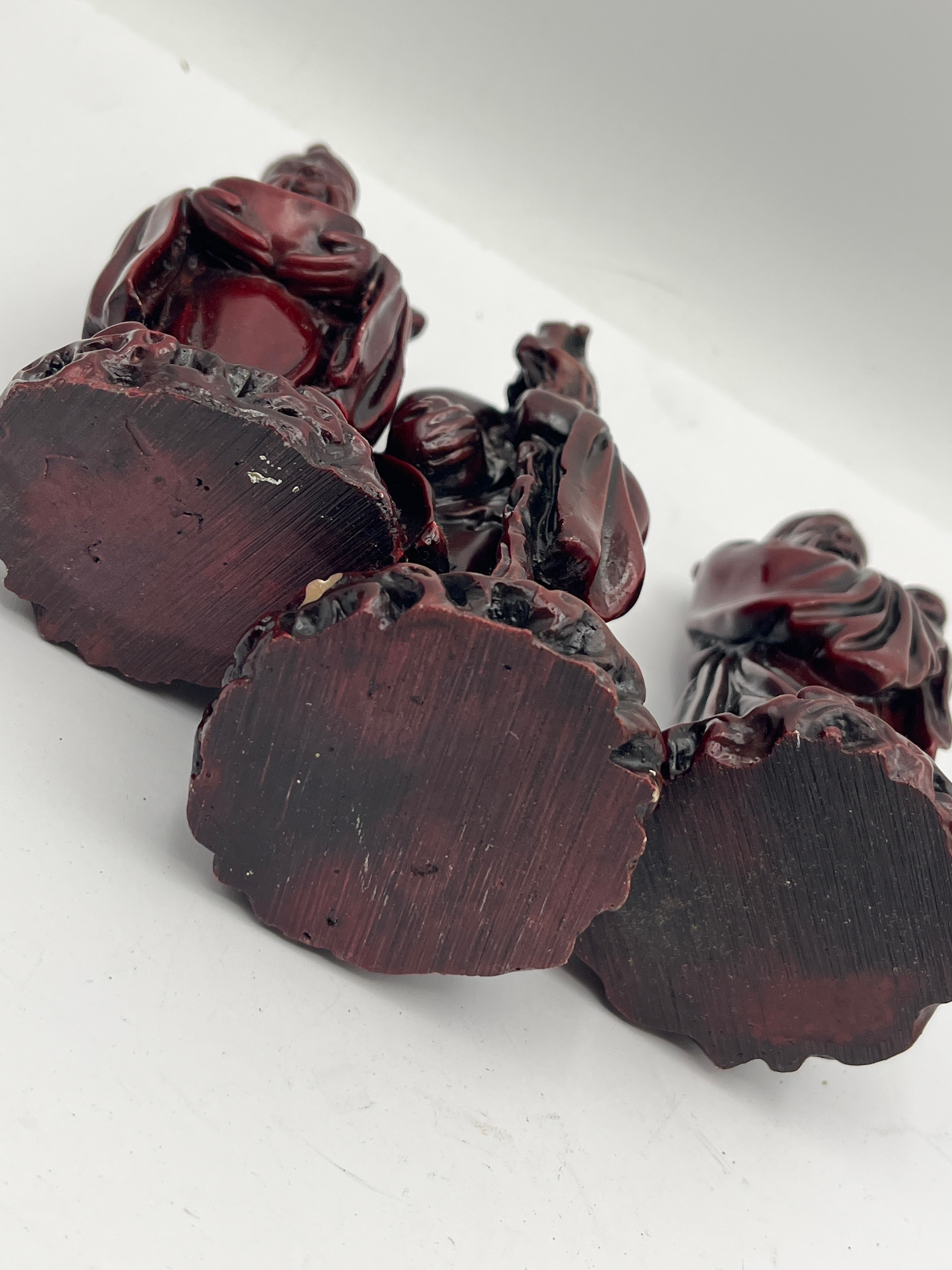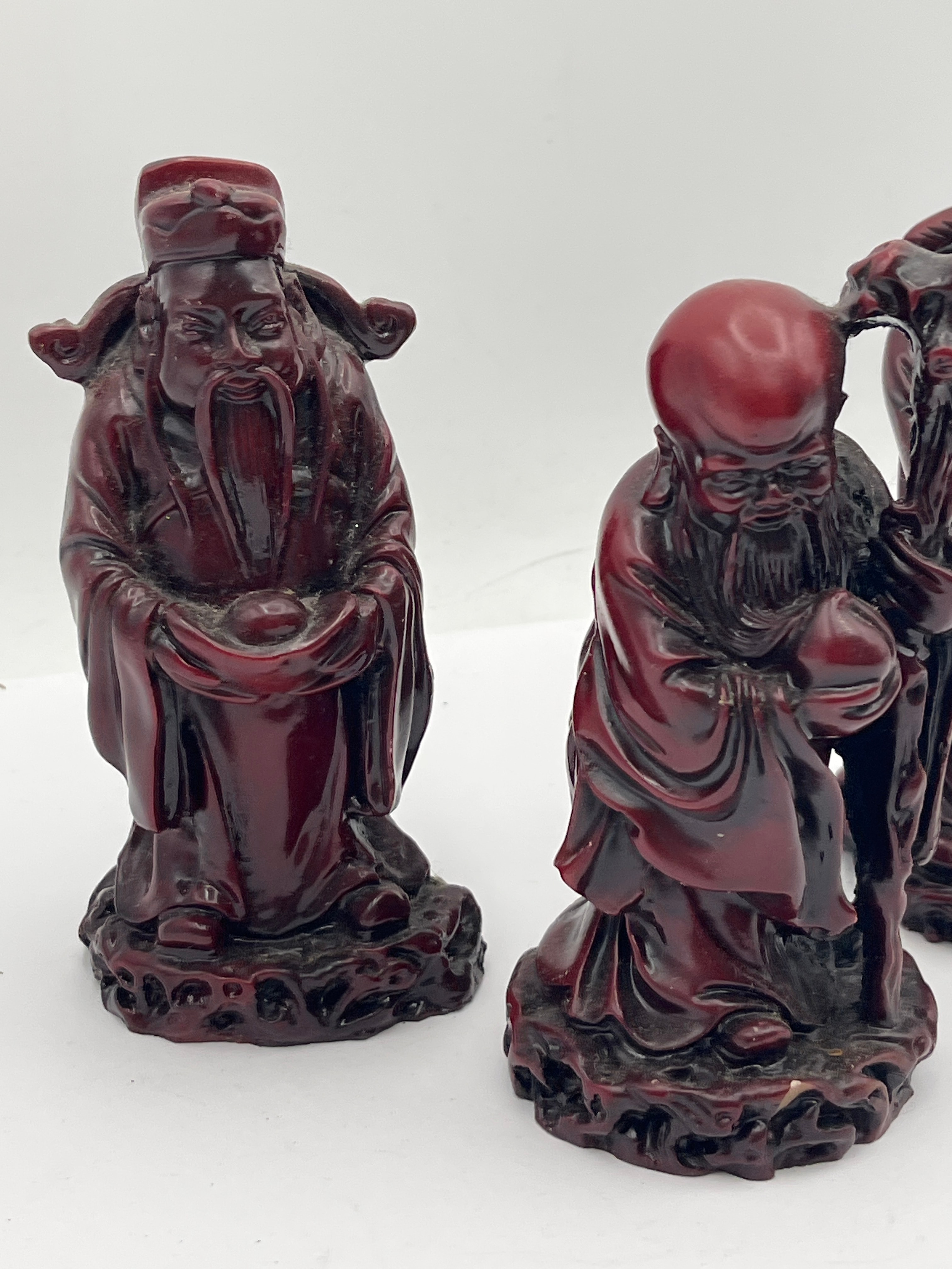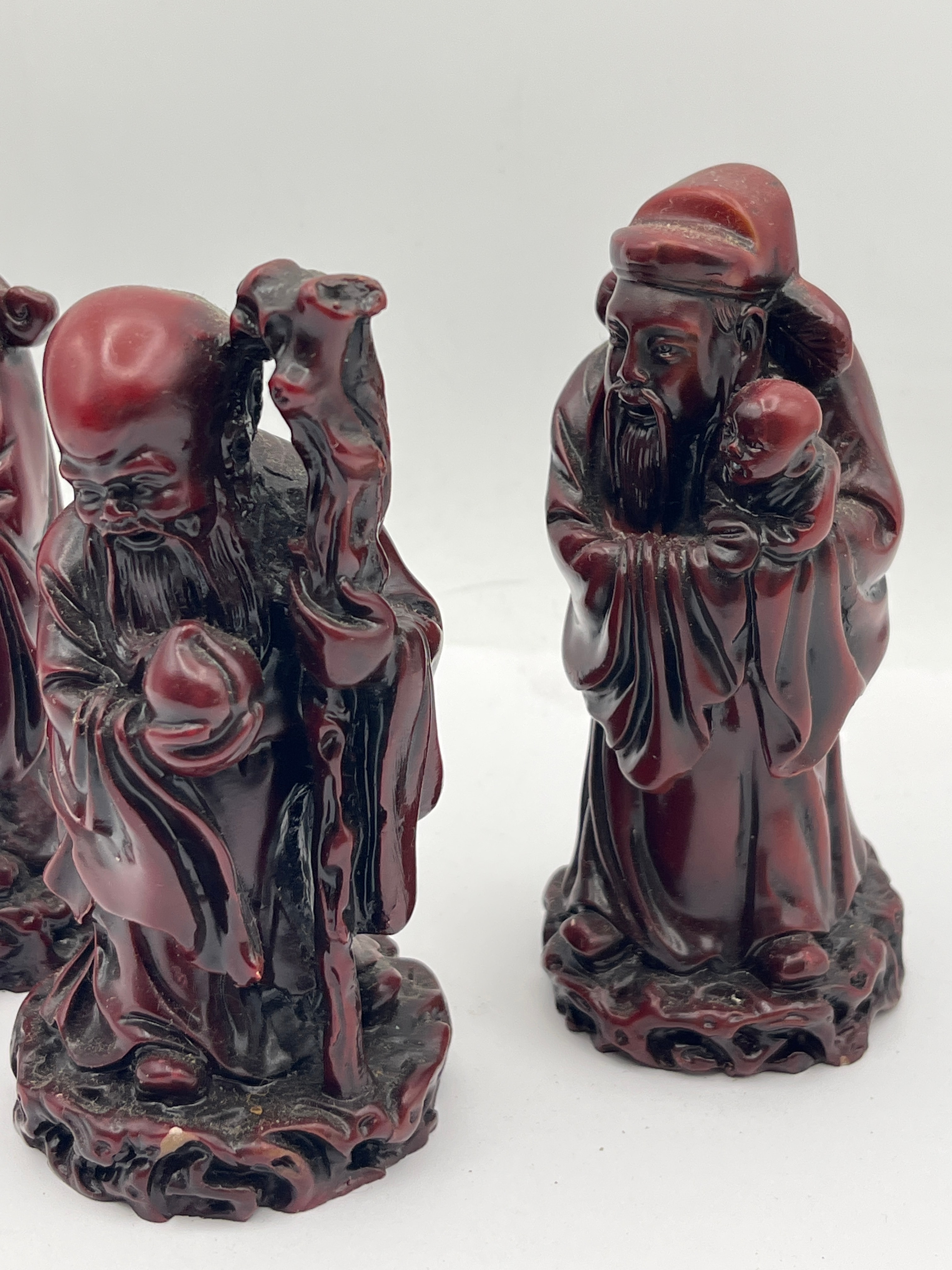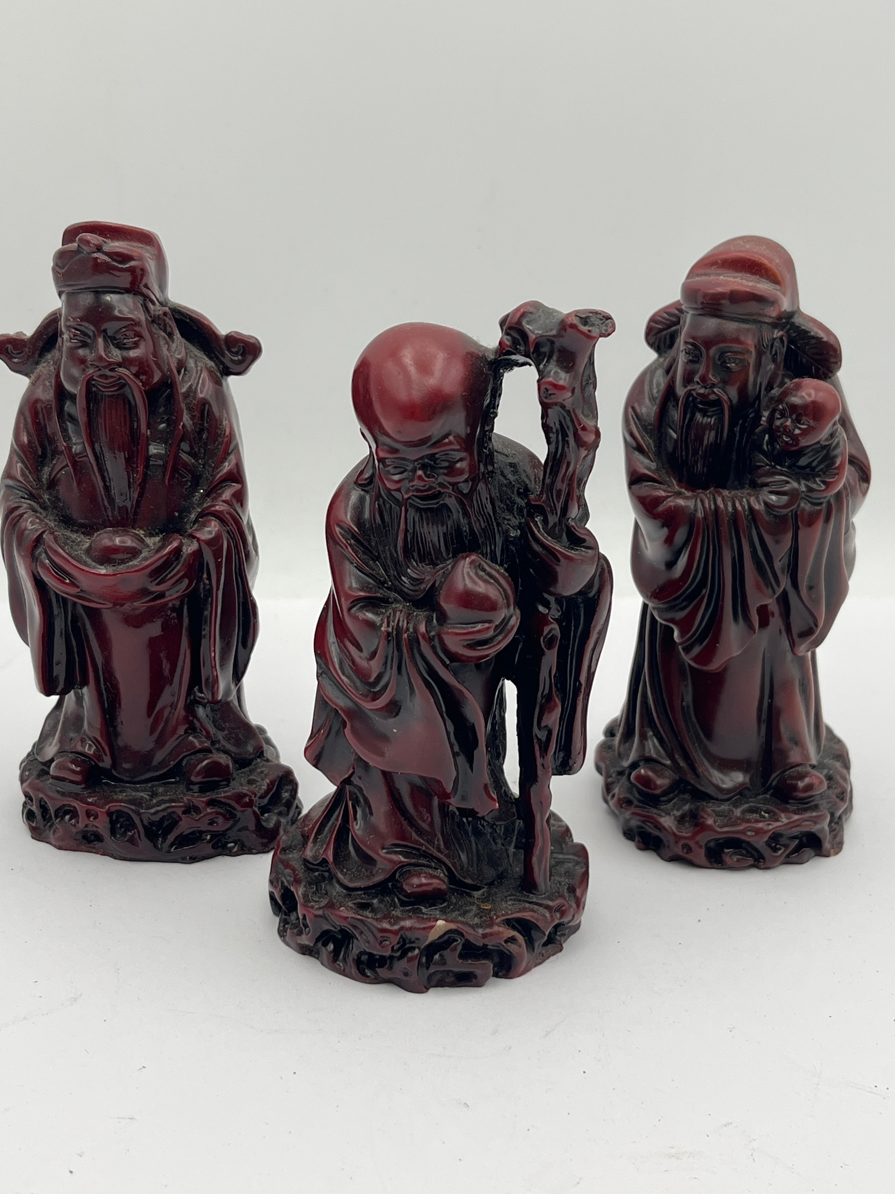 A set of three red resin Chinese Fuk Luk Sau figurines. Each figurine depicts an elderly male figure in traditional East Asian robes; one holds a staff and an orb, another holds a larger orb, and the third cradles a child. The figurines feature a glossy, dark red finish, simulating cinnabar or lacquered wood. They are consistent in style with traditional depictions of the ‘Fu Lu Shou’ deities and are modern decorative items. No visible texts or markings are present.