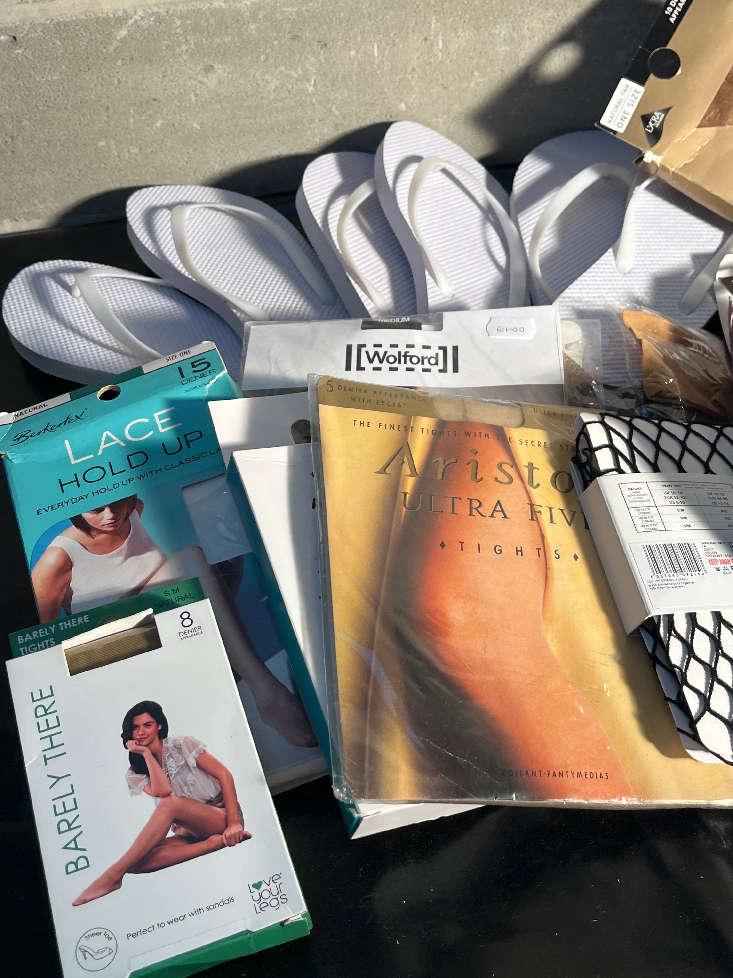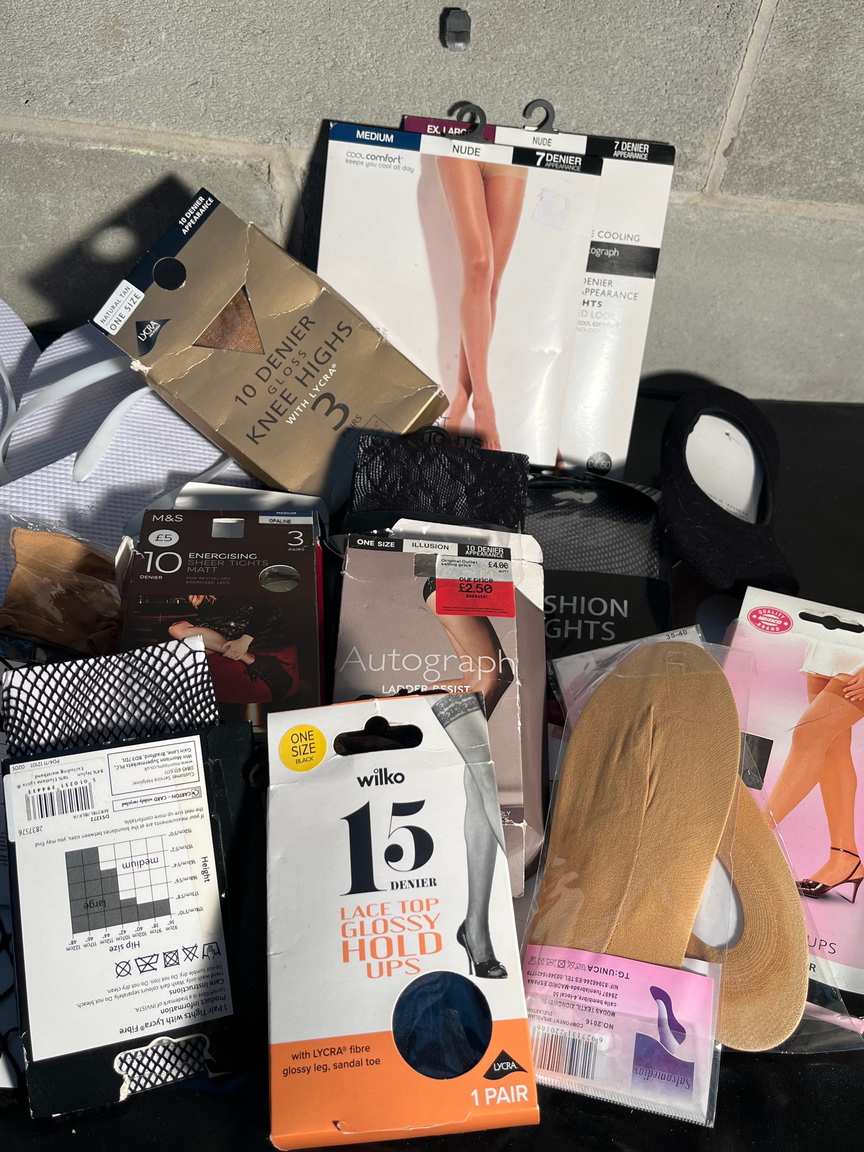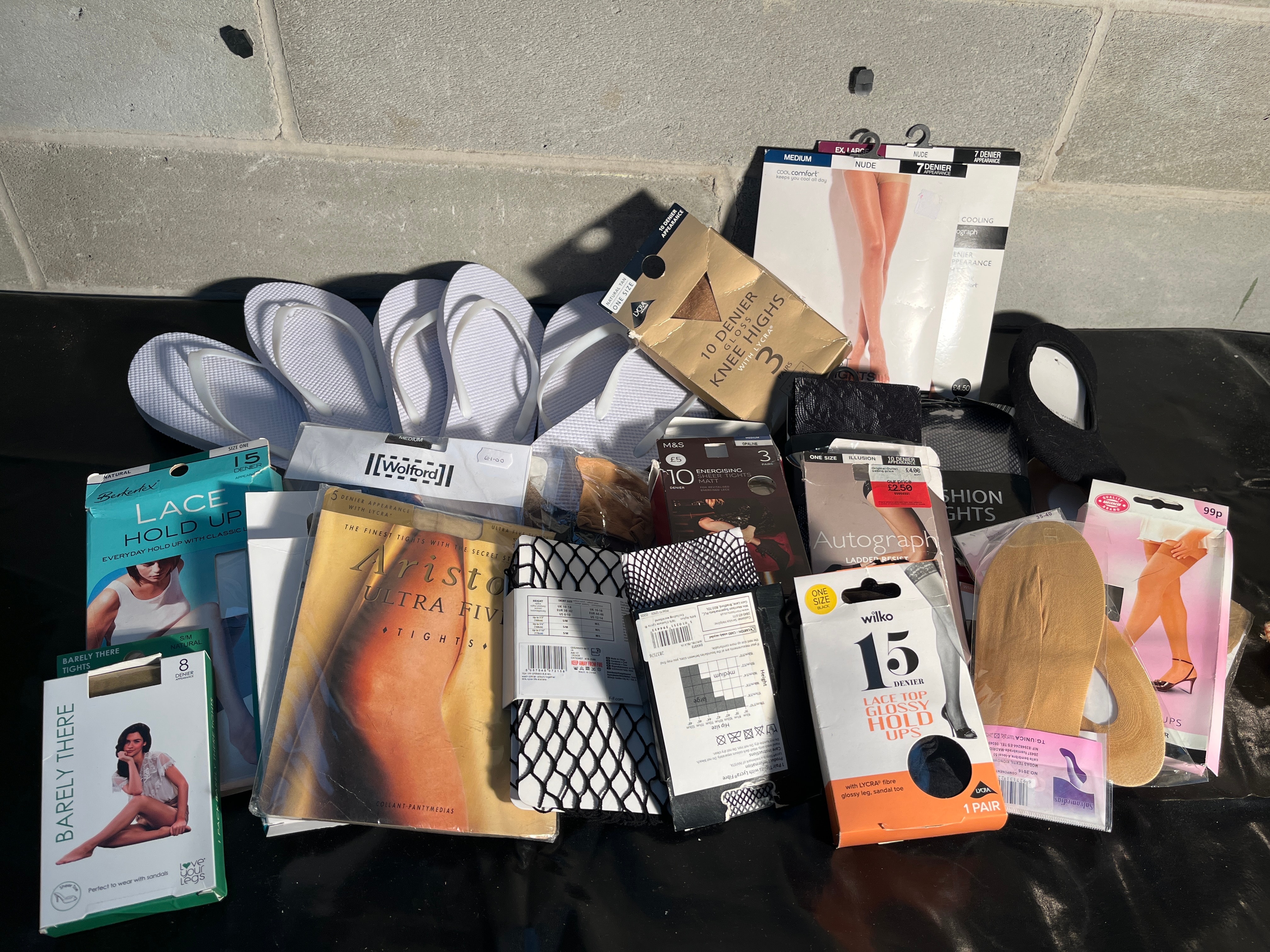 A varied collection of women’s hosiery and basic footwear accessories. The lot comprises numerous pairs of tights, hold-ups, and knee-high socks from contemporary brands including Wolford, Aristoc, M&S (Marks & Spencer), Autograph, Berkeley, Barely There, and Wilko. Denier counts range from 5 to 30, with specific product types noted as “10 Denier Knee Highs,” “15 Denier Lace Top Glossy Hold Ups,” “7 Denier Cool Comfort,” and “Ultra Fives Tights.” Colors observed include nude, black, and natural tones. Also present are multiple pairs of plain white rubber/EVA flip-flops, silicone heel grip inserts, and a small black accessories pouch. Most items display sizing information (e.g., One Size, Medium, L, XL) and material indicators such as “with LYCRA.”