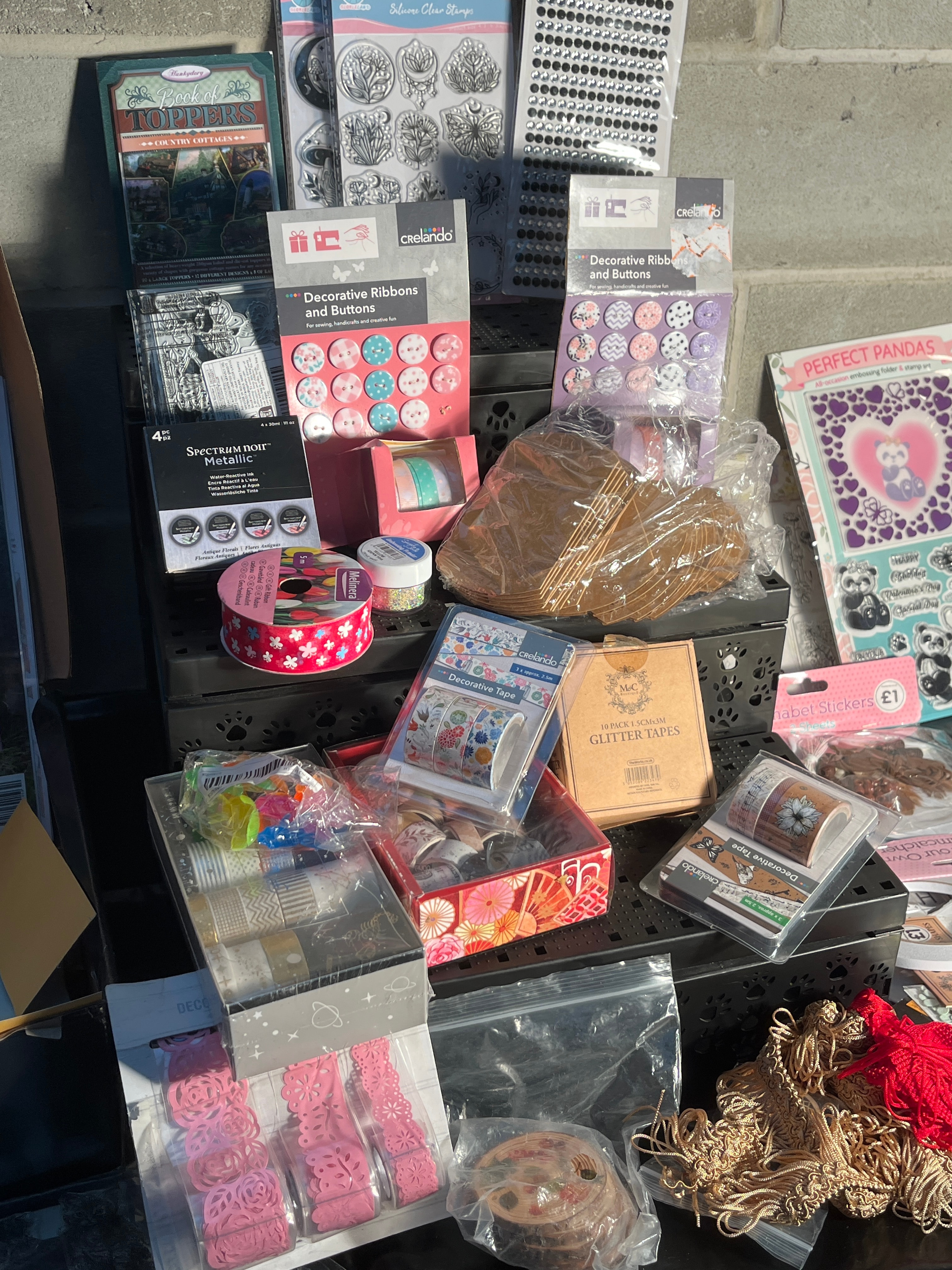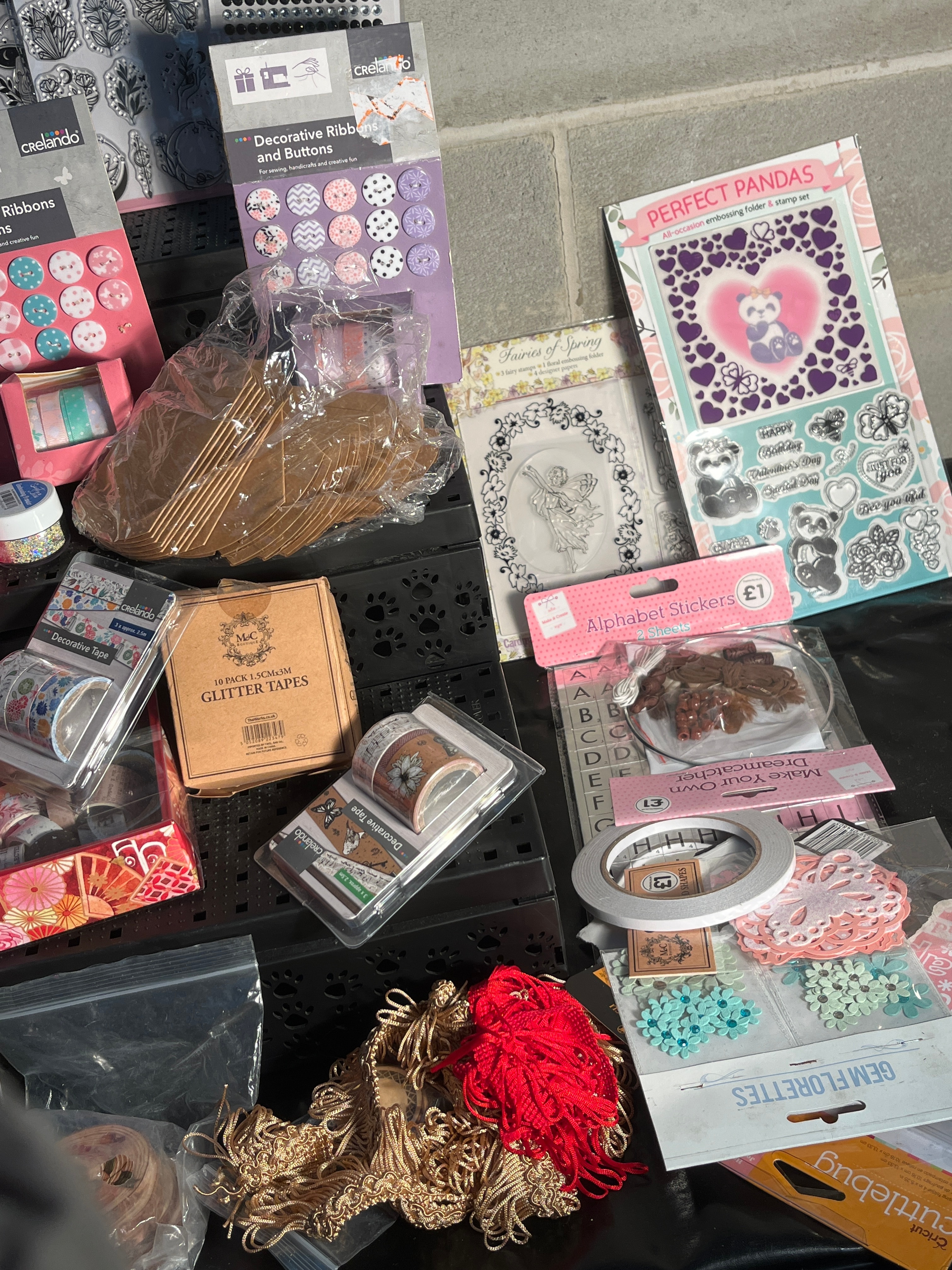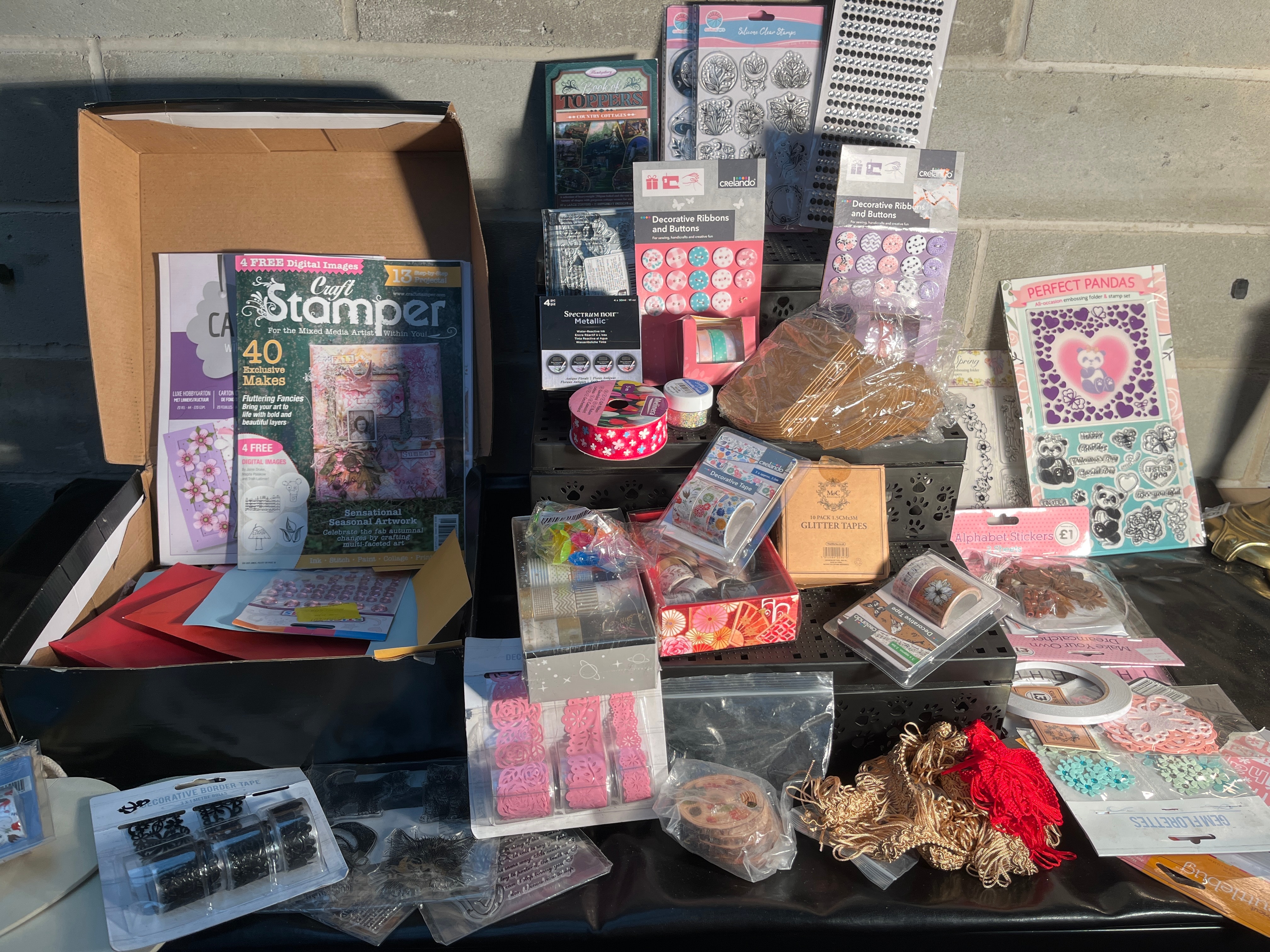 A collection comprising various issues of ‘Craft Stamper’ magazines, identified through web intelligence as back issues. The lot also includes a diverse array of new, packaged crafting items such as ‘Crelando’ decorative ribbons and buttons, ‘Perfect Pandas’ themed stamp and sticker sets, ‘Fairy of Spring’ embellishments, ‘Sweet N Sour Metallic’ items, and ‘Glitter Tapes’. Further components include ‘Alphabet Stickers’ (marked £1), ‘Silver Clear Stamps’, various decorative tapes, ‘GEMFLORETTES’, and a selection of loose ribbons, cords (red and gold-toned), and small decorative elements. The materials predominantly consist of paper, plastic, fabric, and adhesive.