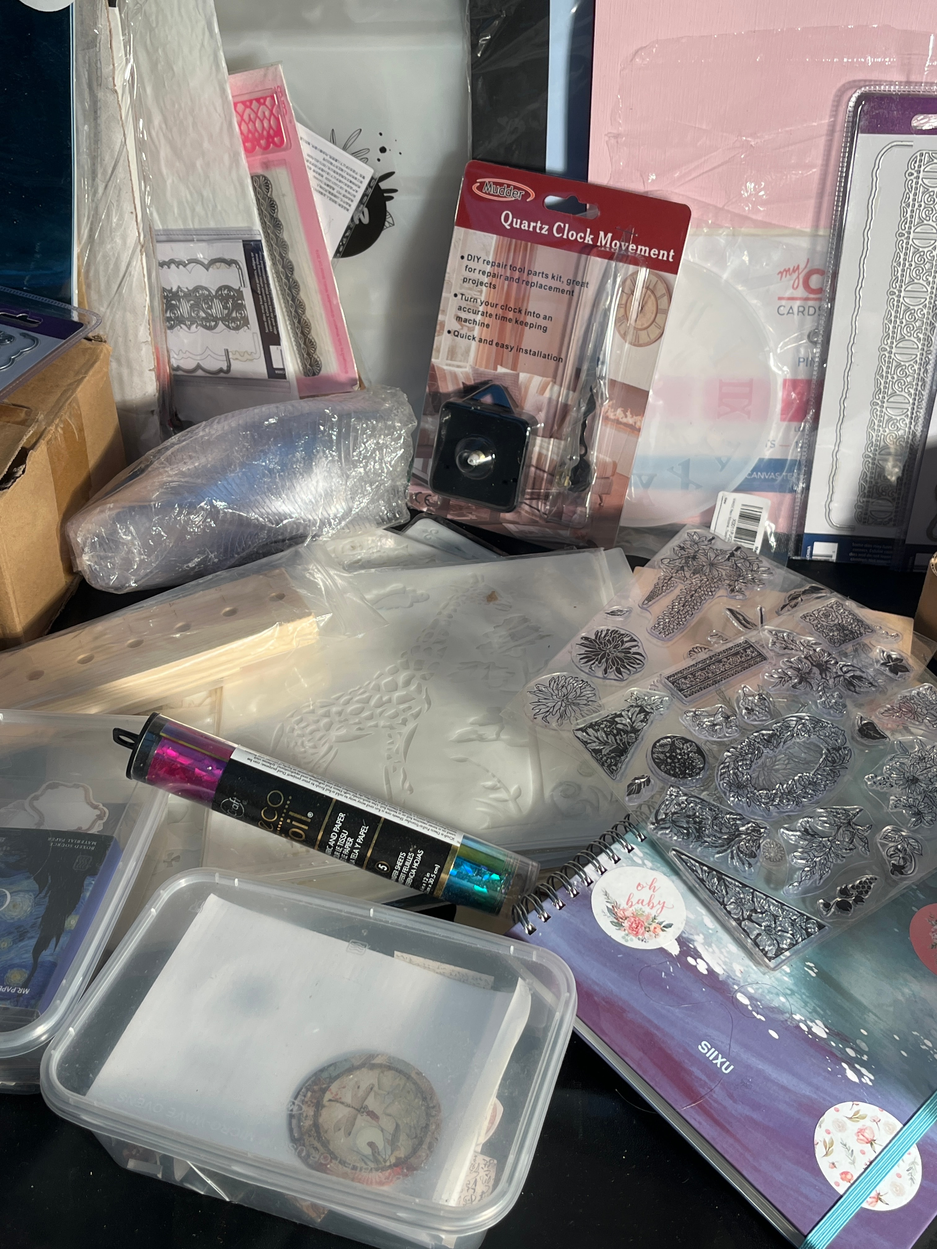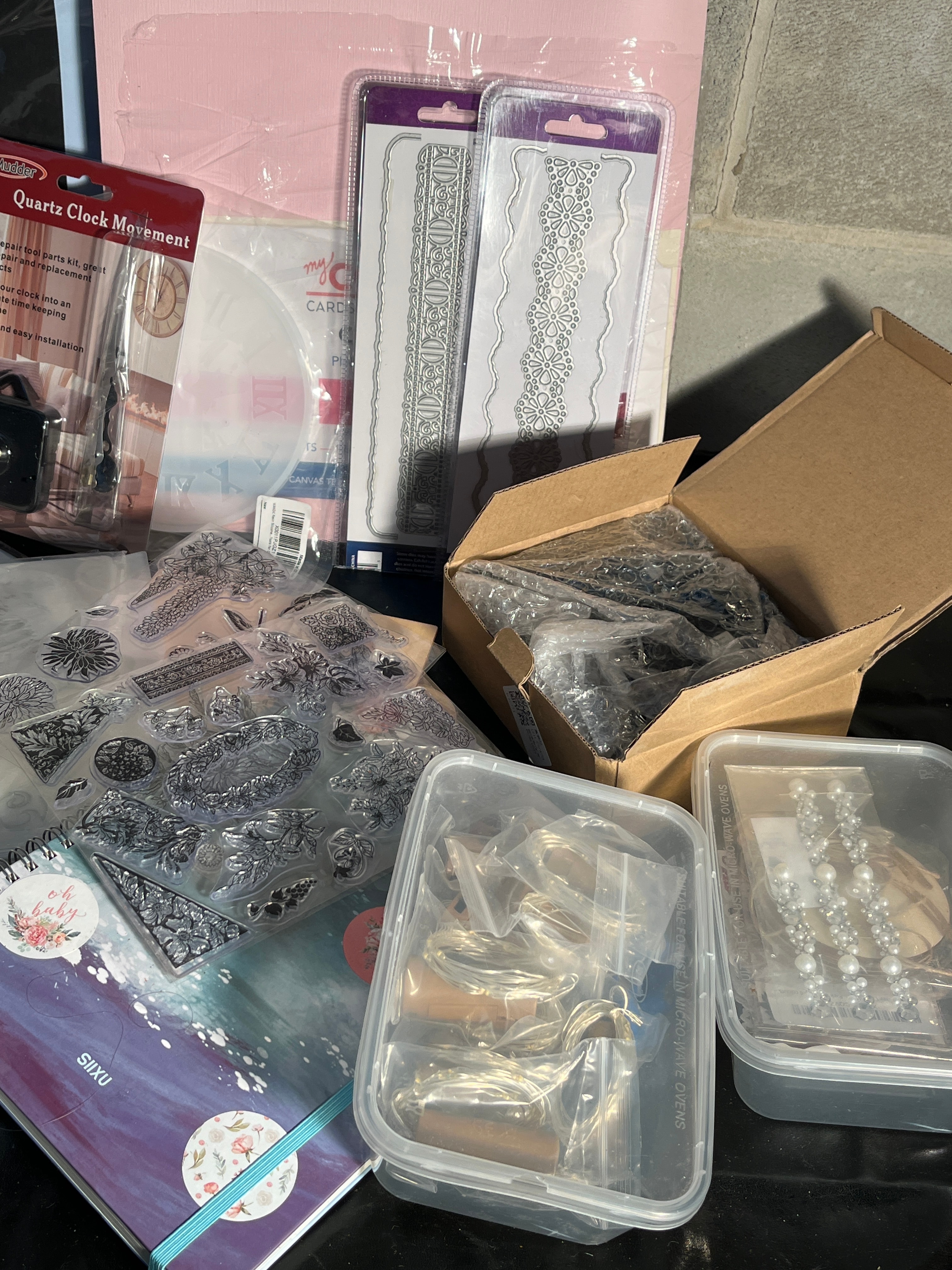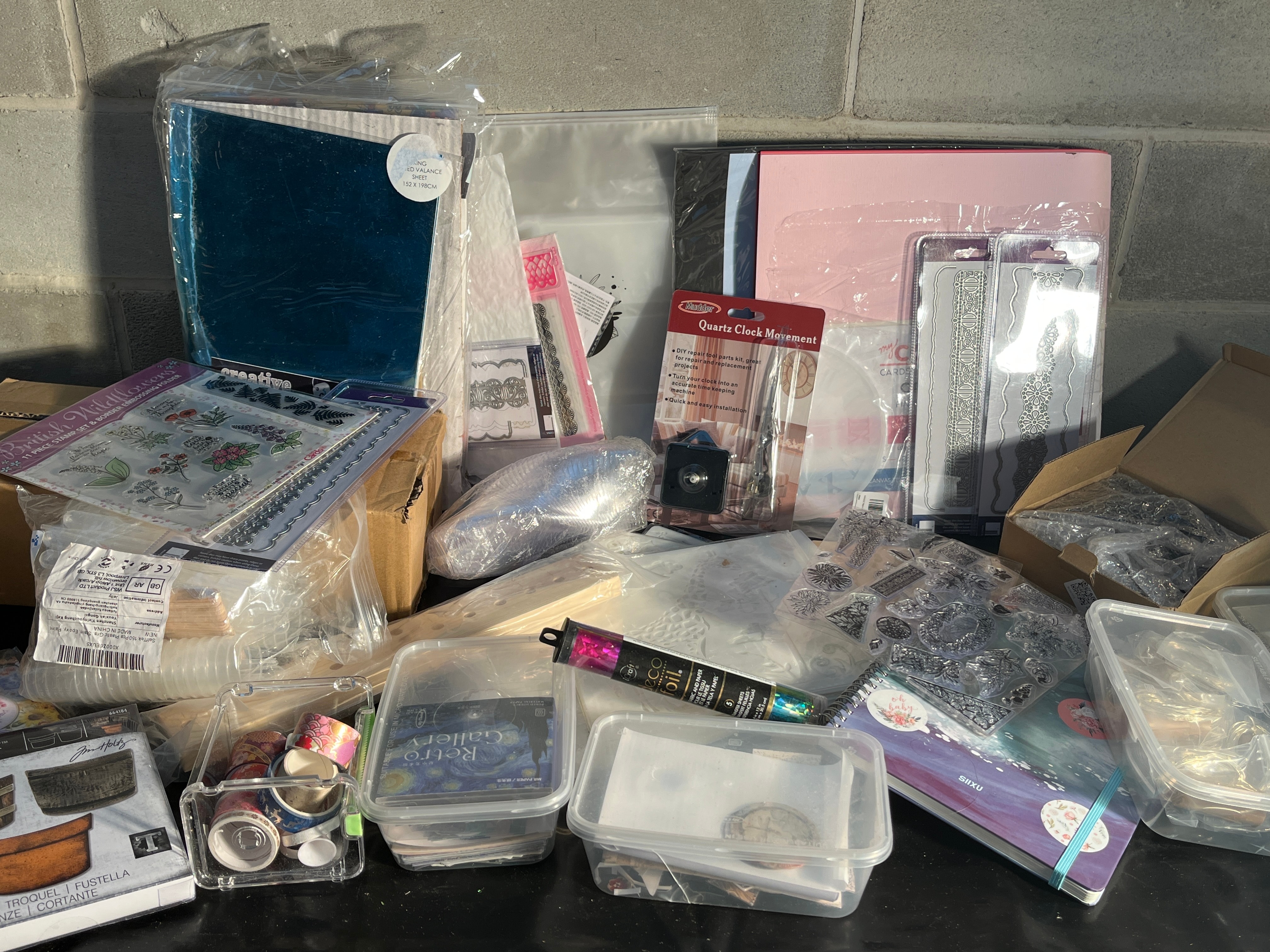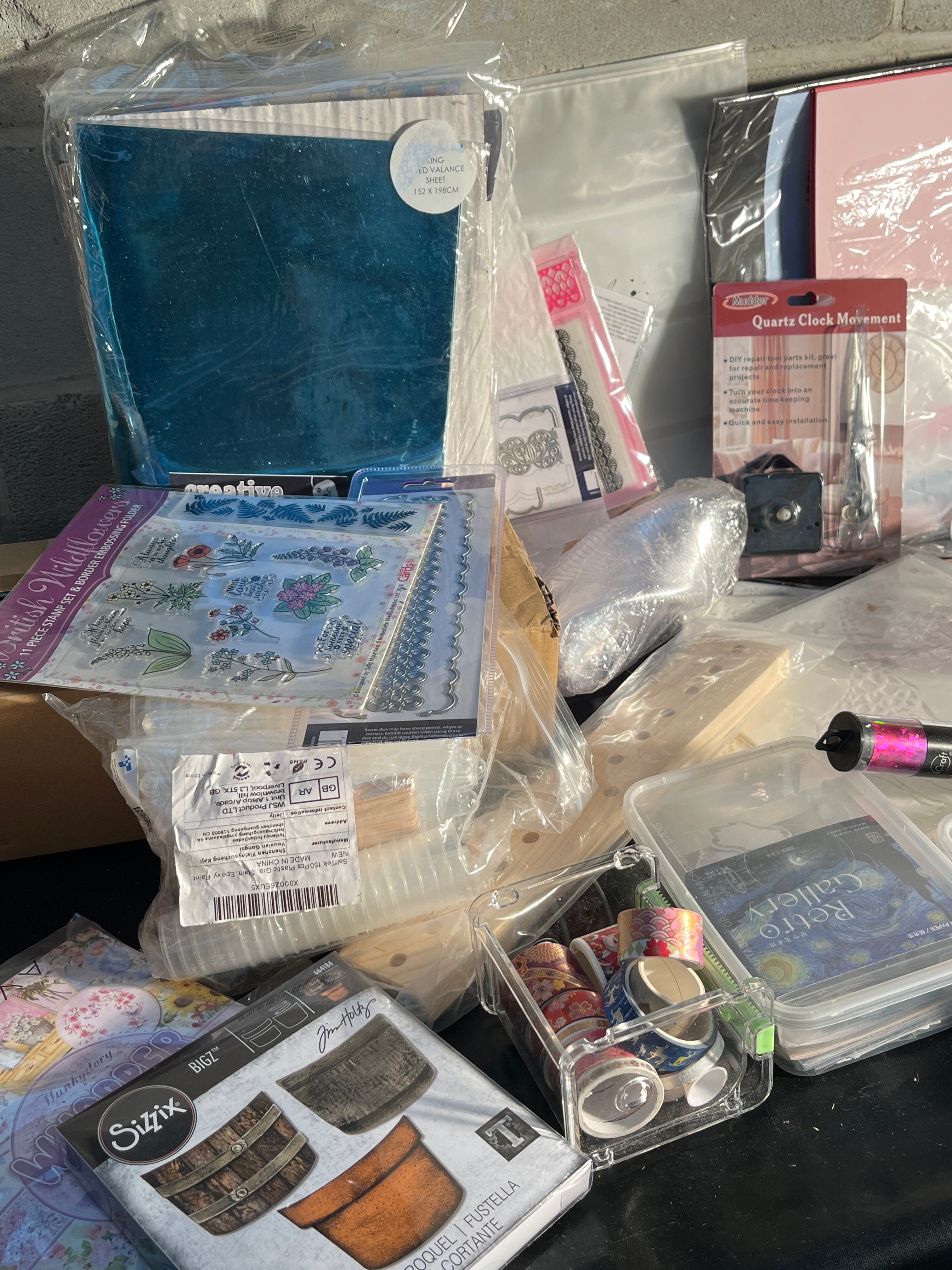 A collection of modern scrapbooking and craft supplies, primarily intended for papercrafts, scrapbooking, and general DIY projects. The lot includes materials such as plastic (packaging, clear stamps, storage containers), metal (die-cutting dies, clock components, jewelry findings), paper/cardboard (packaging, notebooks), rubber (stamps), and thin wooden pieces. Noted branding includes “creative,” “Studio light,” “Sizzix BIGZ,” “Mastercraft,” “Retro Gallery,” and “SIXXU.” Specific items identified are a “3D Valance,” “Botanical Beauties” clear stamps, a “Quartz Clock Movement” DIY kit, and a “DIE À DÉCOUPER” (Cutting Die) for making a “Trousse à maquillage” or “Pochette/Fusella.”