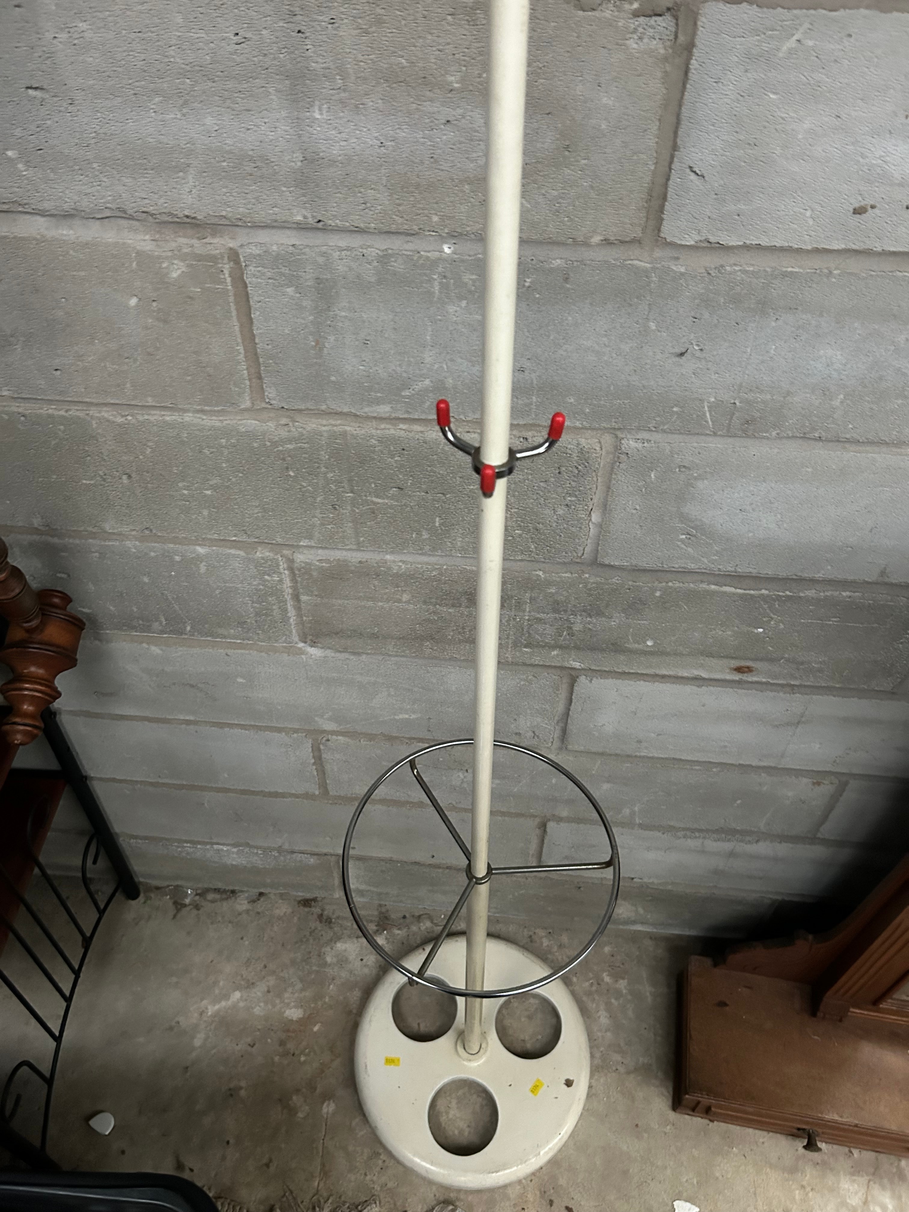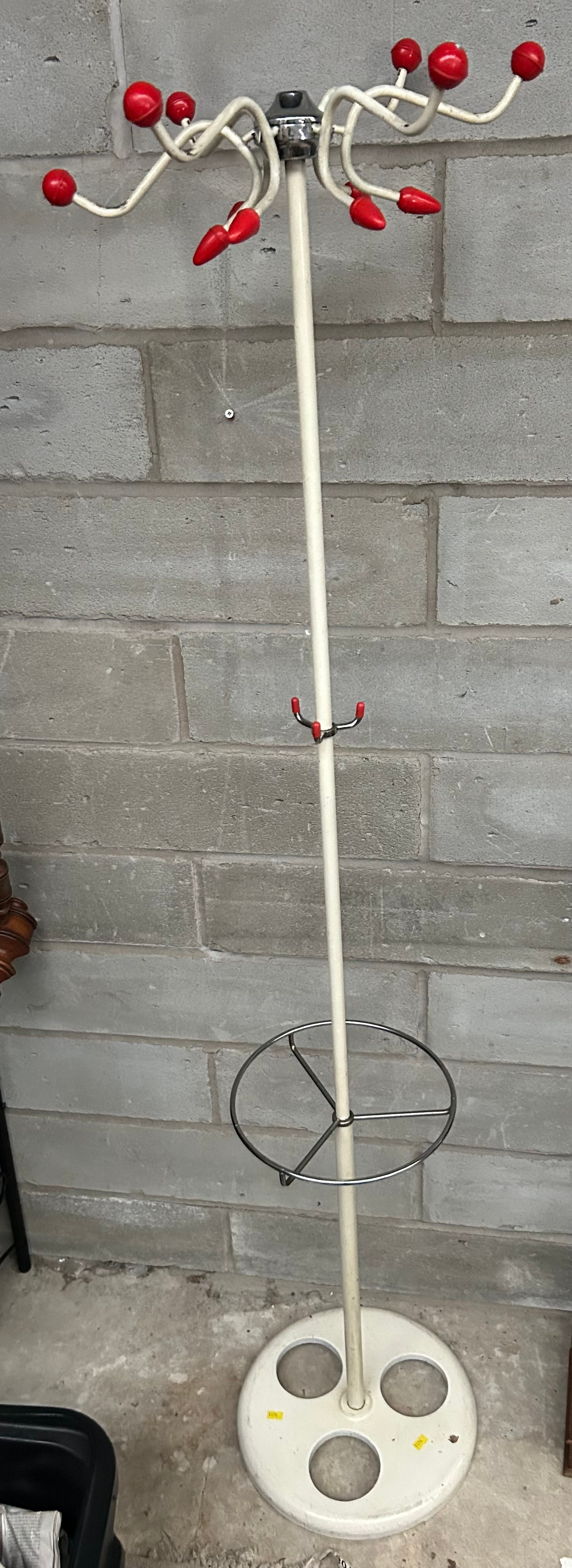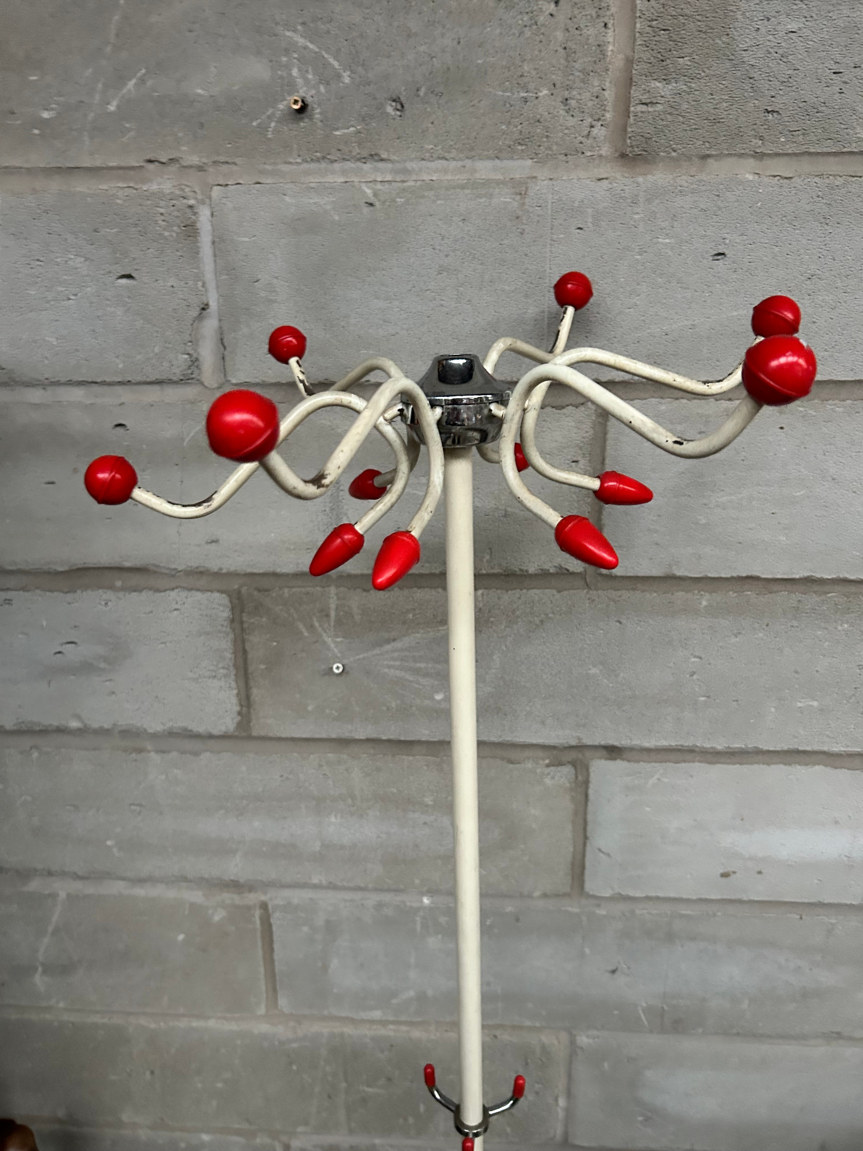 A freestanding mid-century modern coat rack, likely dating from the mid-20th century. It features an off-white enameled metal central pole and a circular base with three integrated holes. The top is adorned with a chrome-finished central connector from which multiple curvilinear metal arms radiate, terminating in a mix of spherical and conical red plastic or enameled metal finials. A chrome-plated ring designed for an umbrella stand is located towards the base, and additional red-tipped metal hooks are affixed mid-pole. No discernible manufacturer’s marks or legible text are visible.