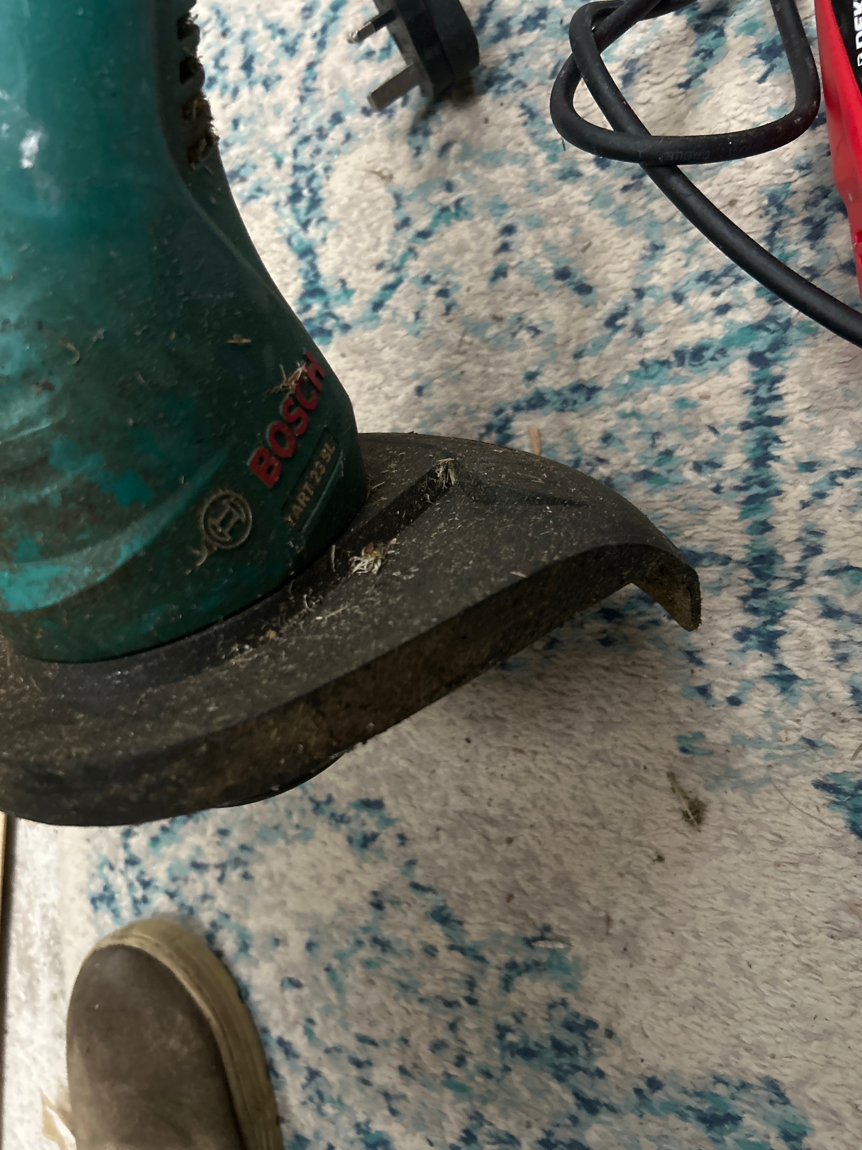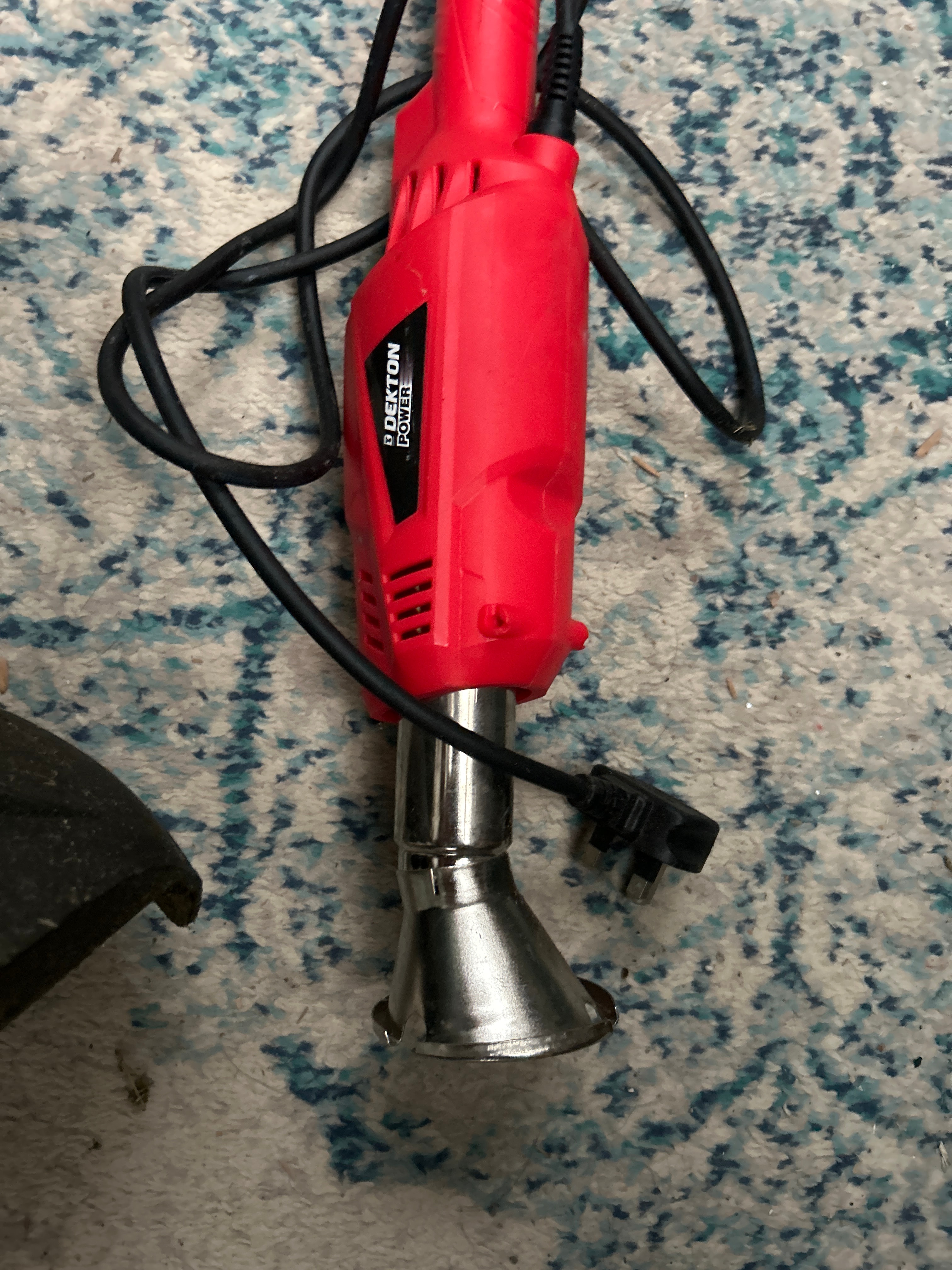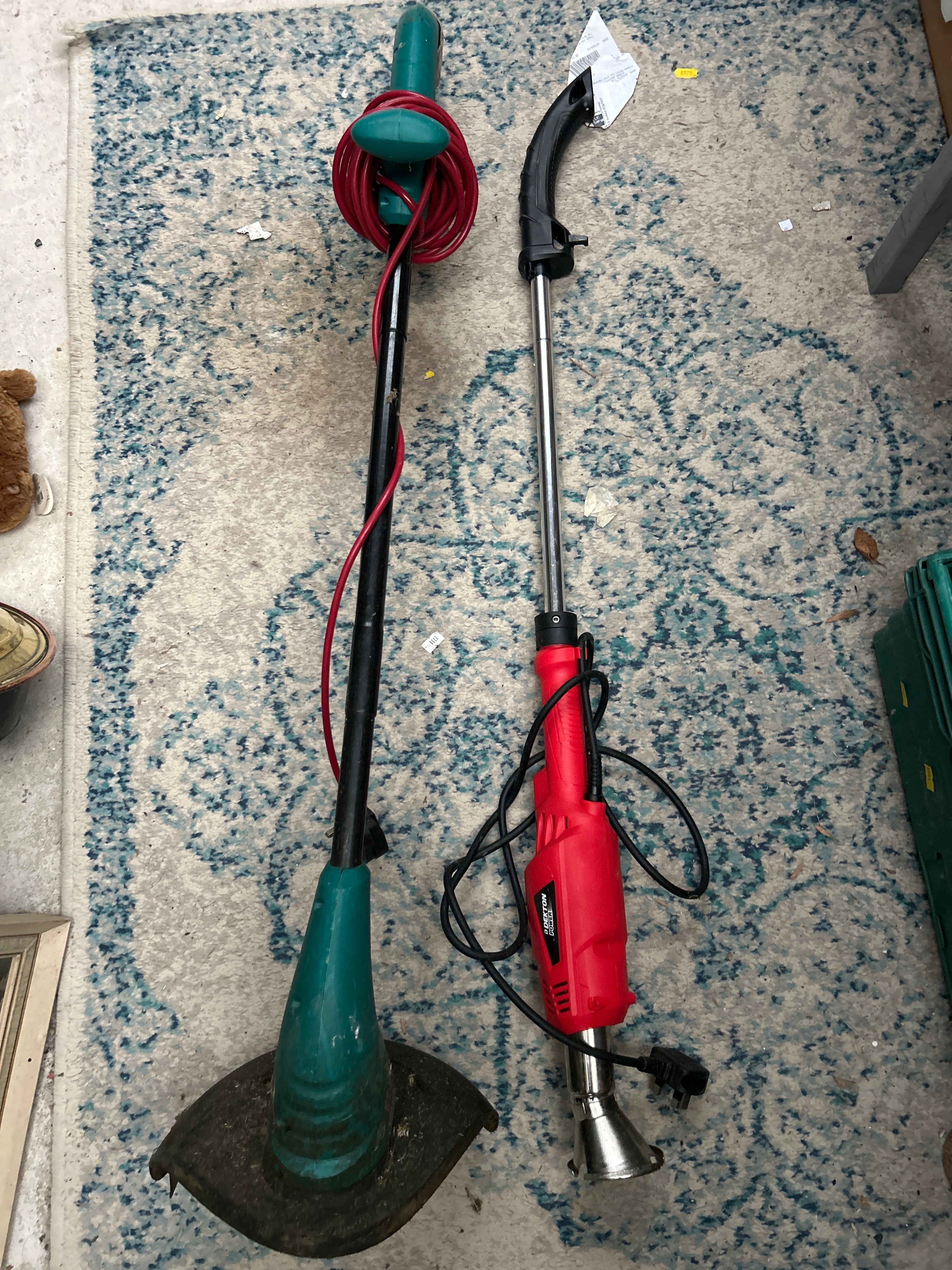 A Dekton 2000W Electric Weed Burner Killer Wand Hot Air, primarily constructed from red and black plastic with a silver metal shaft and a flared metallic attachment at its base, fitted with a UK-style plug. Accompanying this is a Bosch ART 23 SL electric grass trimmer, distinguished by its green and black plastic construction with a metal shaft and a red power cord.