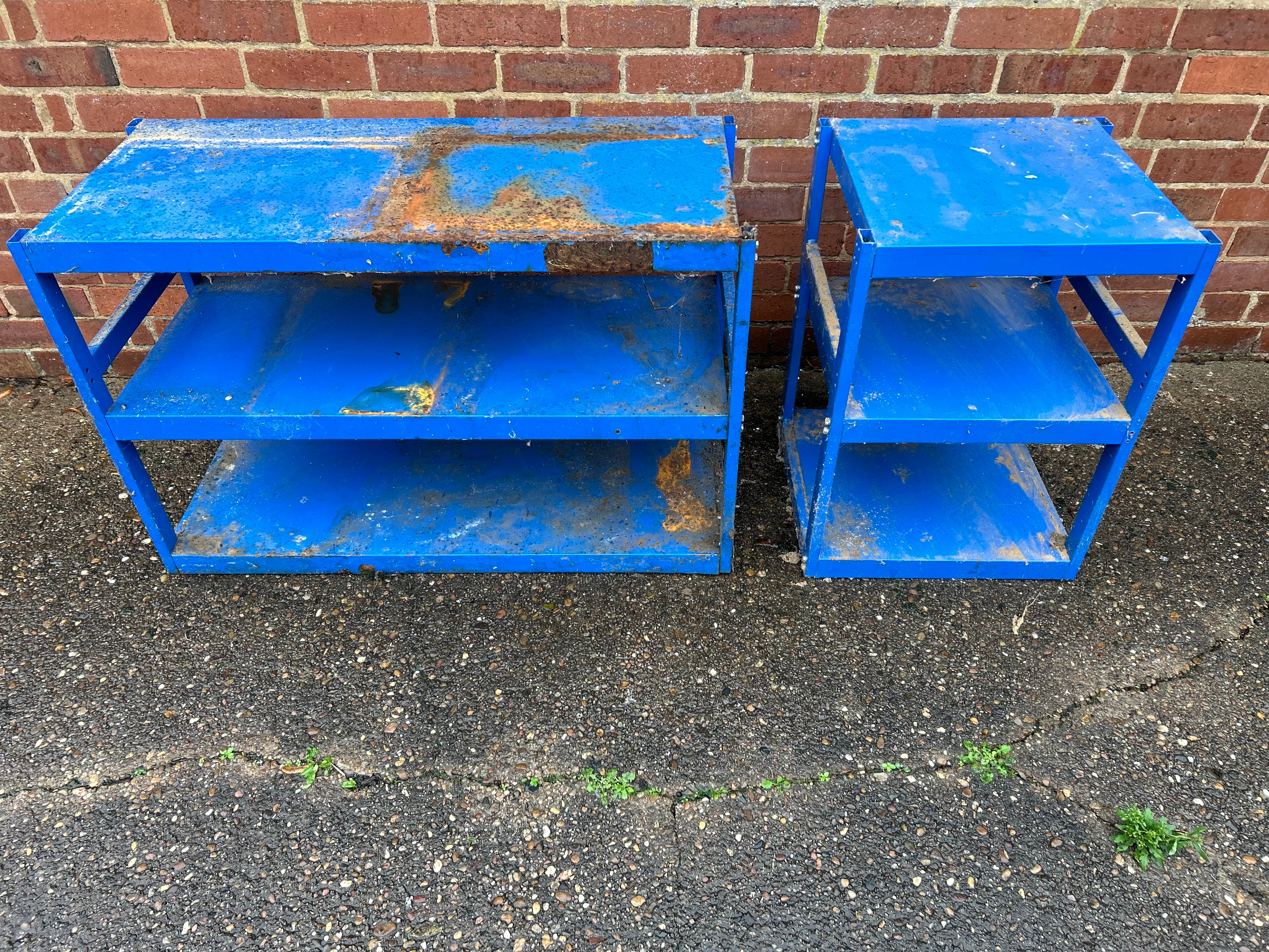 A pair of utilitarian industrial shelving units, each constructed from blue-painted metal with three shelves. One unit is wider than the other. These units exhibit significant wear consistent with heavy use or outdoor exposure. Also included is a circular hanging wooden platform, crafted from rustic wooden slats and suspended by thick natural fiber ropes.