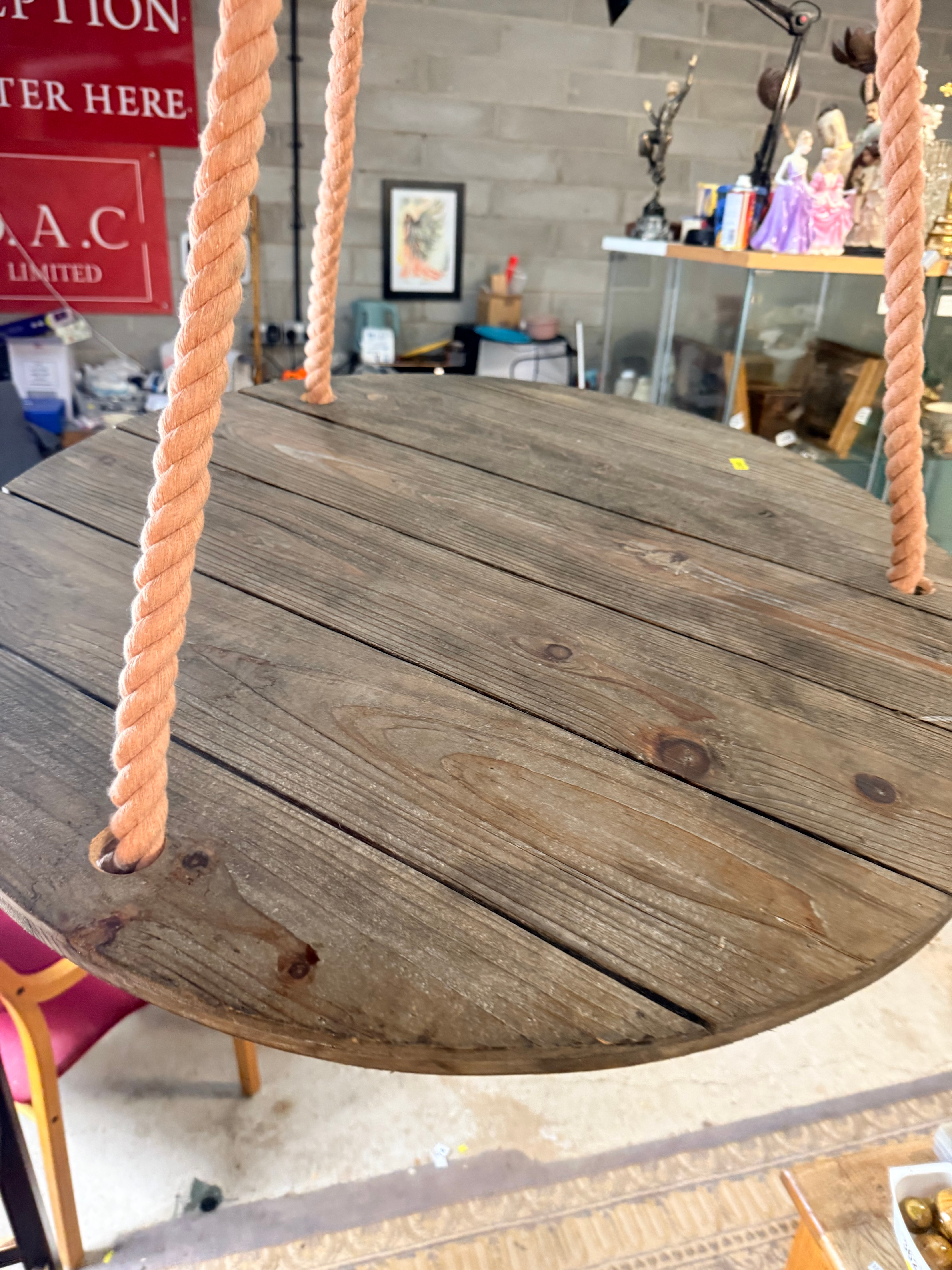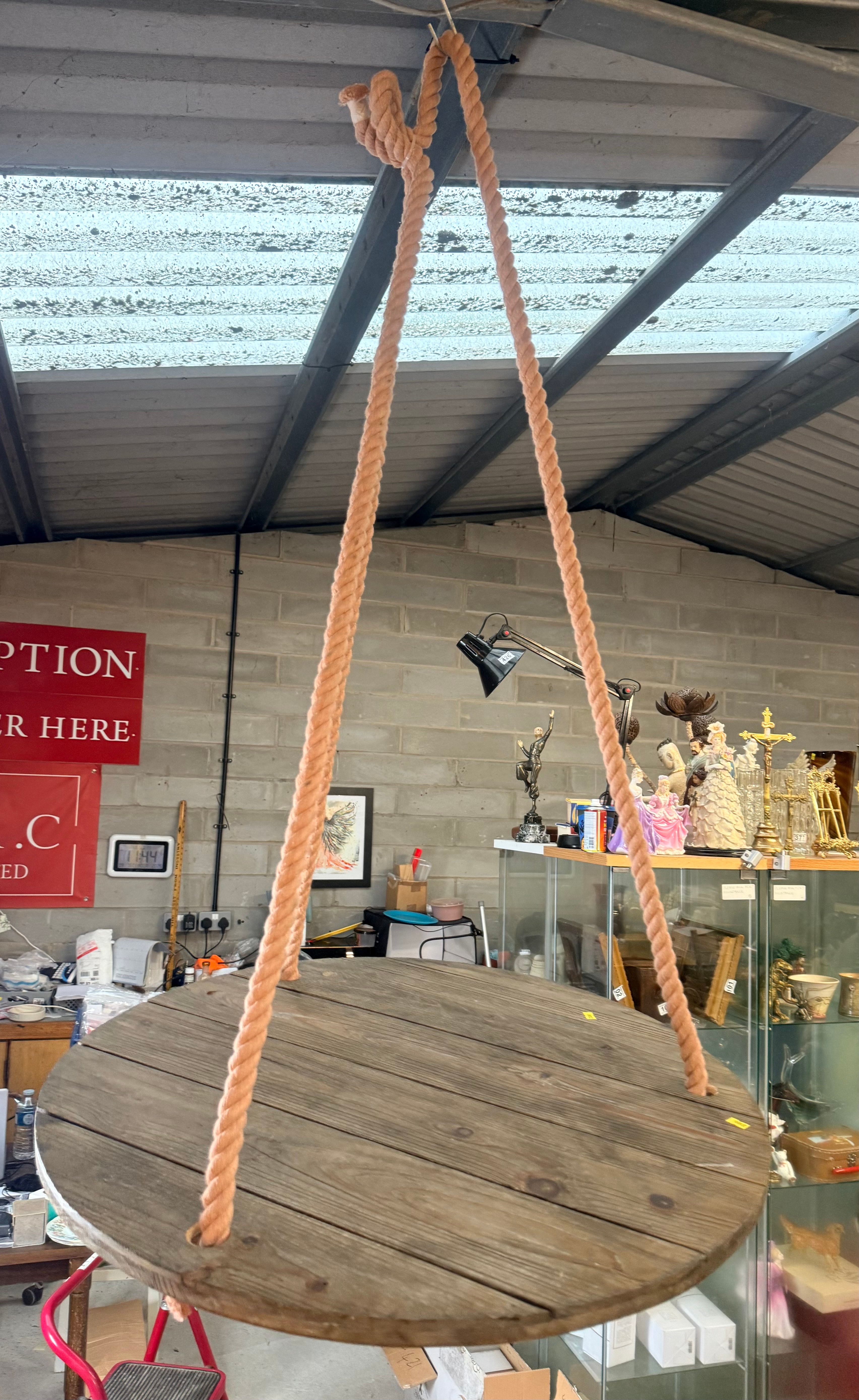 The circular platform measures 30 inches in diameter with a hanging length of approximately 45 inches.