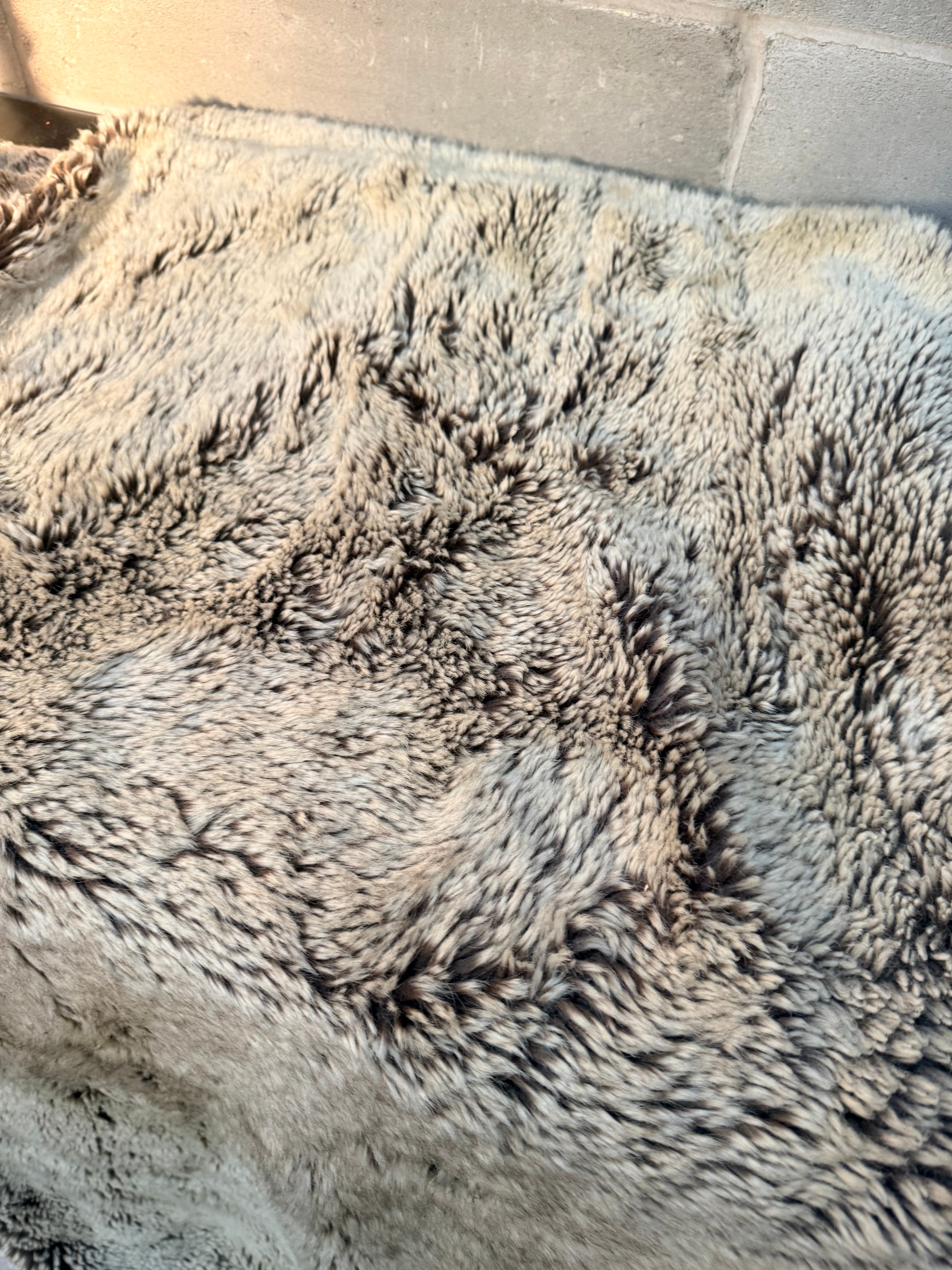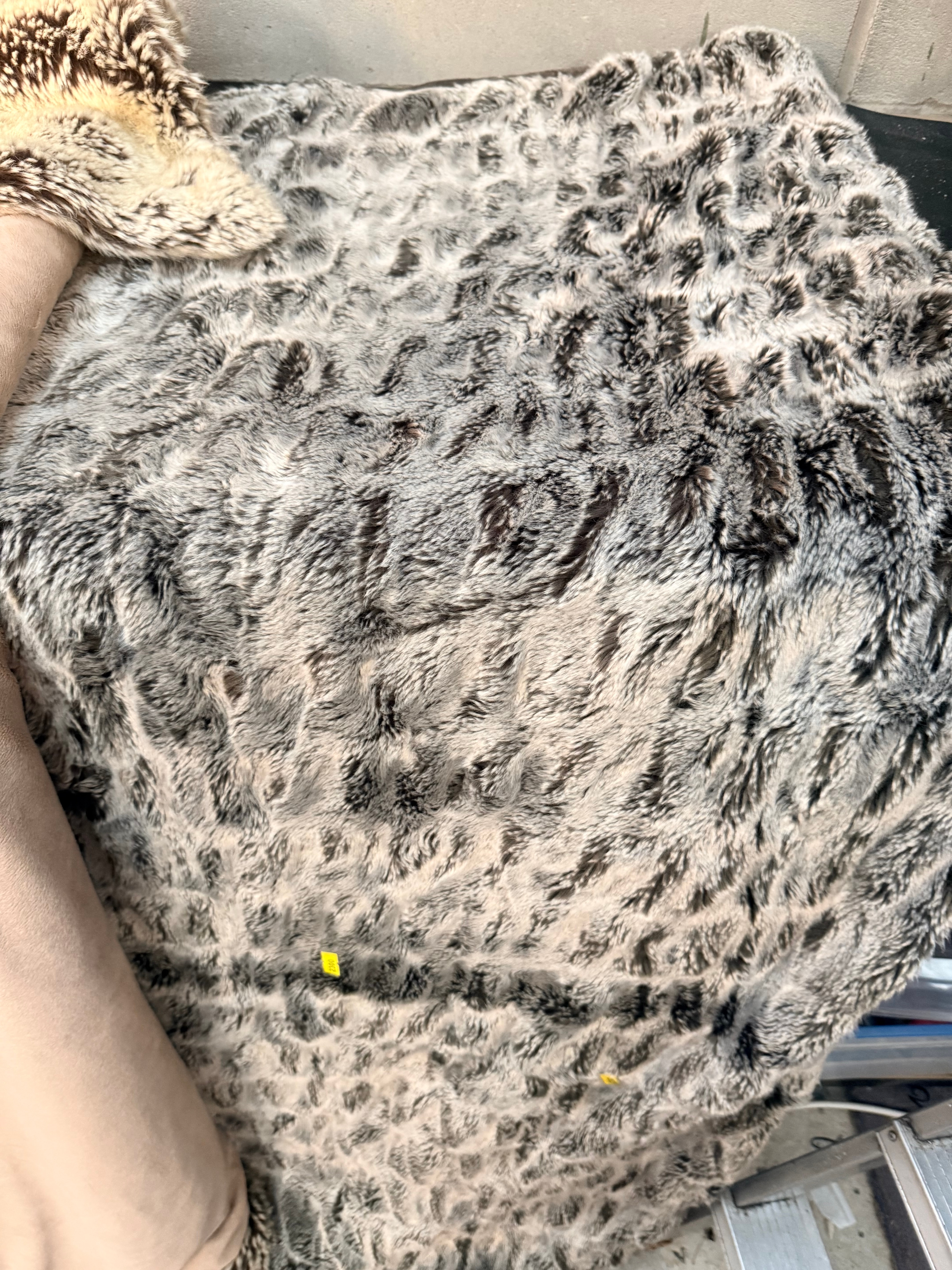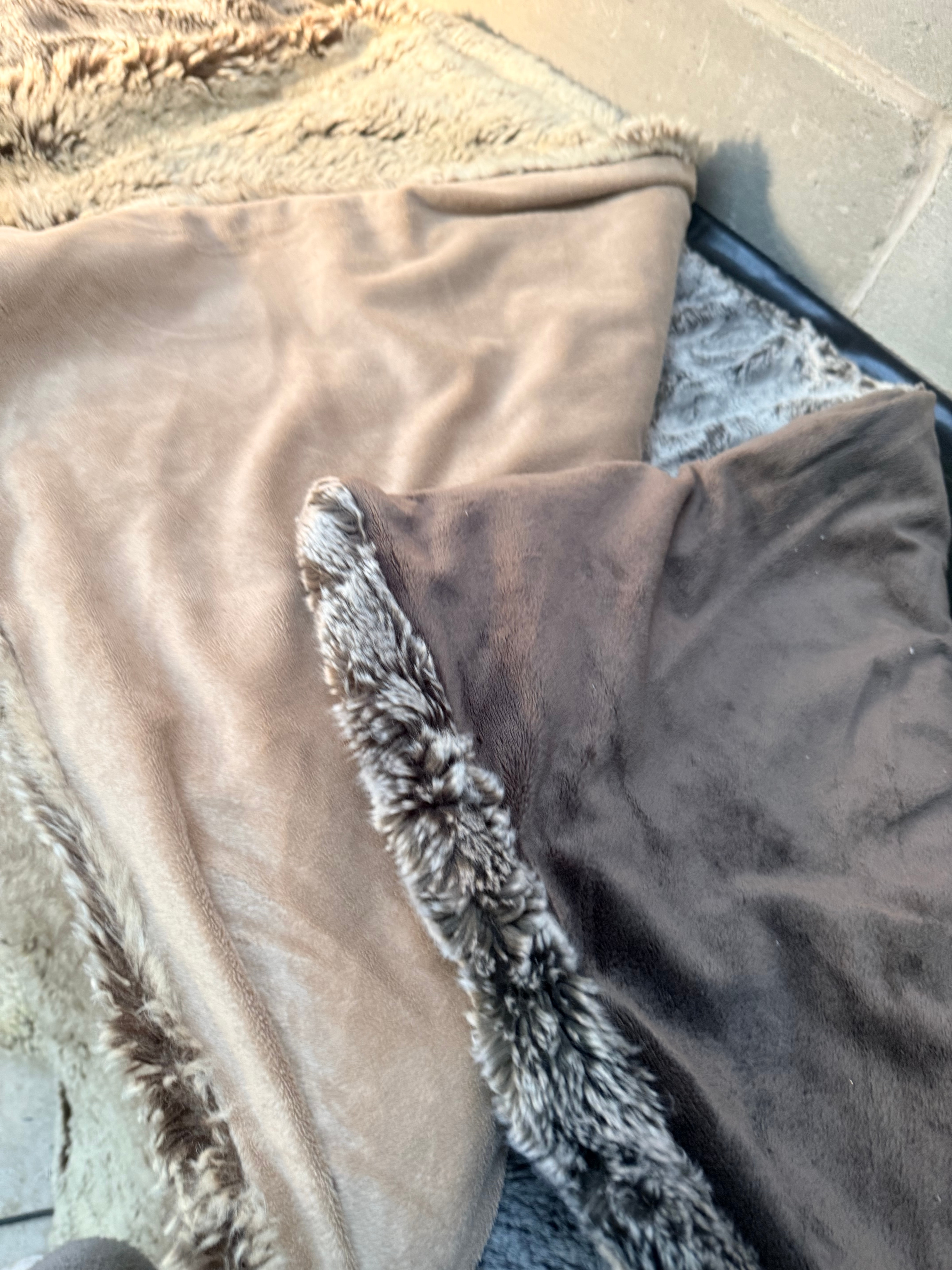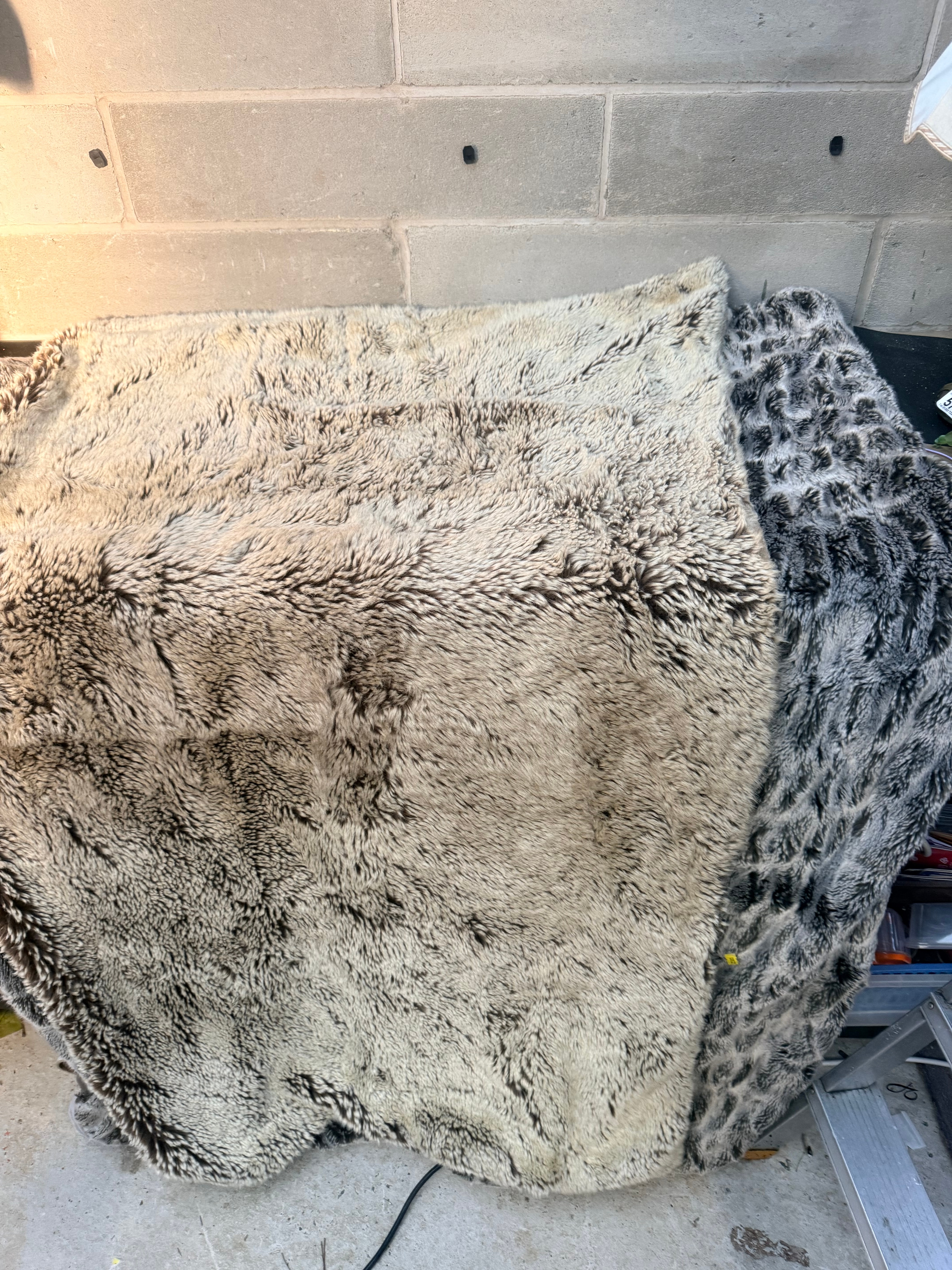 A pair of faux fur throws, comprising one with a mixed light and dark brown long pile, and another displaying a grey and black patterned pile, consistent with a faux leopard print. Both items are made of Faux Fur.