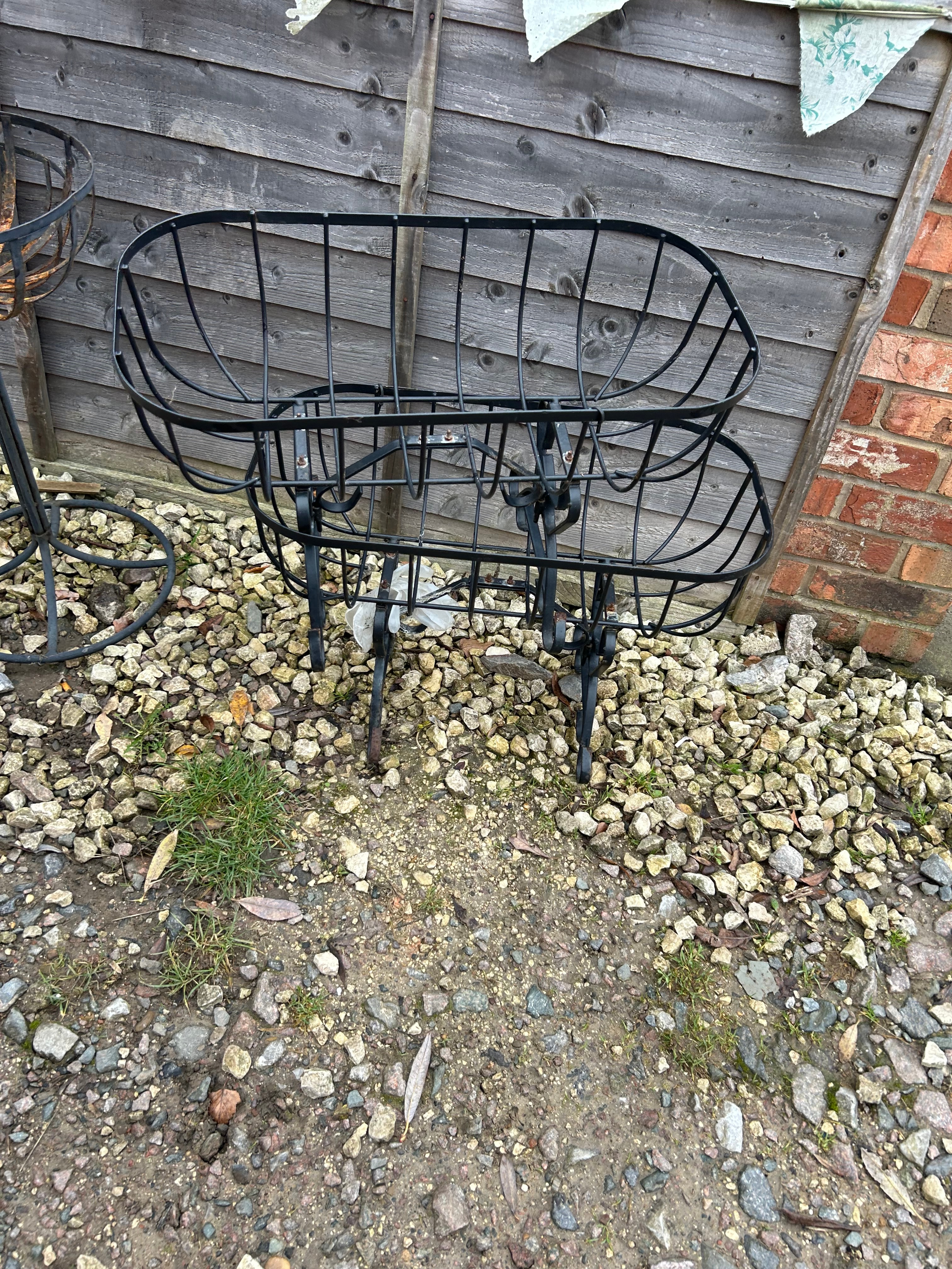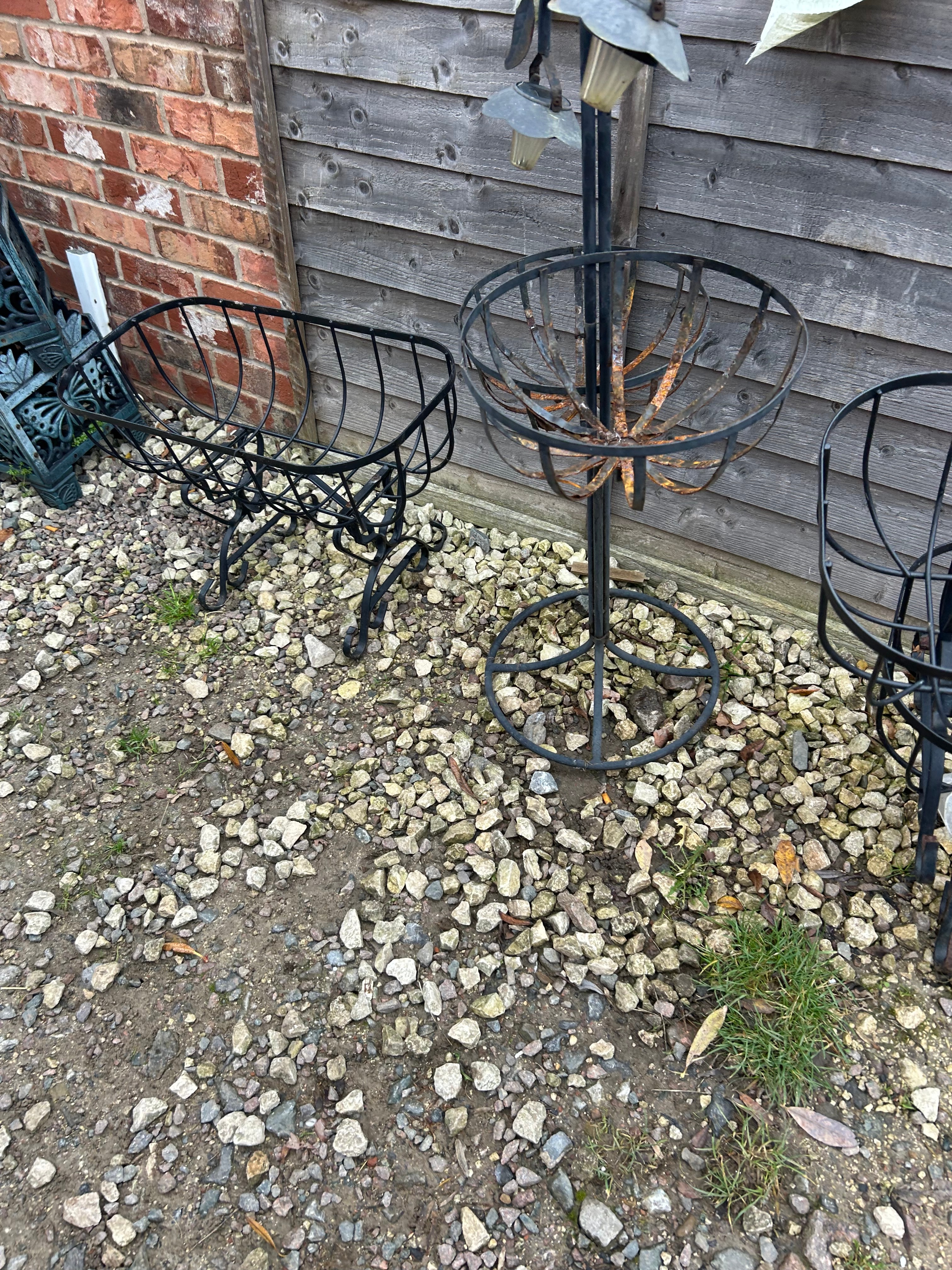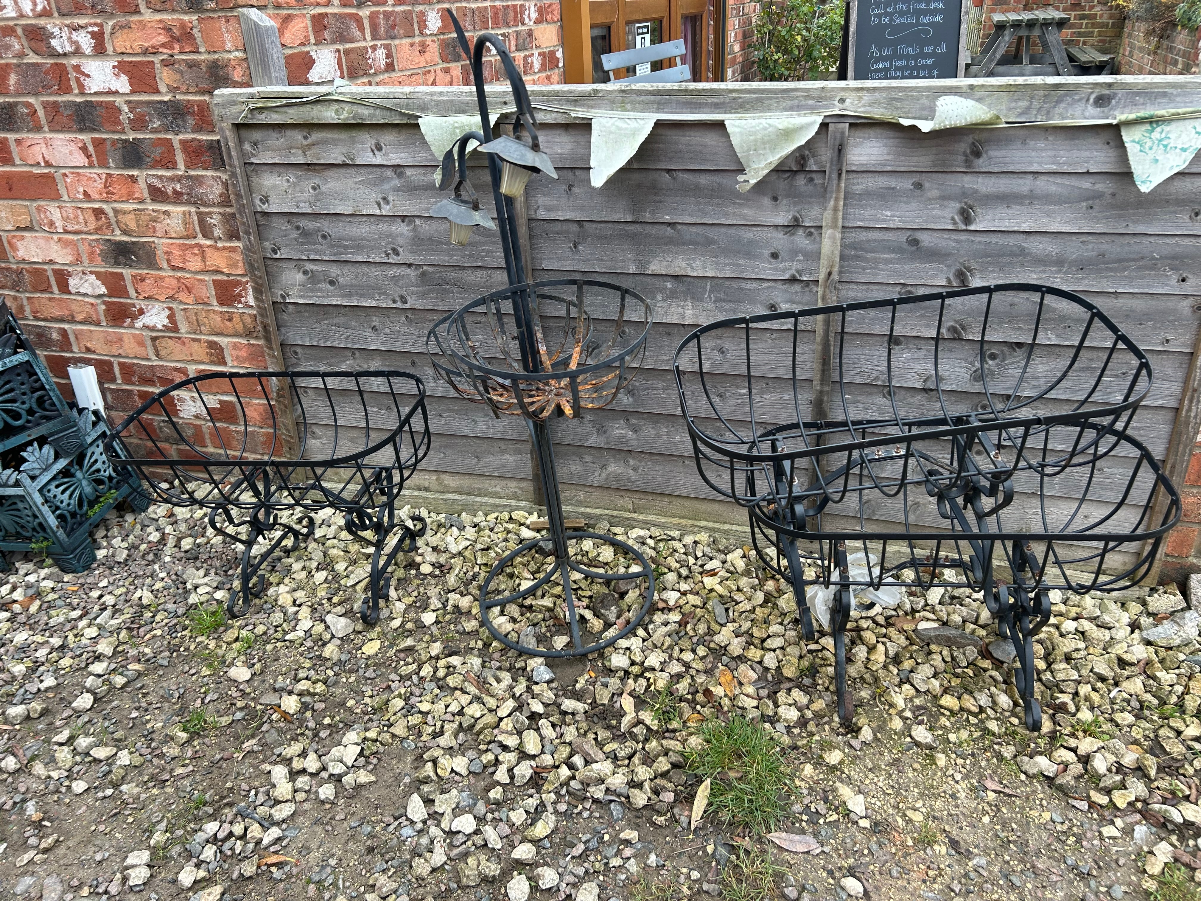 This group comprises three black-painted metal garden furnishings, likely constructed from wrought iron or steel, exhibiting a utilitarian style with decorative flourishes characteristic of contemporary or vintage garden pieces. The collection includes a low, rectangular/oval-shaped basket supported by four ornate legs, a taller freestanding planter stand featuring a circular base, a round upper basket, and a decorative finial or solar light element, and a unit with two stacked rectangular/oval baskets, each supported by four simple legs. No visible text or manufacturer’s markings are present on any of the items.