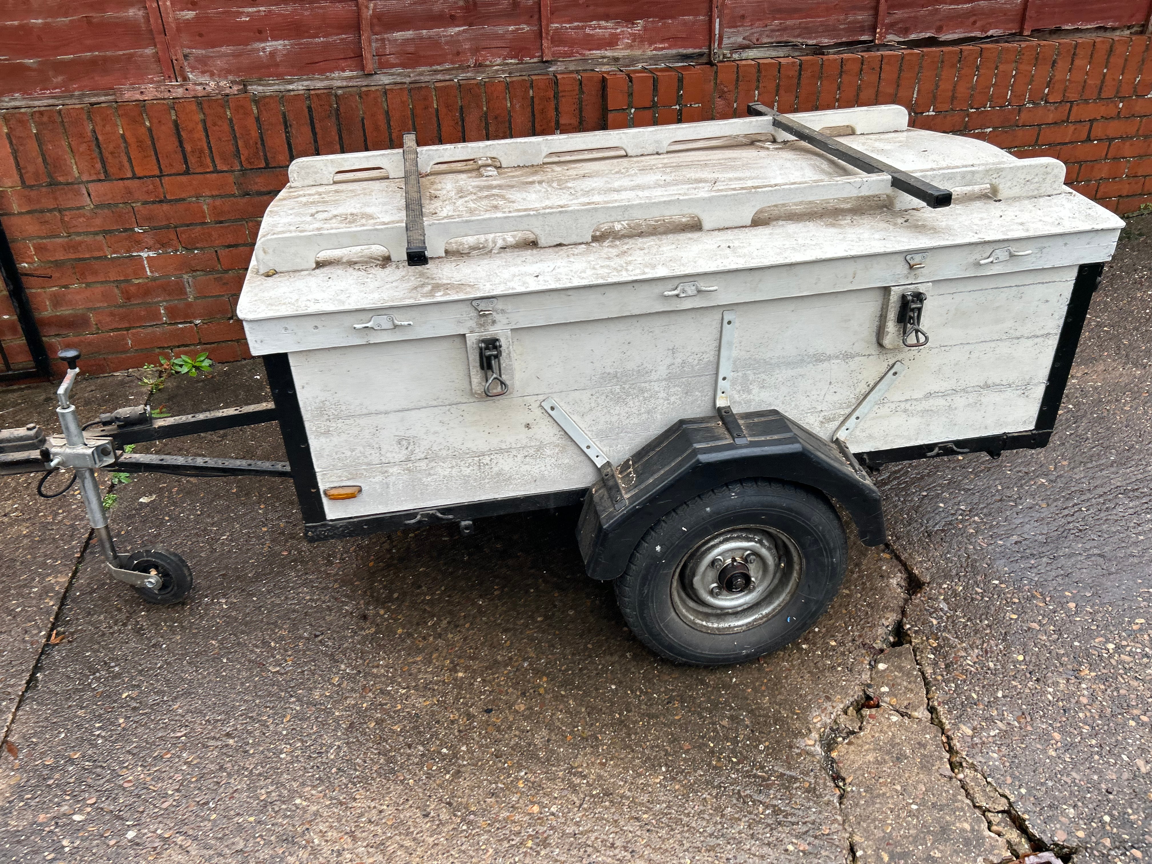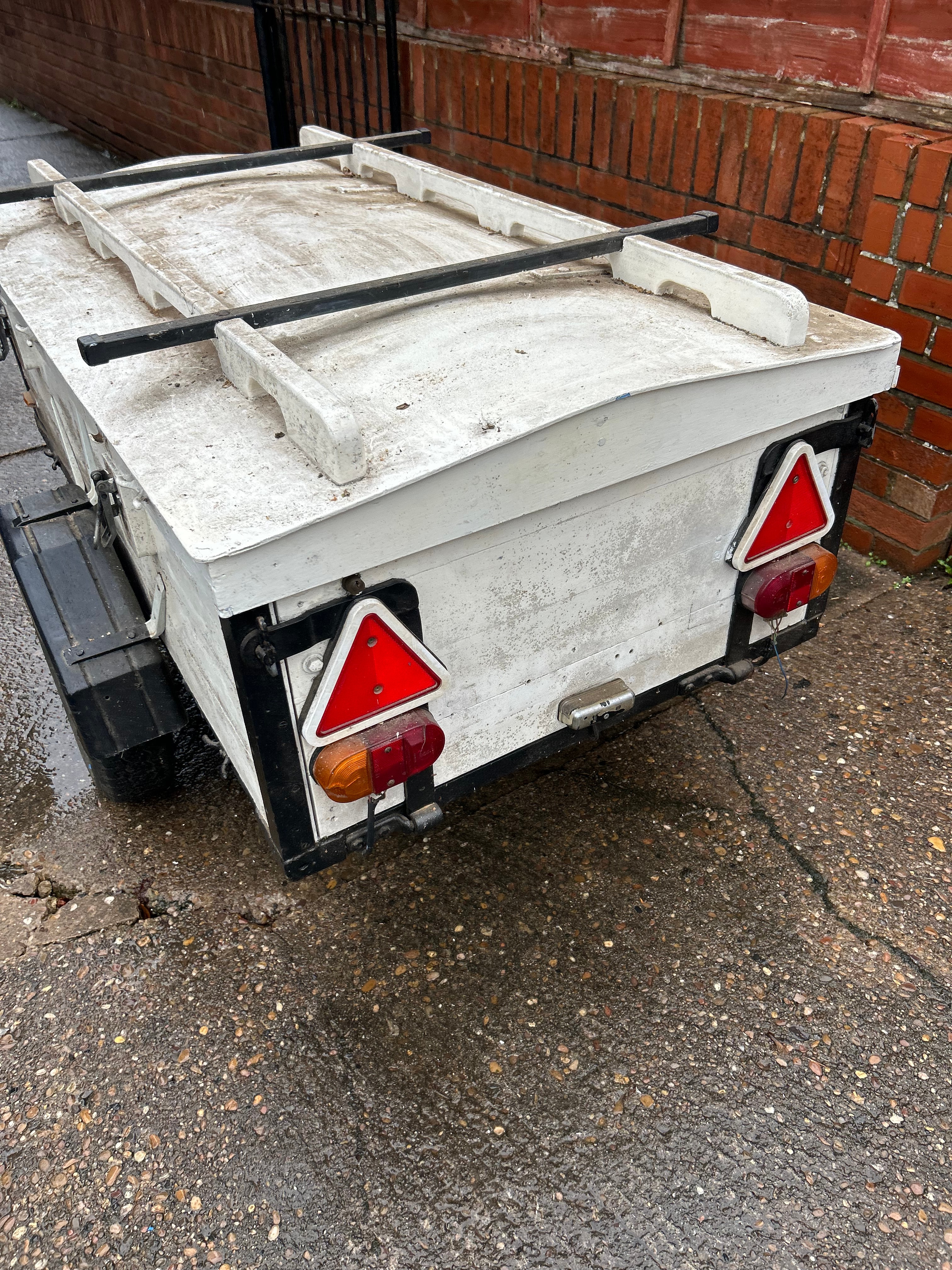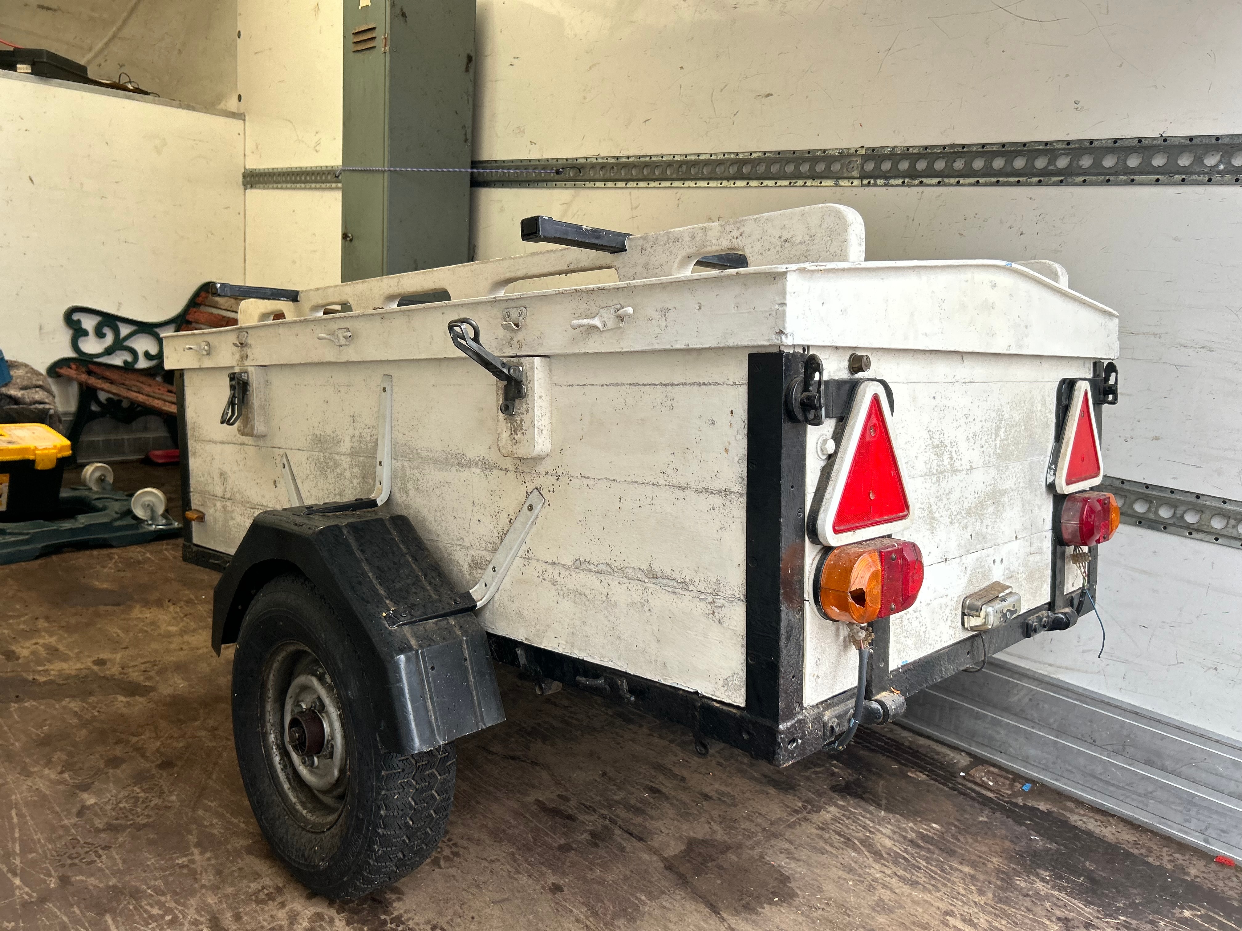 A small, single-axle enclosed utility or box trailer, likely of British origin. It features a white-painted wooden or composite panel body, a black metal chassis, and plastic mudguards. The trailer is equipped with rear lights incorporating red triangular reflectors, amber indicators, and red brake/tail lights. It dates to approximately 2007, as indicated by the detached UK registration plate “FX57 WJE” (from the period September 2007 to February 2008), which also bears the dealer names “KENDAL GARAGE (2000) LTD” and “WWW.PREMIERPLATES.COM”.