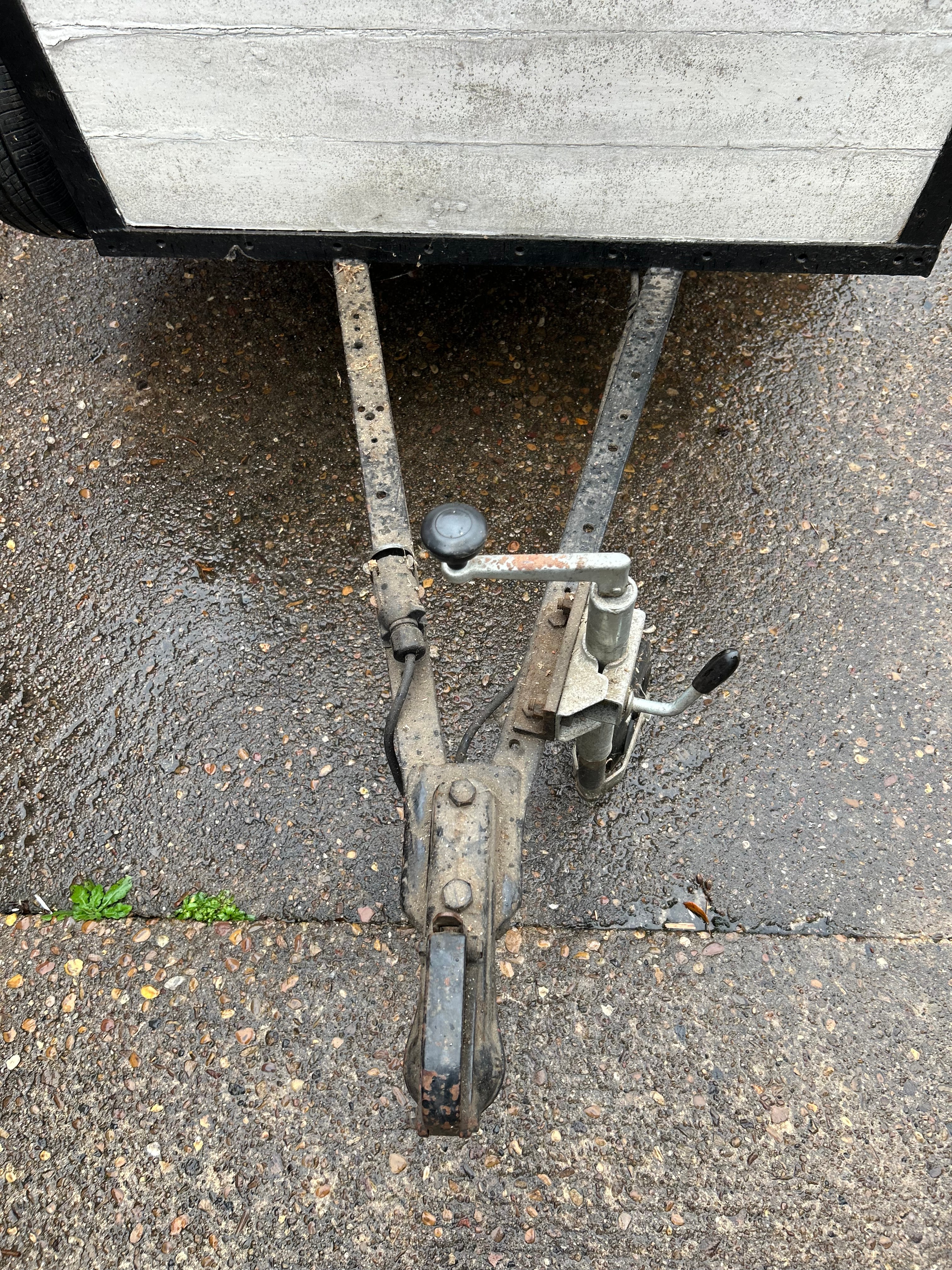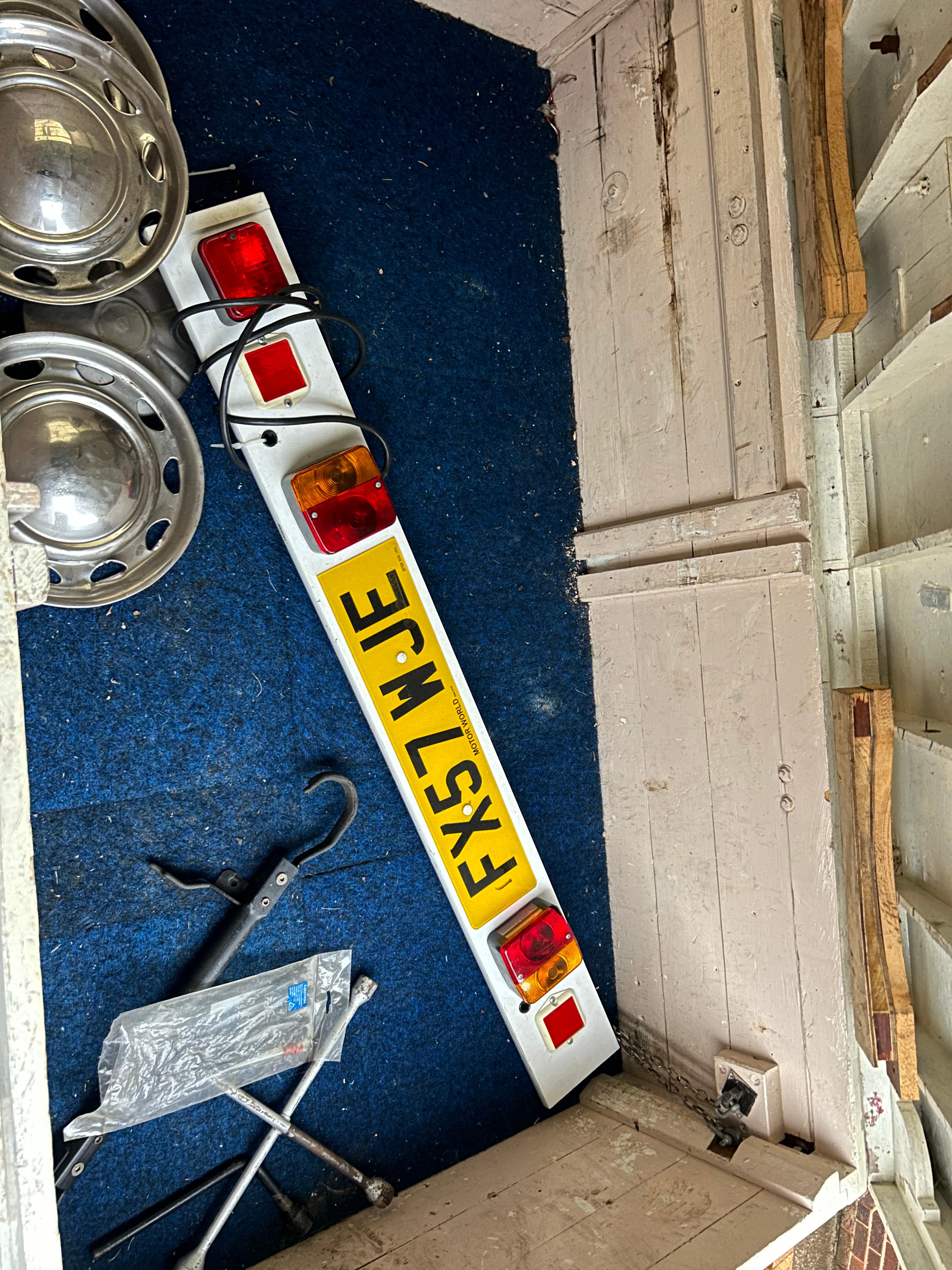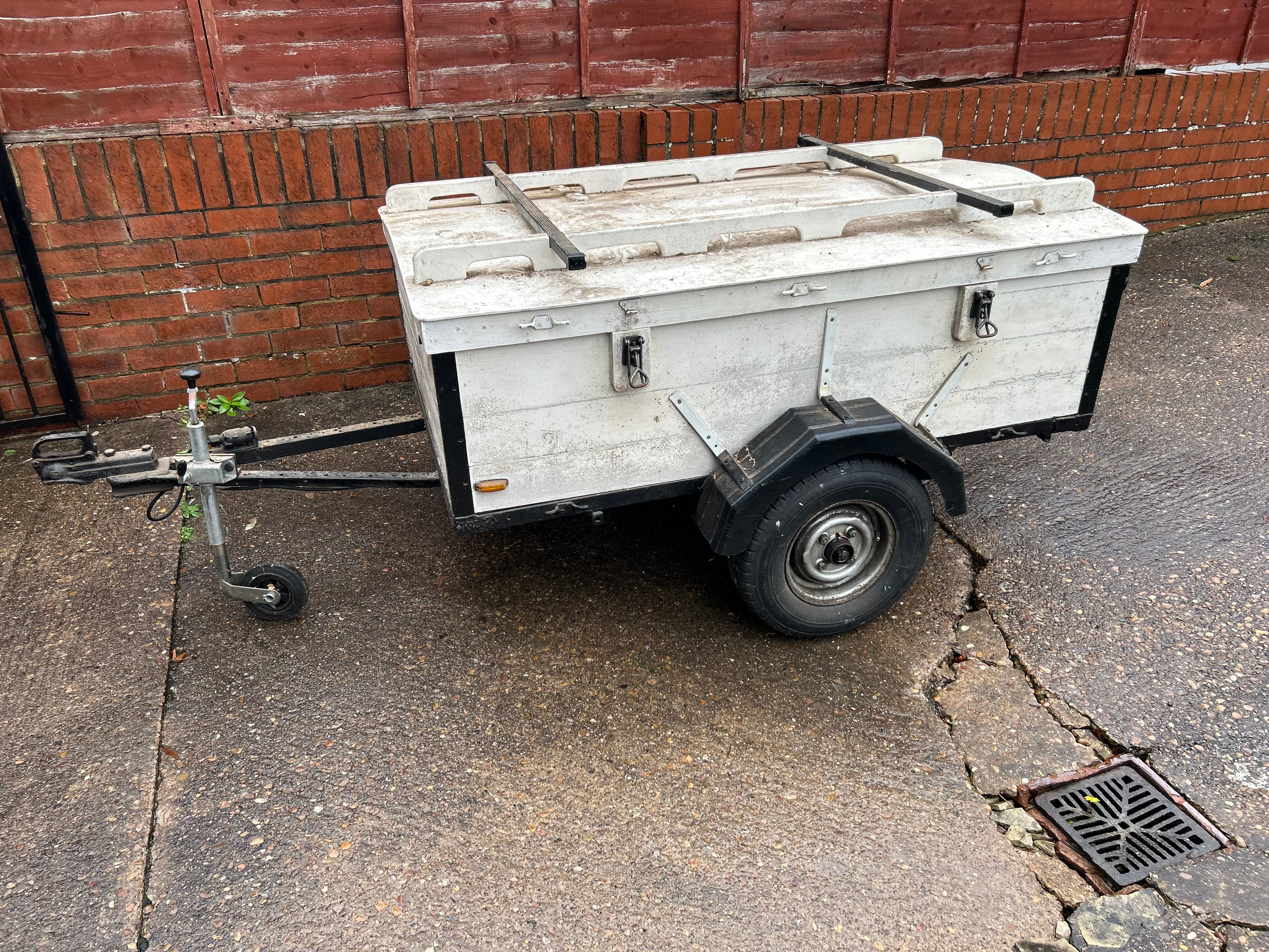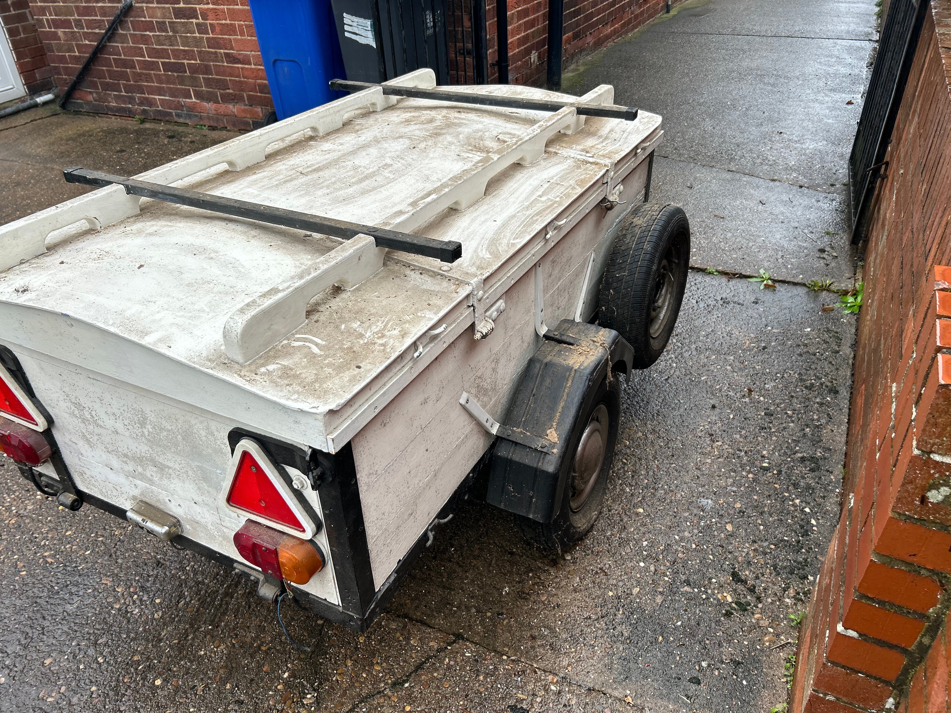 A small, single-axle enclosed utility or box trailer, likely of British origin. It features a white-painted wooden or composite panel body, a black metal chassis, and plastic mudguards. The trailer is equipped with rear lights incorporating red triangular reflectors, amber indicators, and red brake/tail lights. It dates to approximately 2007, as indicated by the detached UK registration plate “FX57 WJE” (from the period September 2007 to February 2008), which also bears the dealer names “KENDAL GARAGE (2000) LTD” and “WWW.PREMIERPLATES.COM”.