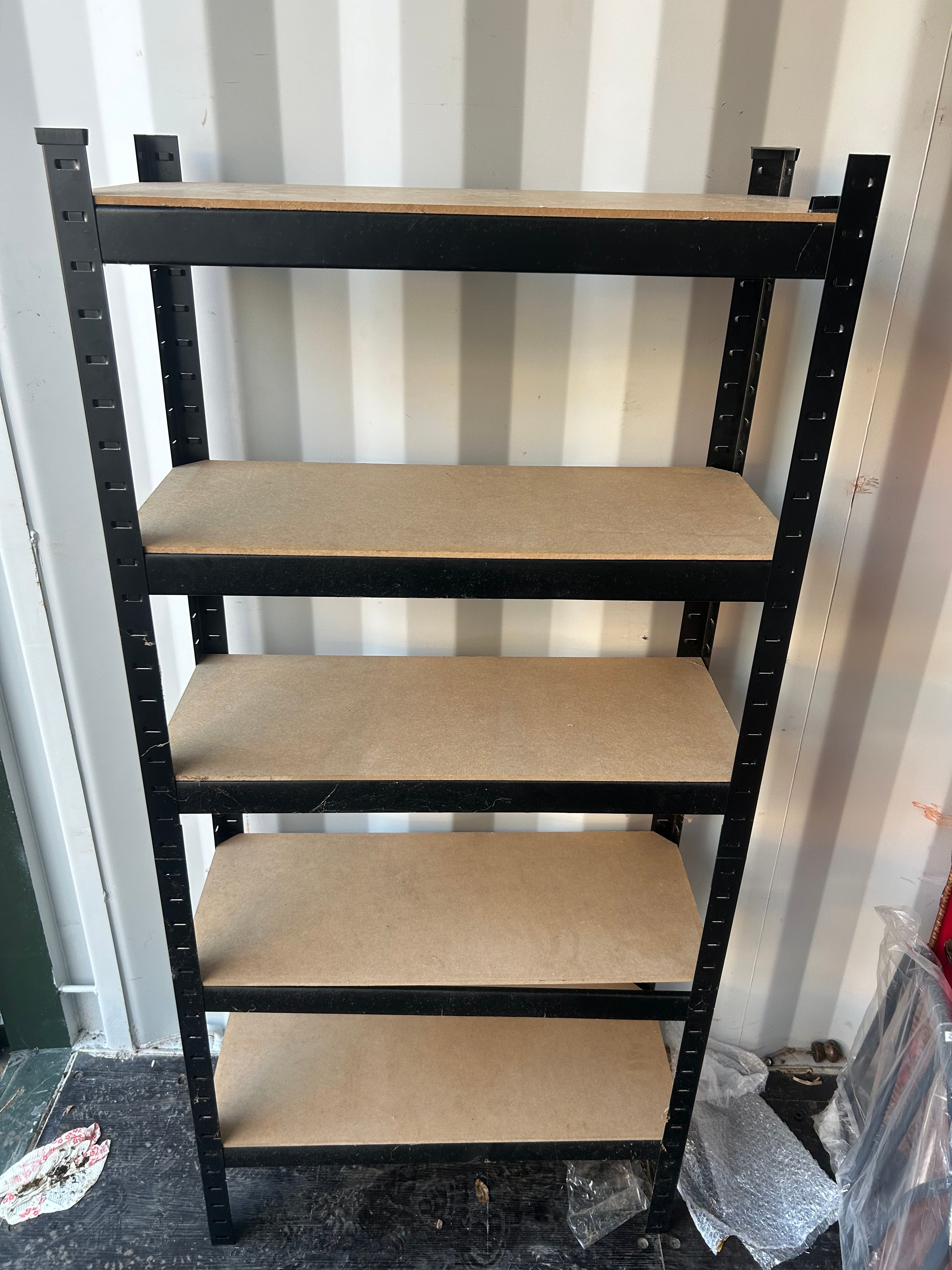 A Karl home 5-tier heavy duty garage shelving unit. This freestanding industrial-style unit features a black powder-coated metal frame with slotted uprights, designed for boltless assembly. It is fitted with five shelves constructed from unfinished light brown composite wood, likely MDF or particle board. Plastic caps are present on the top of the uprights.