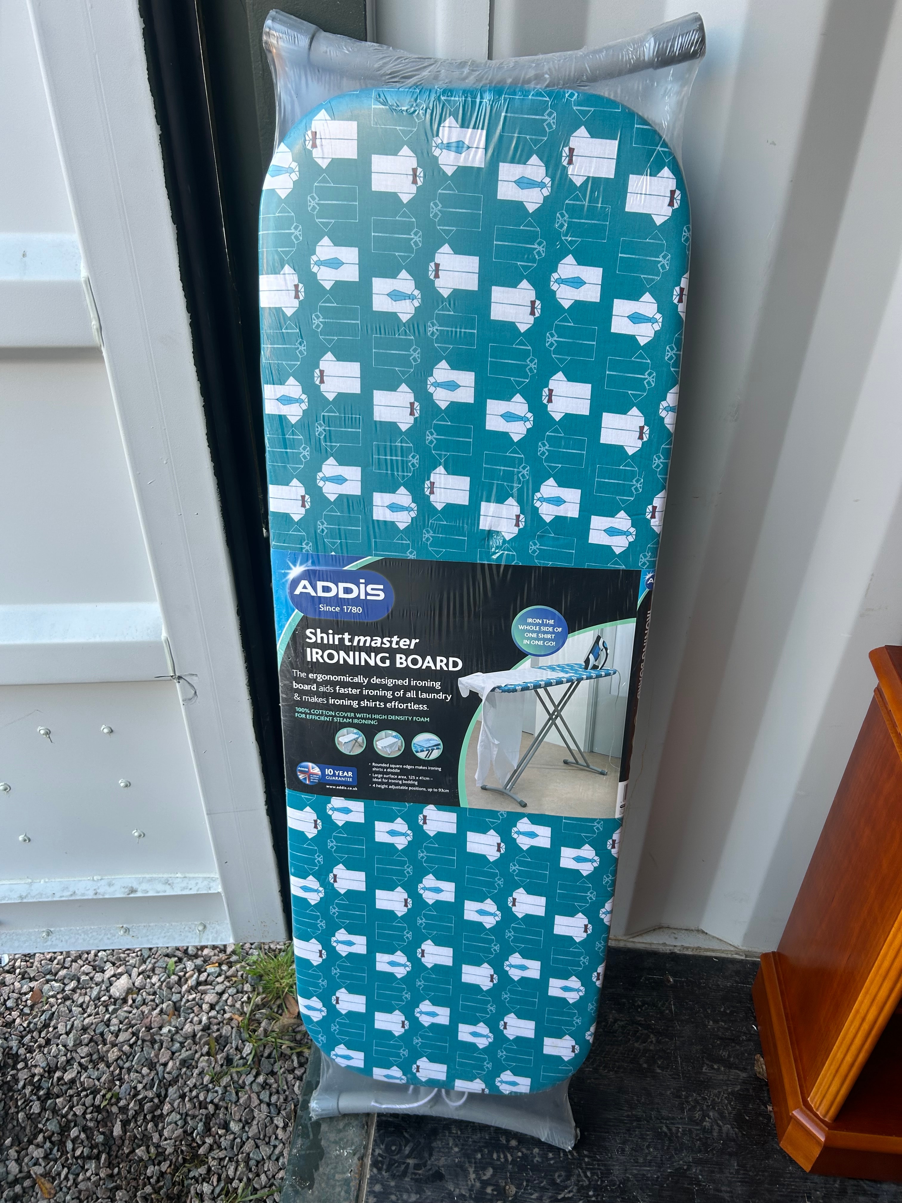 An Addis ‘Shirtmaster’ Ironing Board, presented new in its original factory-sealed clear plastic packaging. The ironing board features a contemporary turquoise fabric cover with a repeating pattern of white shirt outlines, some with blue ties and others with reddish bow ties. The black central label identifies the brand as ‘ADDIS Since 1780’ and the product as ‘Shirtmaster IRONING BOARD’. Key features listed include a ‘100% COTTON COVER WITH HIGH DENSITY FOAM’, an ‘ergonomically designed’ structure, ‘Rounded square edges’, and ‘4 height adjustable positions’. The packaging also displays a ’10 YEAR GUARANTEE’ and a ‘GREAT BRITISH BRANDS’ emblem.