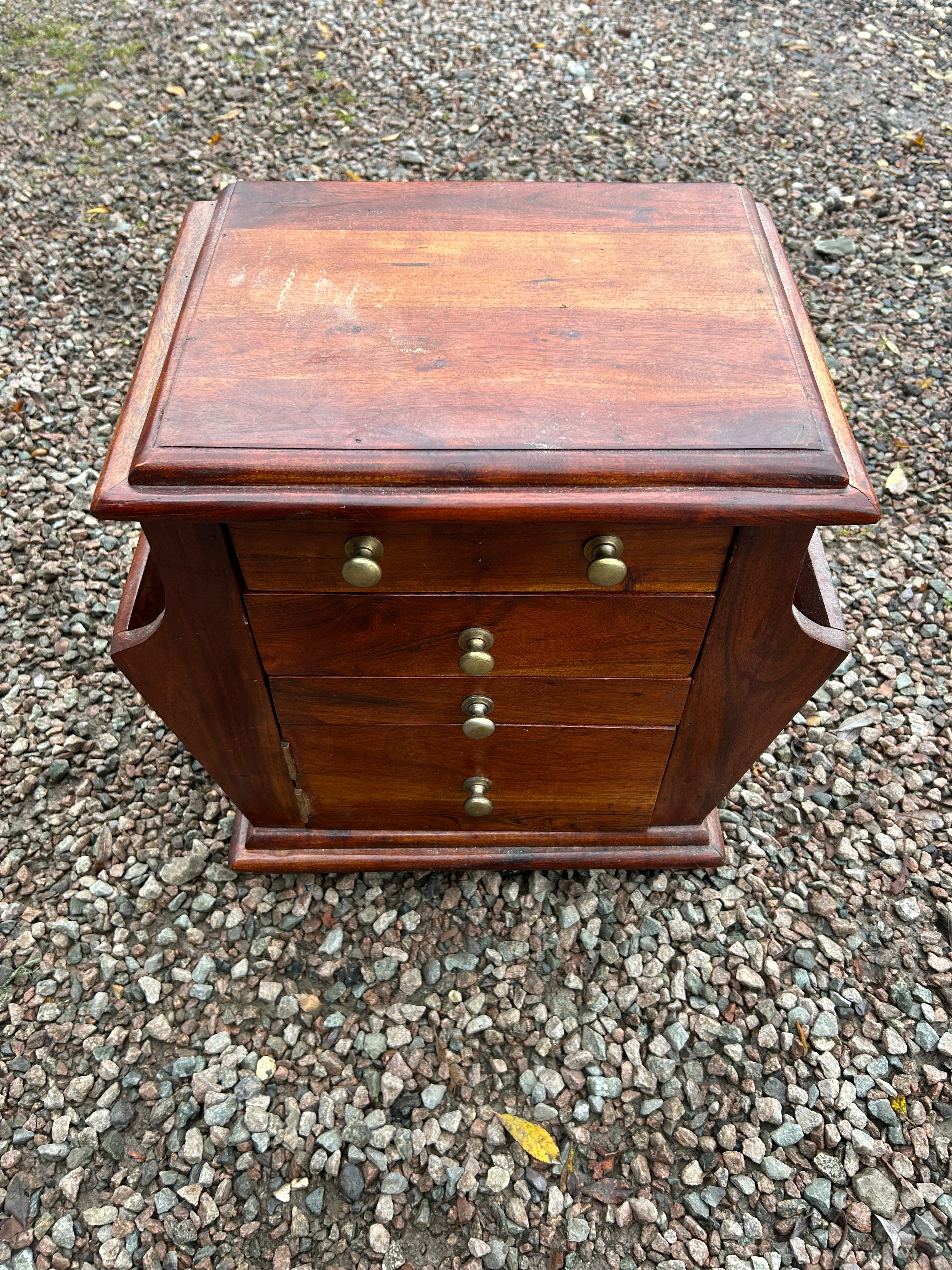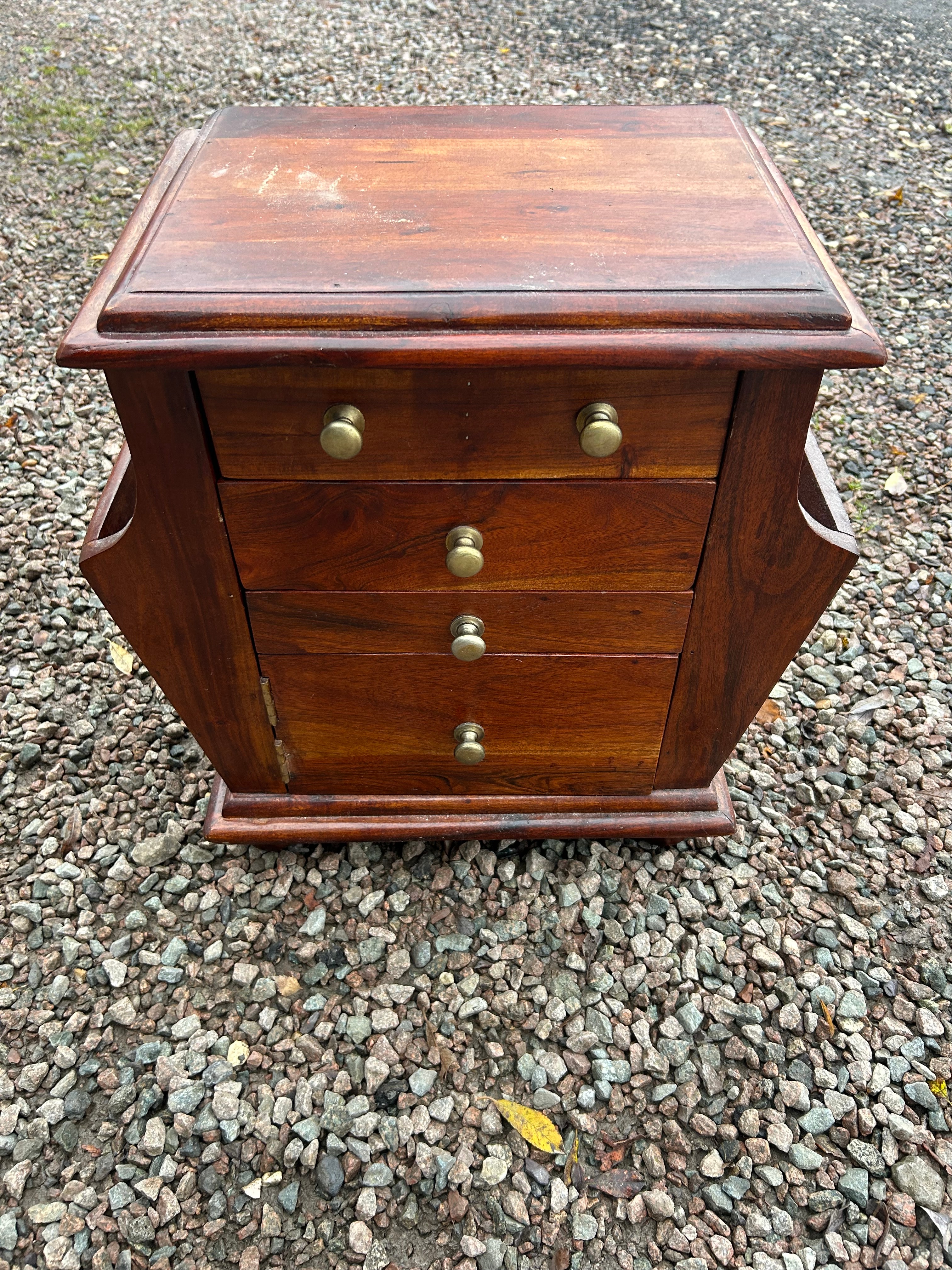 A late 19th or early 20th century mahogany four-drawer Wellington style magazine rack side table. This small, traditional-style wooden storage cabinet or bedside table is constructed from a dark-toned polished hardwood, likely mahogany. It features a rectangular top with an overhanging edge, four aligned drawers each fitted with a brass knob pull, and open storage compartments on its two sides, consistent with a magazine rack function.