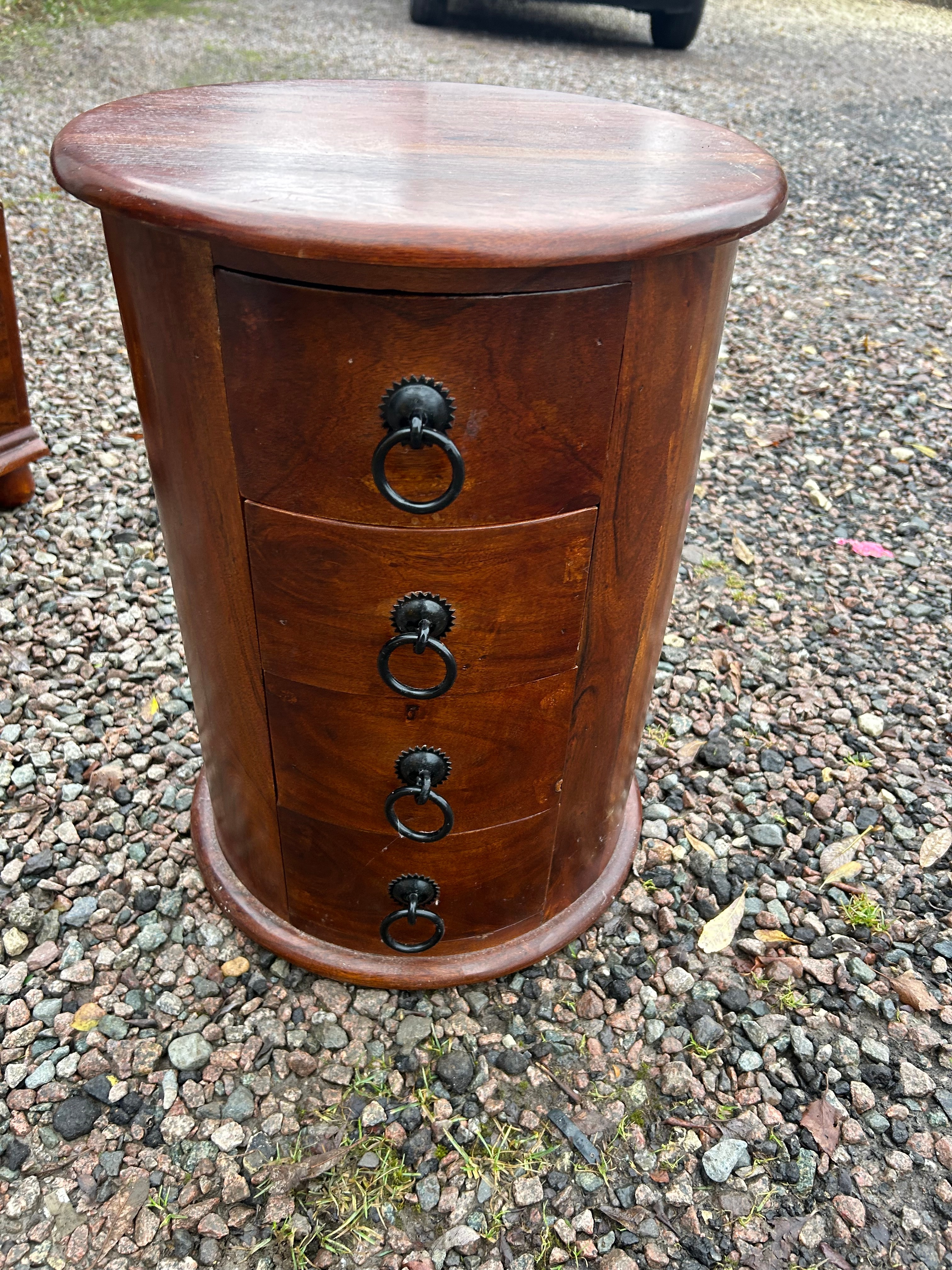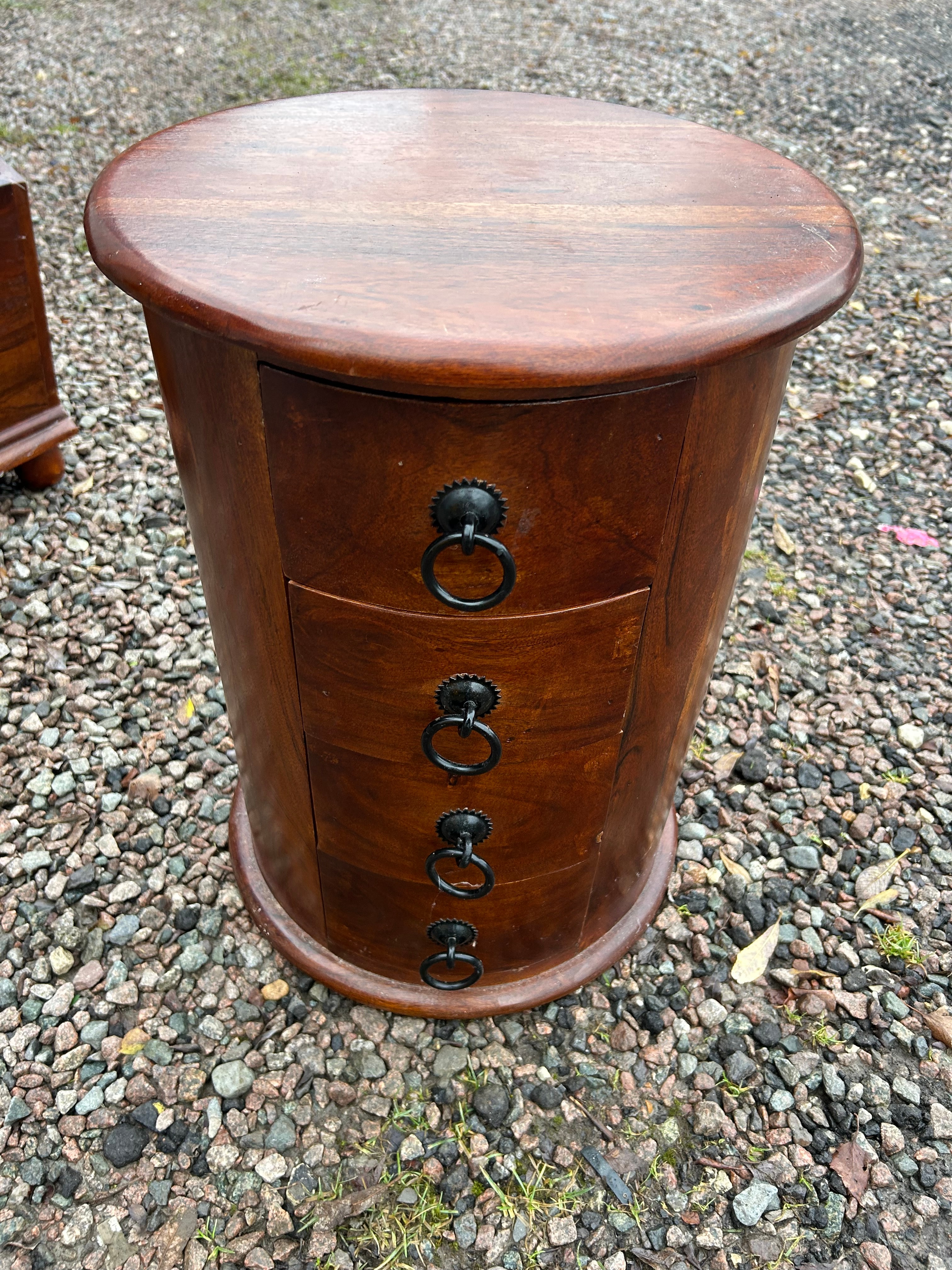 A cylindrical hardwood chest of drawers, featuring a round top and a conforming plinth base. The body is constructed from a dark reddish-brown hardwood, exhibiting a visible grain and a polished finish, consistent with traditional or antique styling. It comprises five stacked drawers, each fitted with a single dark metal ring pull and an ornate backplate.