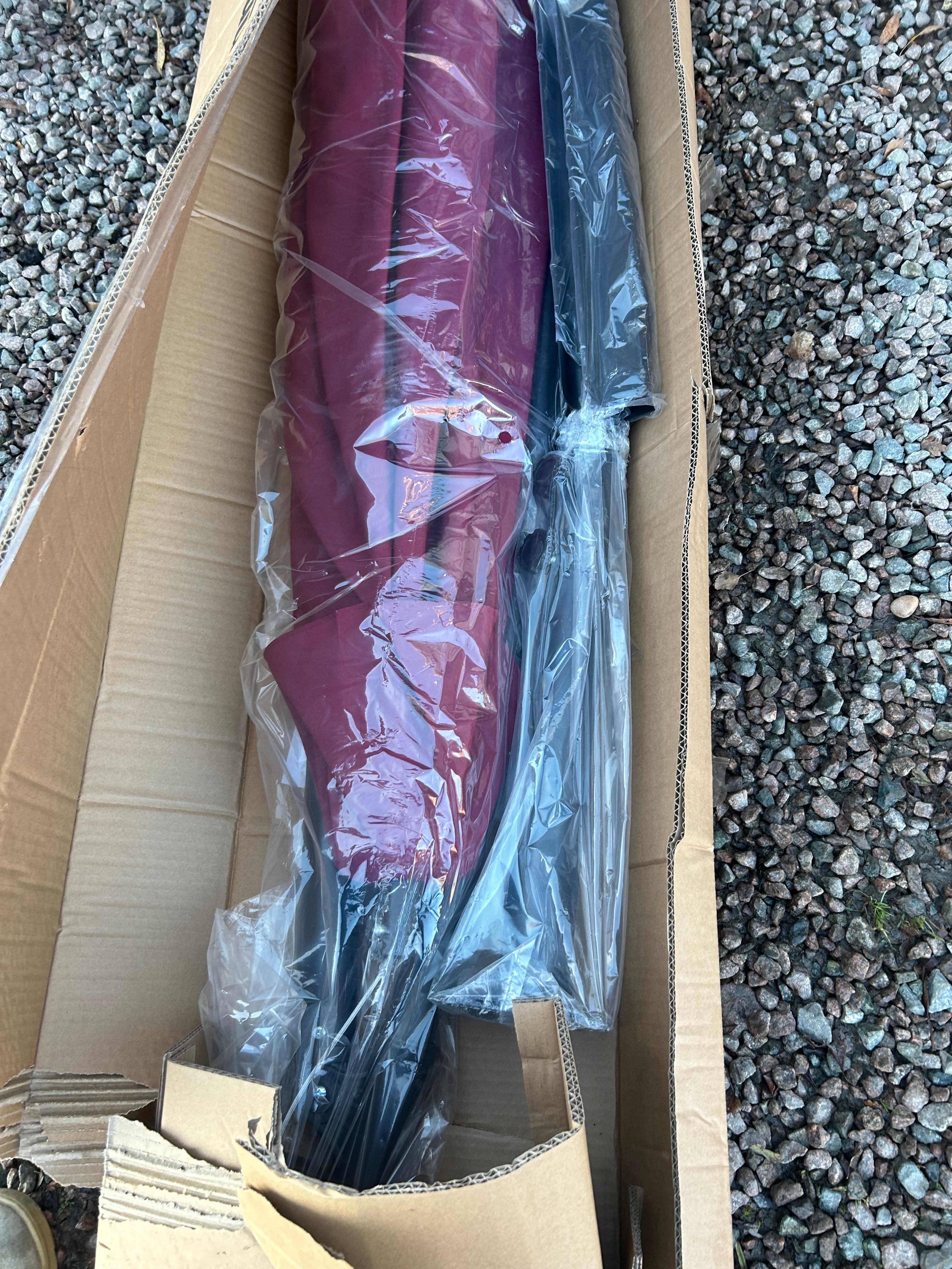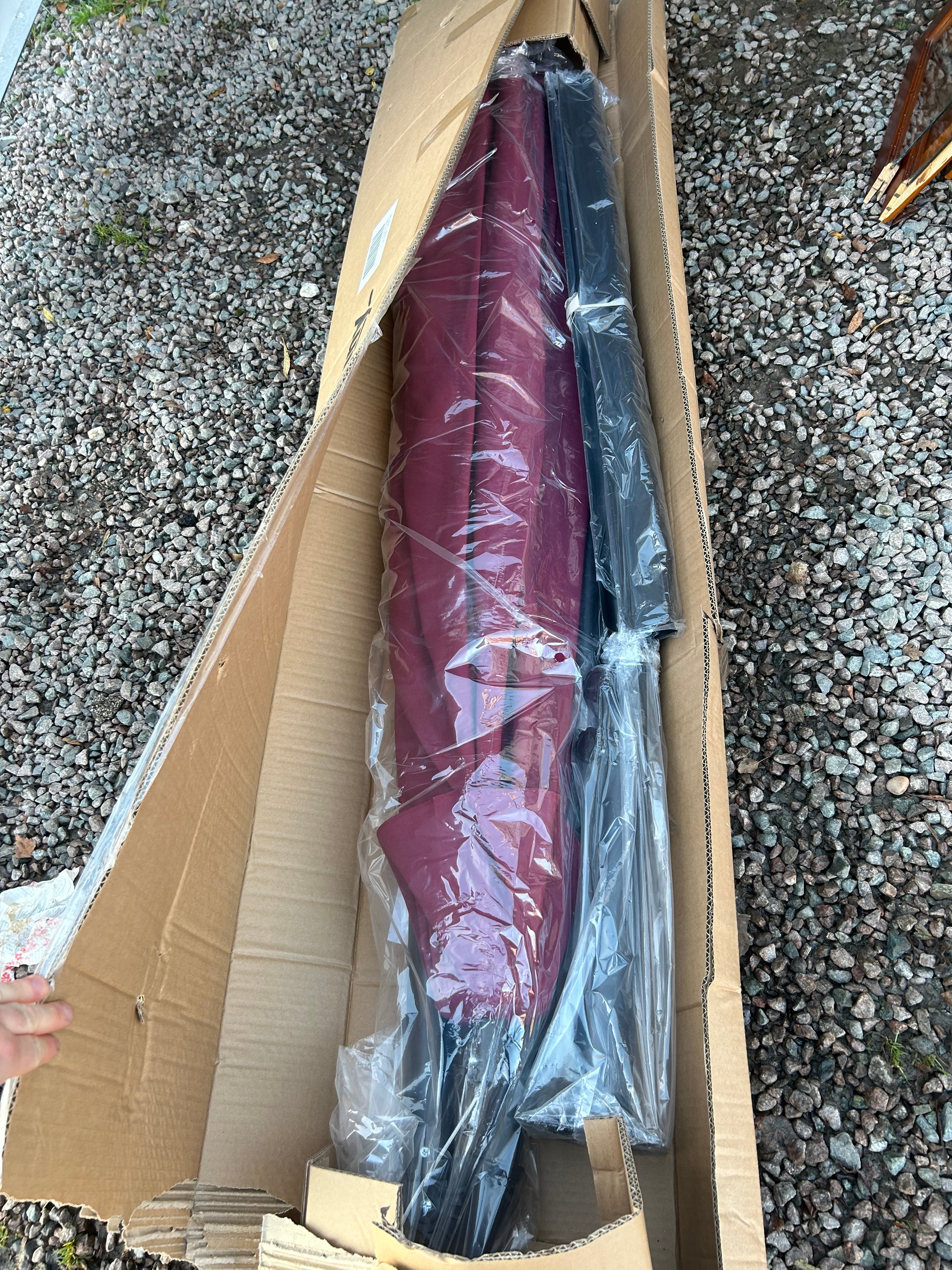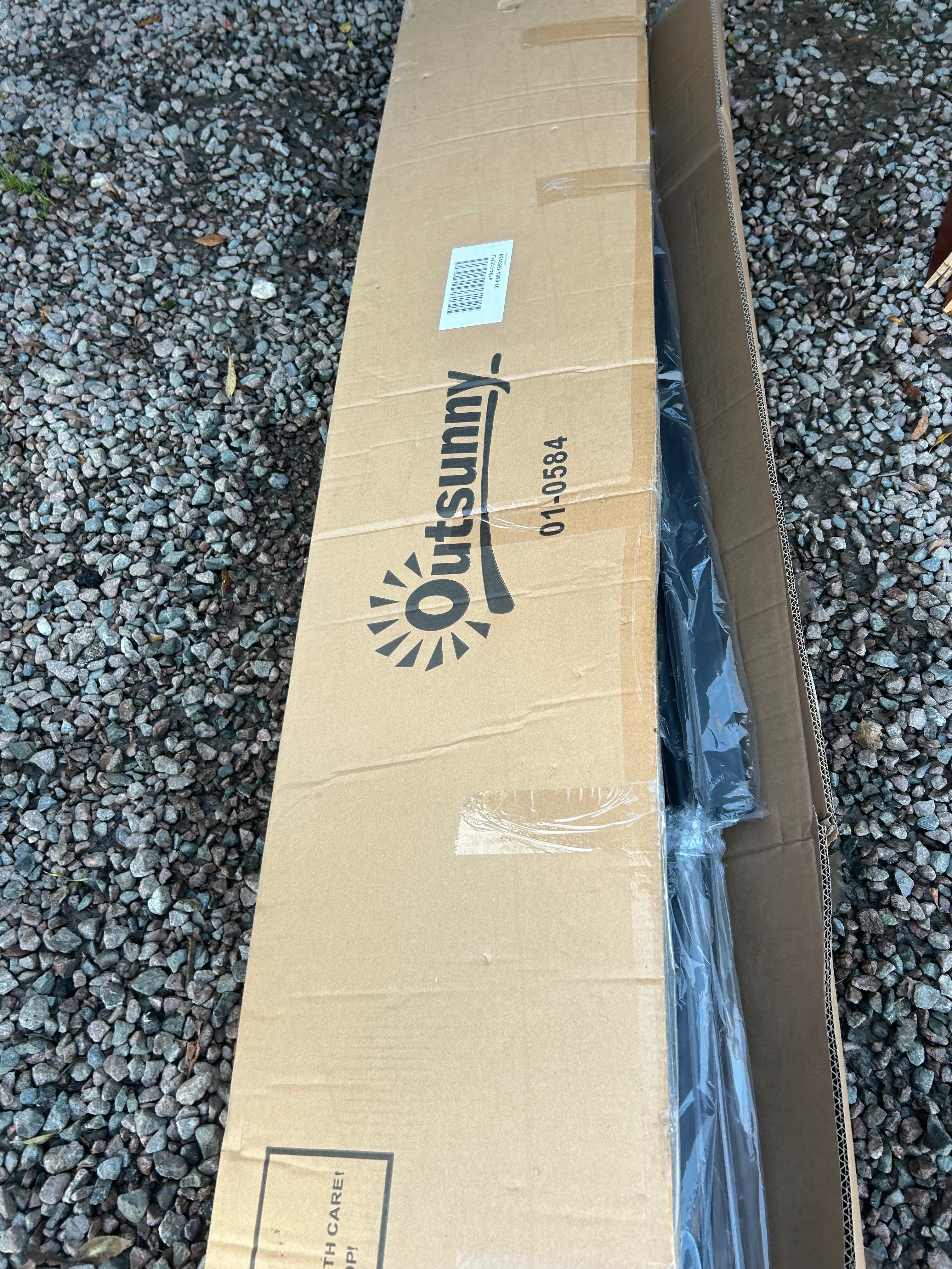 An unassembled outdoor furniture or equipment component by Outsunny, model 01-0584. The item is presented in its original long cardboard box packaging. Inside the partially opened packaging, components wrapped in clear plastic include a rolled burgundy fabric canopy or cover and several black metal or plastic frame poles. The item appears to be in new, unused condition, still within its factory packaging.