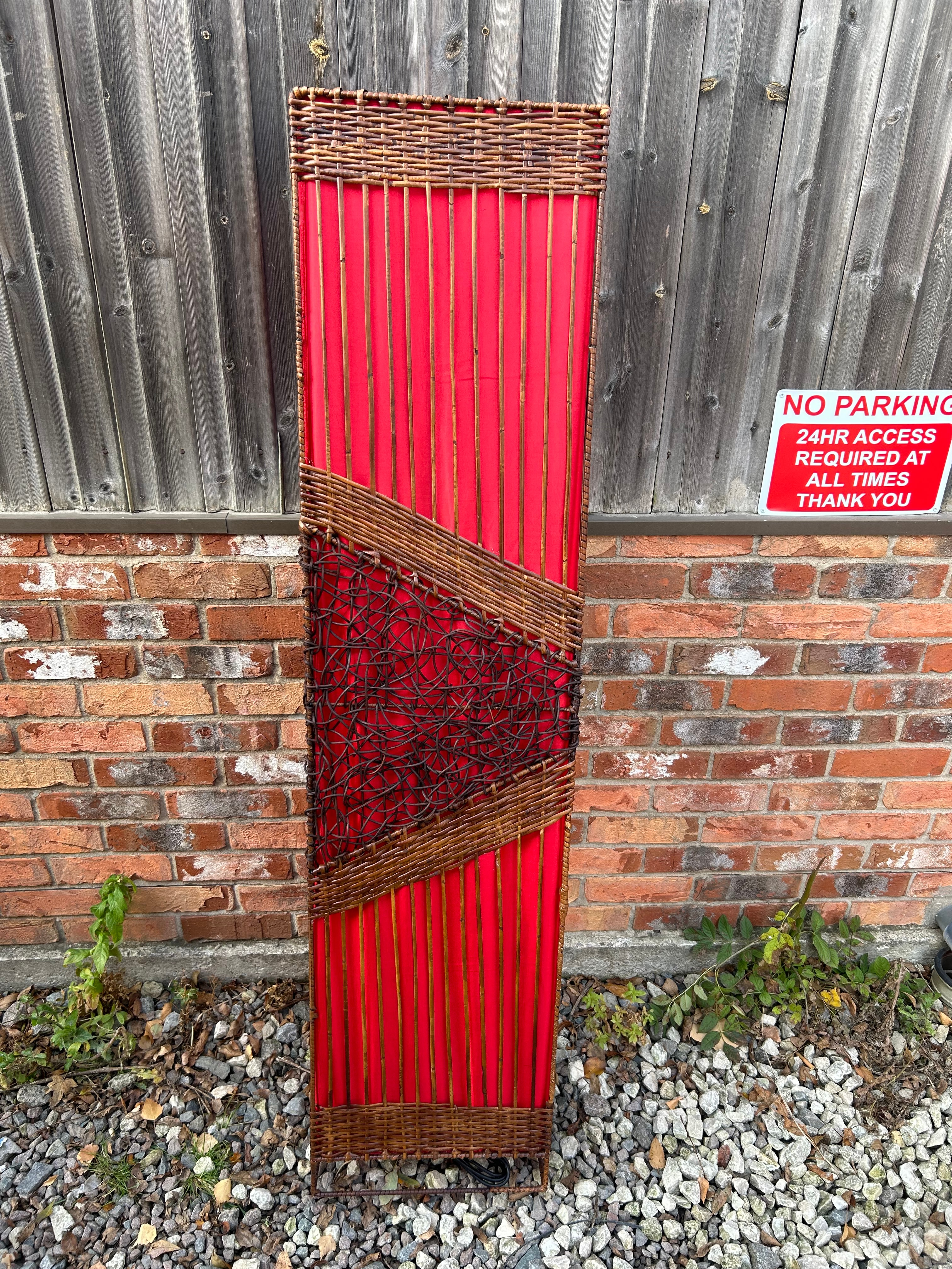A tall, rectangular panel, handmade in Thailand, constructed from light-brown woven wicker and rattan. It features numerous thin, vertical wooden rods, likely bamboo, set against a vibrant red fabric or paper backing. A prominent diagonal band of woven wicker frames an area of darker, intricately woven material within the red section. A black electrical cable is visible emerging from the base, indicating its function as a floor lamp. No manufacturer’s marks or other textual inscriptions are visible on the item.