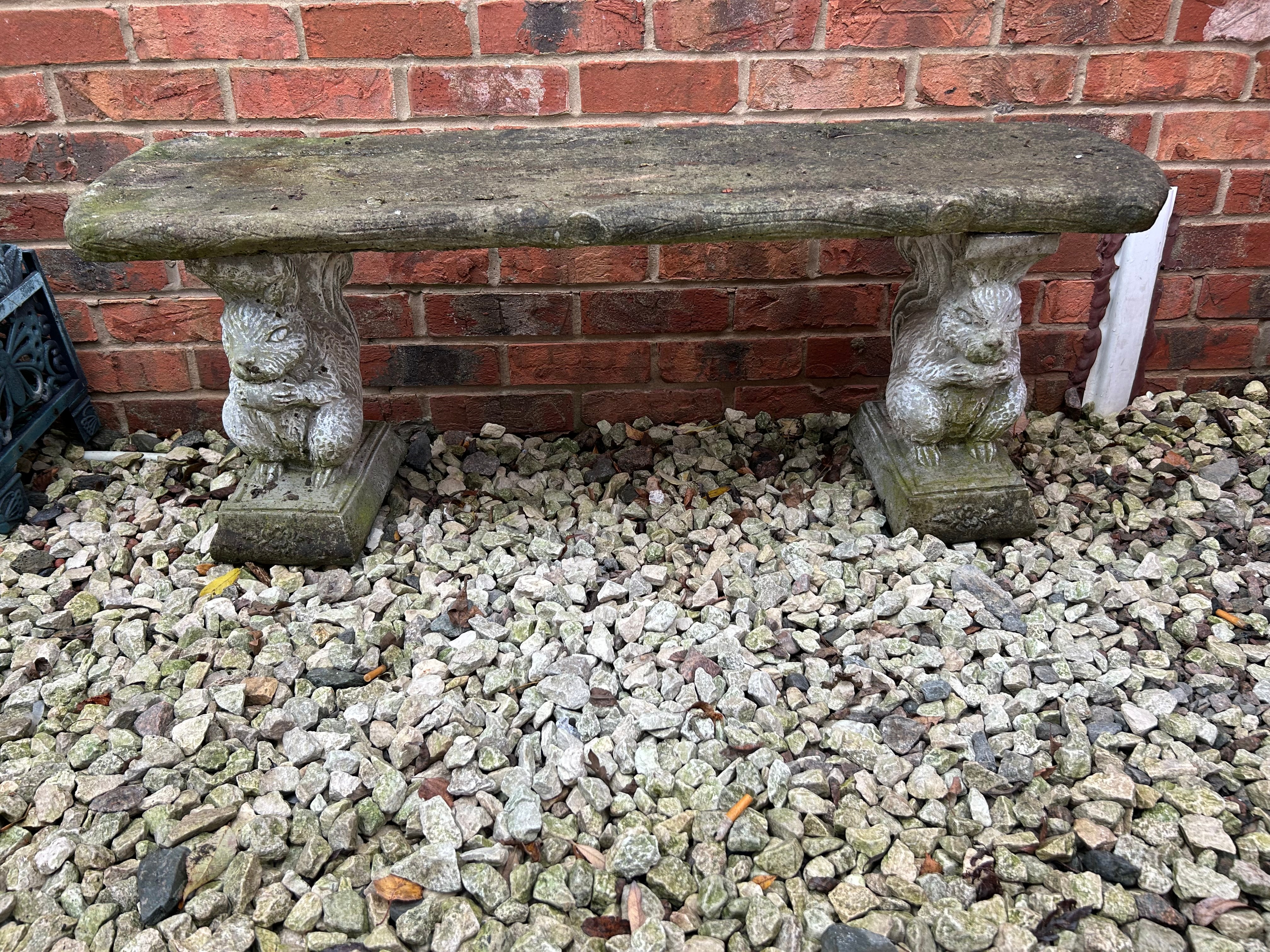 An outdoor garden bench, crafted from cast stone or concrete. The rustic style is characterized by a rectangular top slab with rounded edges, supported by two sculptural bases depicting seated squirrels, each holding an object resembling a nut.