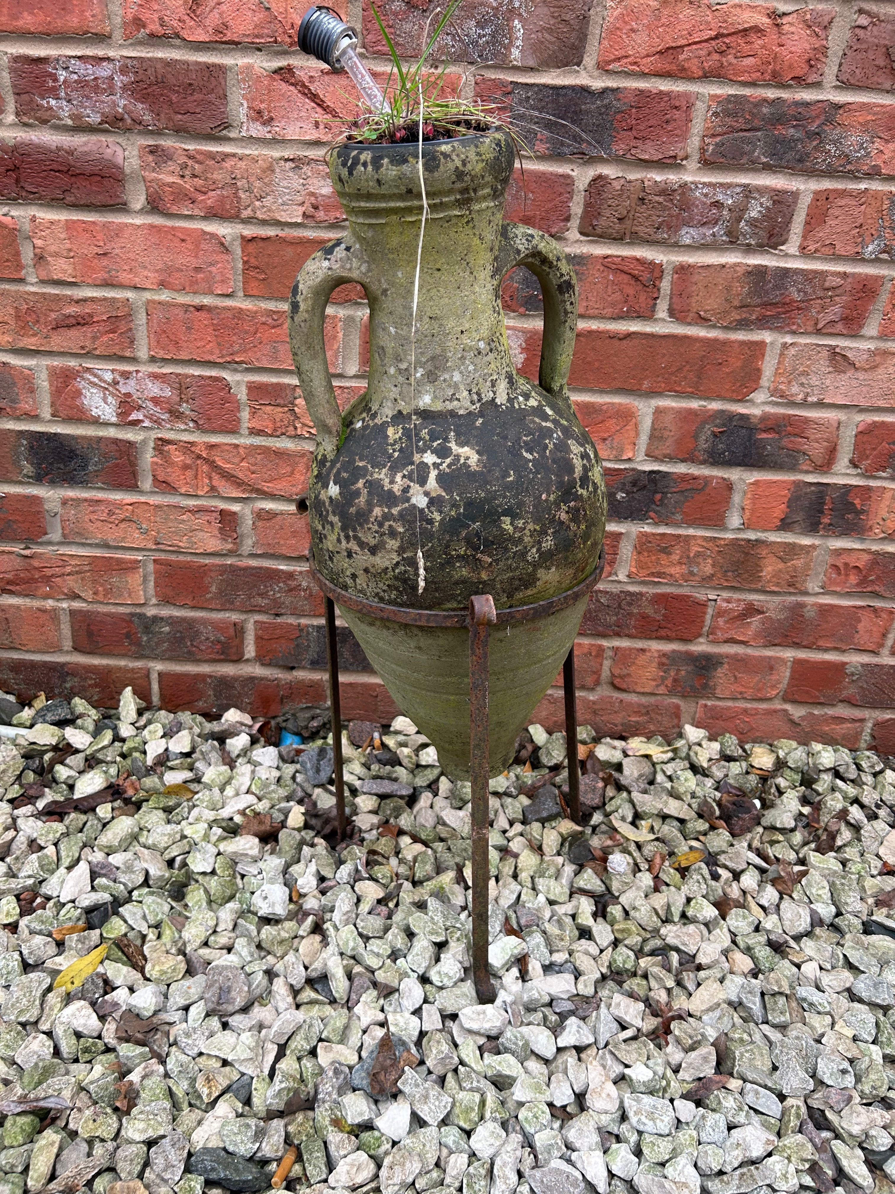 A weathered classical-inspired amphora-form garden planter, likely constructed from reconstituted stone or concrete, featuring two prominent handles and a conical base. It is supported by a three-legged, dark, oxidized metal stand. The planter’s interior currently contains soil and small plants, along with a modern, clear cylindrical stake with a black cap. No discernible text, maker’s marks, or specific period indicators are visible.