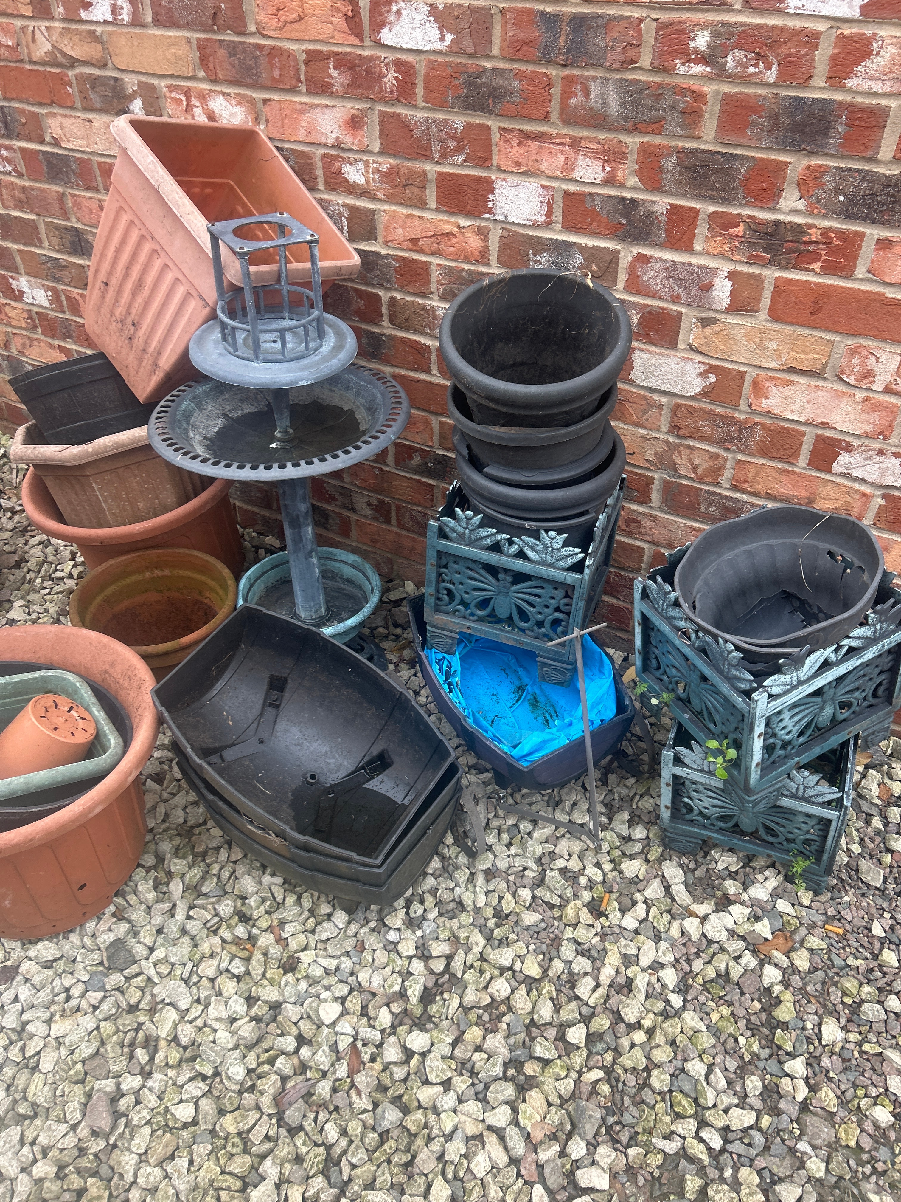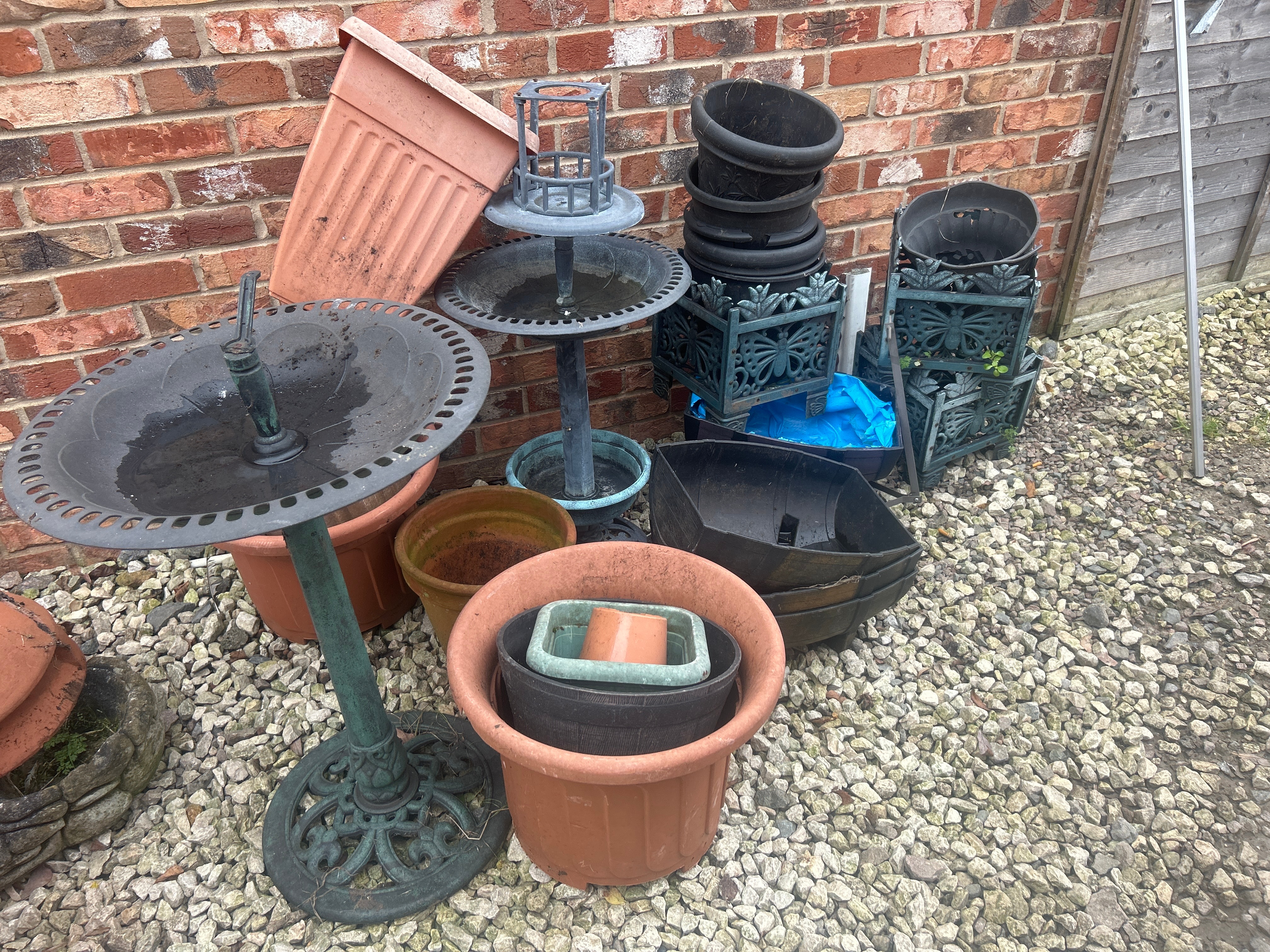 This mixed lot consists of approximately two dozen garden items, primarily comprising various plastic (black, terracotta-colored) and terracotta planters/pots, alongside two painted metal bird baths/ornamental stands and two painted metal decorative plant cages/stands. The style ranges from utilitarian for the majority of the pots to a more traditional or rustic garden aesthetic for the metal elements, featuring some scrolled or floral motifs. The two painted metal bird baths/ornamental stands are of a pedestal design, consistent with common garden bird bath and feeder styles. The two painted metal decorative plant cages/stands also feature scrolled or floral motifs. No discernible text or manufacturer markings are apparent.