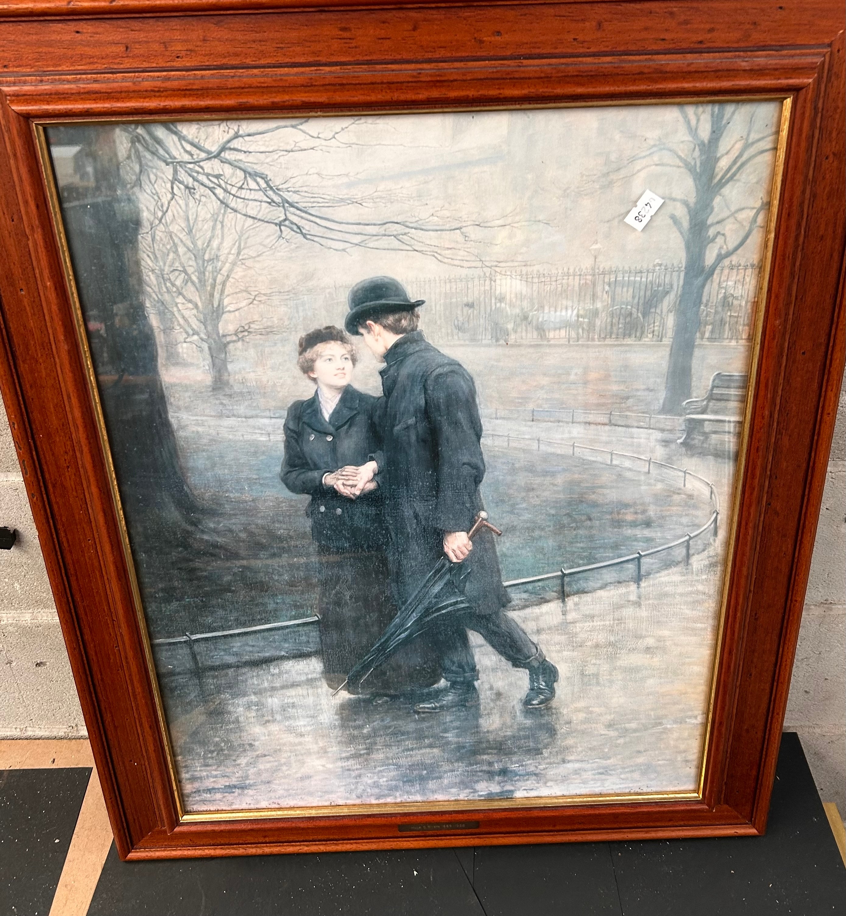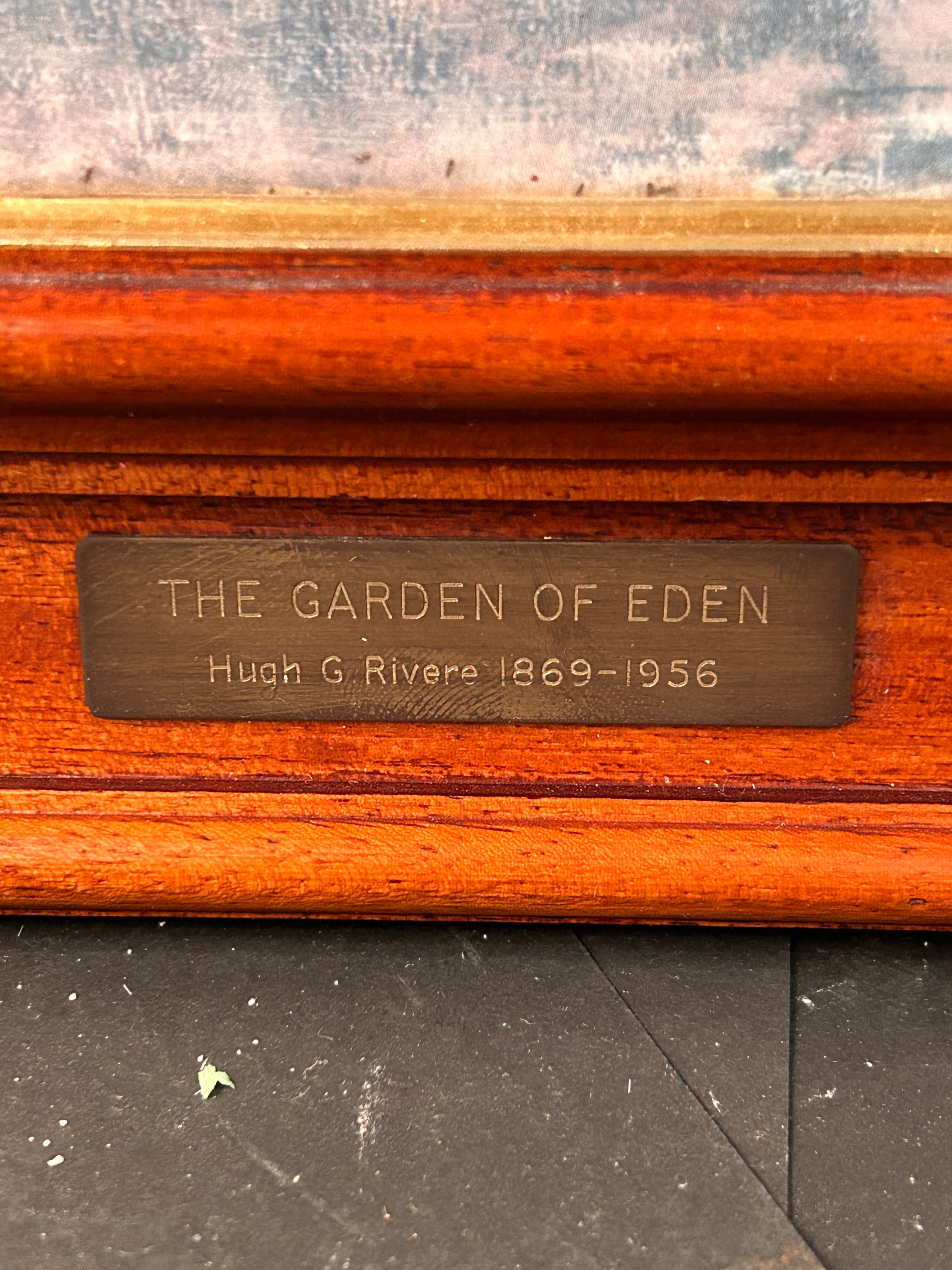 A framed print titled ‘The Garden of Eden’ by Hugh G. Riviere (1869-1956). The print depicts a late Victorian/Edwardian scene of a man and woman in period attire conversing in a wet, bare-treed park setting, rendered with muted tones. It is presented under glass in a reddish-brown wooden frame, which prominently features a brass-toned metal plaque inscribed ‘THE GARDEN OF EDEN’ above ‘Hugh G. Rivere 1869-1956’.