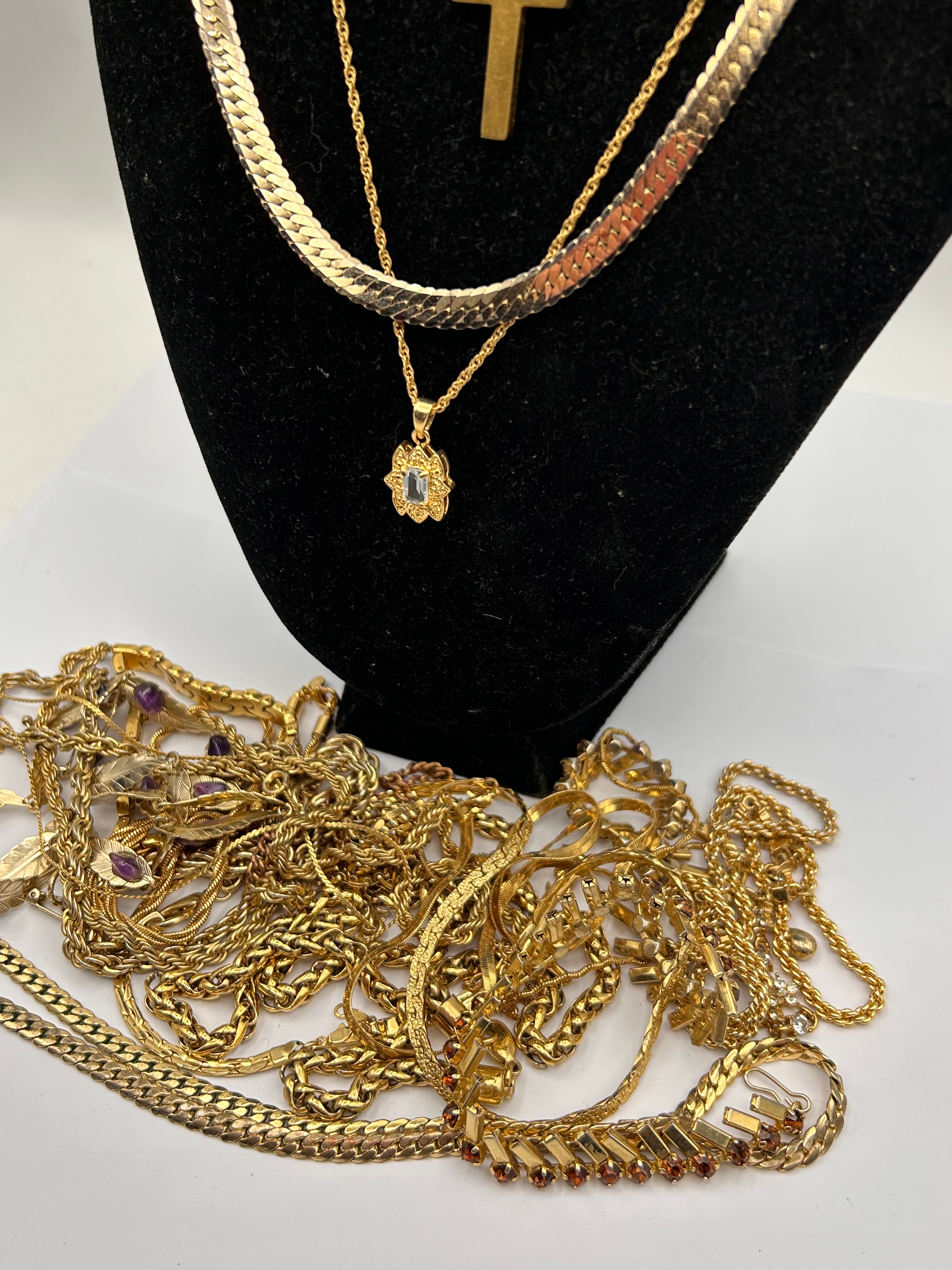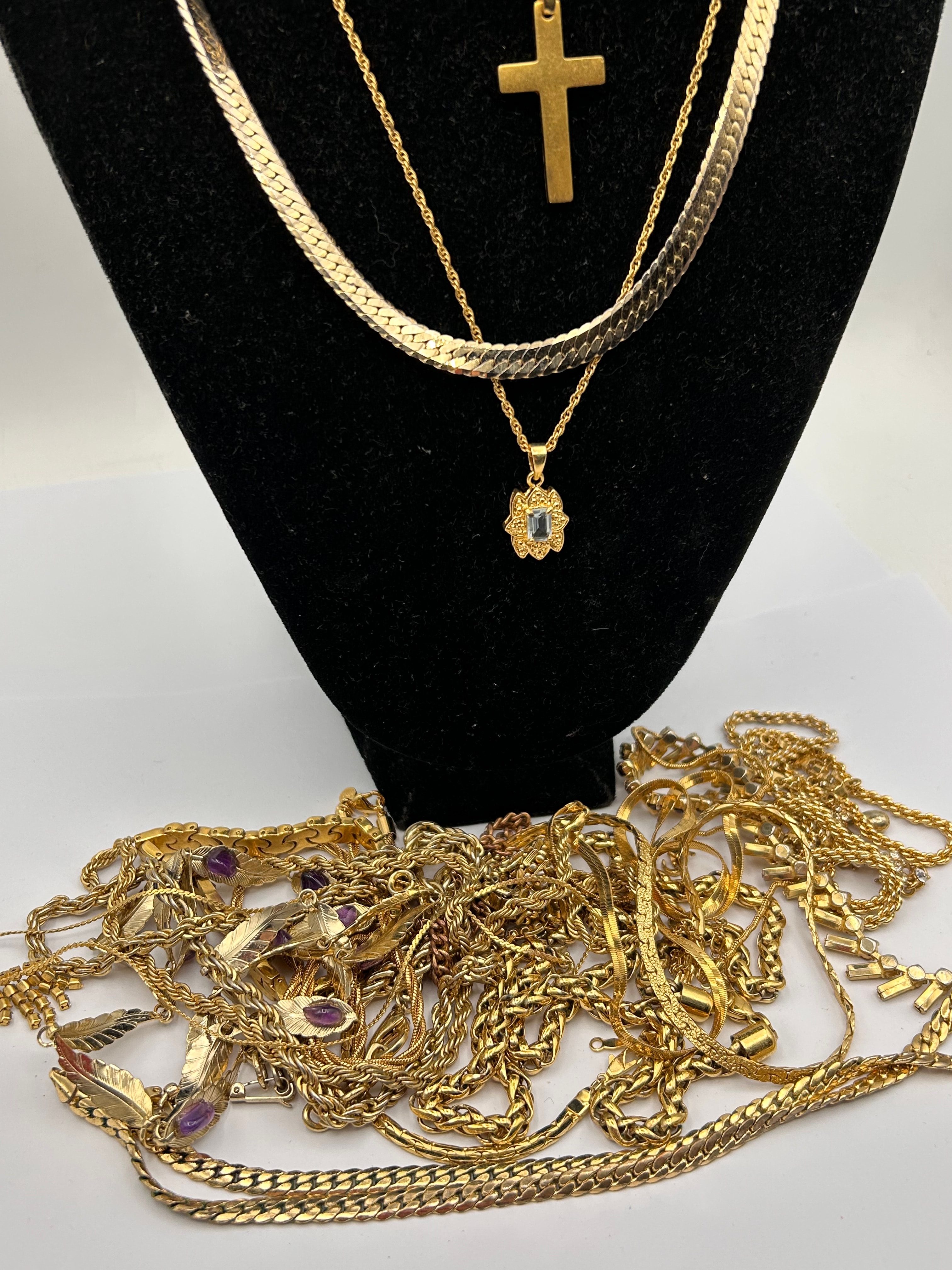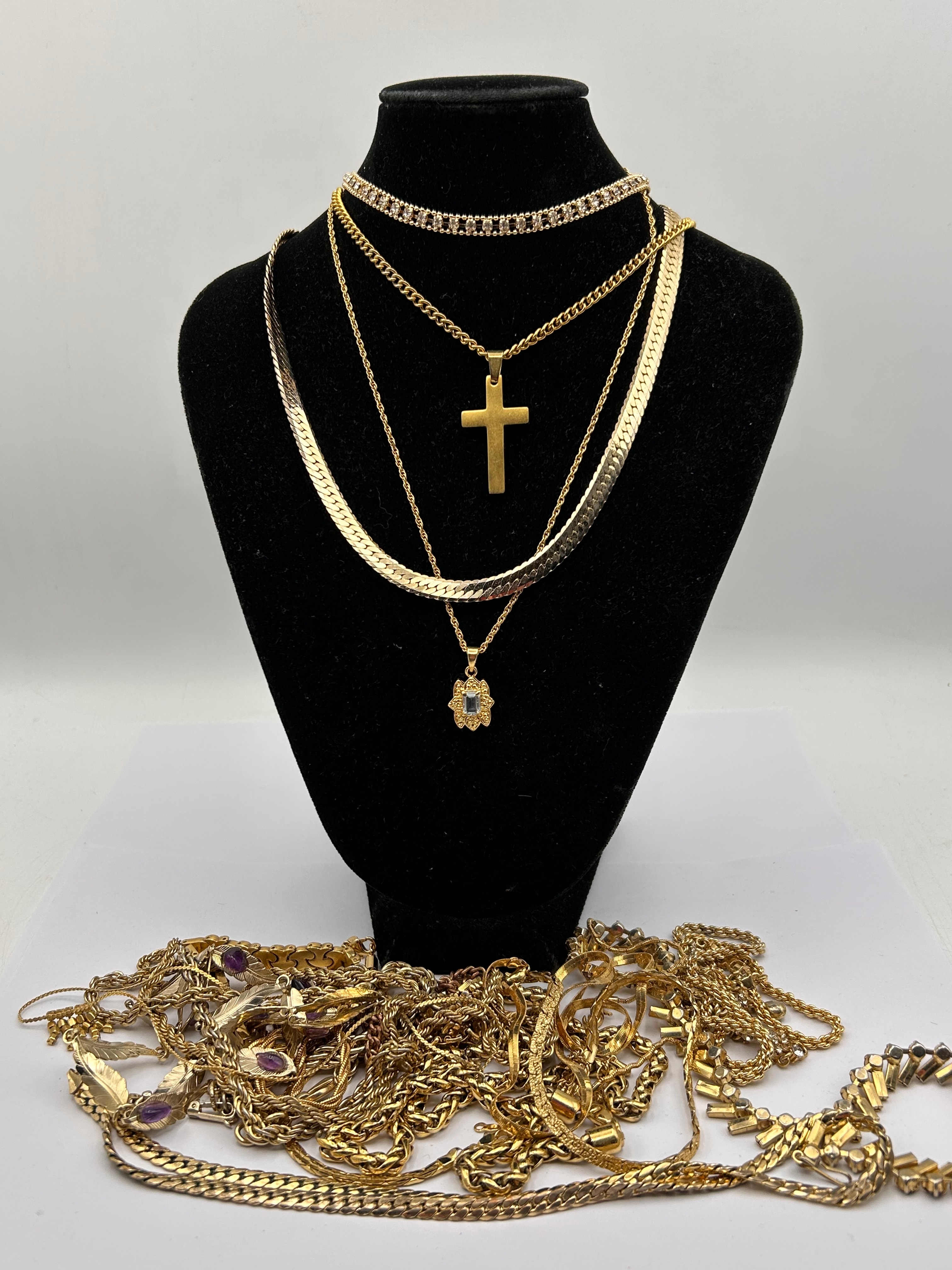 A substantial collection of gold-toned jewelry, primarily chains and necklaces, consistent with the style of layered cross necklaces identified in market intelligence. Several pieces are displayed on a black velvet bust, including a thin, possibly embellished choker; a delicate chain suspending a plain cross pendant; a wider, flat herringbone-style chain; and a delicate chain holding a small, ornate pendant with a central light blue or clear stone. A large, tangled assortment of additional gold-toned jewelry is piled at the base, comprising numerous chains of various link styles (e.g., curb, rope, Figaro), bracelets, and smaller pendants. Visible details within this pile include pieces adorned with small purple, red/orange, or clear stones, and items featuring feather motifs. All pieces are crafted from gold-toned metal. No discernible hallmarks, inscriptions, or text are visible.
