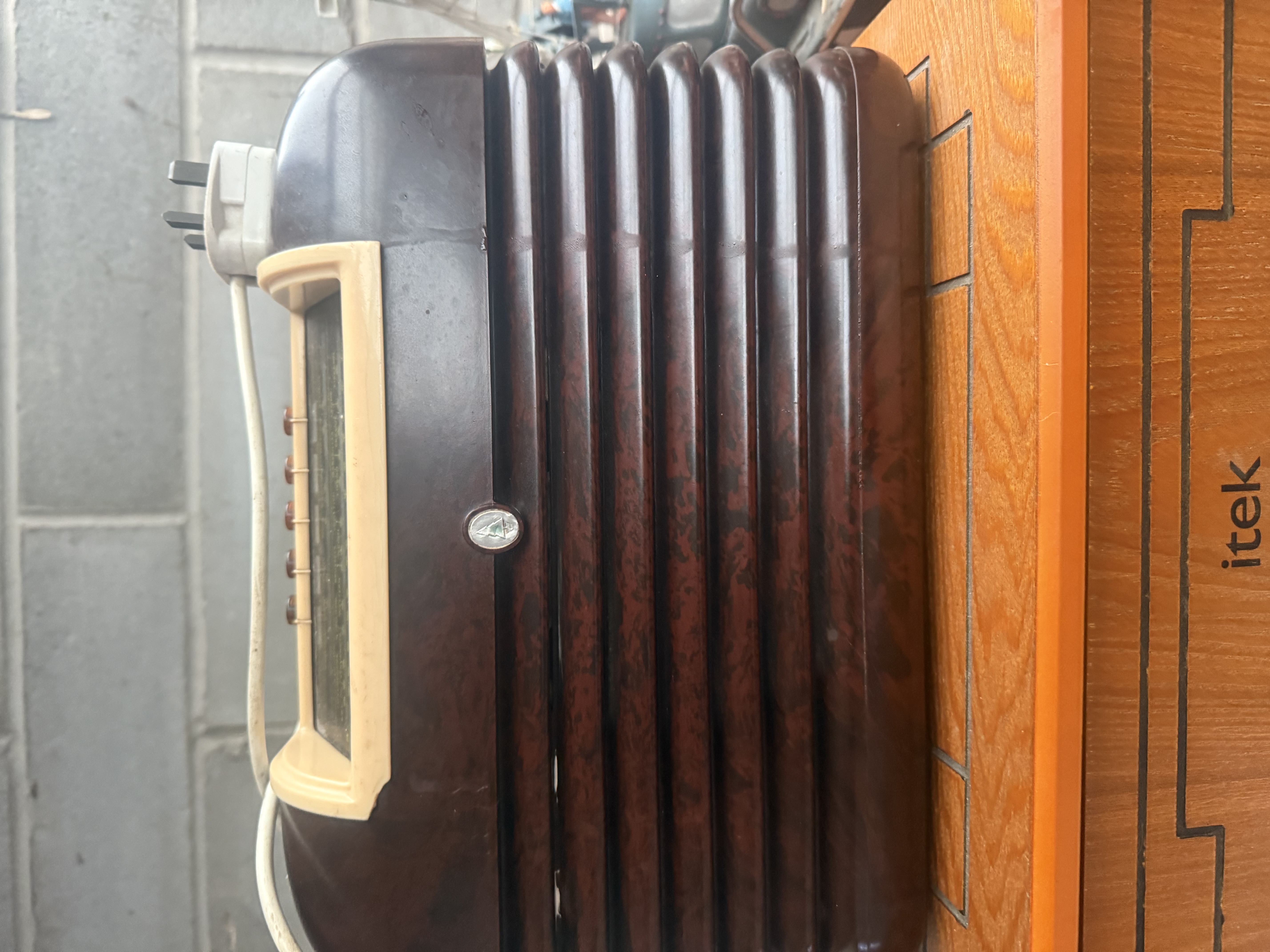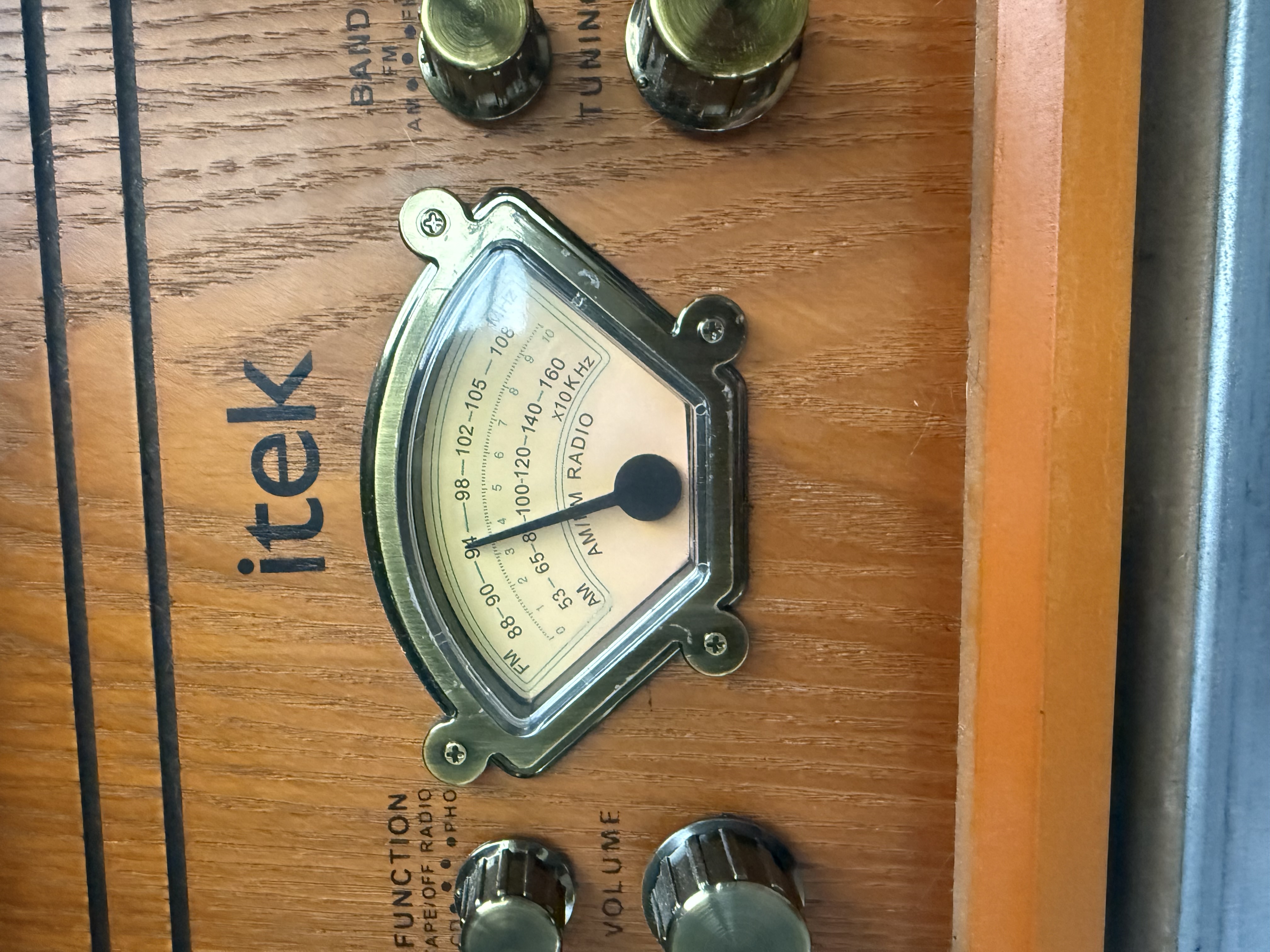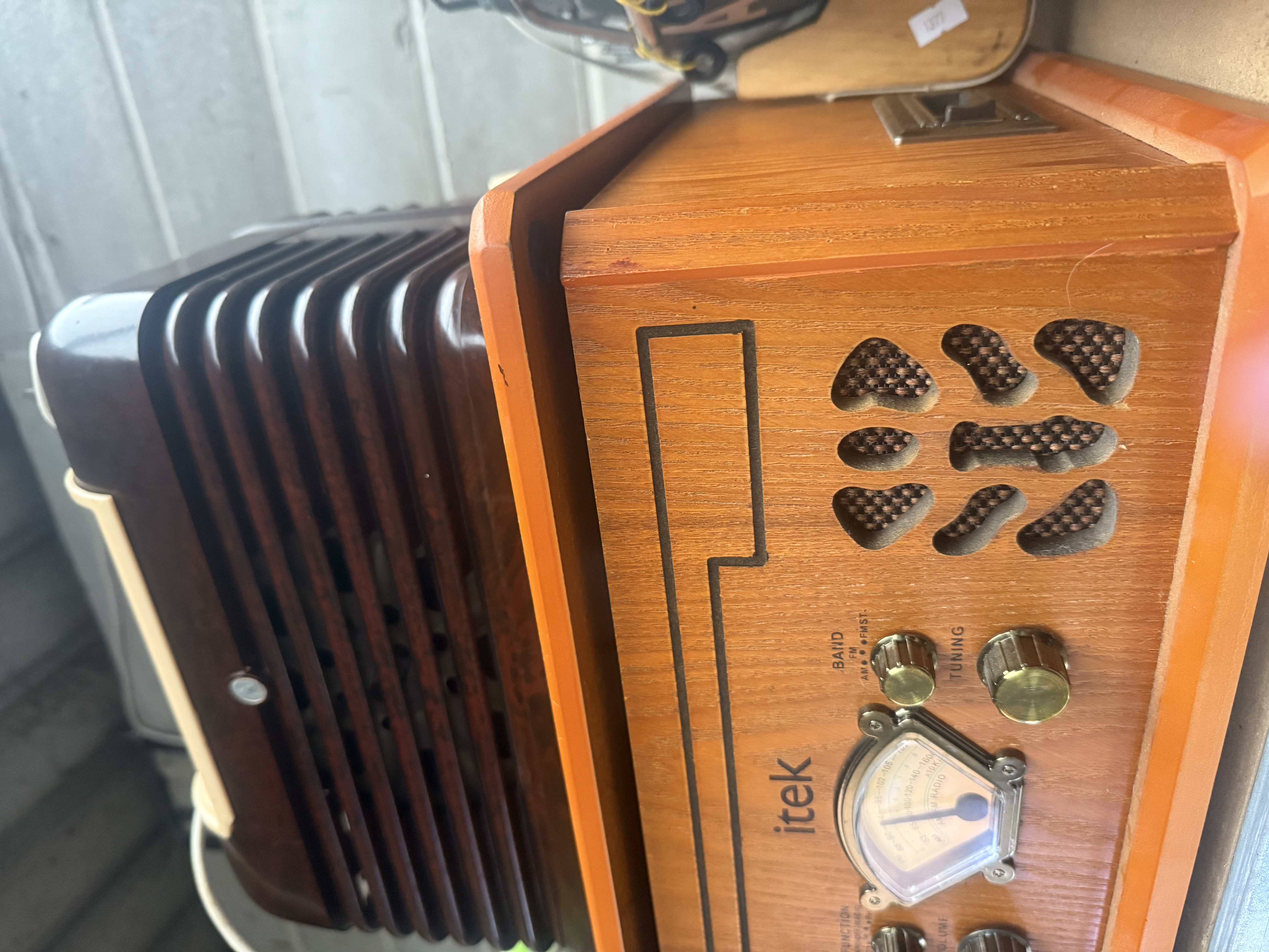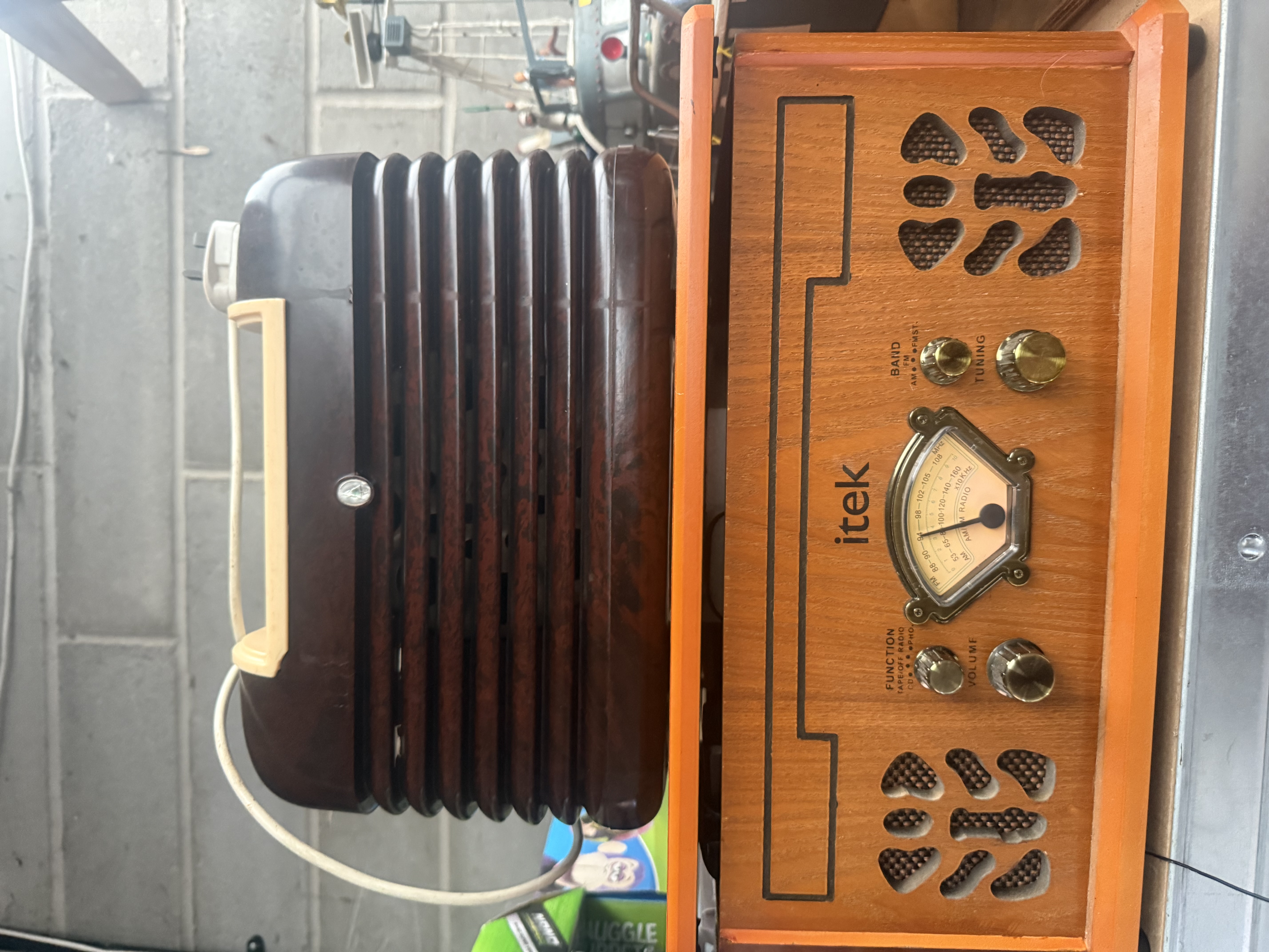 Two radios, comprising a brown and cream vintage-style radio with MW, LW, SW bands, and an itek branded light brown wood-grain and orange multimedia player with AM/FM radio, tape, and phono functions.