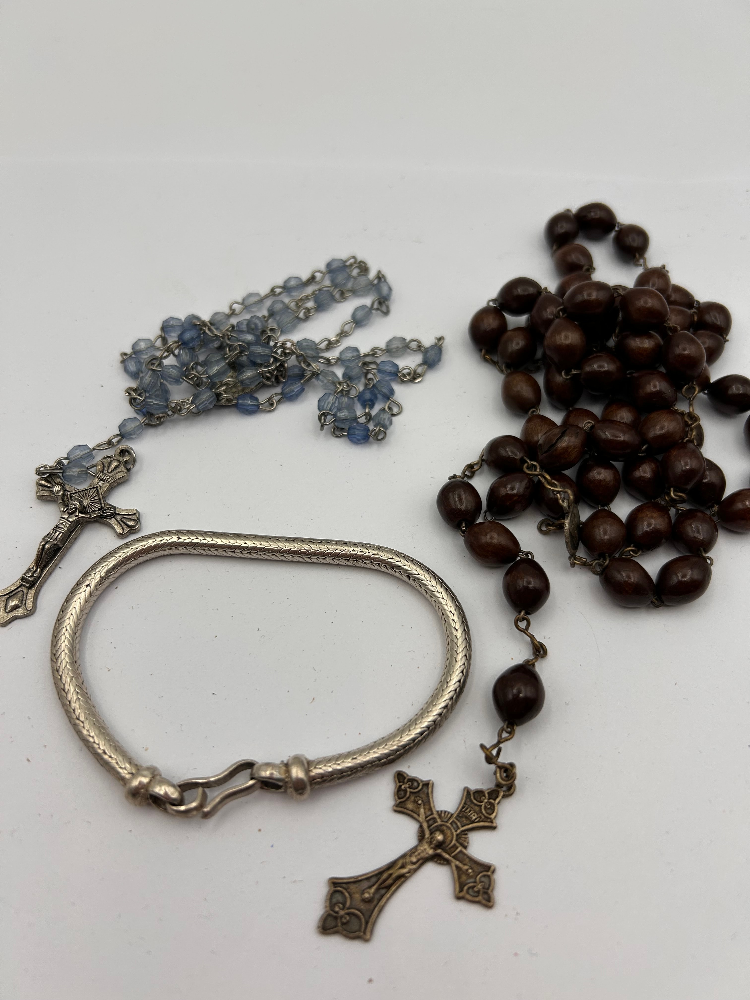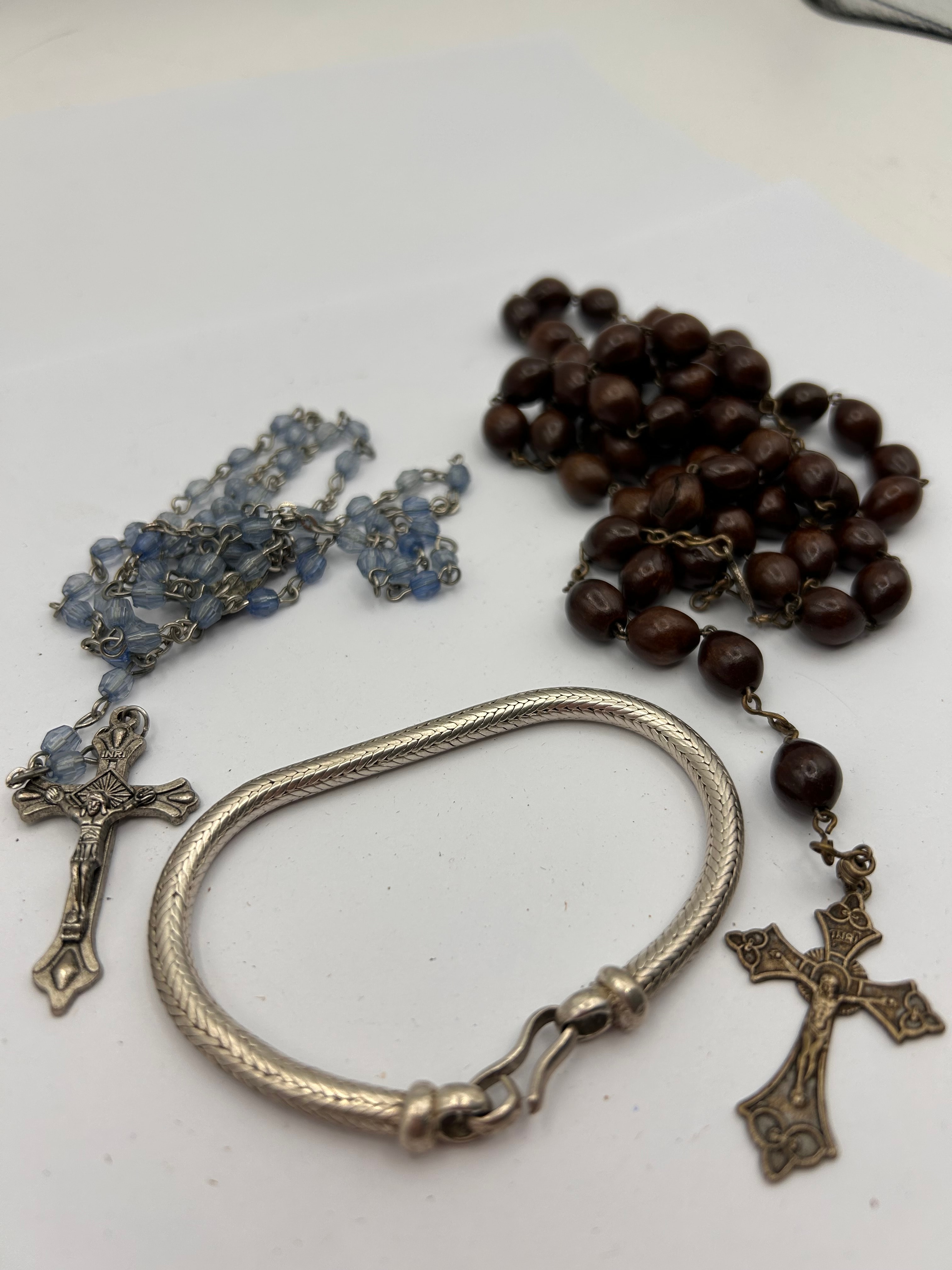 A group of three vintage religious and decorative items. The first rosary features light blue faceted glass beads interconnected by silver-tone metal links, complete with a crucifix bearing a corpus and a religious medal centerpiece. The second rosary is composed of larger dark brown oval beads, likely wood or seeds, joined by brass-tone or bronze-tone metal links, and incorporates an ornate crucifix with corpus. The centrally located bracelet is a rigid, oval-shaped silver-tone metal bangle, possibly silver, characterized by a textured, scale-like surface pattern and secured with an S-hook clasp.