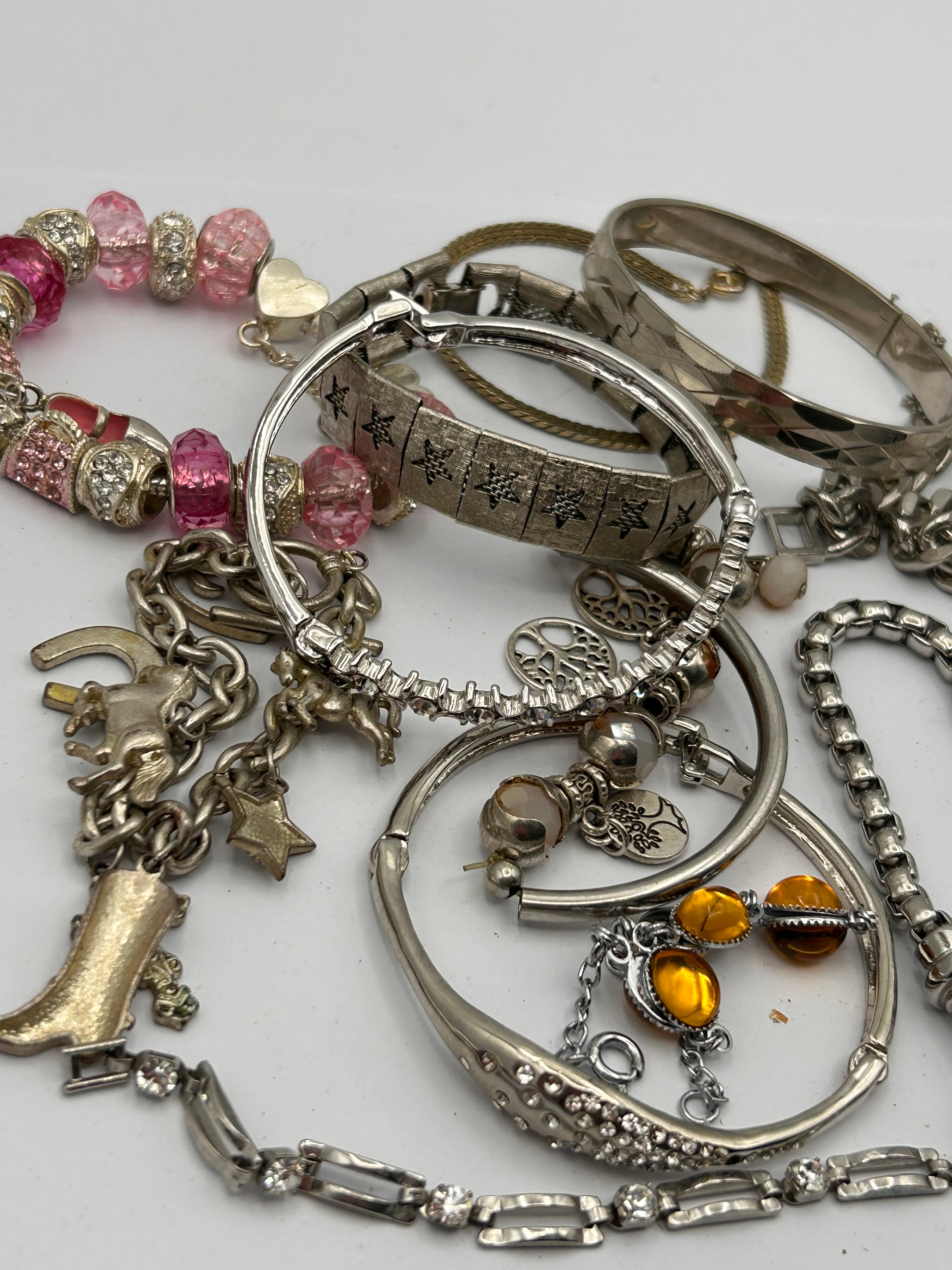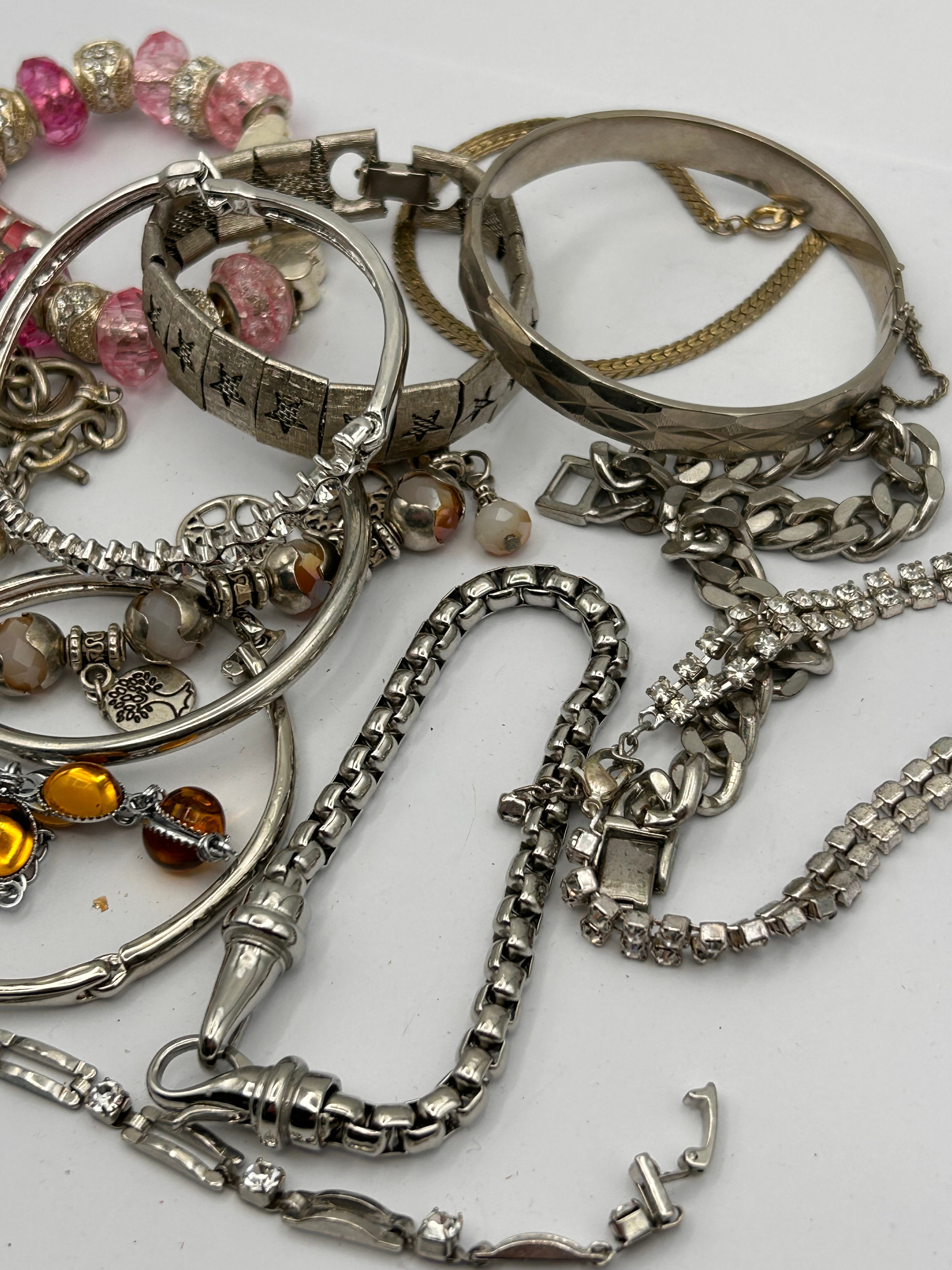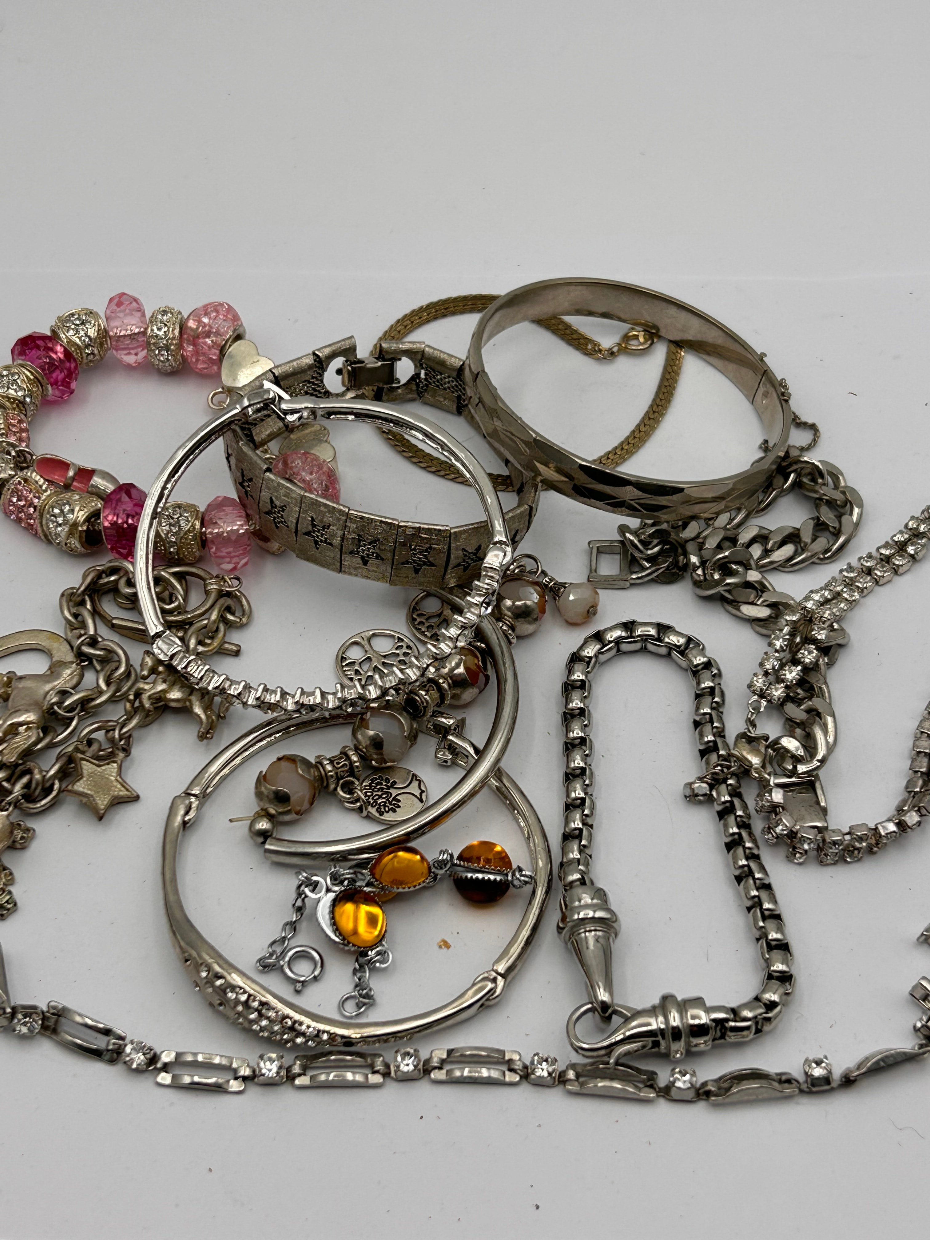 This lot comprises a mixed assortment of fashion jewelry, primarily consisting of various bracelets and some accompanying chains. Styles include plain and patterned bangles, one with a textured, possibly cross-hatch design, chain-link bracelets, charm bracelets featuring elements like stars and a boot, and beaded designs incorporating pink and amber-colored beads. Many pieces are set with colorless stones, likely rhinestones or simulated diamonds. The predominant material is silver-toned metal, with a few instances of gold-toned metal. No specific period is discernable, consistent with contemporary fashion jewelry.