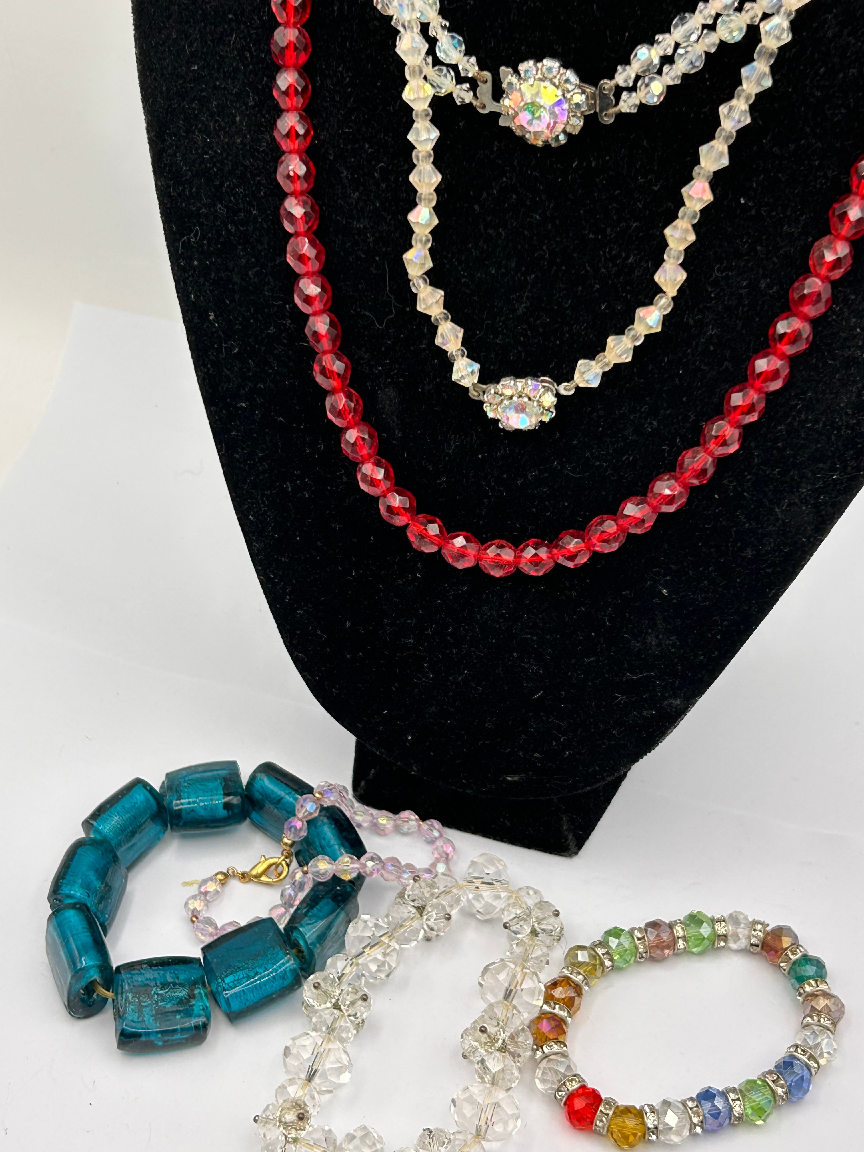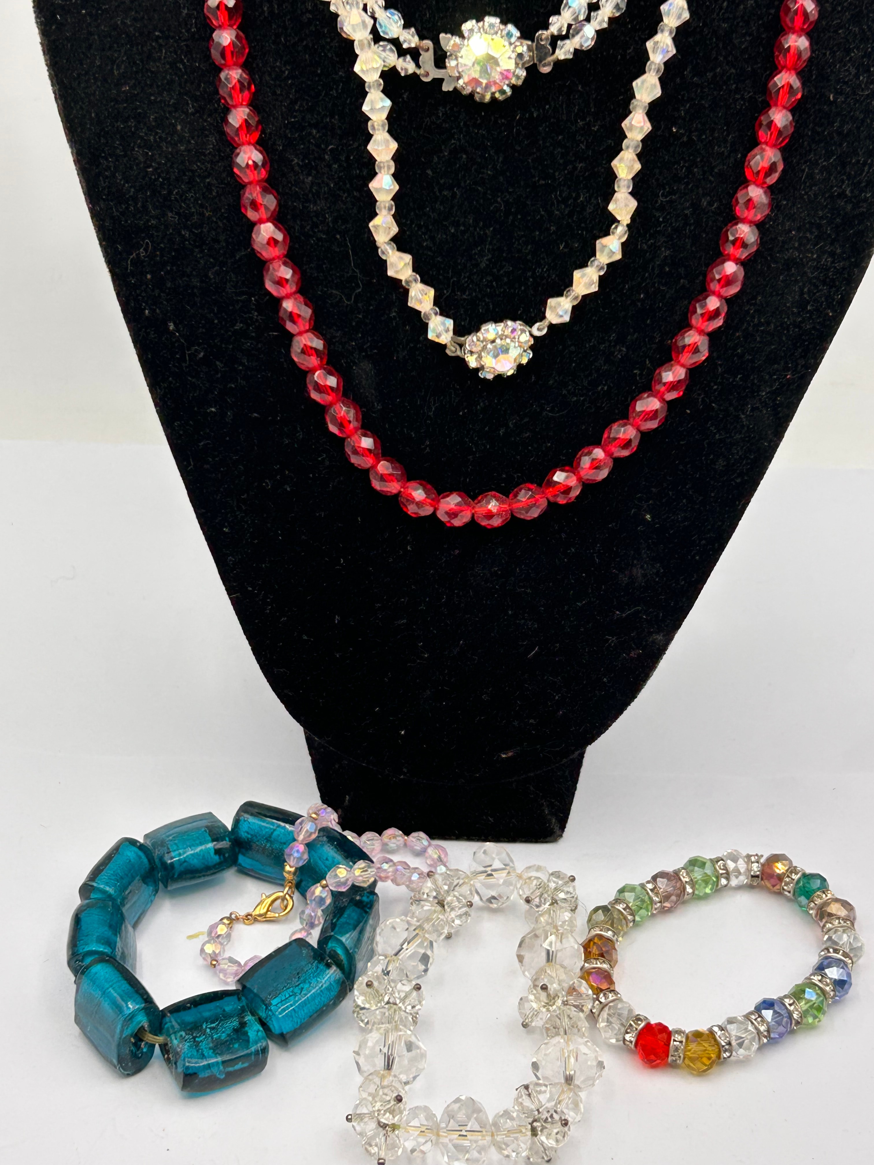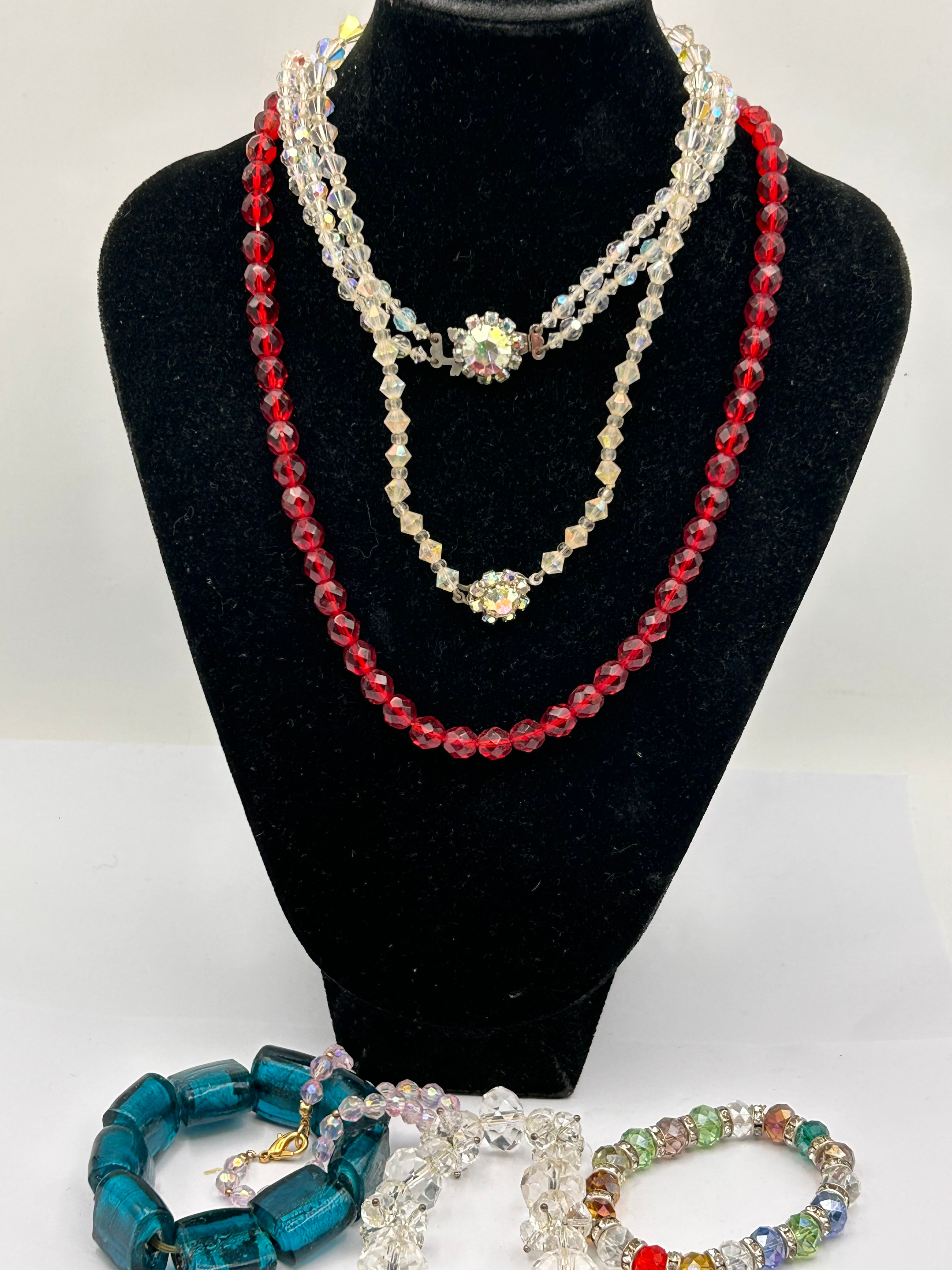 This lot comprises a collection of costume jewelry, featuring a long strand of faceted red glass beads, complemented by two shorter strands of faceted clear or iridescent glass beads, likely crystal, each incorporating a central ornate rhinestone-embellished focal point. The accompanying three bracelets include one with large, rectangular, translucent teal glass beads secured by a gold-tone lobster clasp; another composed of clear faceted glass beads; and a stretchy bracelet featuring assorted multi-colored faceted beads interspersed with smaller silver-tone spacers accented with clear rhinestones.