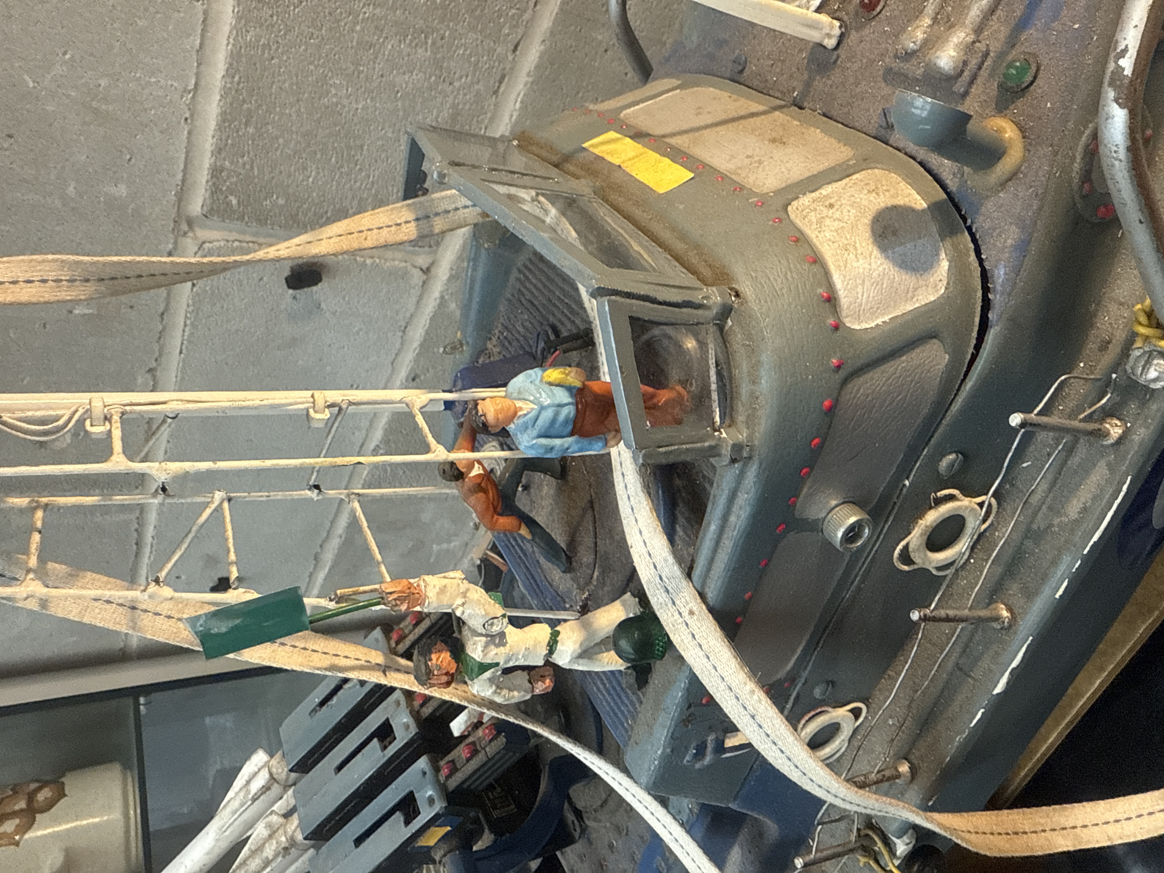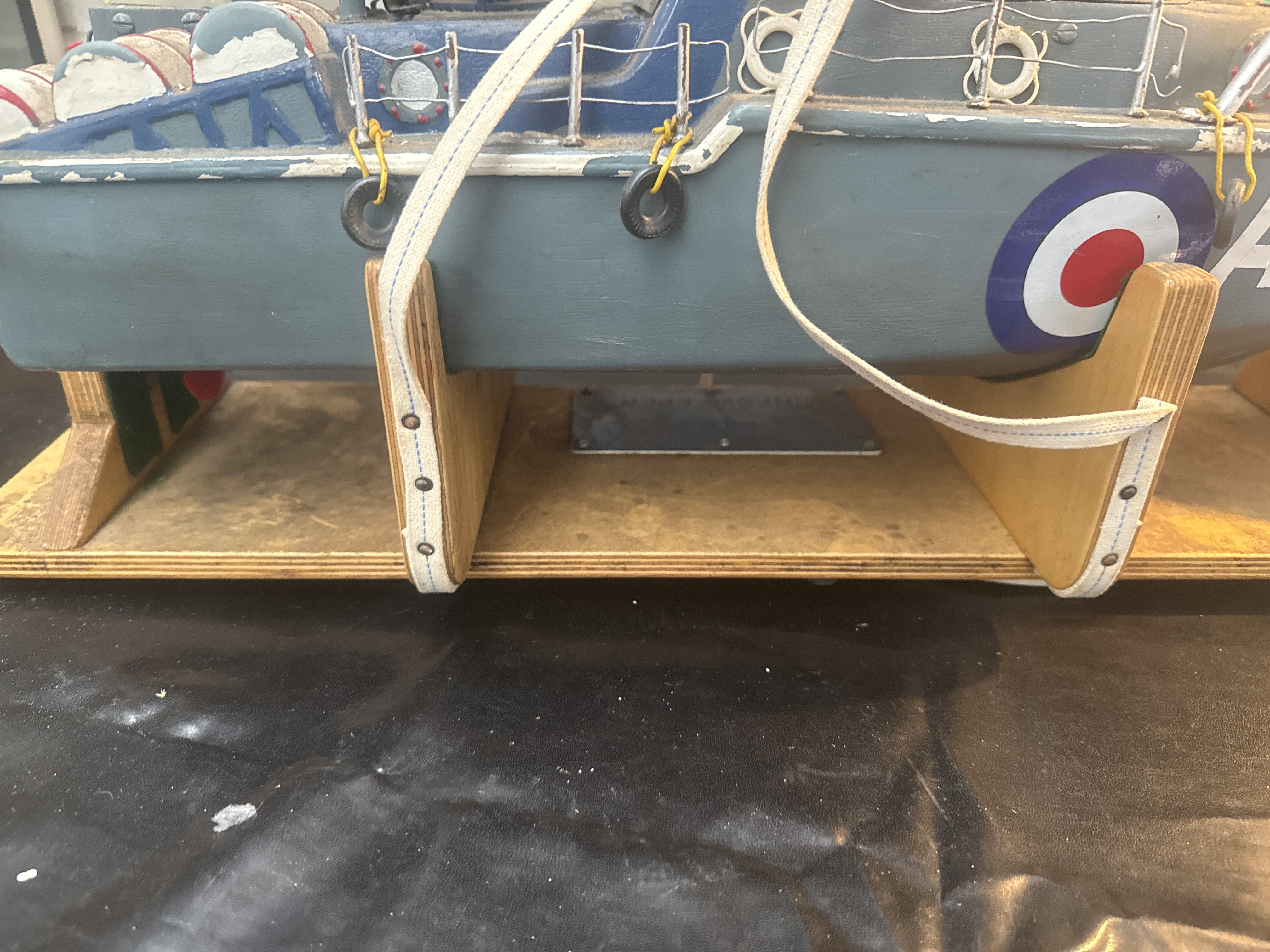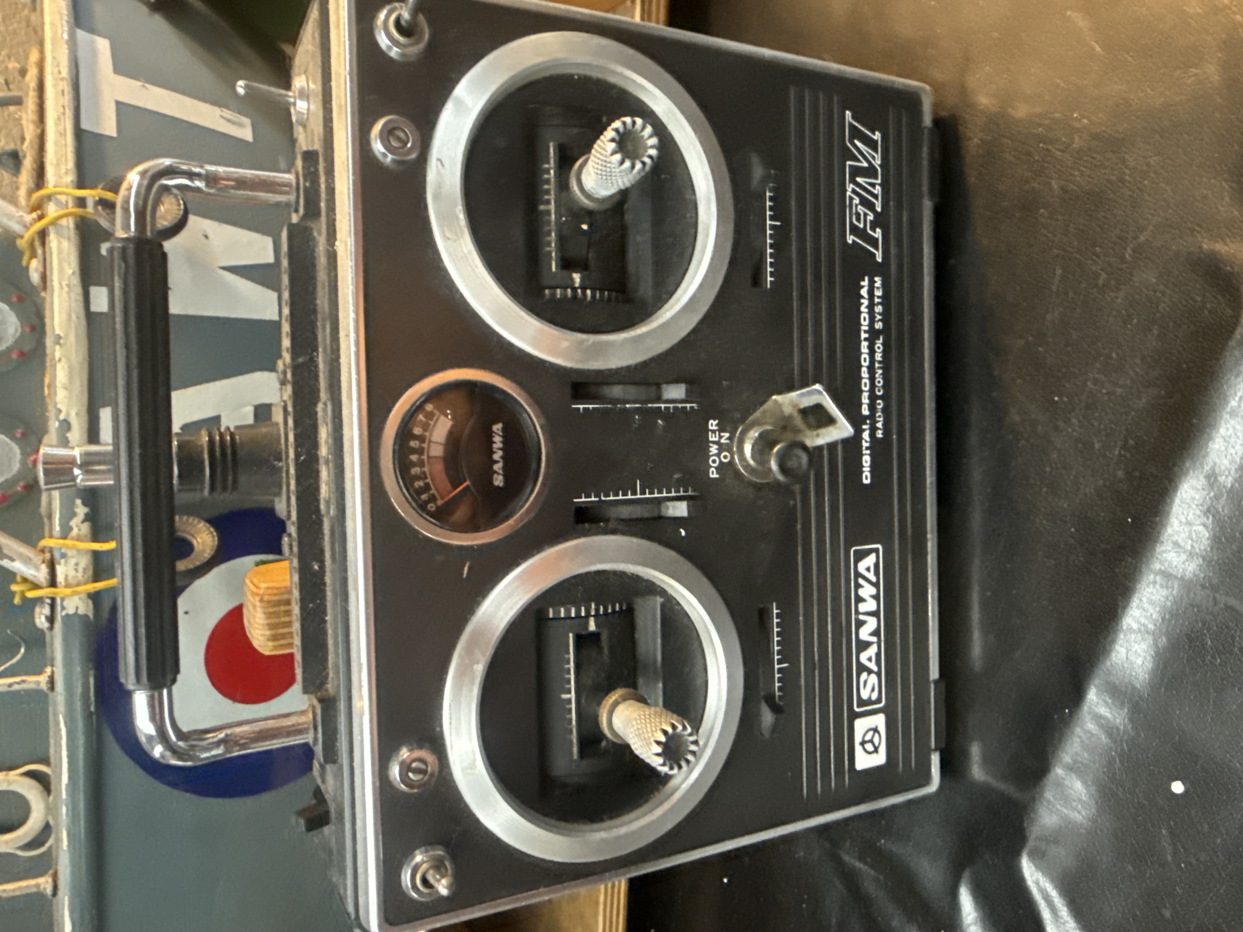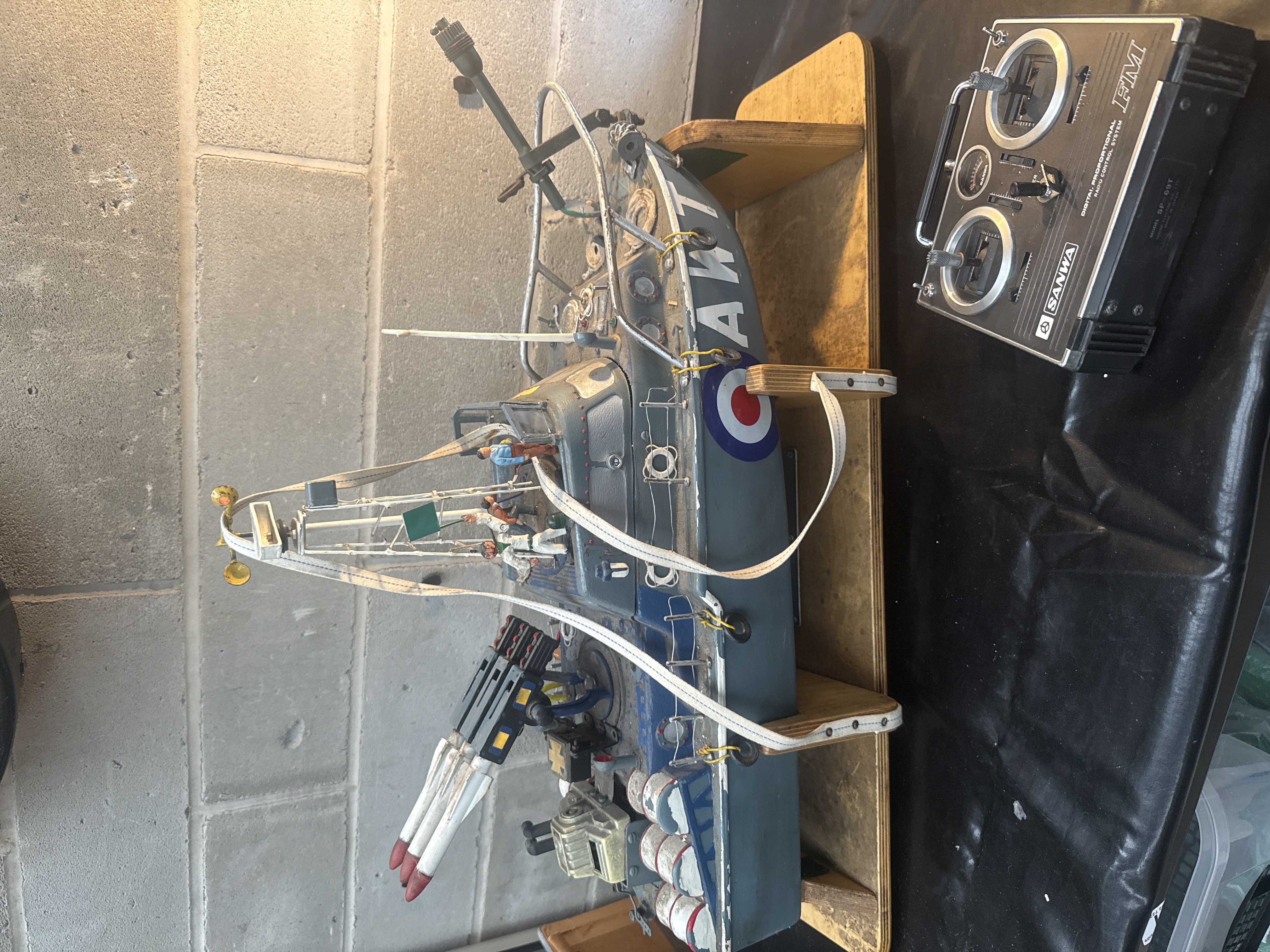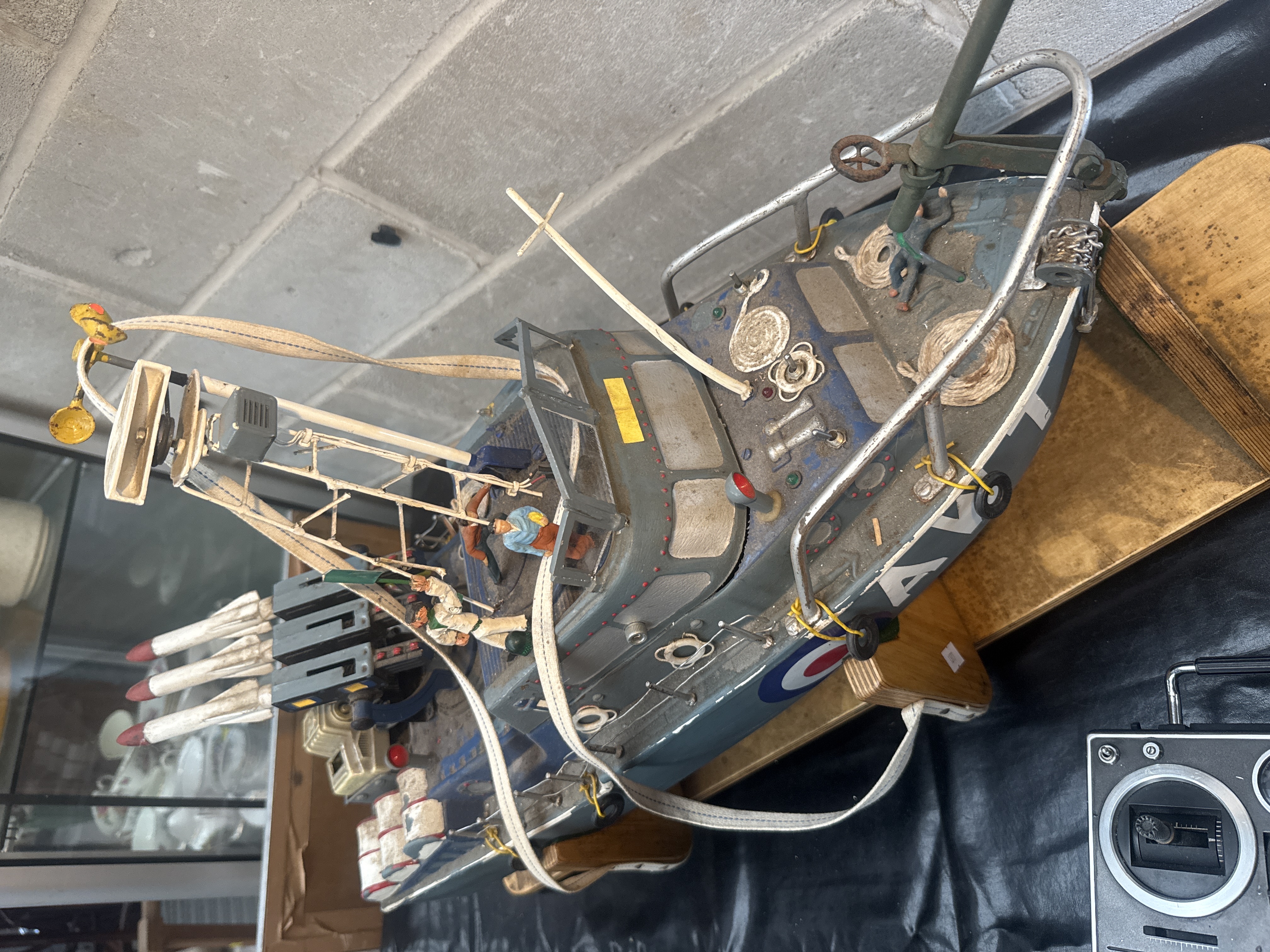 A blue-grey and white model military boat with three action figures, marked “AKT” and “H 731”, and a Sanwa “DIGITAL PROPORTIONAL RADIO CONTROL SYSTEM FM” remote control unit labeled “SP-551”.