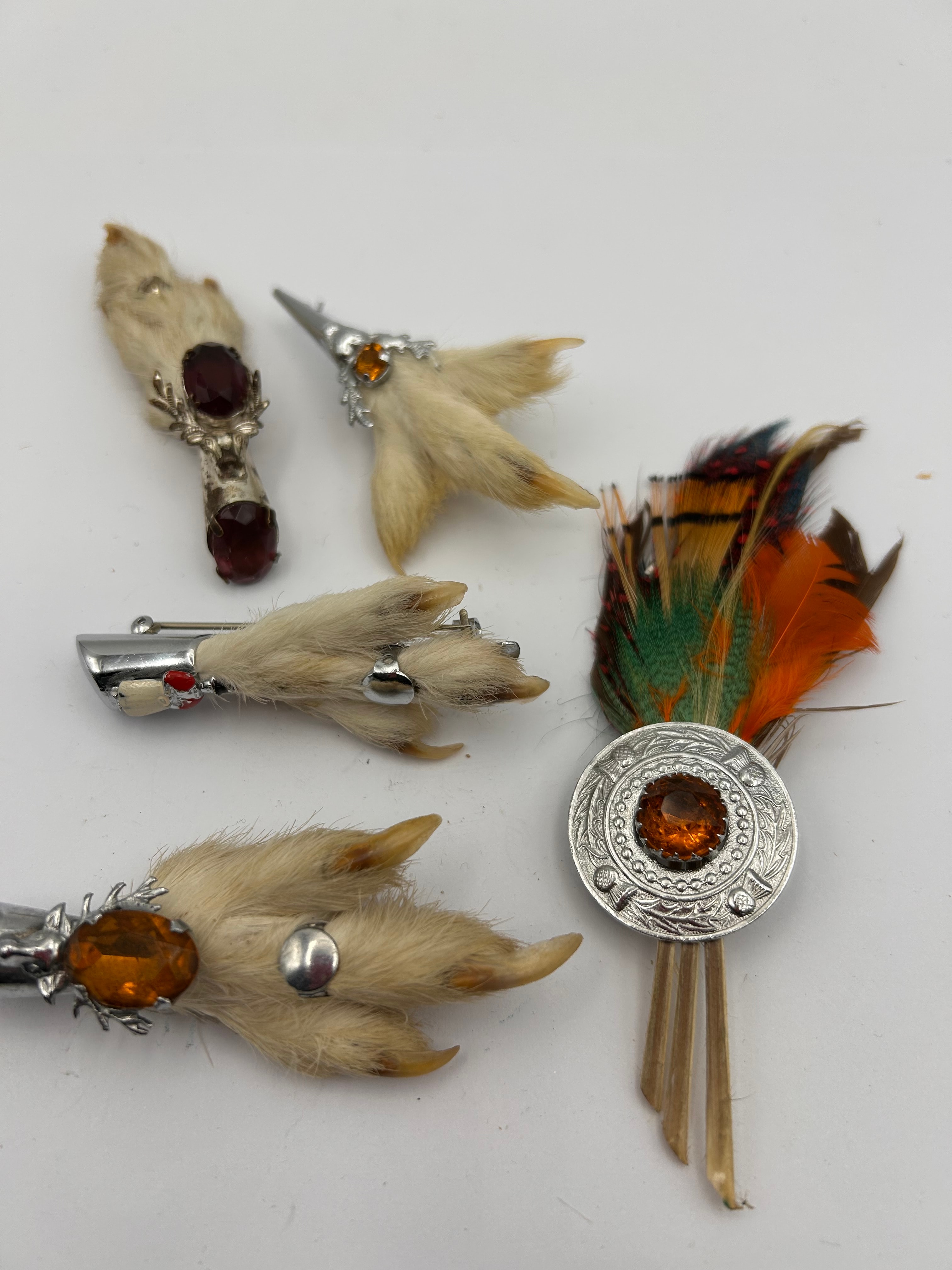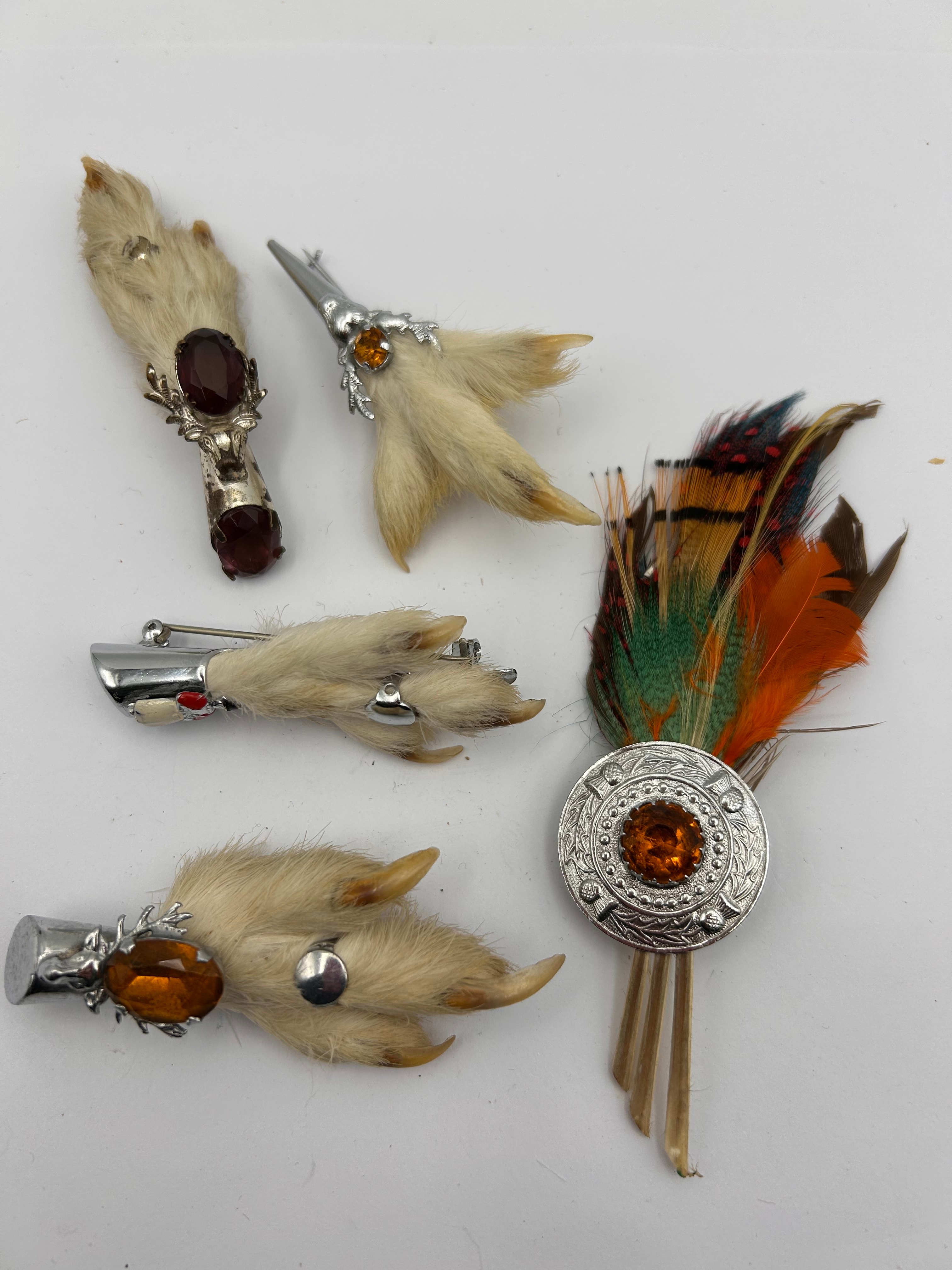 A group of five ornamental brooches, comprising four Scottish grouse foot brooches and one feather brooch. The four grouse foot brooches feature taxidermied animal paws, likely from a small mammal, covered in light-toned fur, each mounted with silver-tone metal caps and fittings, and set with faceted glass stones in amber or deep red hues. The fifth brooch is distinct, featuring a circular, repoussé-decorated silver-tone metal disc with a central amber-colored faceted glass stone, from which extends a vibrant fan of natural feathers in greens, blues, oranges, and browns, alongside bare quills. The overall style aligns with traditional Scottish sporting or Highland attire, popular from the Victorian era onward.