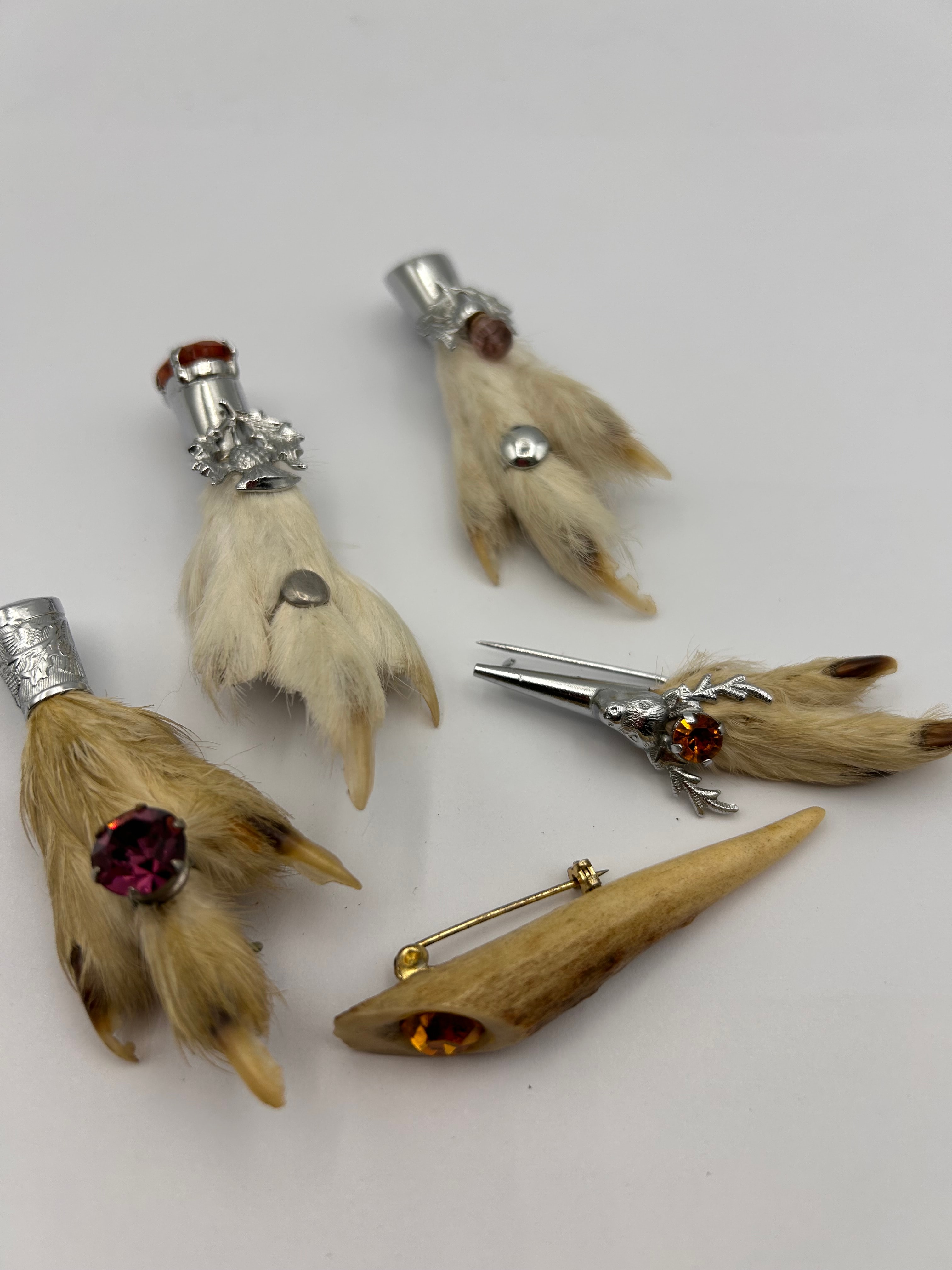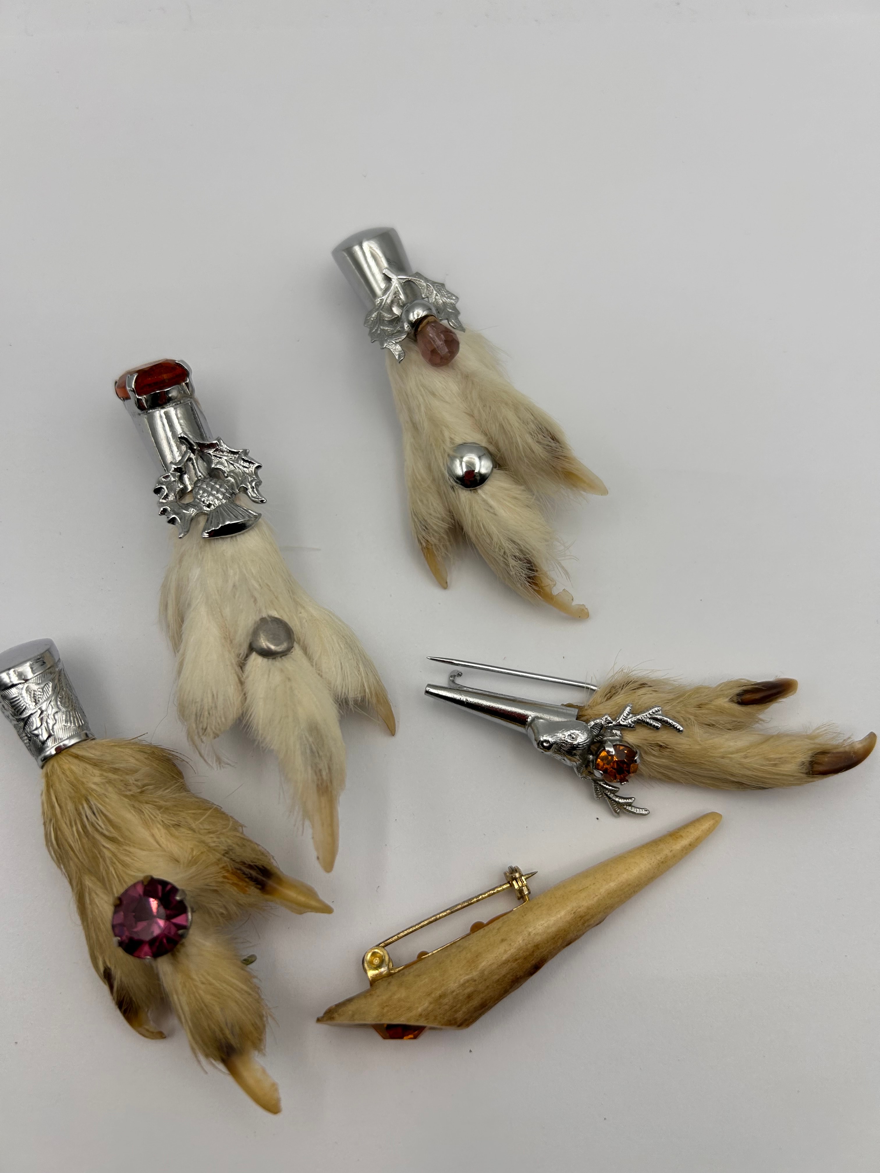 Five Scottish Grouse and Rabbit Foot Brooches and Antler Pin, comprising preserved animal paws, likely rabbit, fitted with silver-tone metal caps, rings, or clips, and adorned with faceted imitation gemstones in hues of red, orange, and pink. Three items are complete paws with silver-tone metal cuffs and central stones; one is a single paw attached to a silver-tone metal barrette-style clip featuring a small antler motif and an orange stone. The fifth item is a distinct, elongated piece, possibly antler or bone, fitted with a brass-tone pin back and a single orange faceted stone. The style suggests a rustic or novelty aesthetic. No visible text or markings are apparent.