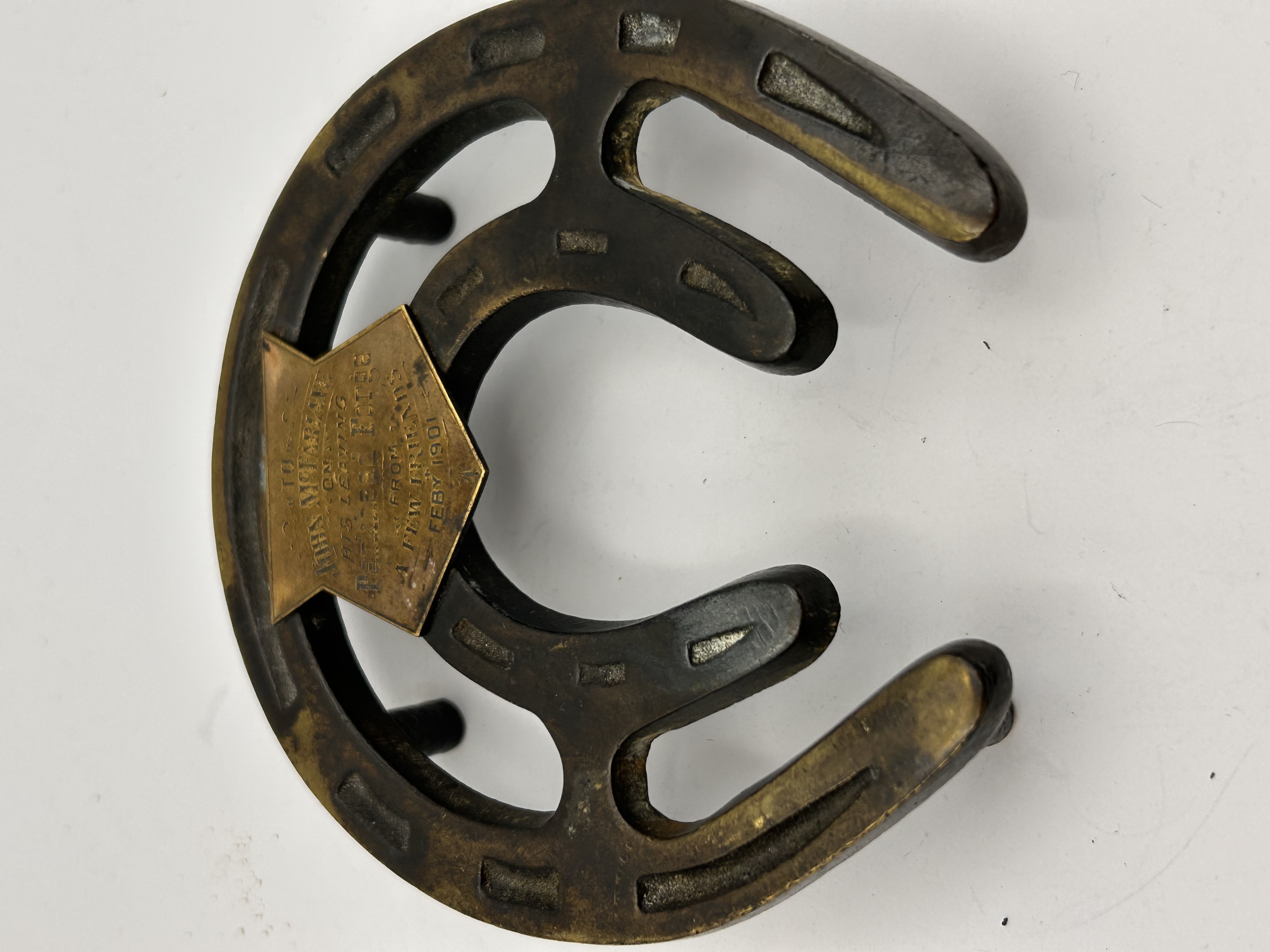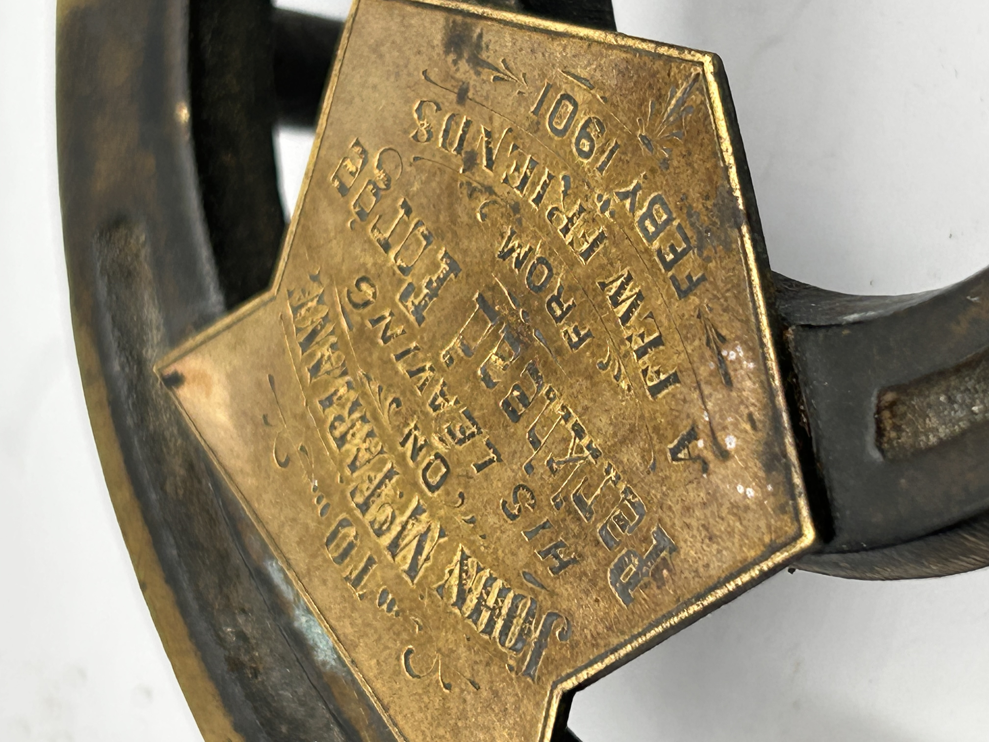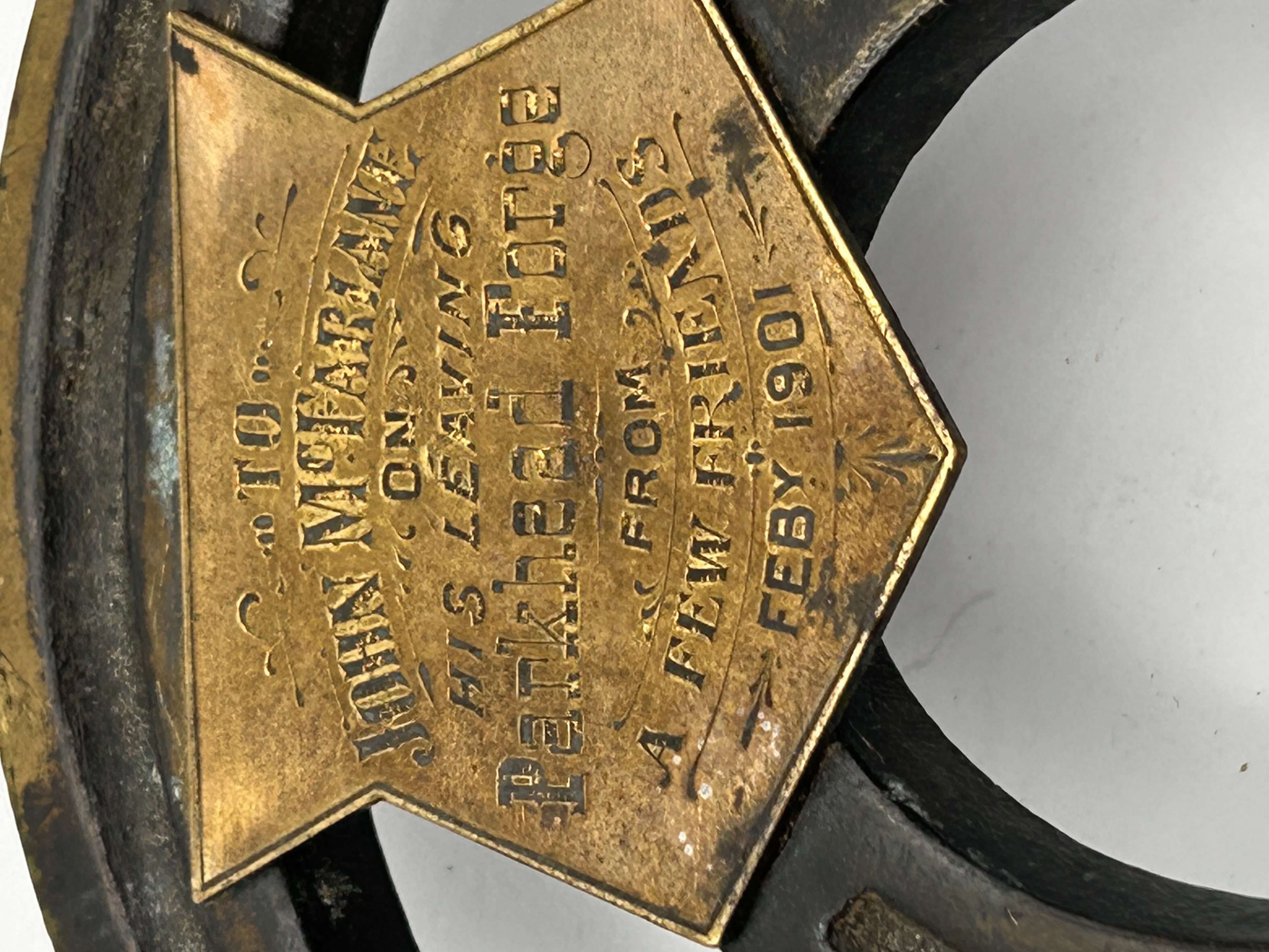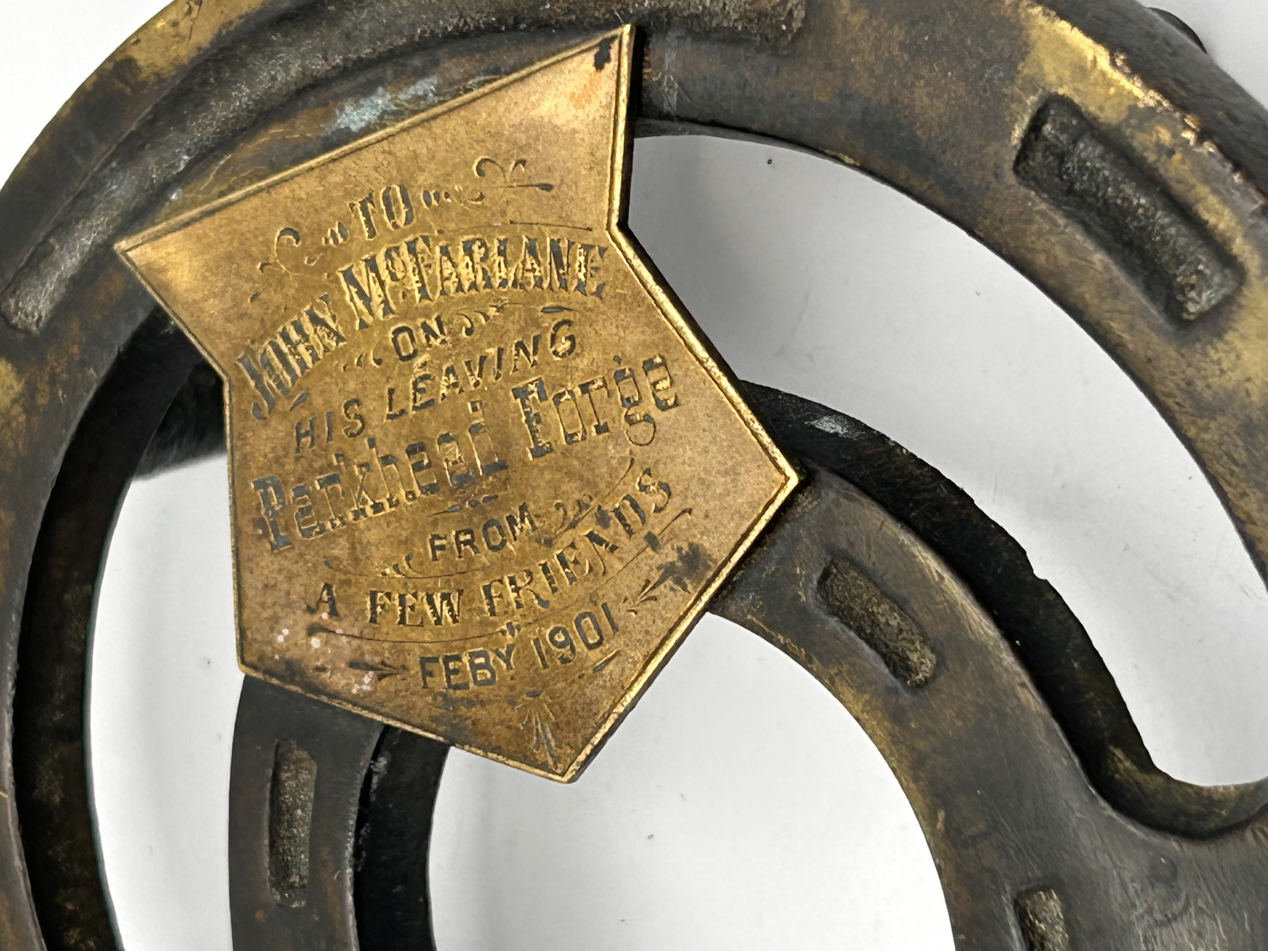 A commemorative cast metal presentation horseshoe, likely functioning as a trivet or stand, dating to February 1901. The main structure is composed of heavily patinated dark cast metal, consistent with iron or bronze, formed in the shape of a horseshoe and resting on integrated feet. Affixed centrally to the arch is a five-pointed brass plaque. The plaque is engraved with presentation text that reads: “TO JOHN MCFARLANE ON HIS LEAVING Parkhead Forge FROM A FEW FRIENDS FEBY 1901.” The object commemorates John McFarlane’s departure from the Parkhead Forge.