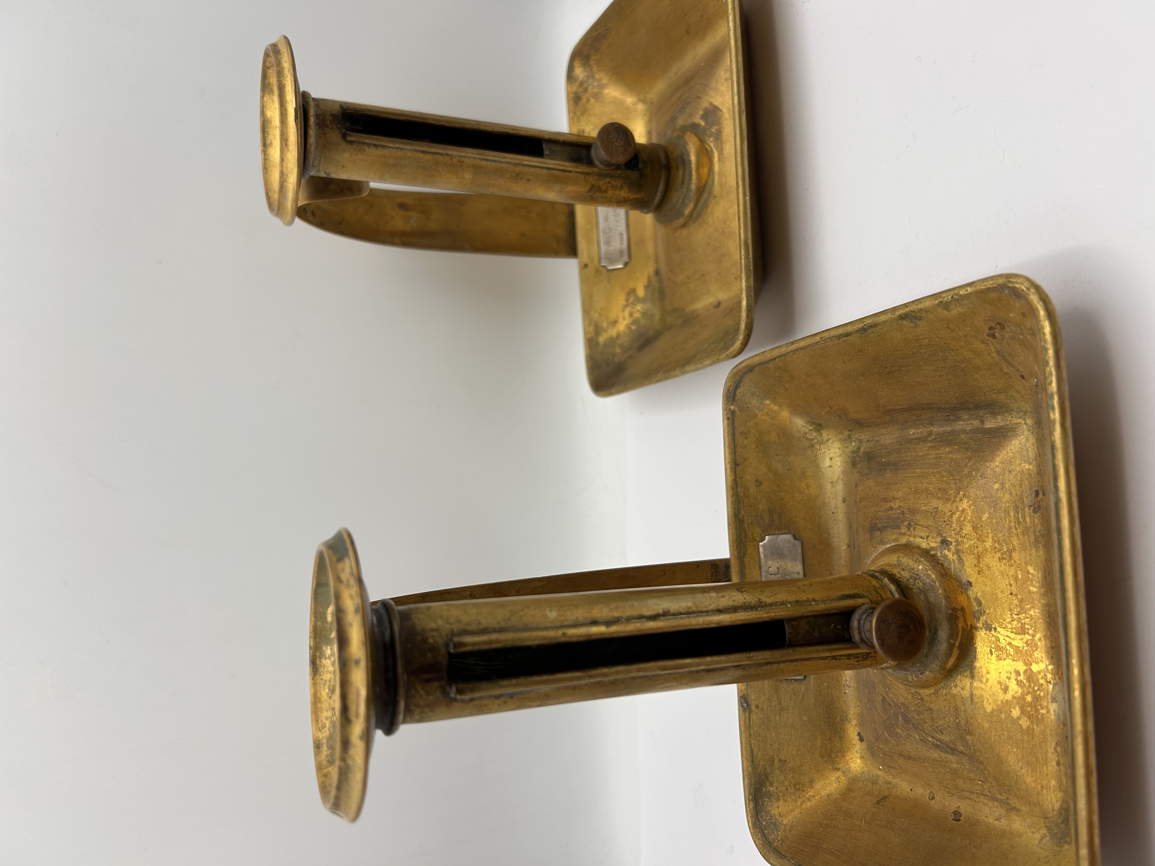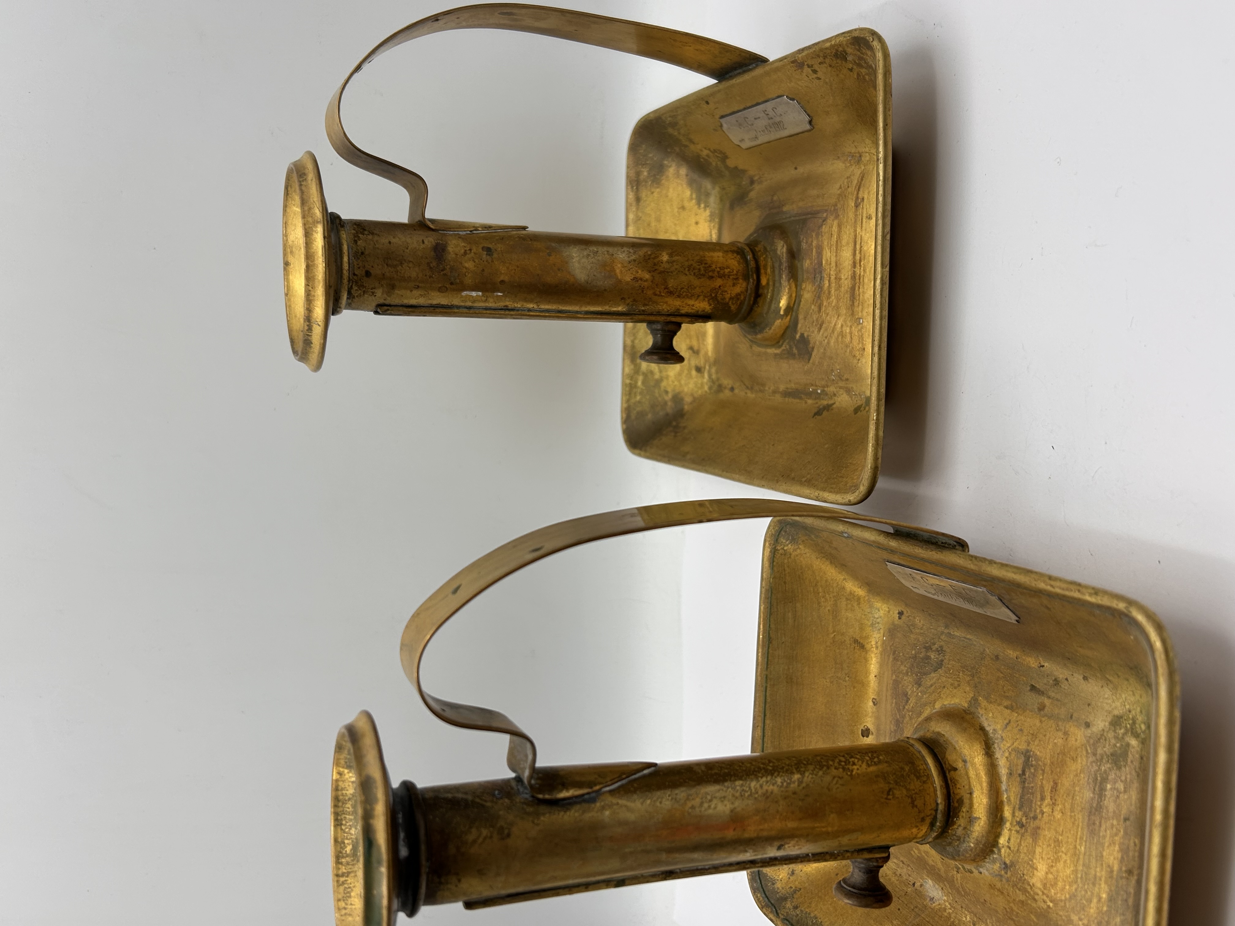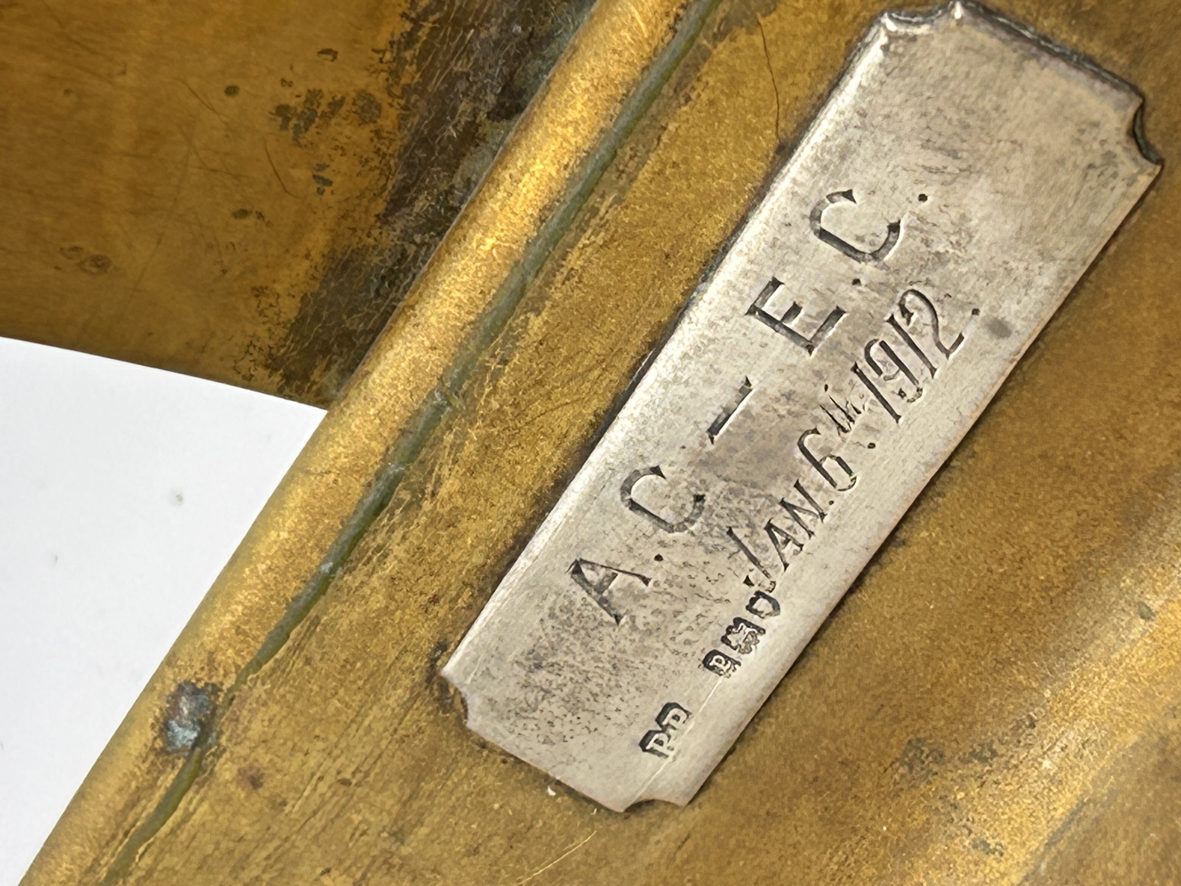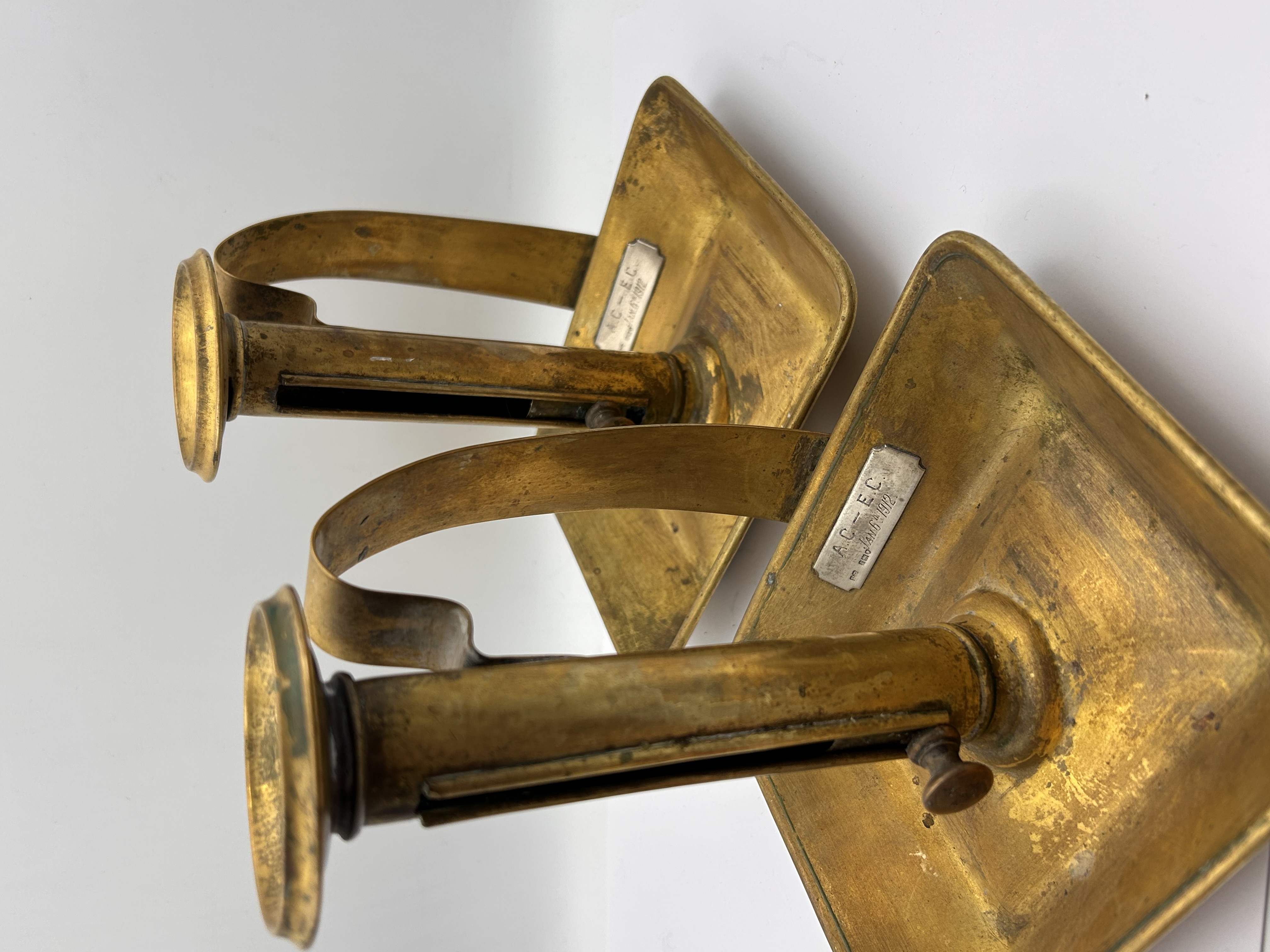 A pair of utilitarian brass chambersticks, also known as bedside candlesticks, featuring an integrated push-up candle ejector mechanism. The objects are constructed of brass or a similar yellow metal. Each chamberstick features a square drip pan base and a tall cylindrical stem designed to hold a taper candle. The ejector mechanism is operated by a small brass knob visible on the front of the stem. A wide, curving carrying handle is attached to the back of the base and stem on both examples. Both bases are affixed with a rectangular, silver-toned plaque. The plaque is engraved with the inscription: A.C. – E.C. pp. JAN. 6 TH 1912, indicating a specific date for the object’s presentation or origin.