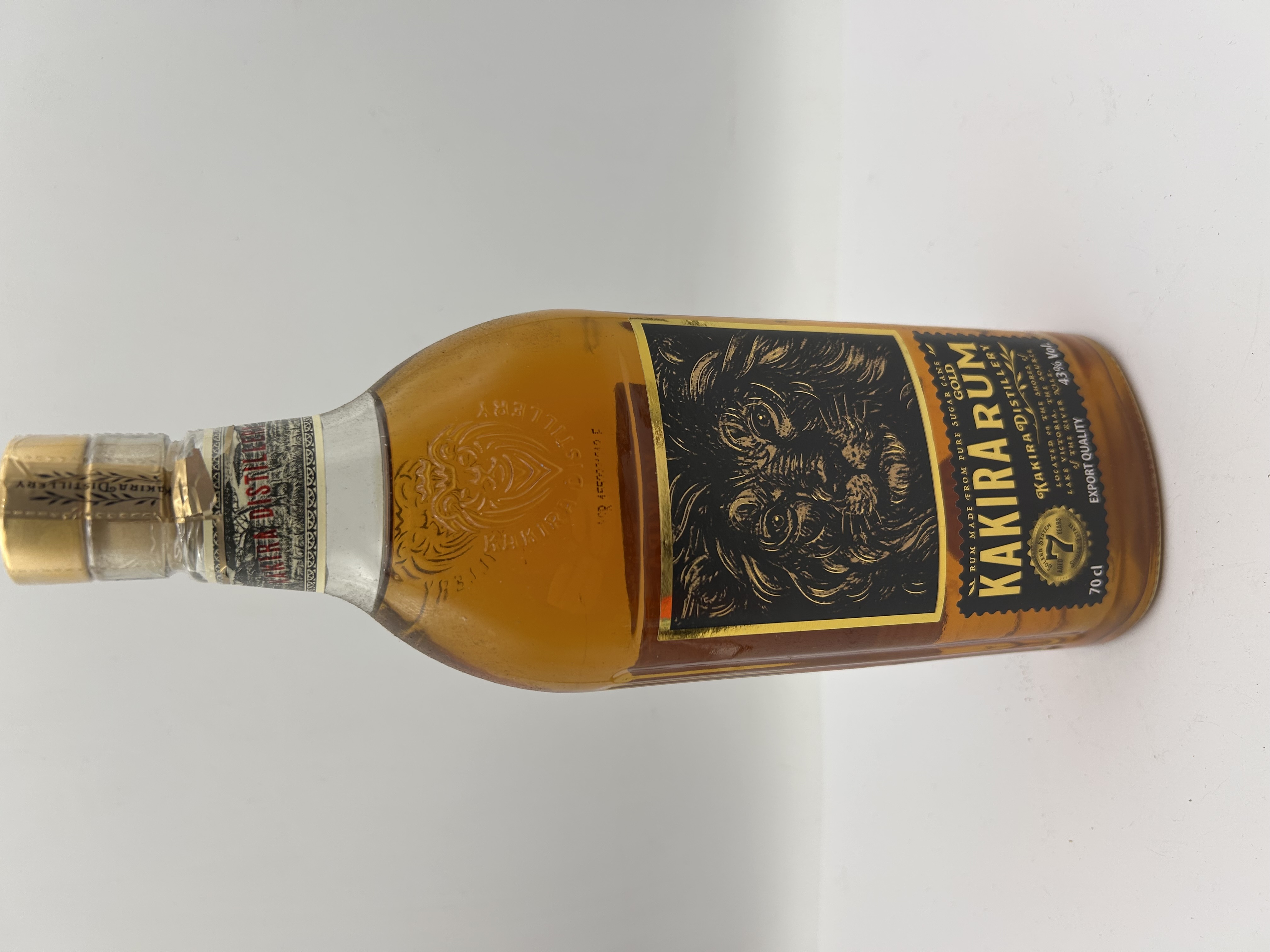 A single sealed commercial glass bottle of Kakira Gold Rum, produced by the Kakira Distillery in Uganda. The spirit is amber-colored, distilled from pure sugar cane, and confirmed by the label to be aged for 7 years in oak barrels. The rum is bottled at 43% Vol and contains 70 cl (700 ml). The bottle features a prominent black and gold main label centered with an illustration of a lion’s head. The glass shoulder of the bottle is embossed with the distillery name, and a production code, HQ 1583201019 F, is visible above the main label. The bottle is sealed with a gold foil closure.
