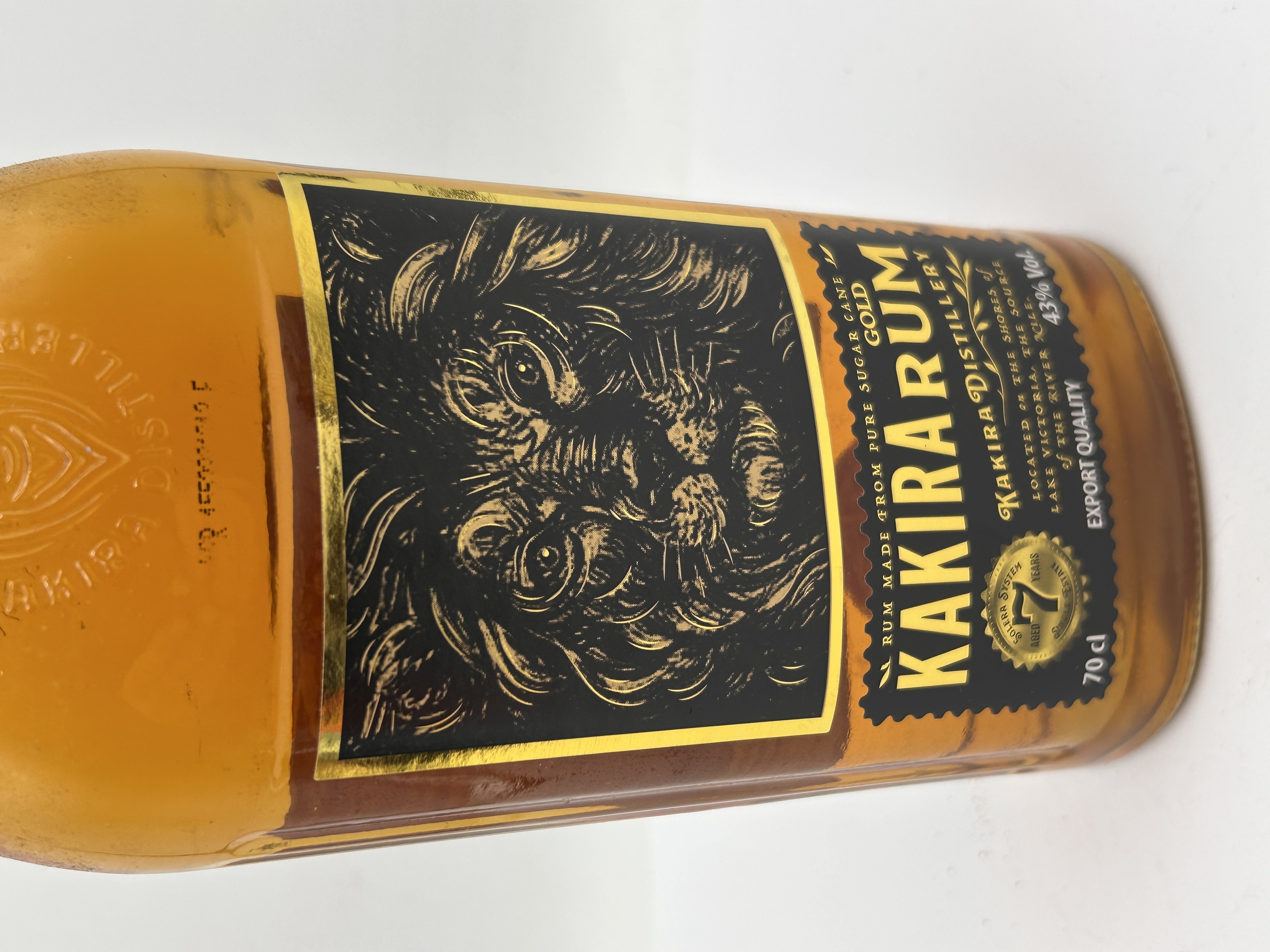 A single sealed bottle of Kakira Gold Rum, produced by the Kakira Distillery, located on the shores of Lake Victoria, the source of the River Nile. The rum is specified as being made from pure sugar cane and aged for 7 years. The clear glass bottle holds 70 cl of amber-colored liquid at 43% Vol. The bottle features a gold-tone screw cap secured by an intact gold foil wrapping. The glass shoulder is embossed with a stylized lion’s head motif and the distillery name. The central label is black and gold, featuring a detailed illustration of a lion’s face.