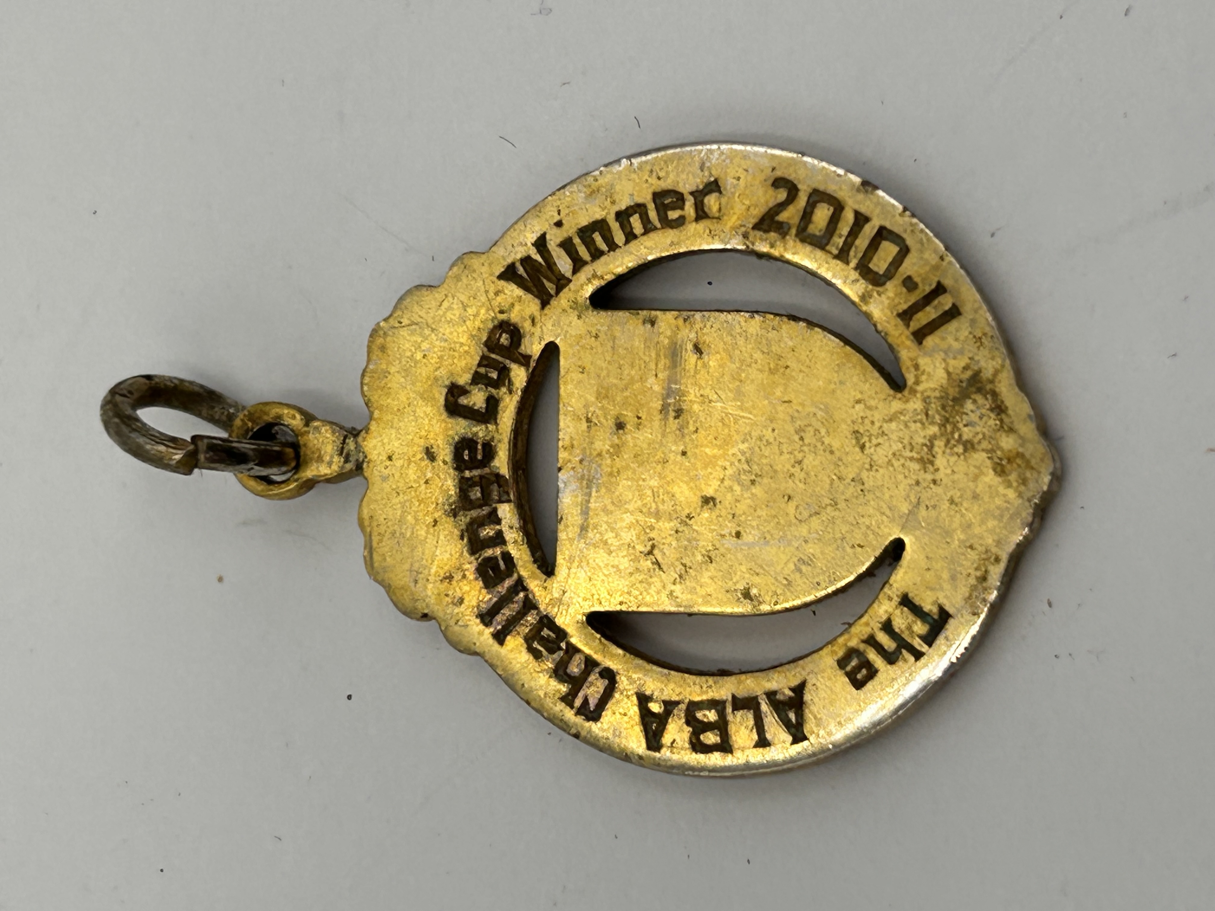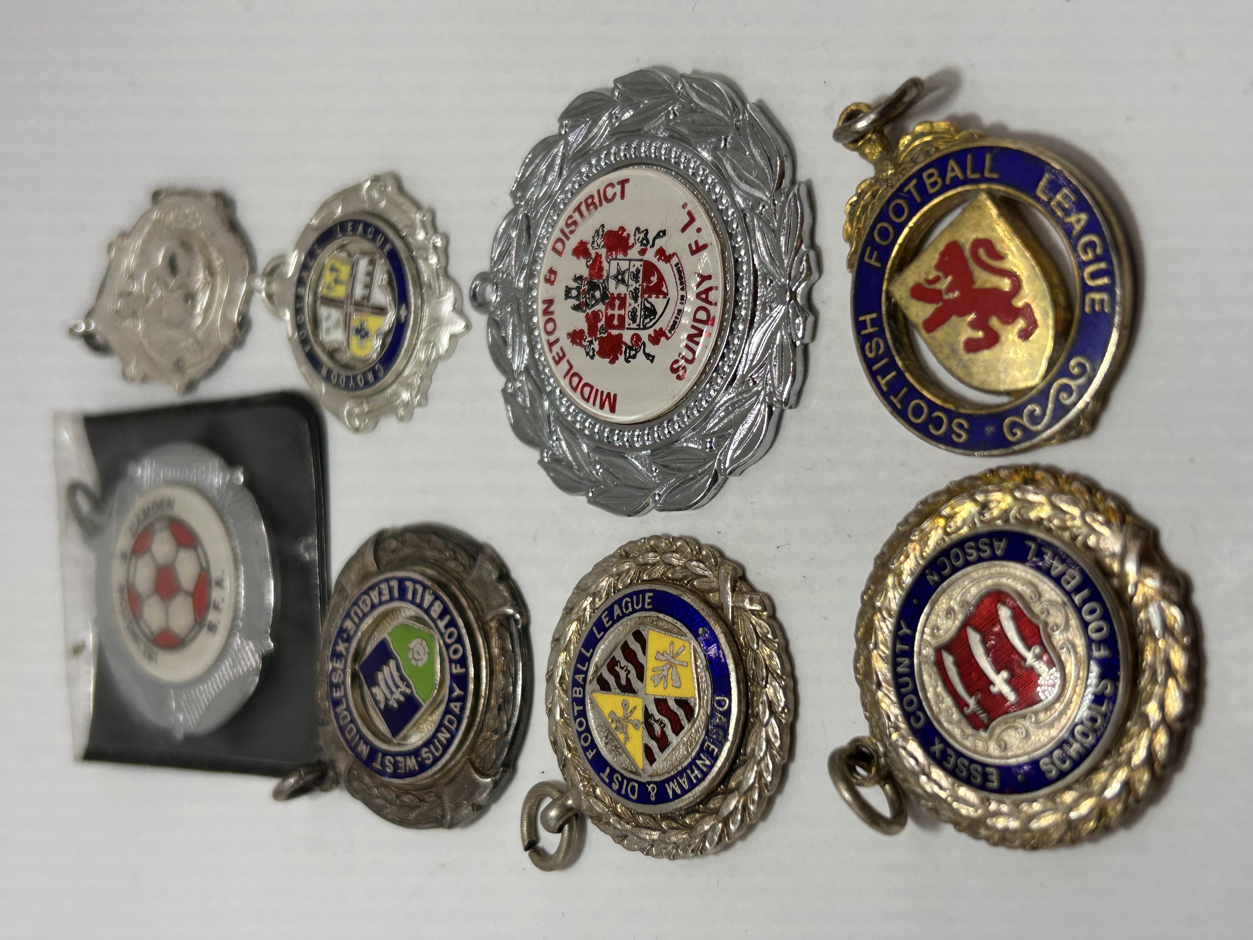 A collection of eight vintage sporting medallions or fobs, primarily associated with regional English and Scottish football leagues. The objects are constructed from mixed metals, featuring both gold-tone and silver-tone plating, and are inlaid with multi-color enamel or resin representing various league crests and emblems. The designs are typical of mid-20th-century sporting awards, often bordered by decorative wreaths or molded edges. Visible inscriptions identify regional associations, including WEST MIDDLESEX SUNDAY FOOTBALL, MIDDLETON & DISTRICT SUNDAY F.L., ESSEX COUNTY SCHOOLS FOOTBALL ASSOC., and SCOTTISH FOOTBALL LEAGUE. One medallion is inscribed ISLINGTON & CAMDEN S.F.A. and remains sealed in its original packaging. Each fob includes an attached jump ring for suspension.