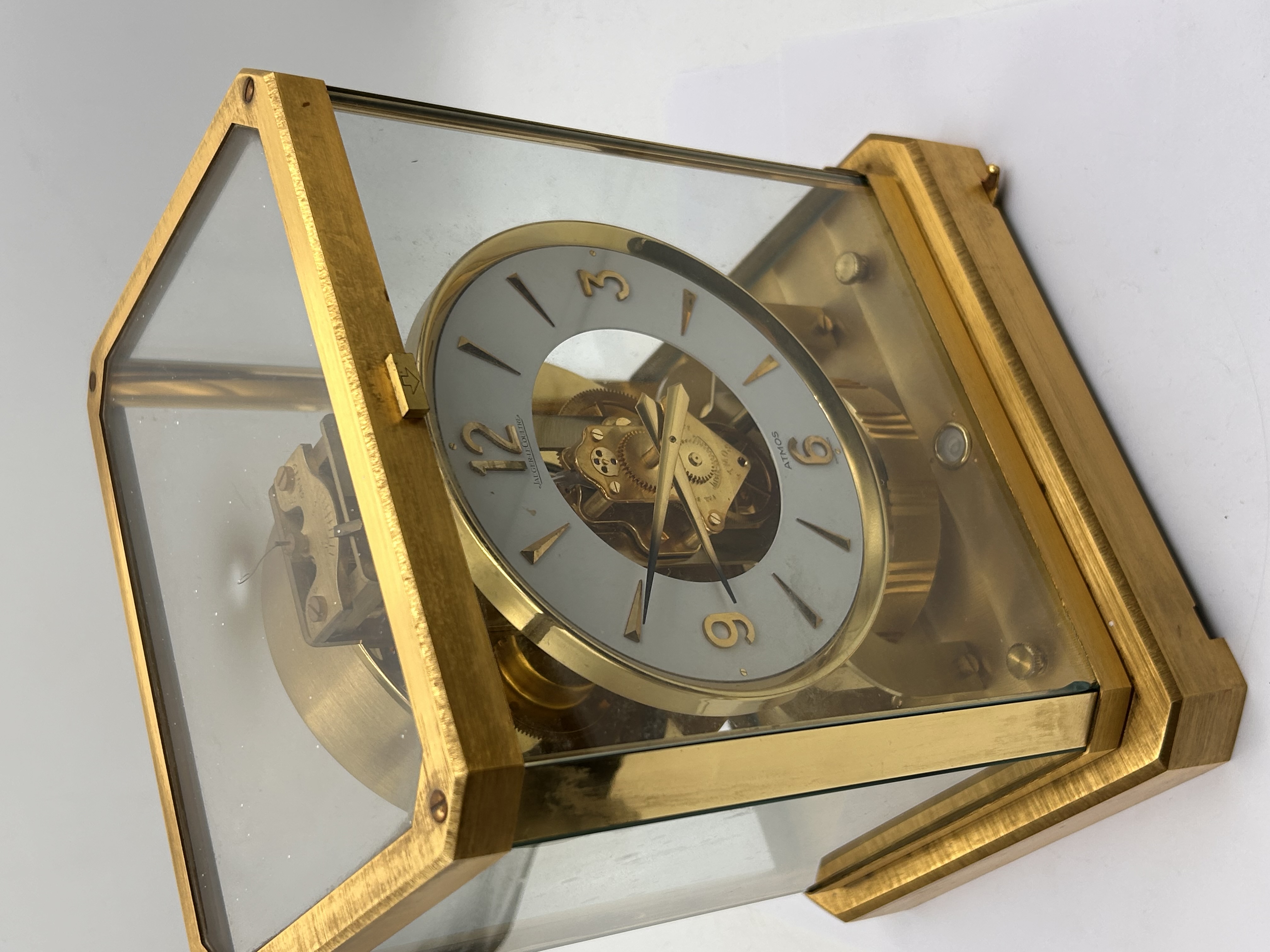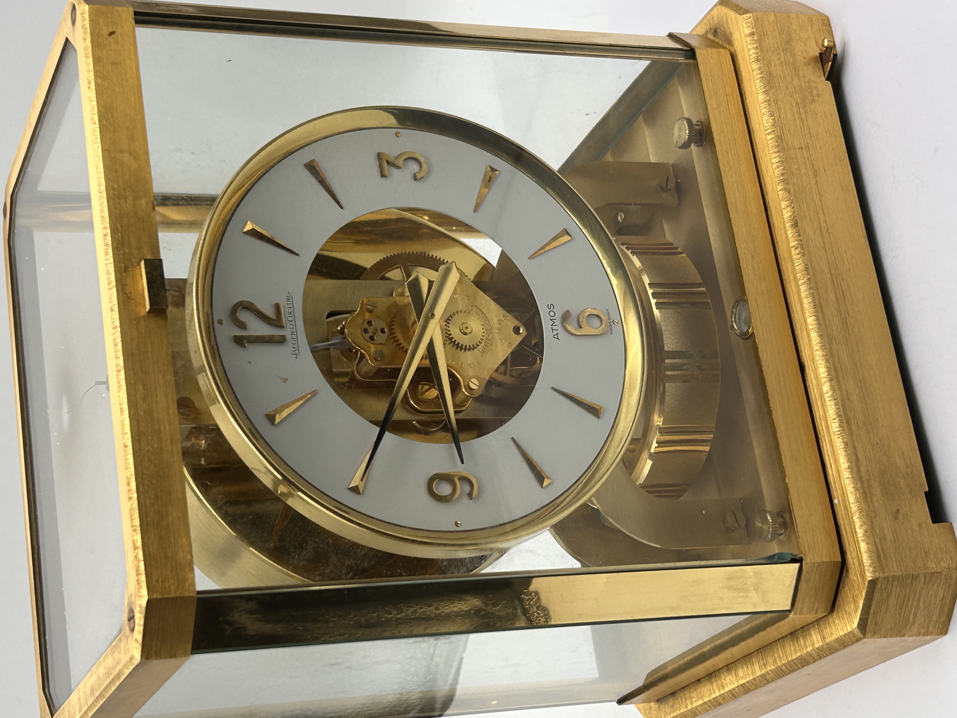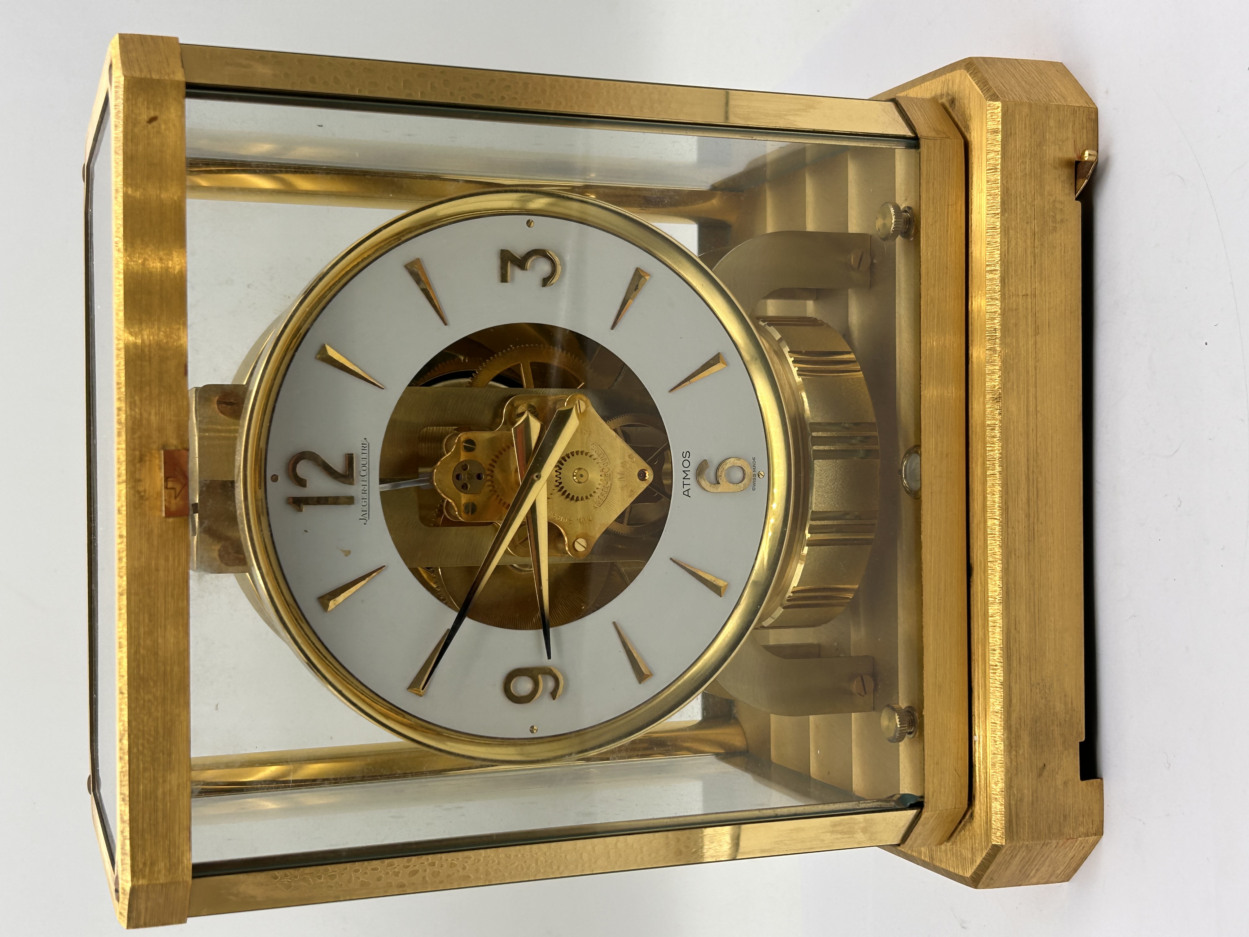 A single Jaeger-LeCoultre Atmos mantel clock. The clock is housed in a rectangular case constructed from polished and brushed gold-toned metal framing and five clear glass panels, allowing visibility of the movement. The mechanism is driven by the Atmos system, utilizing changes in atmospheric temperature and pressure. The clock features a round white dial with a skeletonized center revealing the brass movement and gearing. The time is indicated by applied gold-toned baton indices and Arabic numerals at the quarter hours (3, 6, 9, 12). The dial is inscribed JAEGER-LECOULTRE above the center and ATMOS / SWISS MADE below the six position. A large, horizontal, cylindrical torsion balance wheel is visible behind the dial, characteristic of the Atmos design.