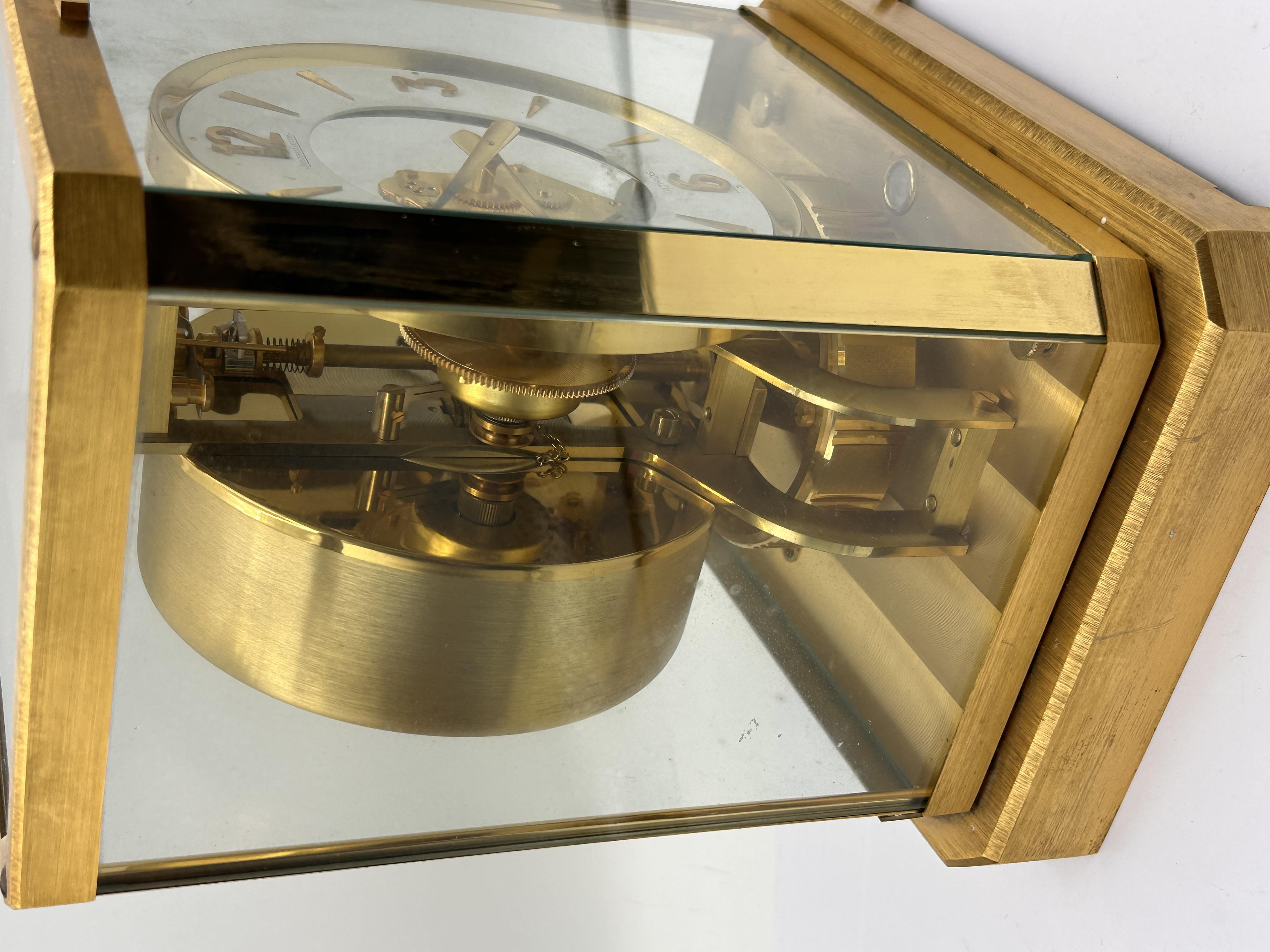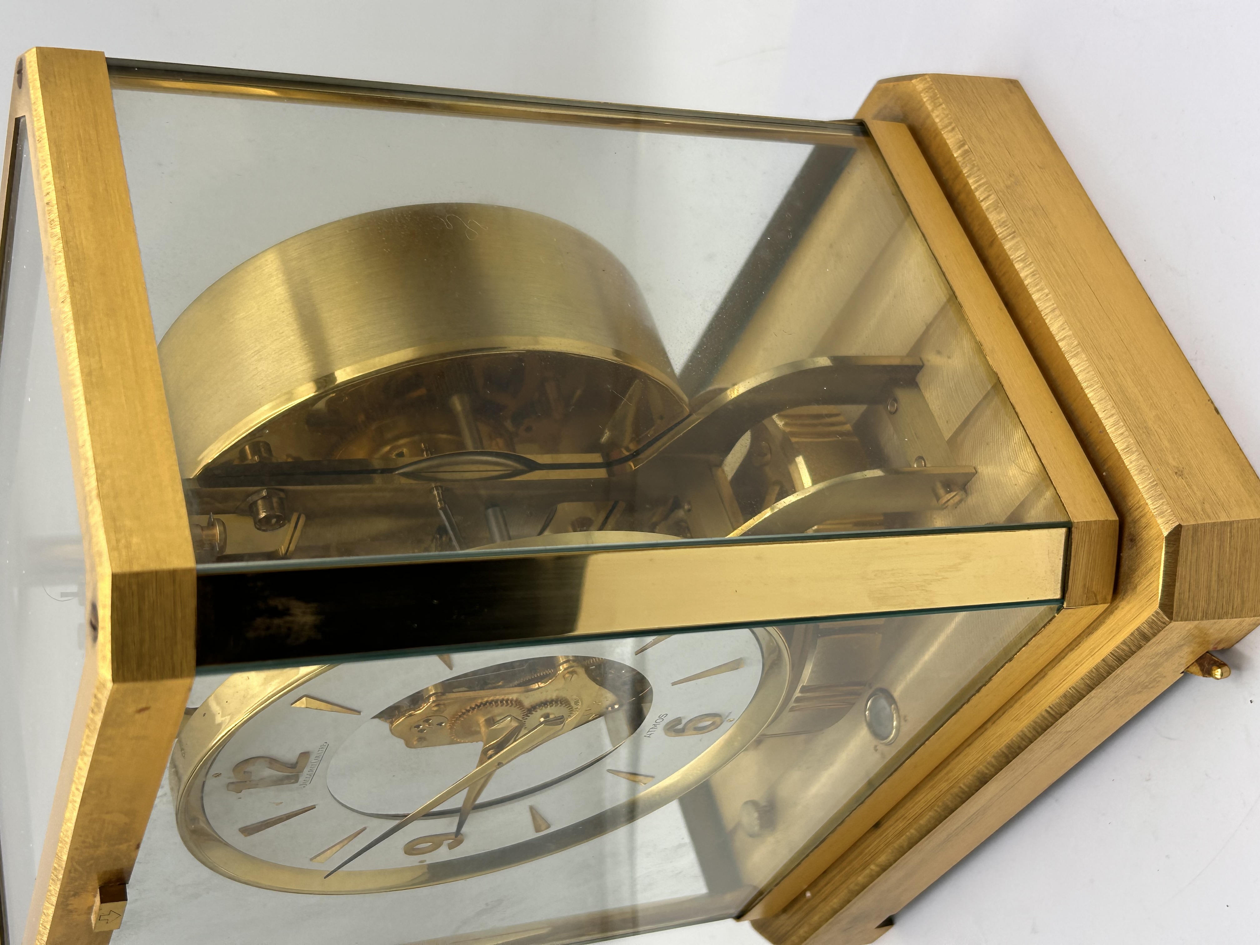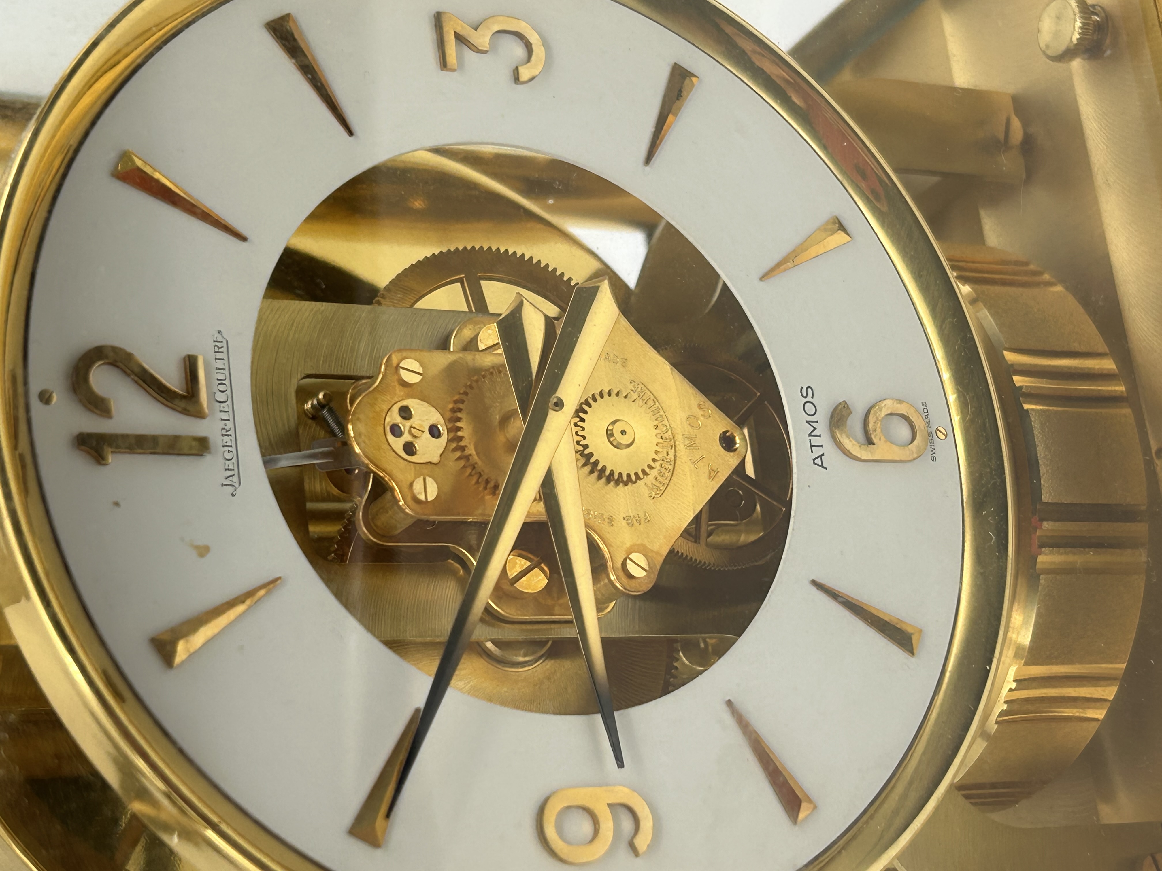 A single Jaeger-LeCoultre Atmos mantel clock. The clock is housed in a rectangular case constructed from polished and brushed gold-toned metal framing and five clear glass panels, allowing visibility of the movement. The mechanism is driven by the Atmos system, utilizing changes in atmospheric temperature and pressure. The clock features a round white dial with a skeletonized center revealing the brass movement and gearing. The time is indicated by applied gold-toned baton indices and Arabic numerals at the quarter hours (3, 6, 9, 12). The dial is inscribed JAEGER-LECOULTRE above the center and ATMOS / SWISS MADE below the six position. A large, horizontal, cylindrical torsion balance wheel is visible behind the dial, characteristic of the Atmos design.