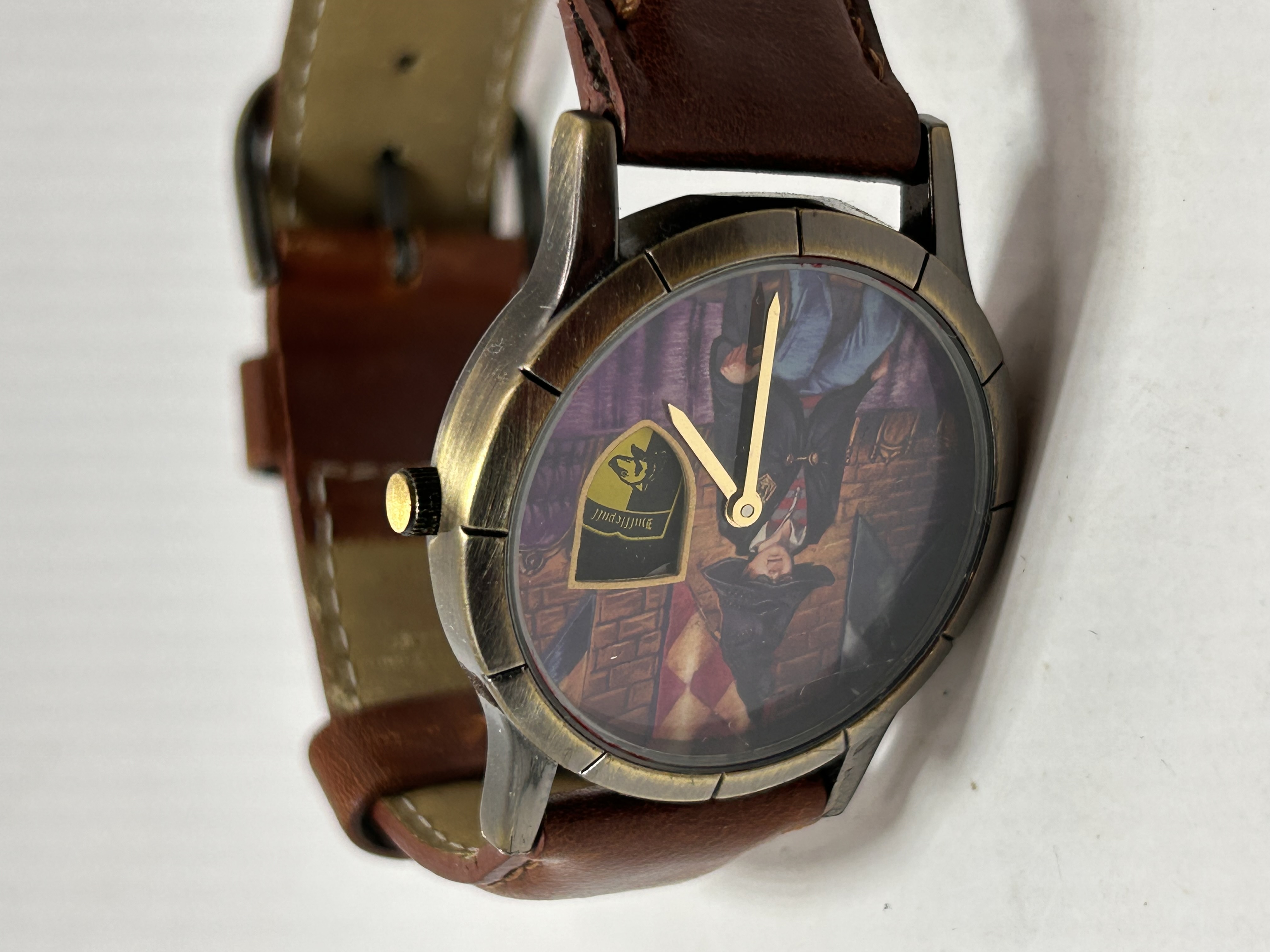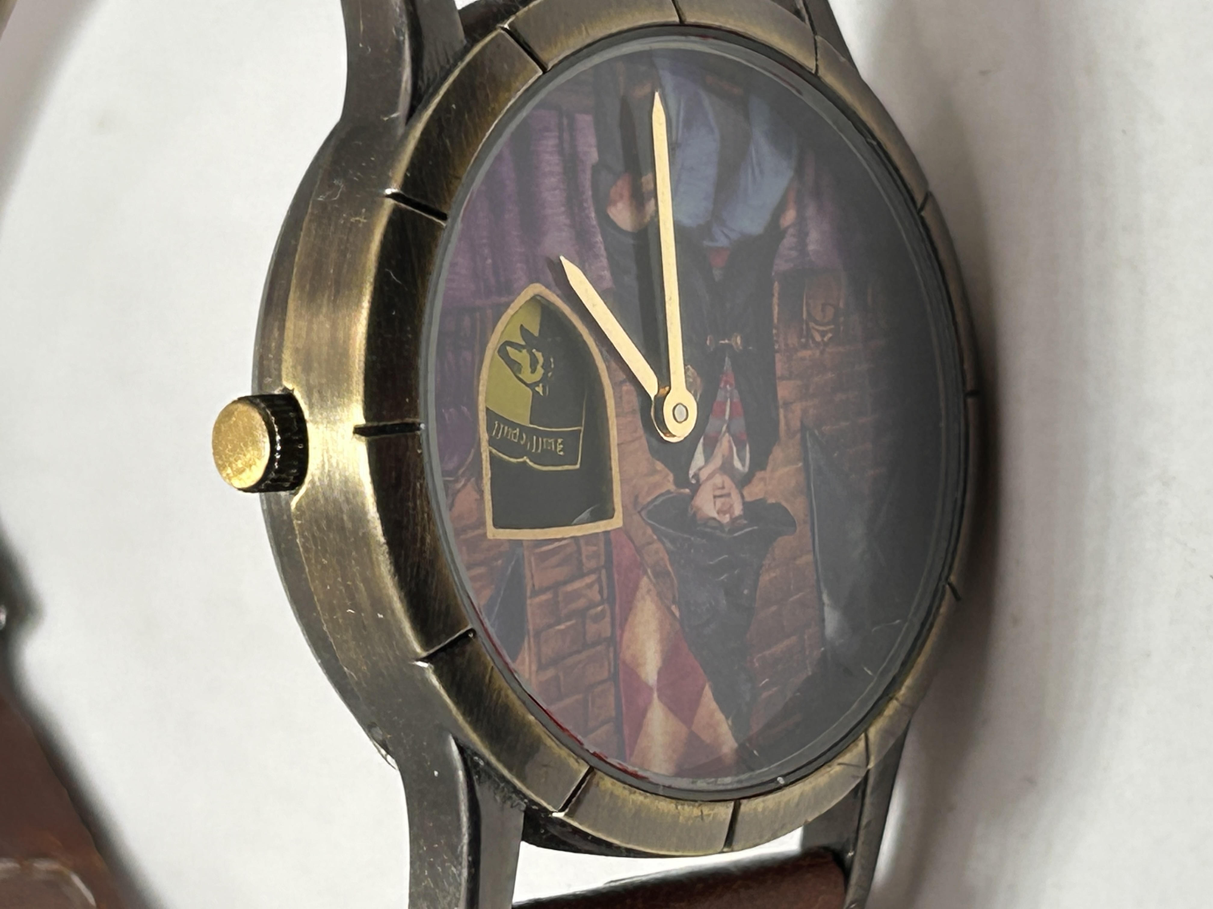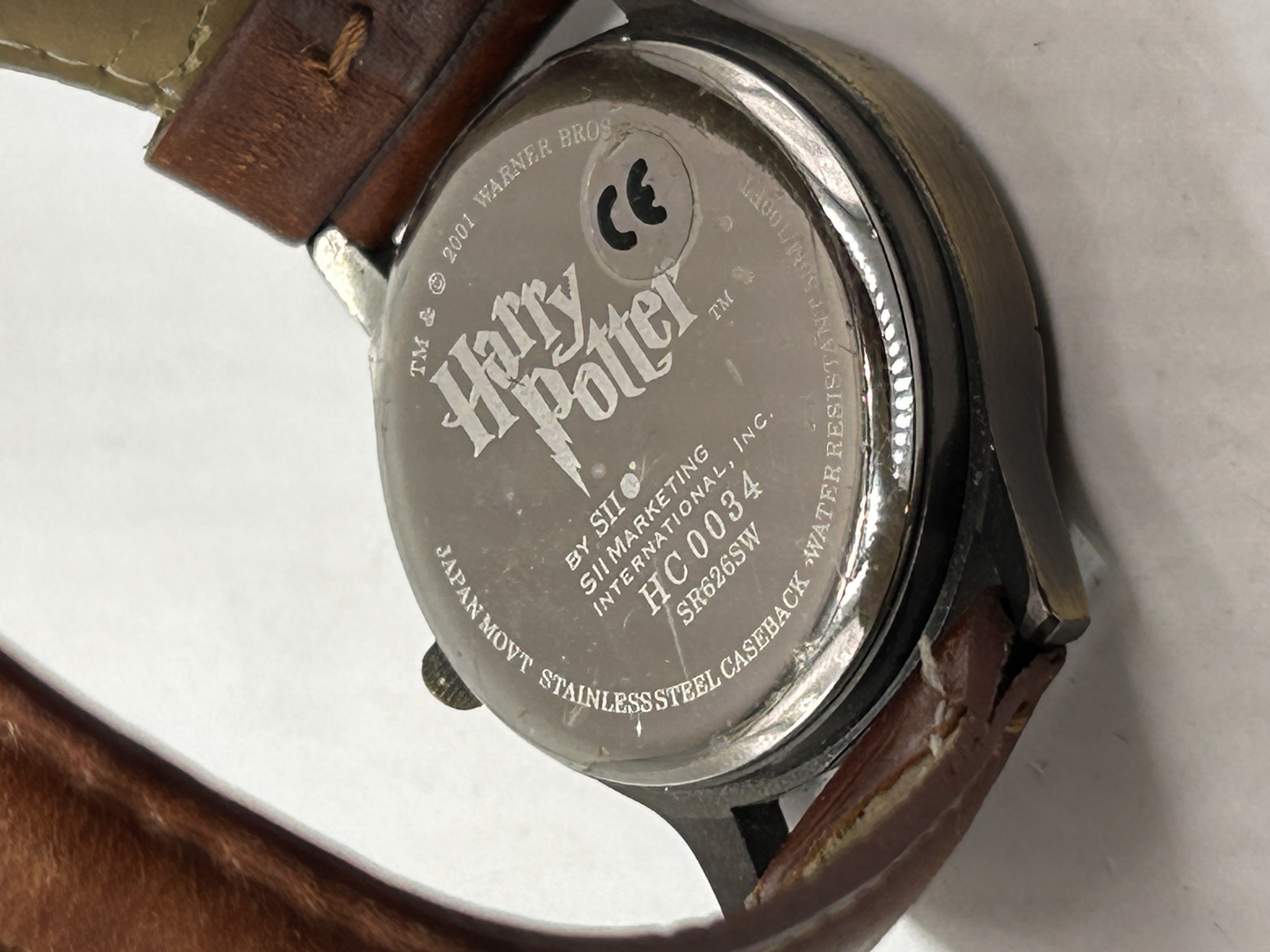 A single vintage wrist watch produced by SII Marketing, Inc. (Seiko Instruments Inc.) under license from Warner Bros., dated 2004. The watch features an antiqued bronze or gunmetal-finished case fitted with a distressed brown leather strap. The dial displays a printed graphic scene, commonly associated with the Sorting Ceremony from the Harry Potter series, centered by a shield crest bearing the name “Hogwarts.” The watch utilizes gold-toned hour and minute hands and features a single gold-toned crown. The stainless steel caseback is engraved with the “Harry Potter” logo and technical and licensing information, including “TM & © 2004 WARNER BROS.,” “BY SII MARKETING, INC.,” “HC0034,” “JAPAN MOVT SR626SW,” and “WATER RESISTANT 50M/160FT.”