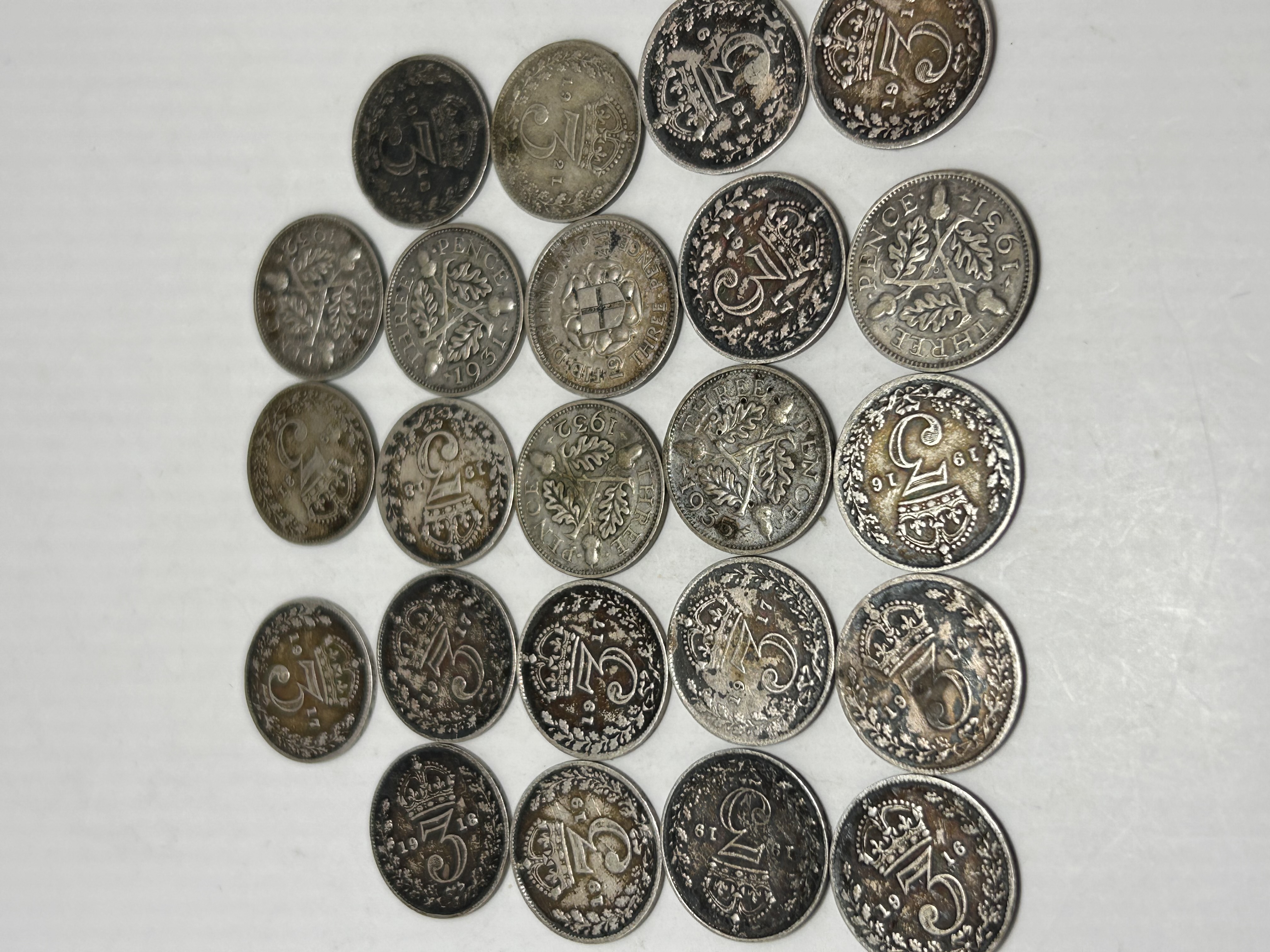 A collection of 23 circular numismatic items identified as pre-decimal British or Commonwealth silver threepence (3d) coins. The coins are struck in silver or a silver alloy, consistent with coinage standards for this denomination during the early 20th century. The collection spans the reigns of King George V and King George VI, with visible dates including 1916, 1917, 1919, 1931, and 1935. Reverses display various designs, including the large crowned numeral ‘3’, the earlier cross within a crowned shield motif, and later examples featuring oak leaves and acorns, often accompanied by the inscription ‘THREE PENCE’.